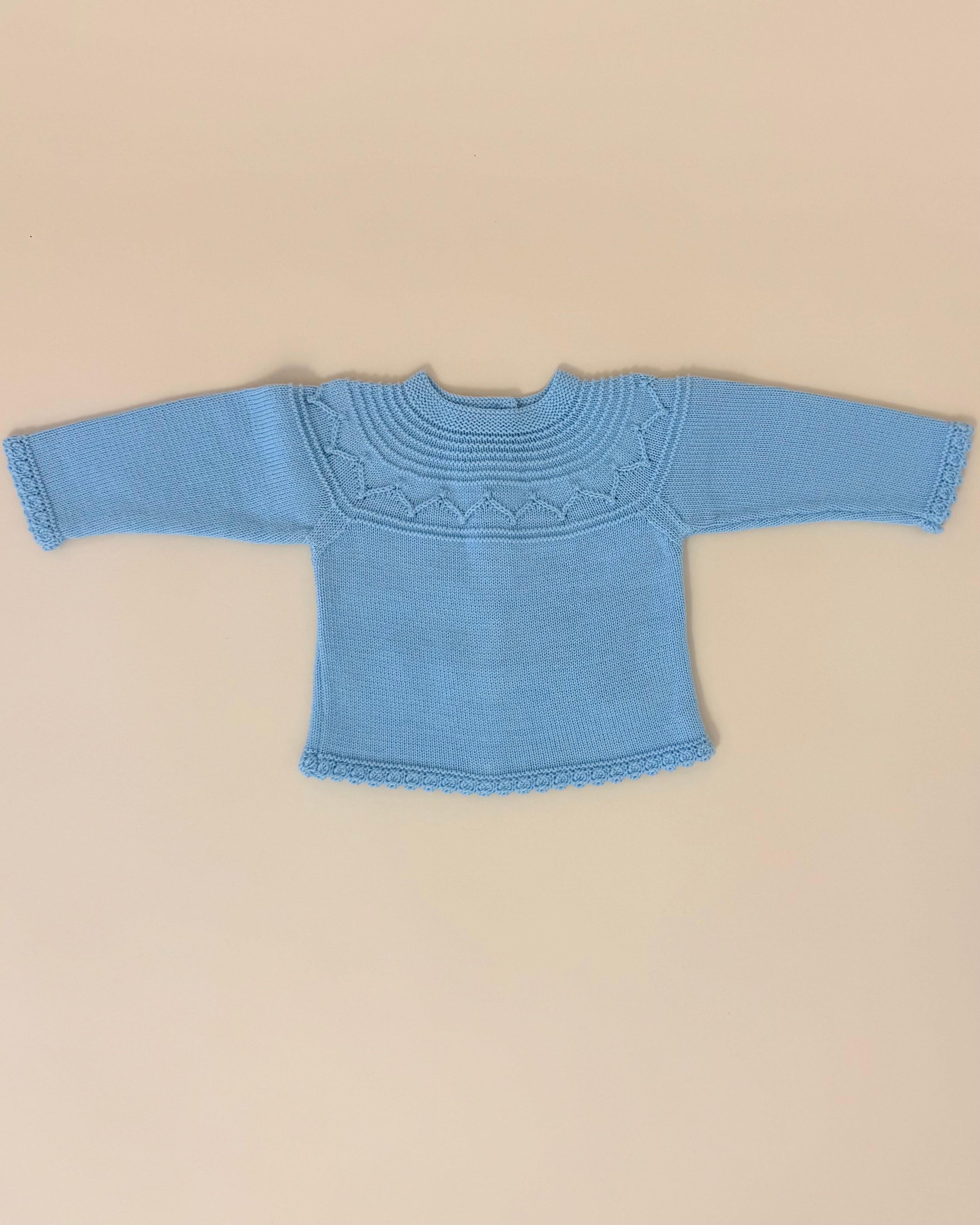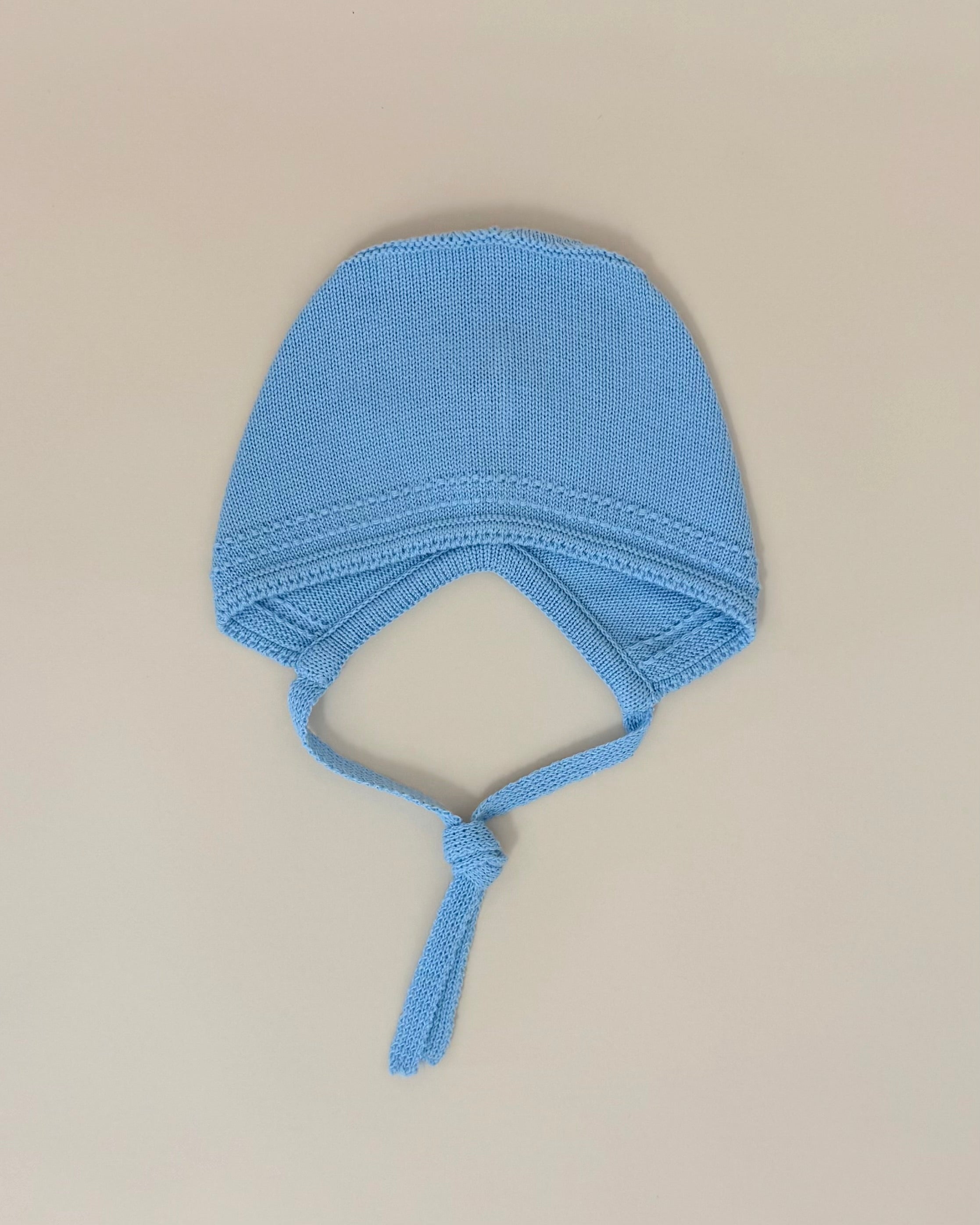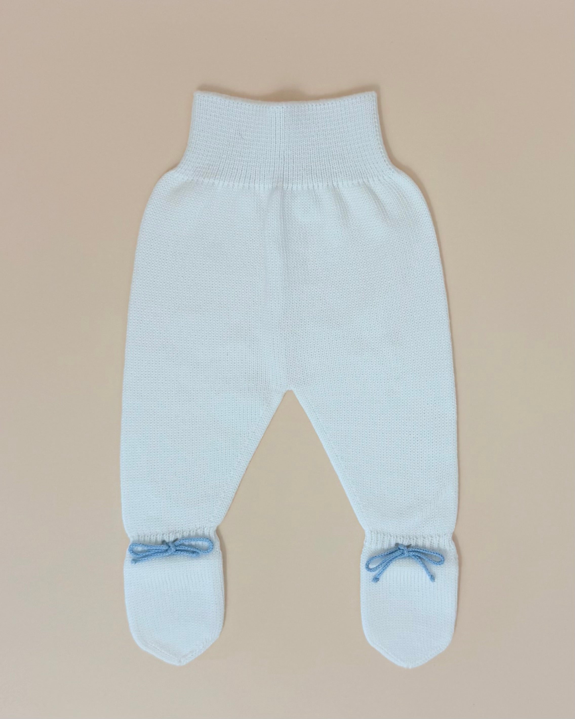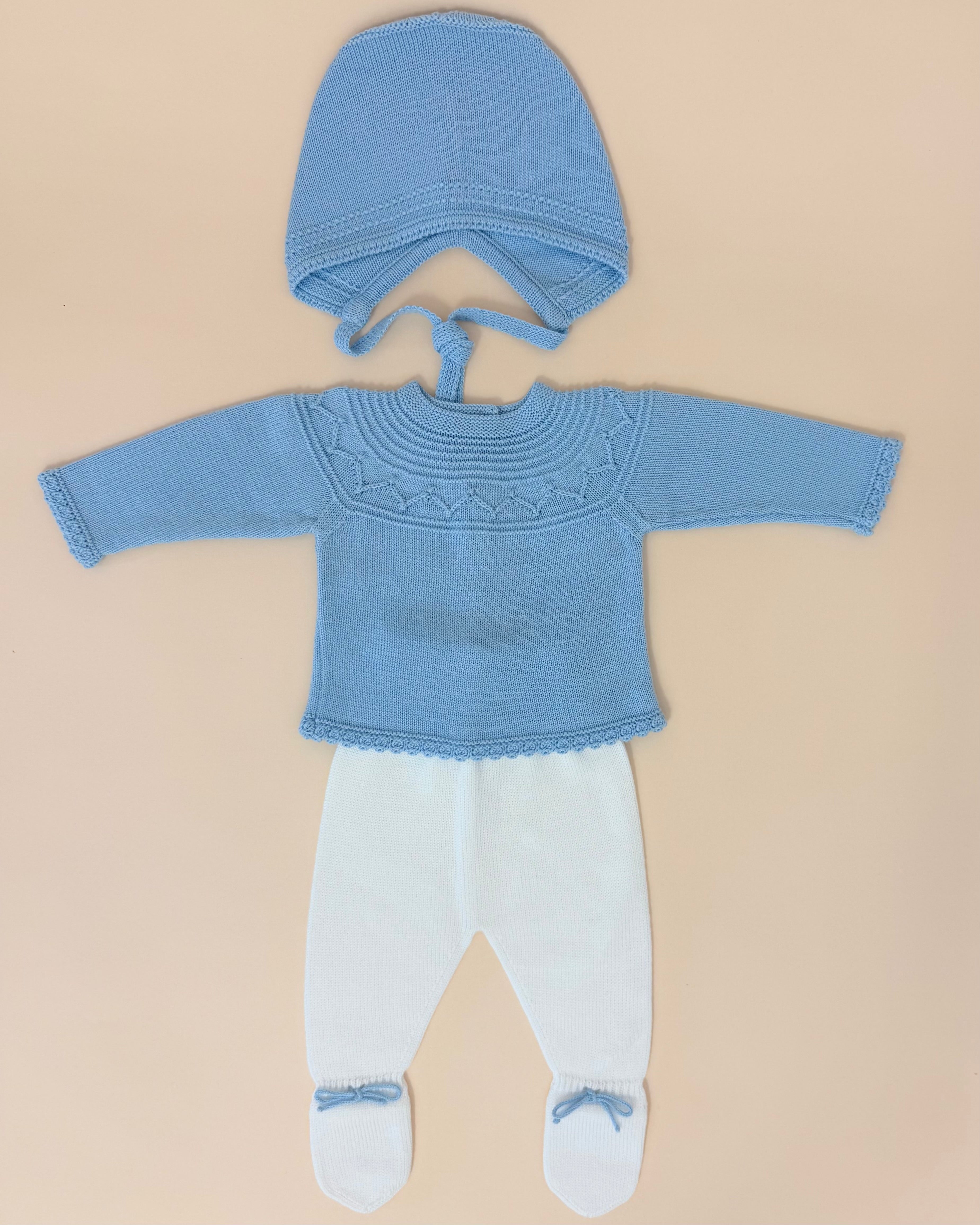 Handcrafted in Spain with exceptional quality, the set includes a blue knitted top with back button closure, white footed pants, and a coordinated blue bonnet—creating a classic, polished look for your little one’s first special moments.