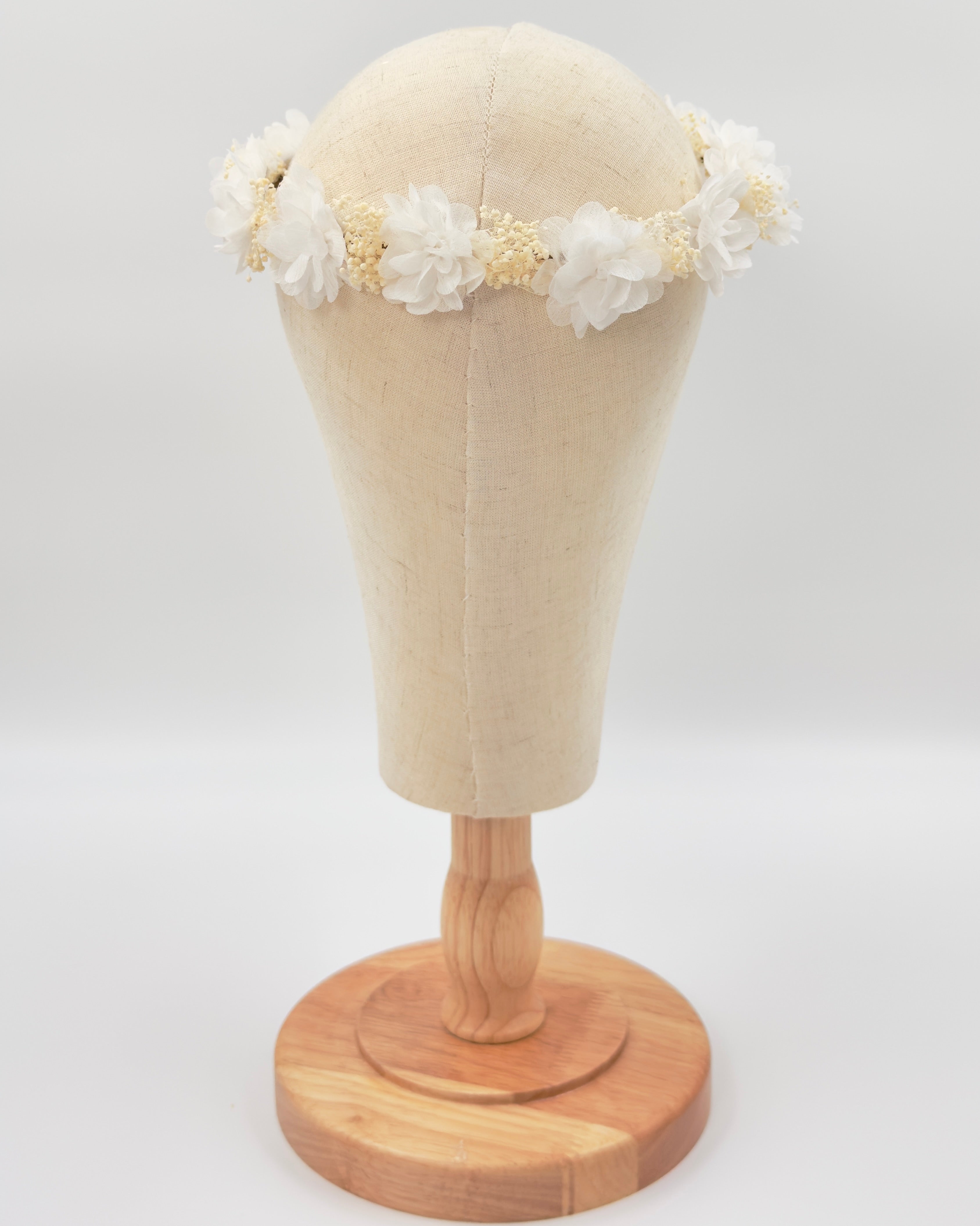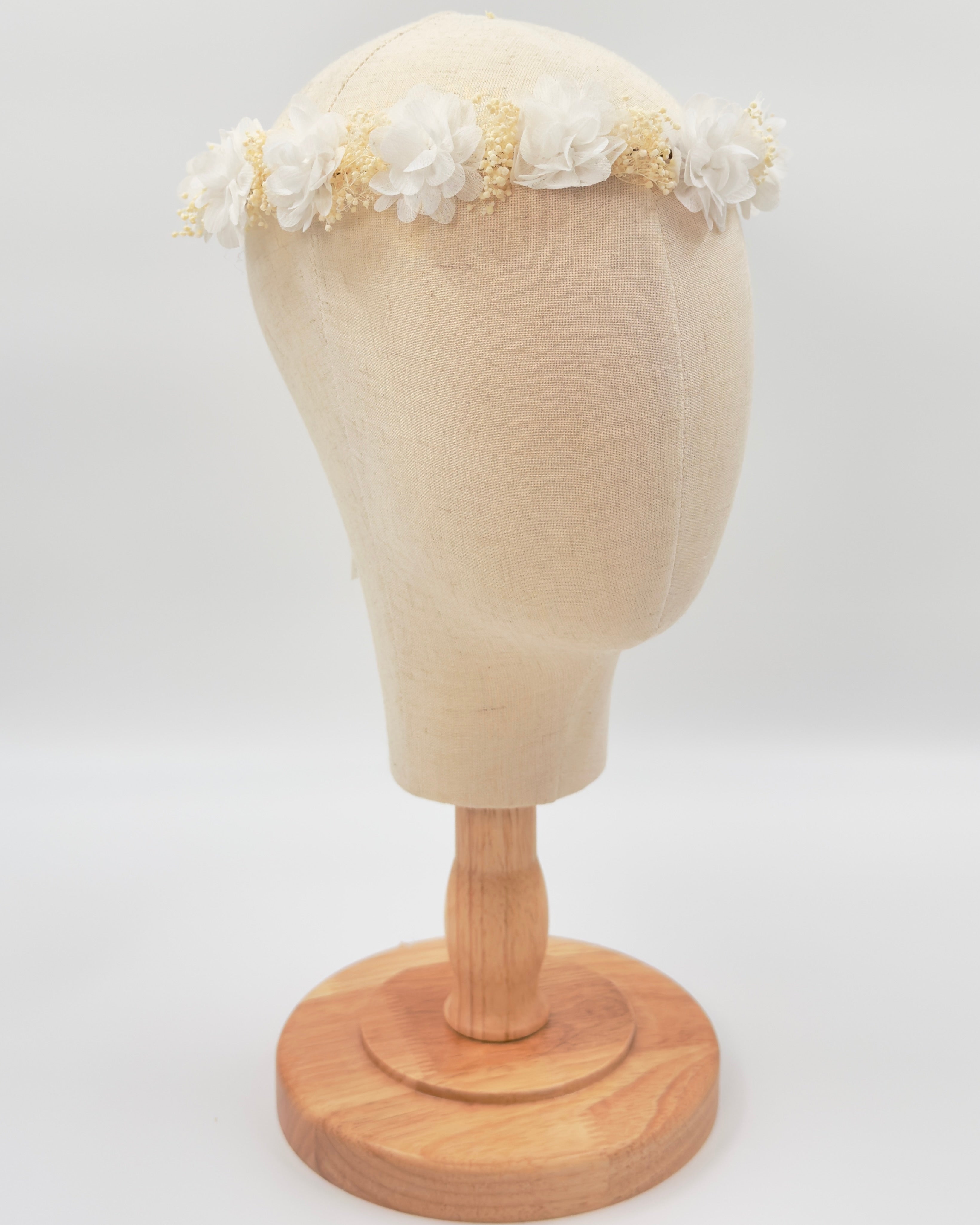 Gorgeous statement headpiece for girls, made with fabric flowers and natural details.