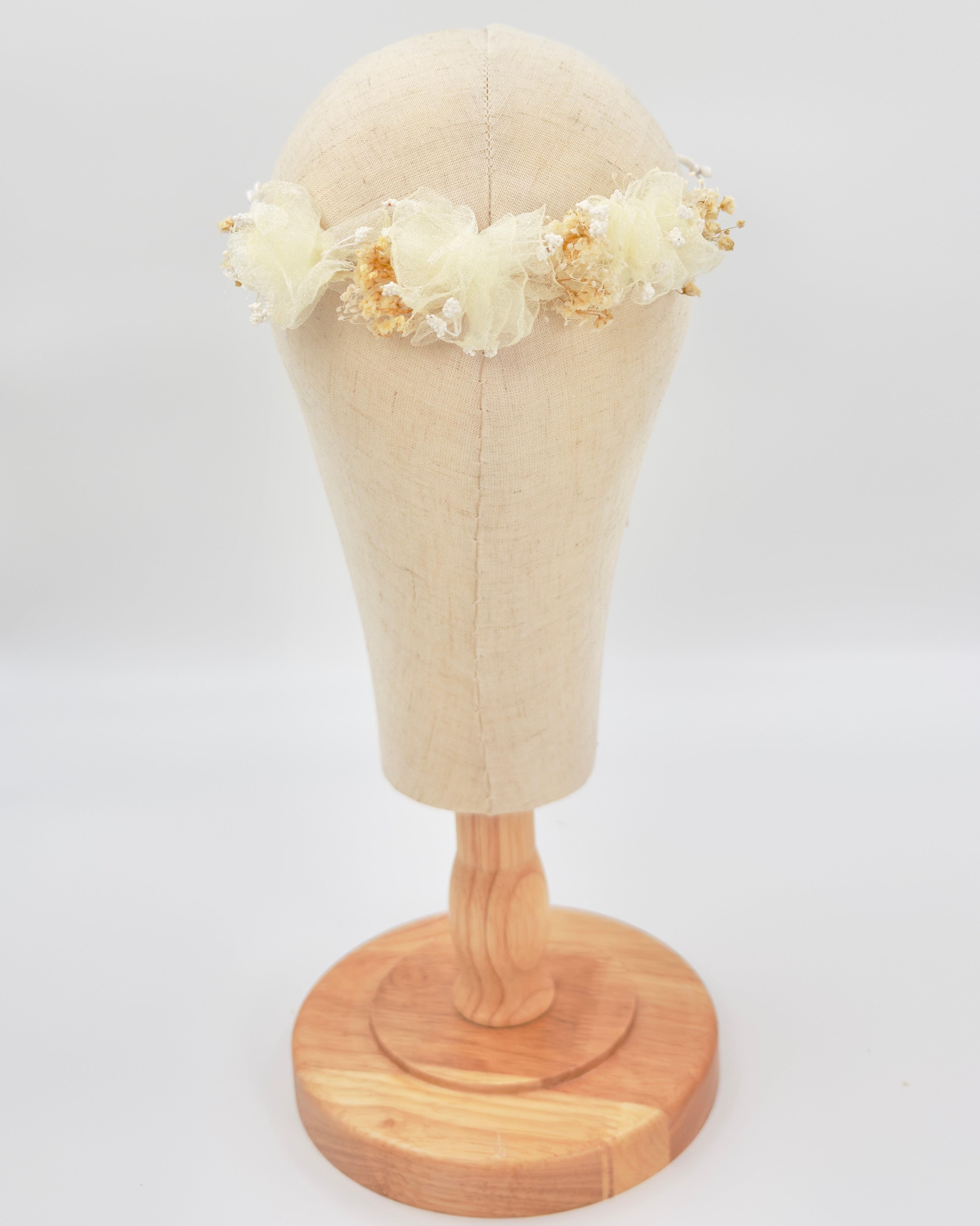 Gorgeous statement headpiece for girls, made with fabric flowers and natural details.