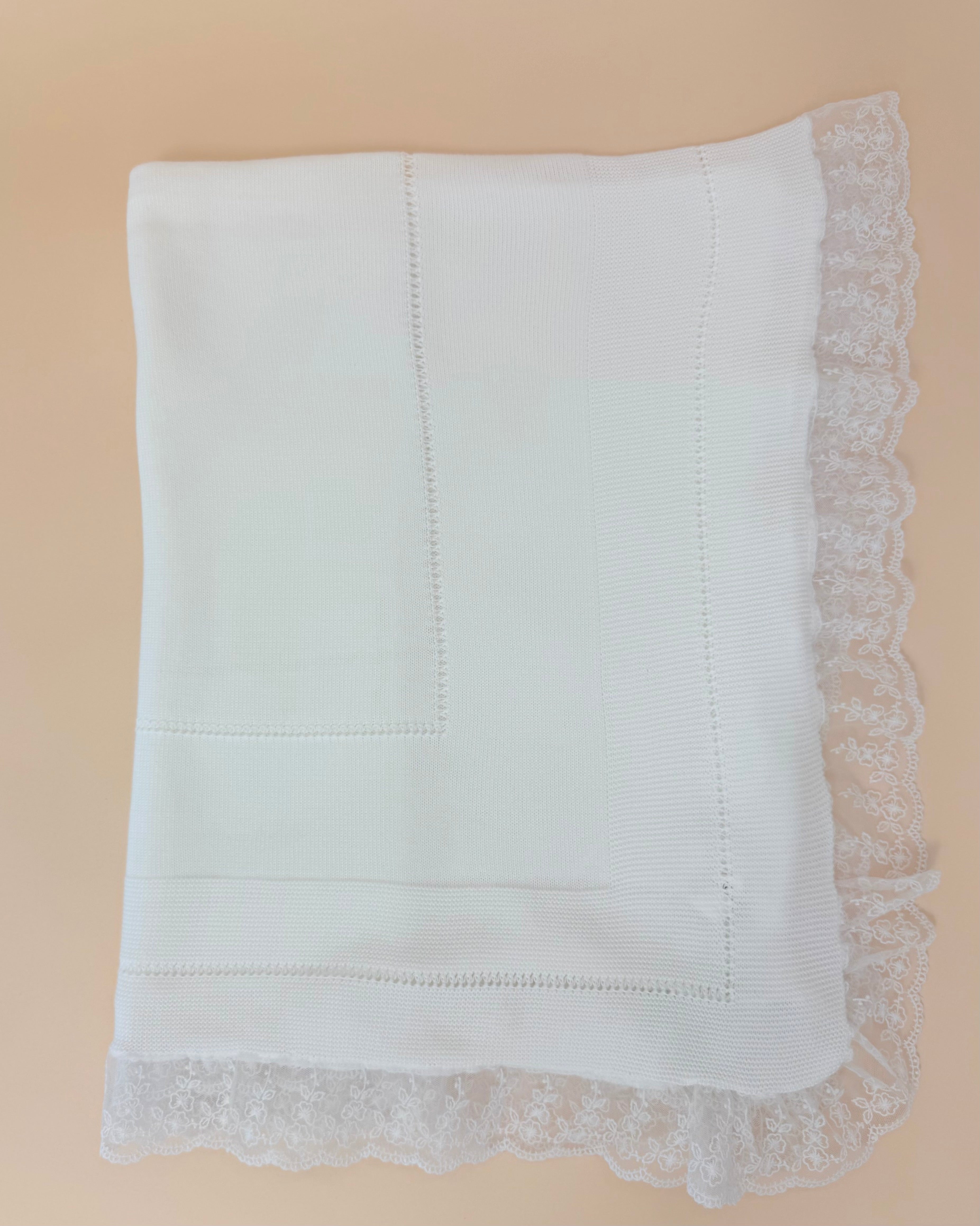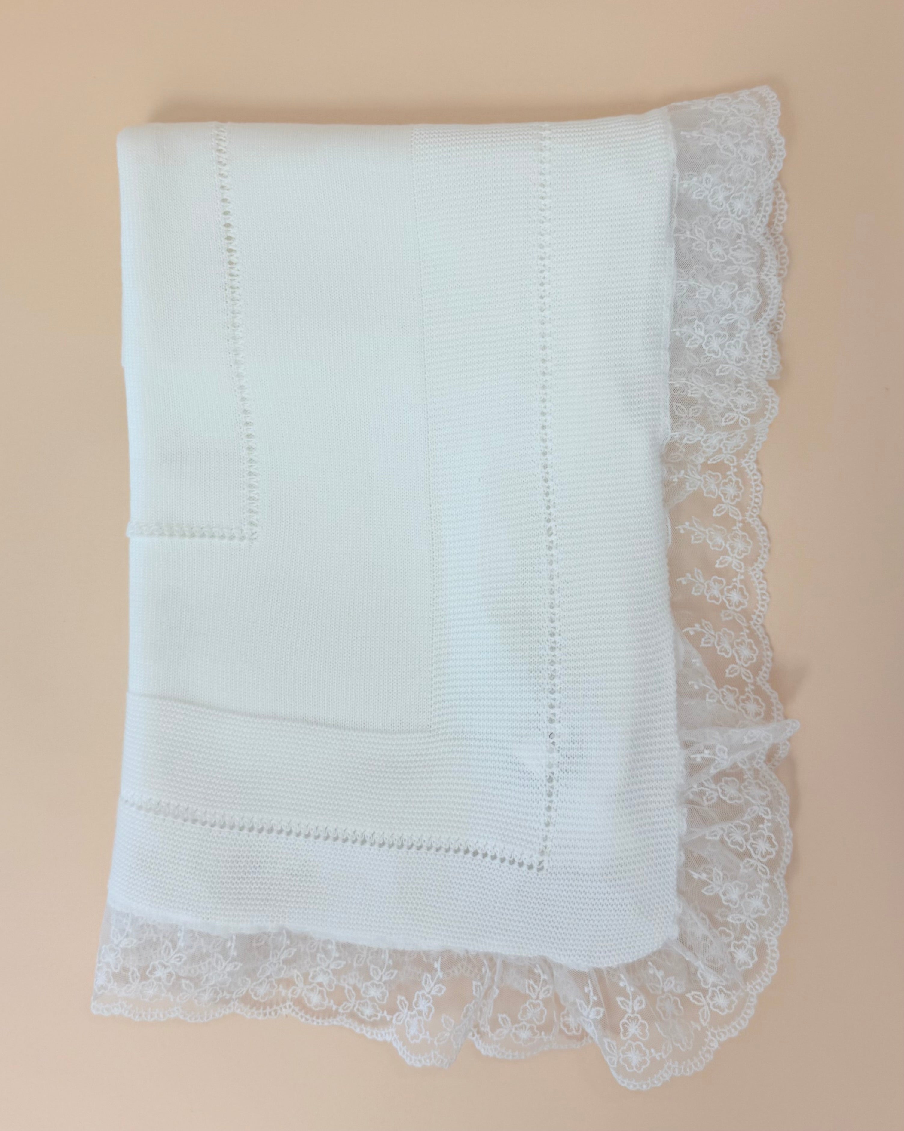 Wrap your little one in timeless elegance with our handcrafted white knitted blanket, delicately finished with a refined lace trim along the edges.