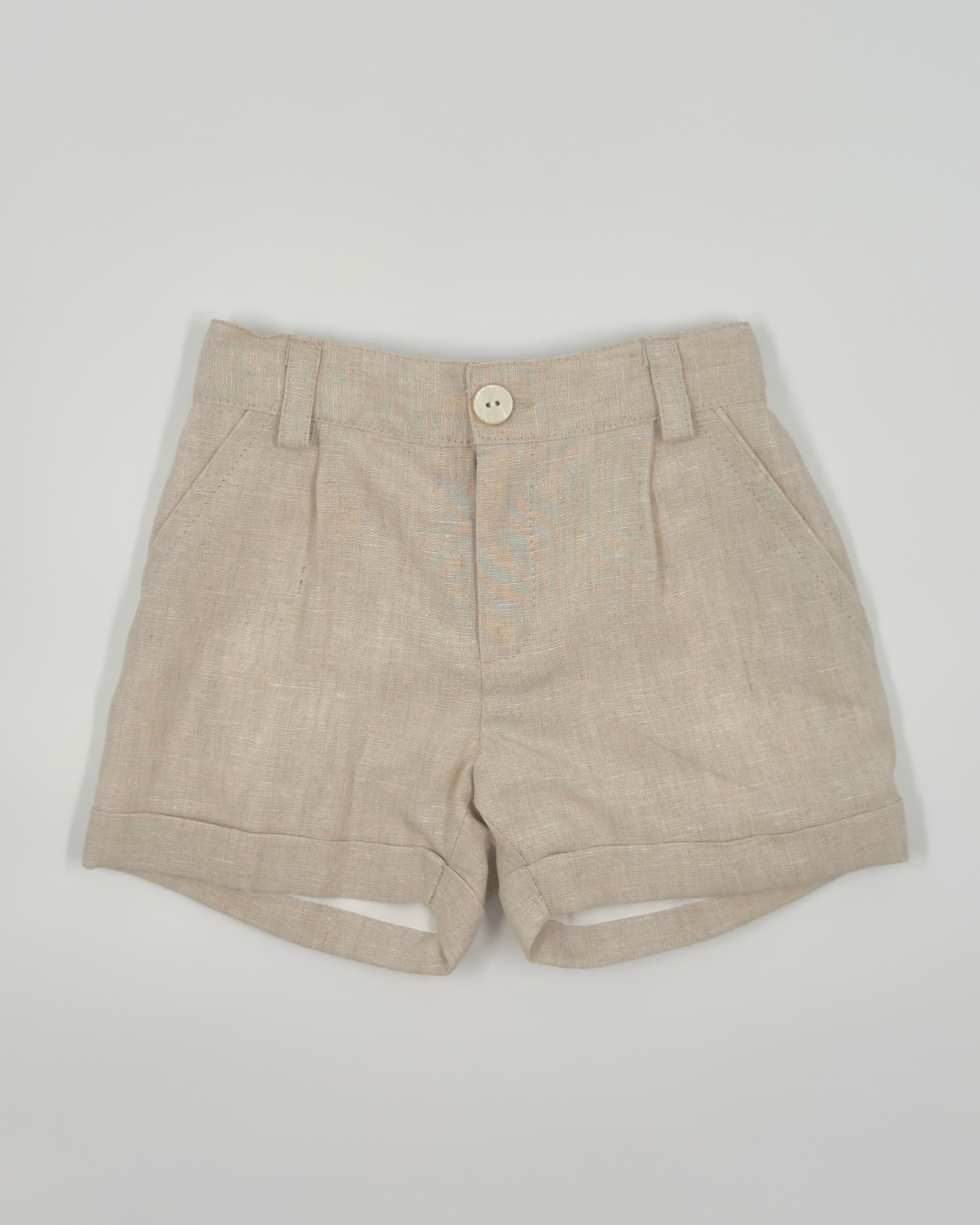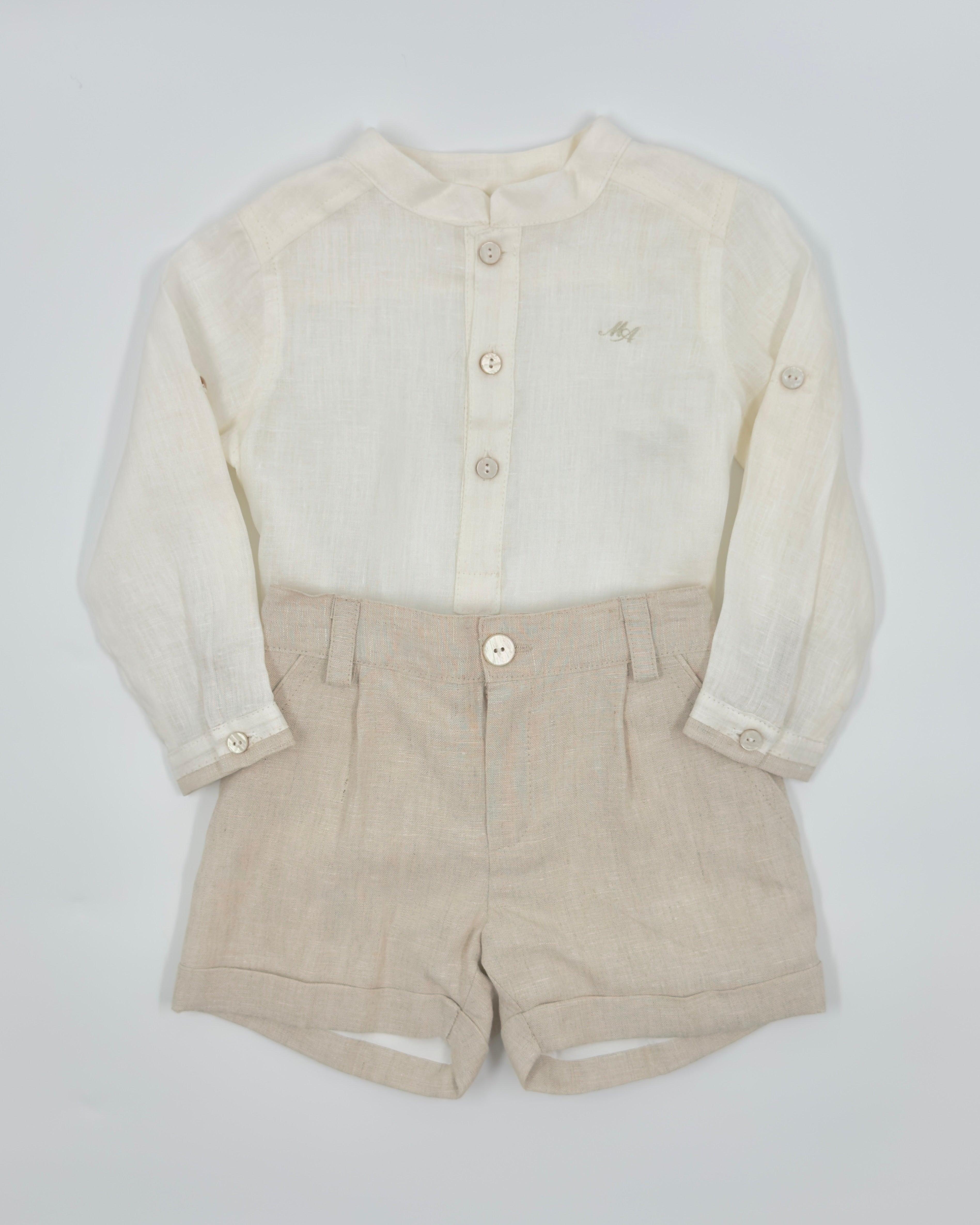 The Santiago outfit is a refined two-piece set for baby boys, perfect for special occasions where style and comfort are key. The long-sleeve shirt in soft off-white features a modern Mao collar and front button closure for a polished, timeless look. It pairs beautifully with tailored sand-colored shorts, creating a sophisticated ensemble ideal for weddings, christenings, or family celebrations.