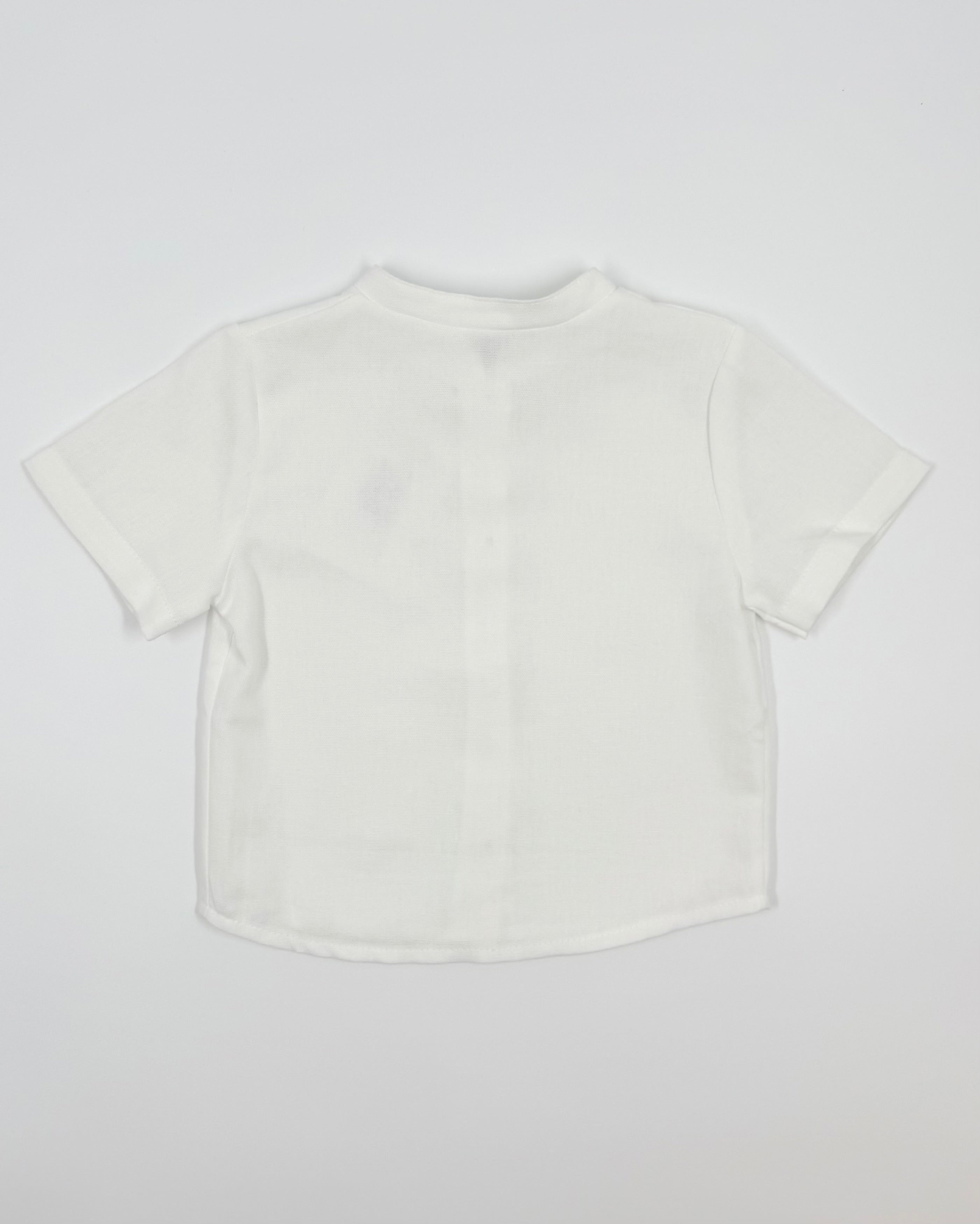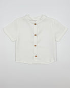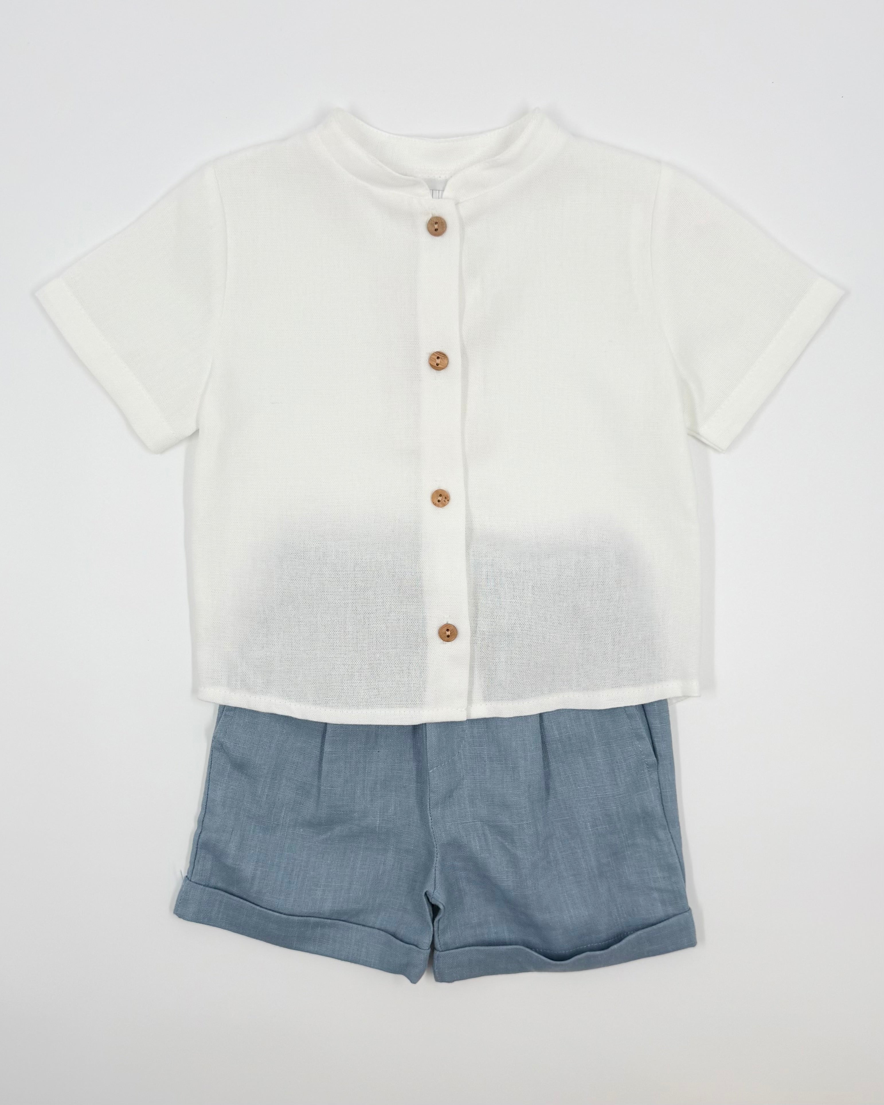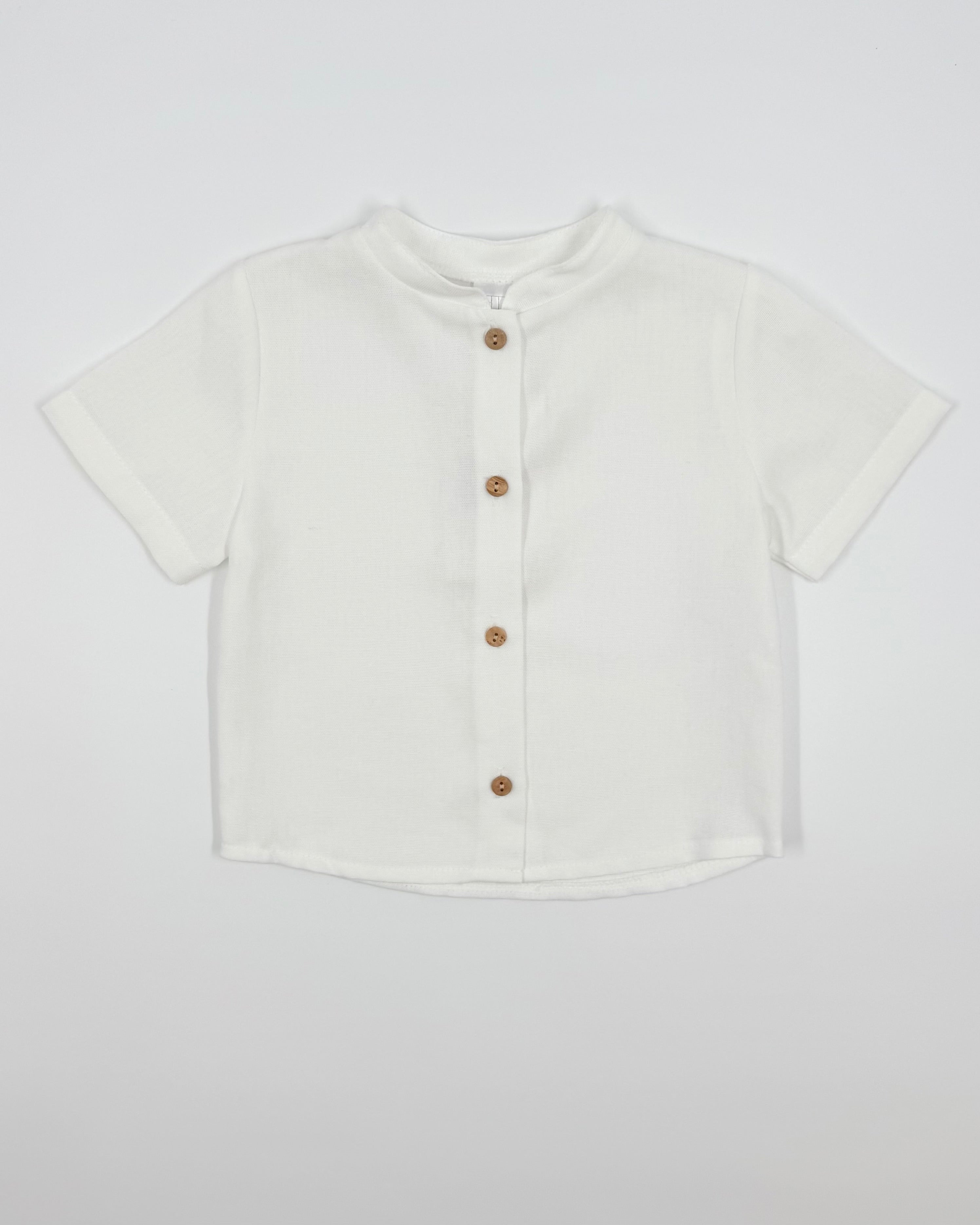 Dress your baby boy in timeless elegance with this charming two-piece set. The crisp white shirt features short sleeves, a classic mao collar, and delicate wooden buttons down the front for a refined, natural touch.