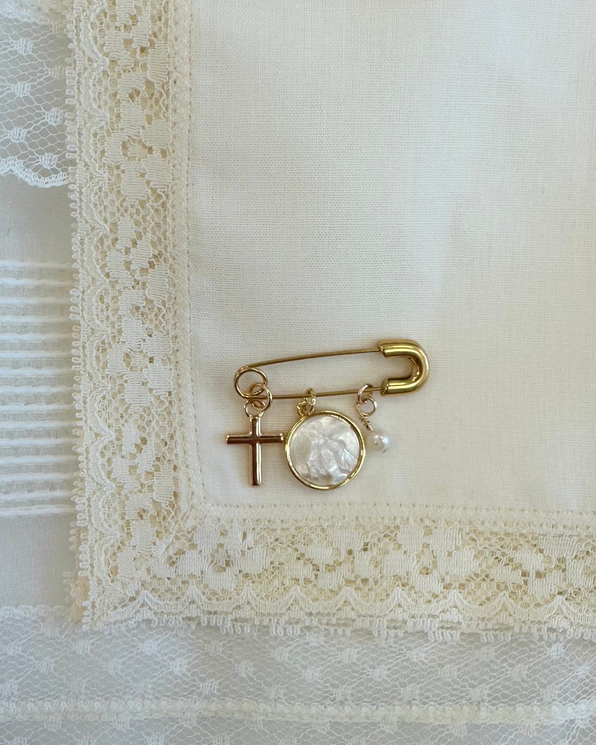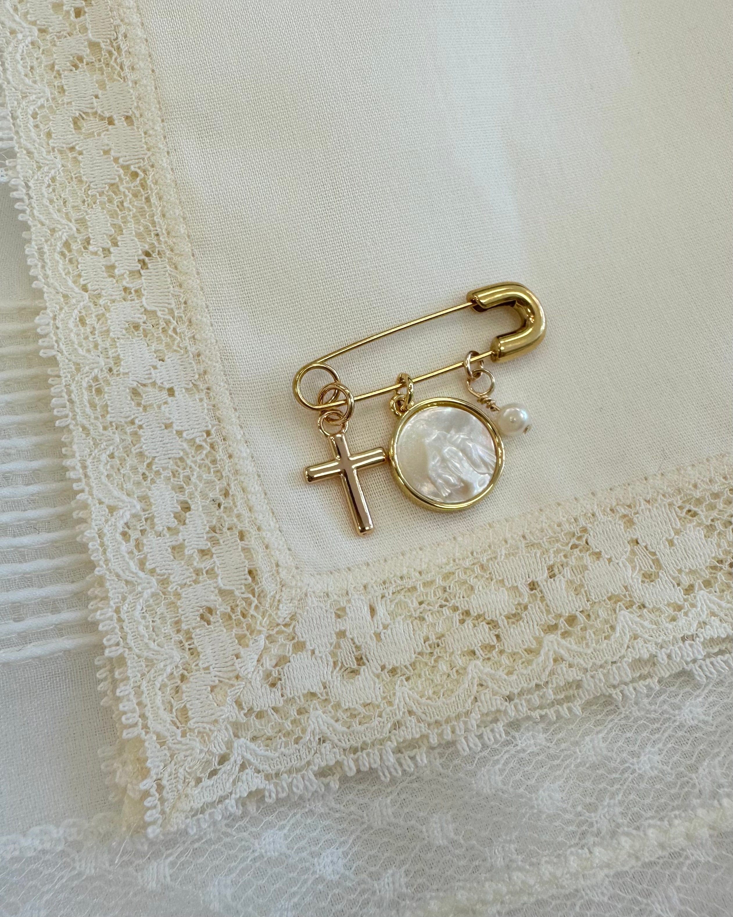 Baby Pin with Cross, Virgin of Miracles & Pearl