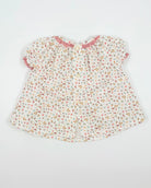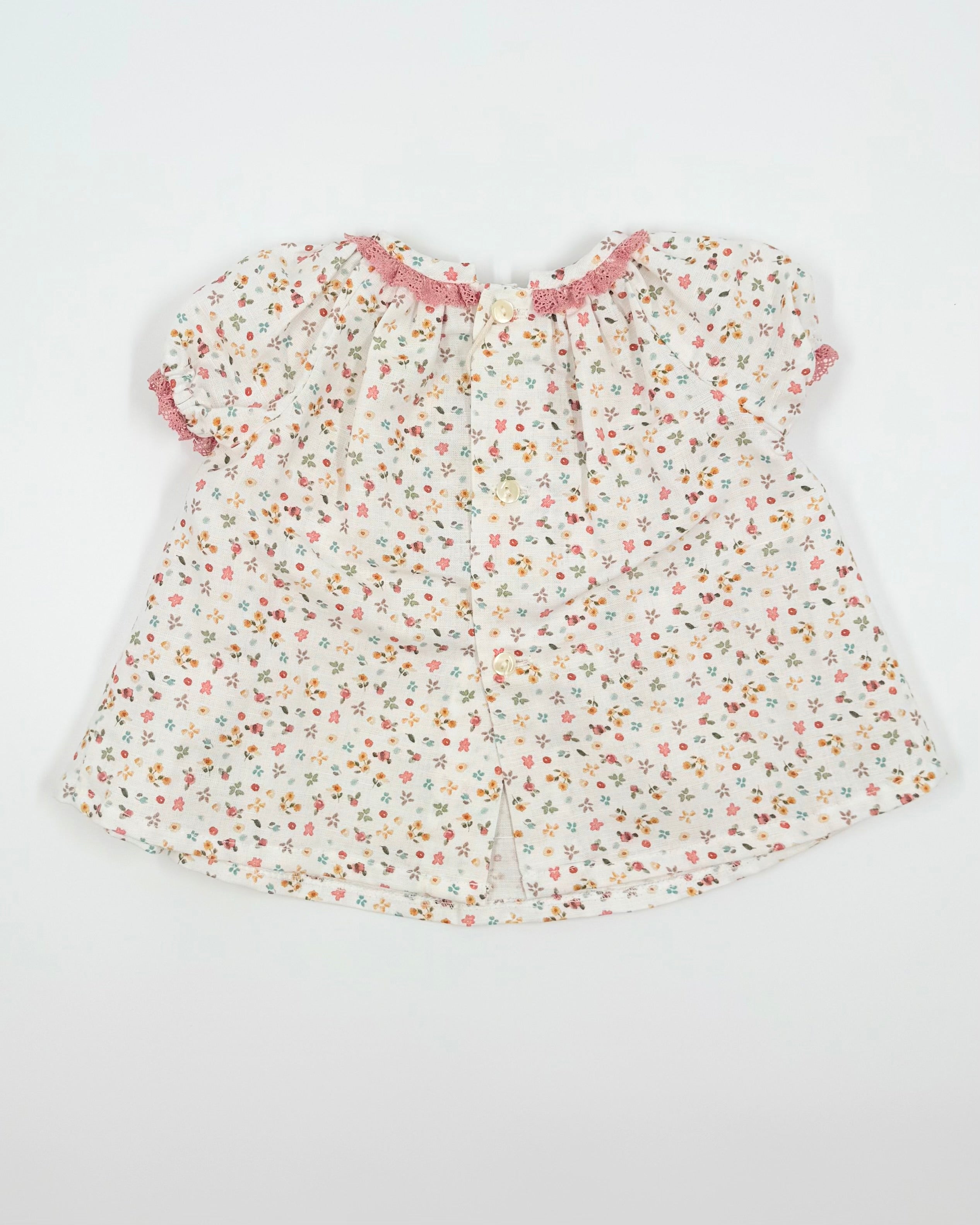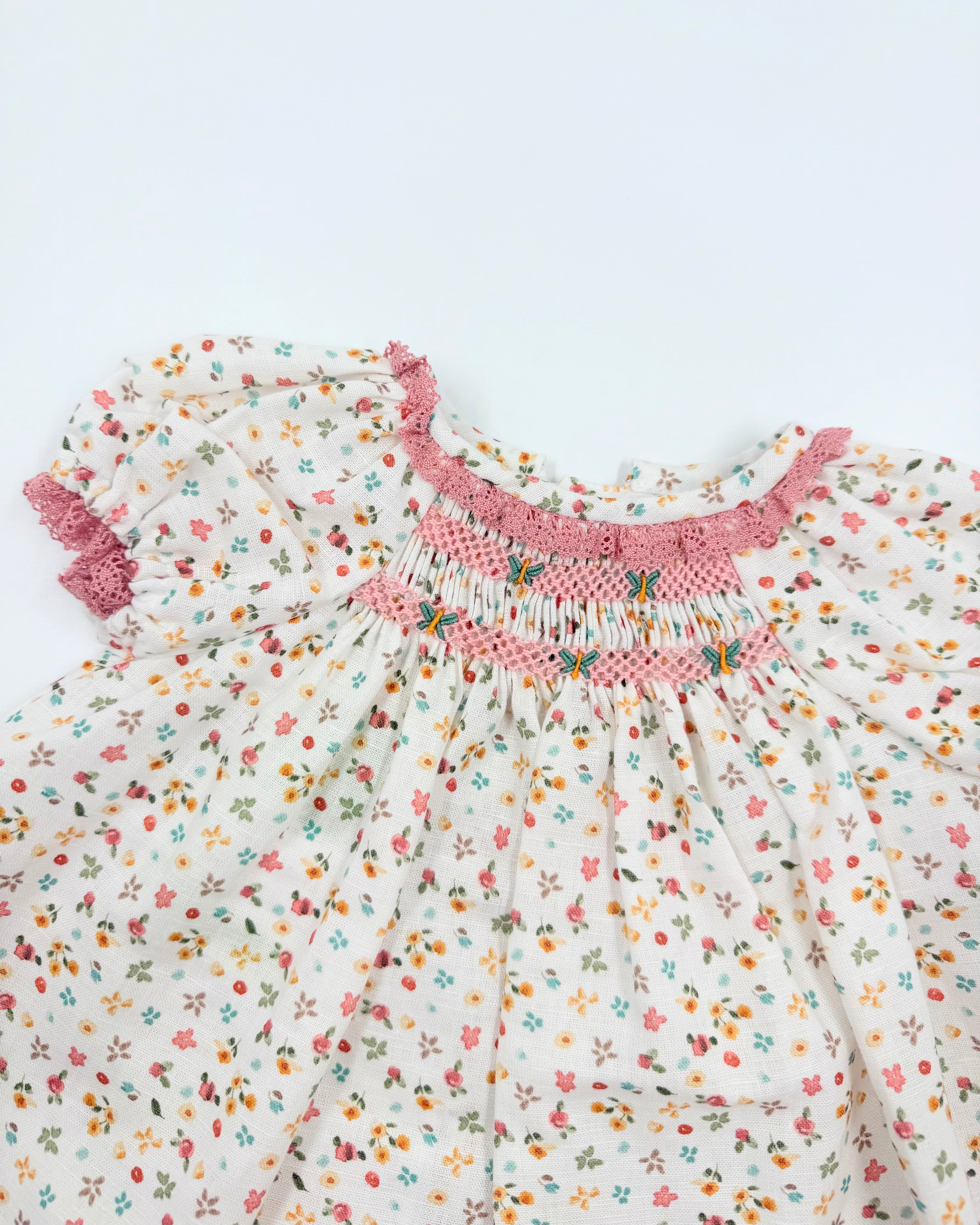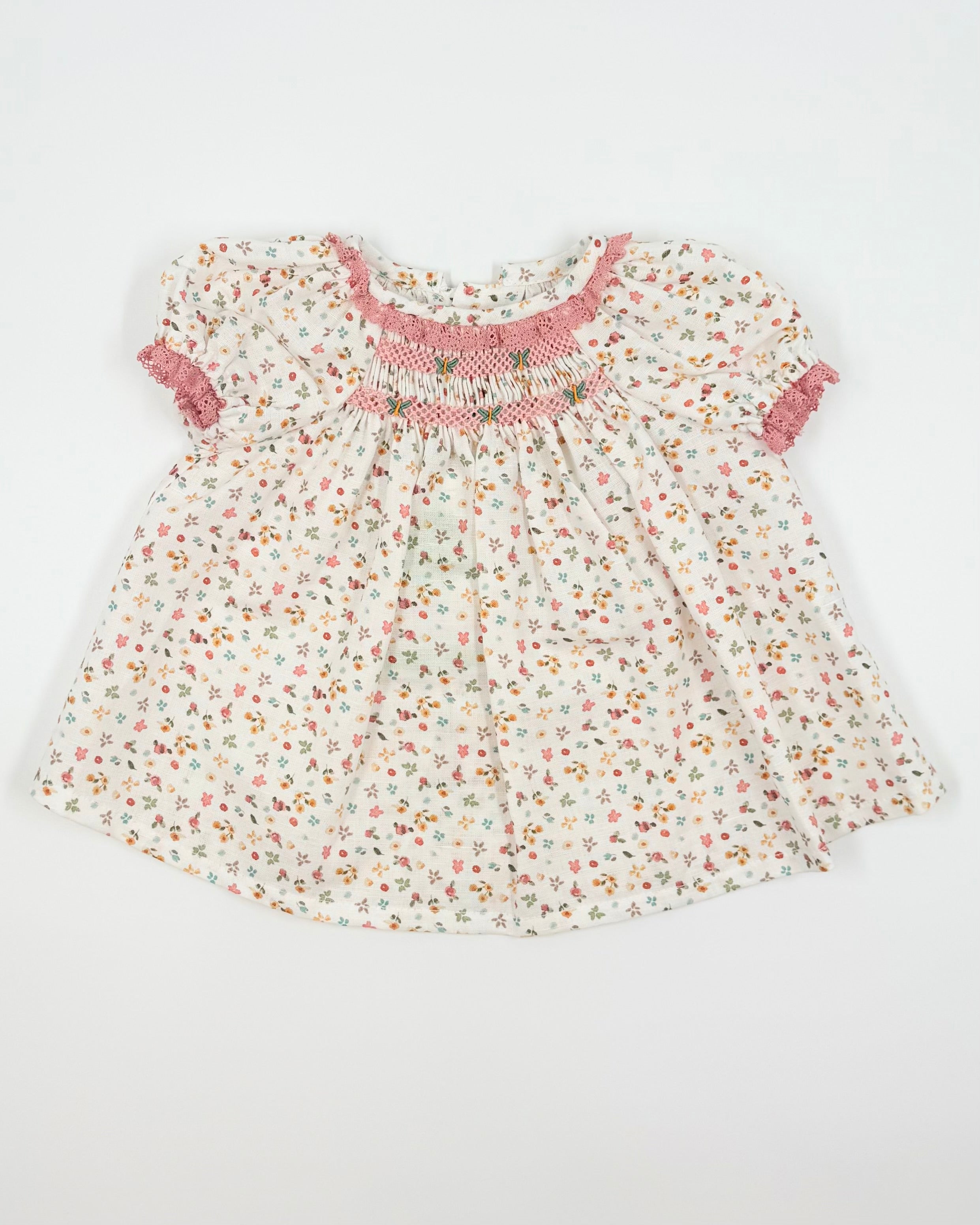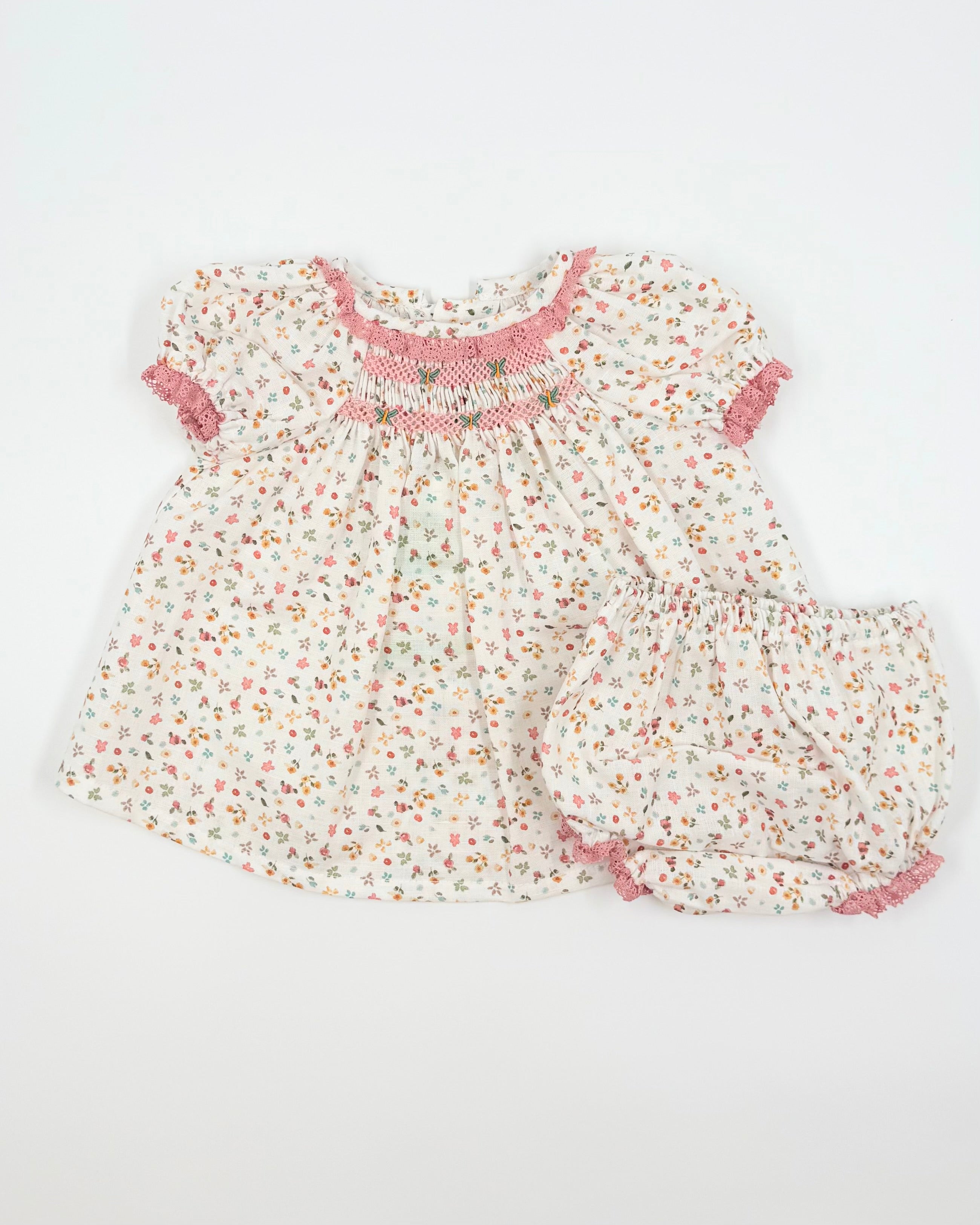 This exquisite baby dress with matching bloomers is crafted from lightweight linen adorned with a soft floral pattern. The dress features a delicate smocked design on the chest, adding a timeless and charming touch. Made in Spain with attention to detail and quality, it’s a sweet and elegant choice for warm-weather occasions or everyday grace.