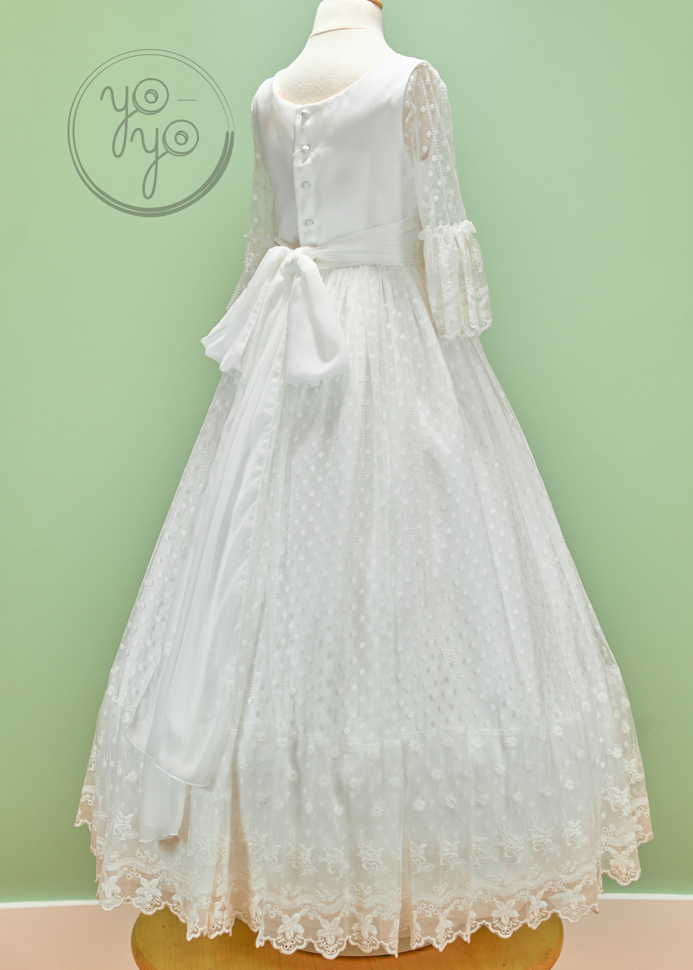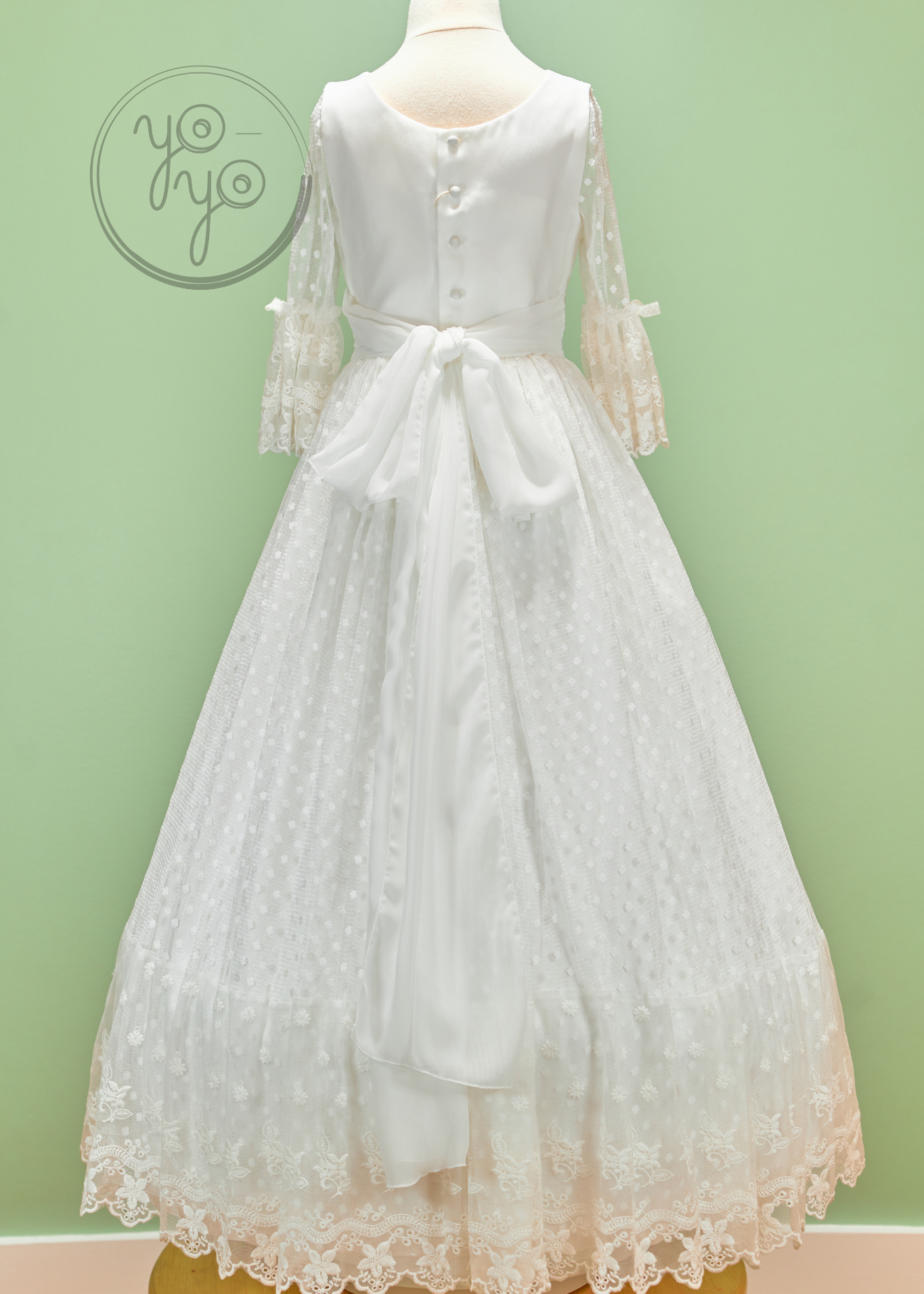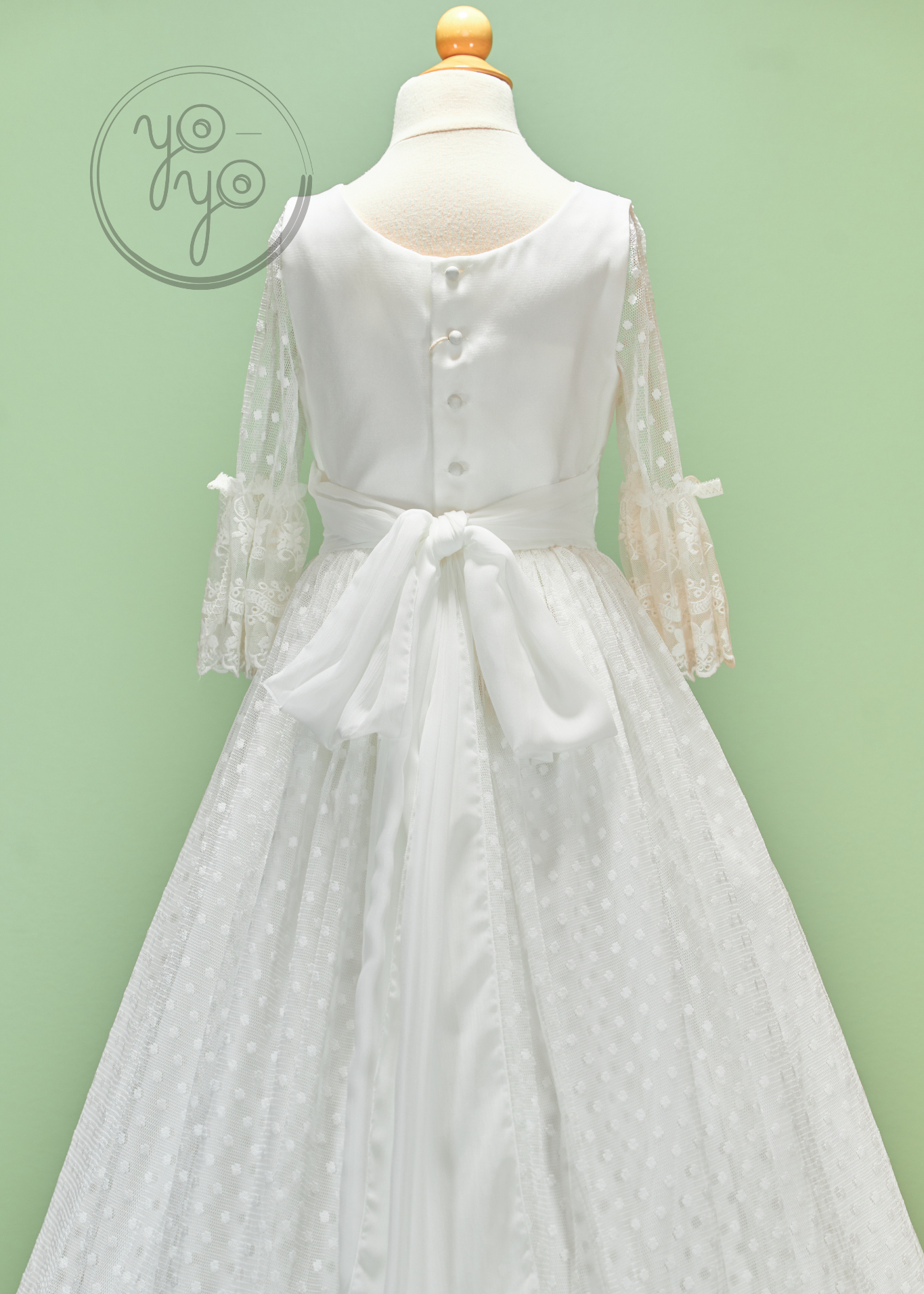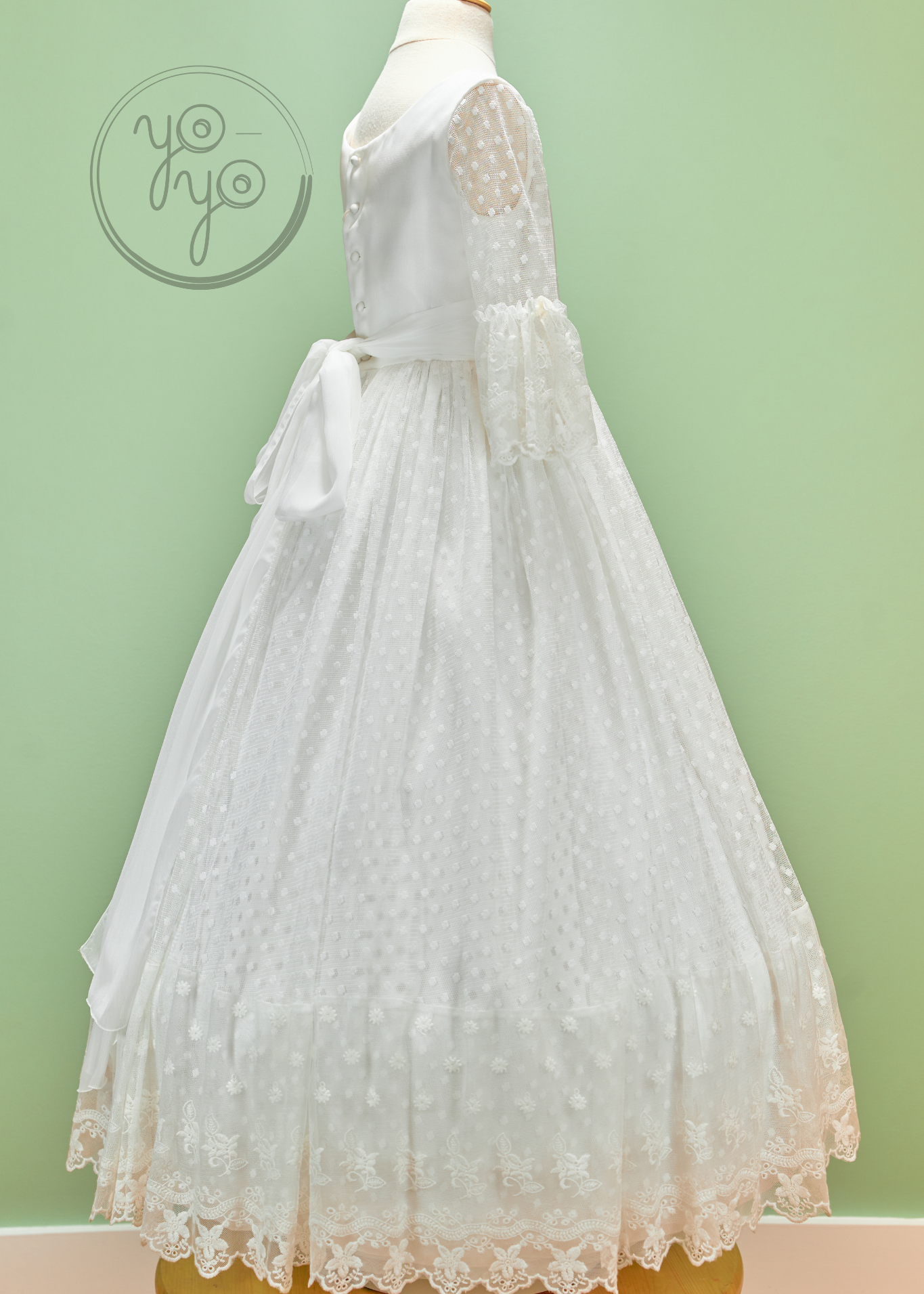 The Cassia First Communion Dress is a stunning boho-inspired gown that blends airy elegance with timeless tradition. Crafted in soft French tulle embroidered with delicate polka dots, this gown is light, flowing, and perfect for a meaningful celebration.