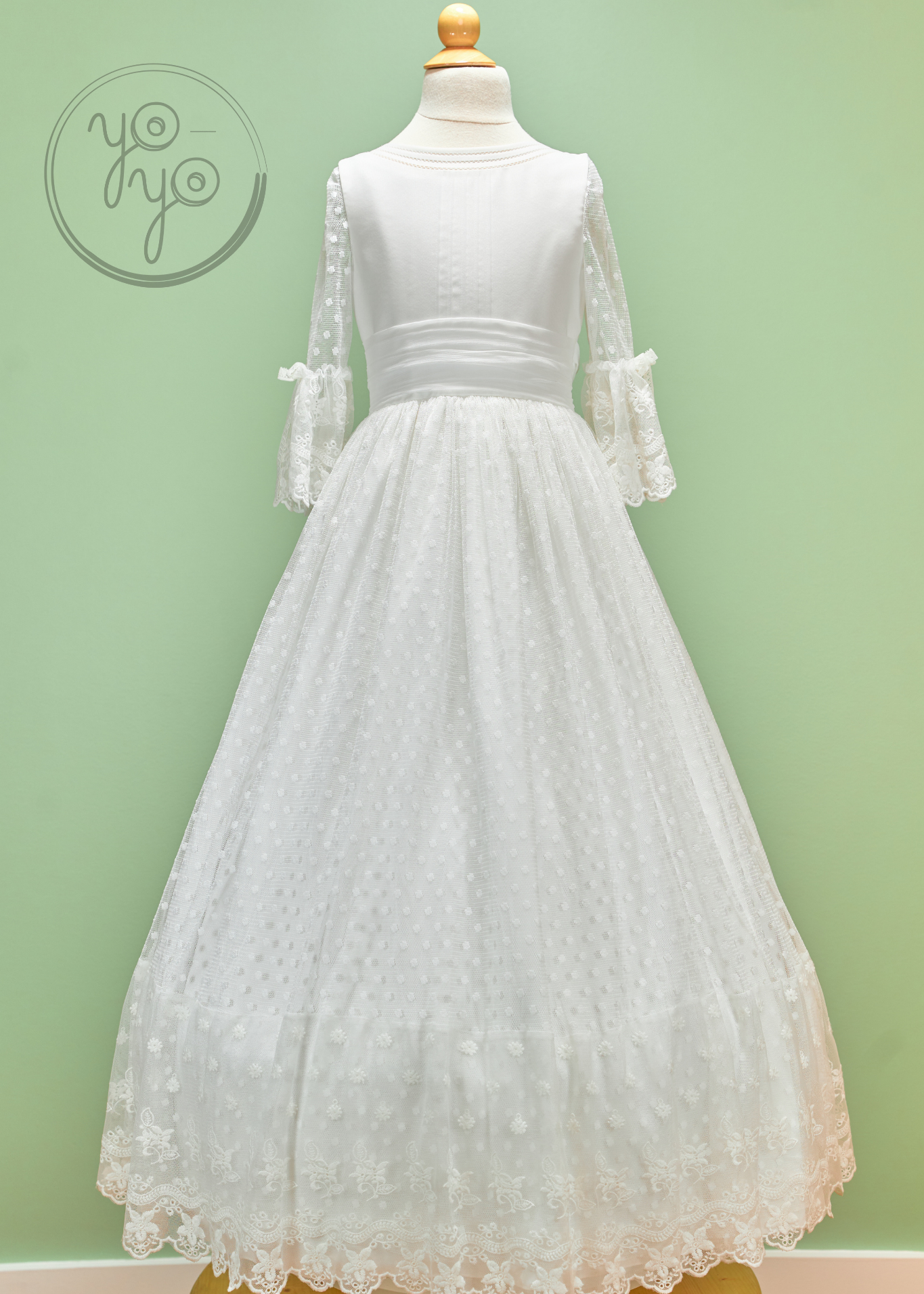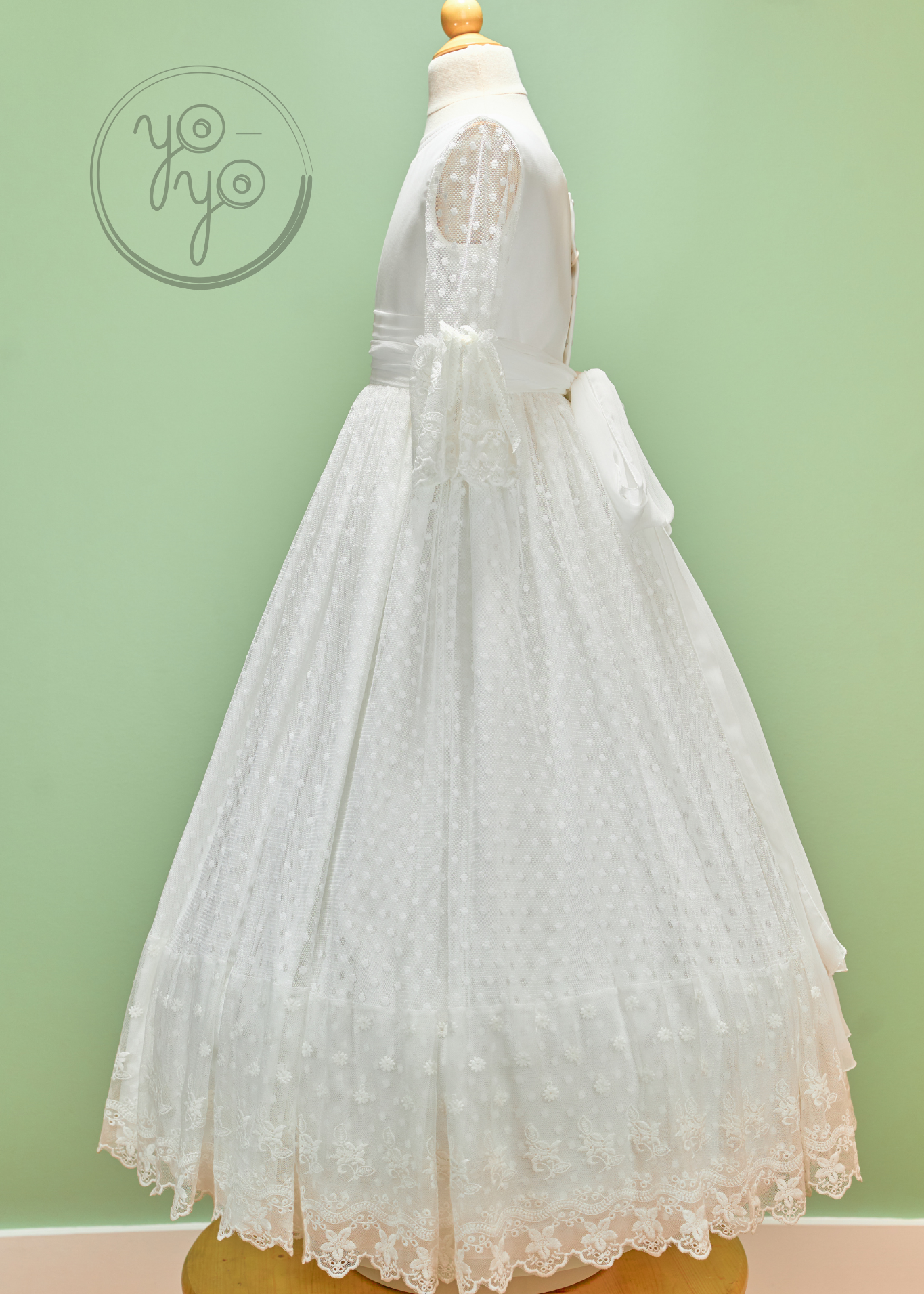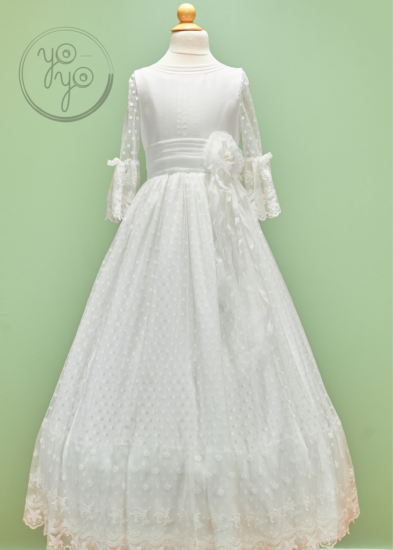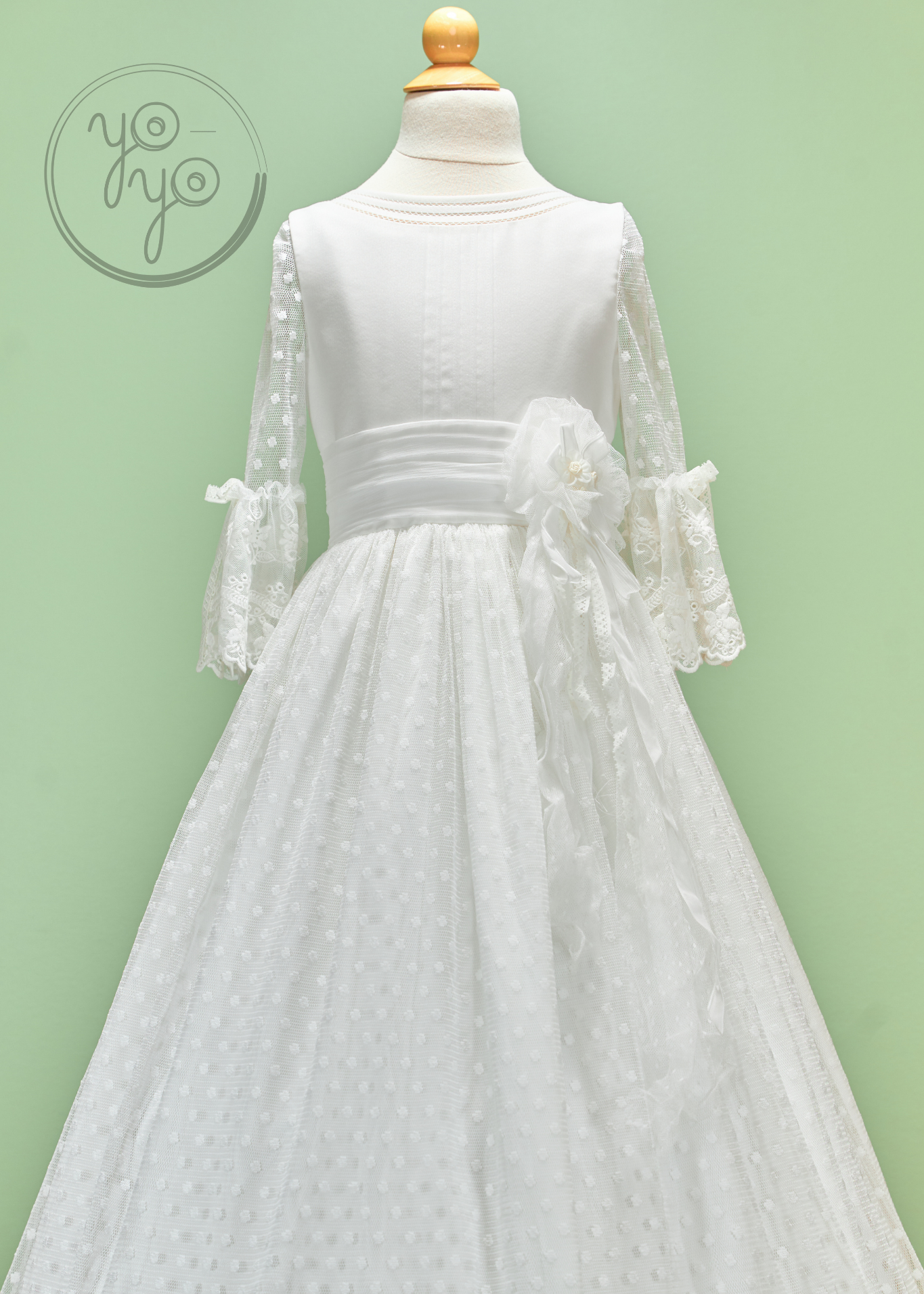 The Cassia First Communion Dress is a stunning boho-inspired gown that blends airy elegance with timeless tradition. Crafted in soft French tulle embroidered with delicate polka dots, this gown is light, flowing, and perfect for a meaningful celebration.