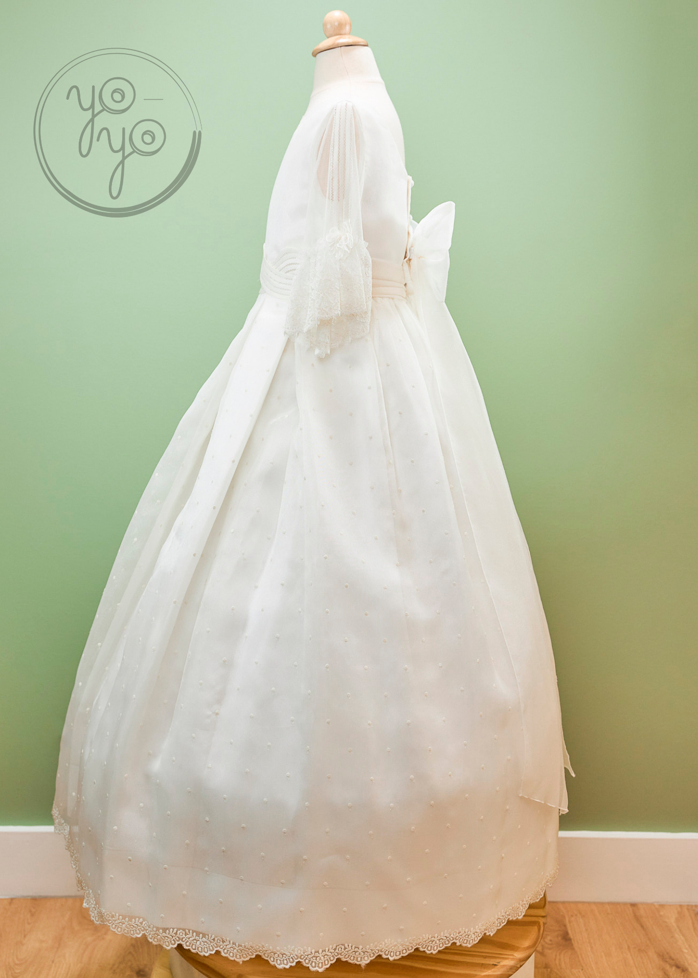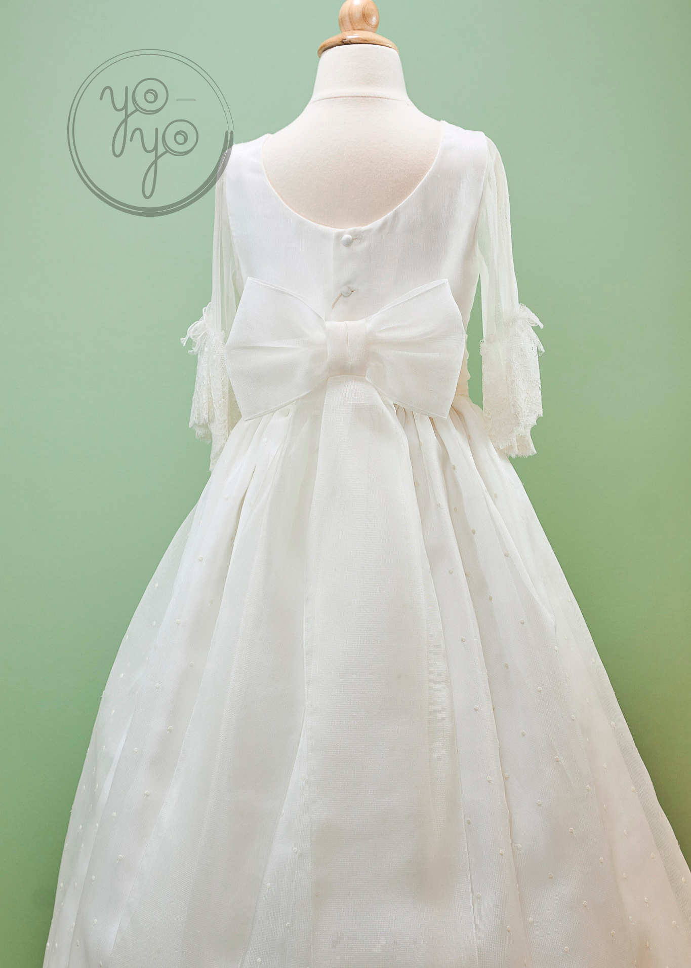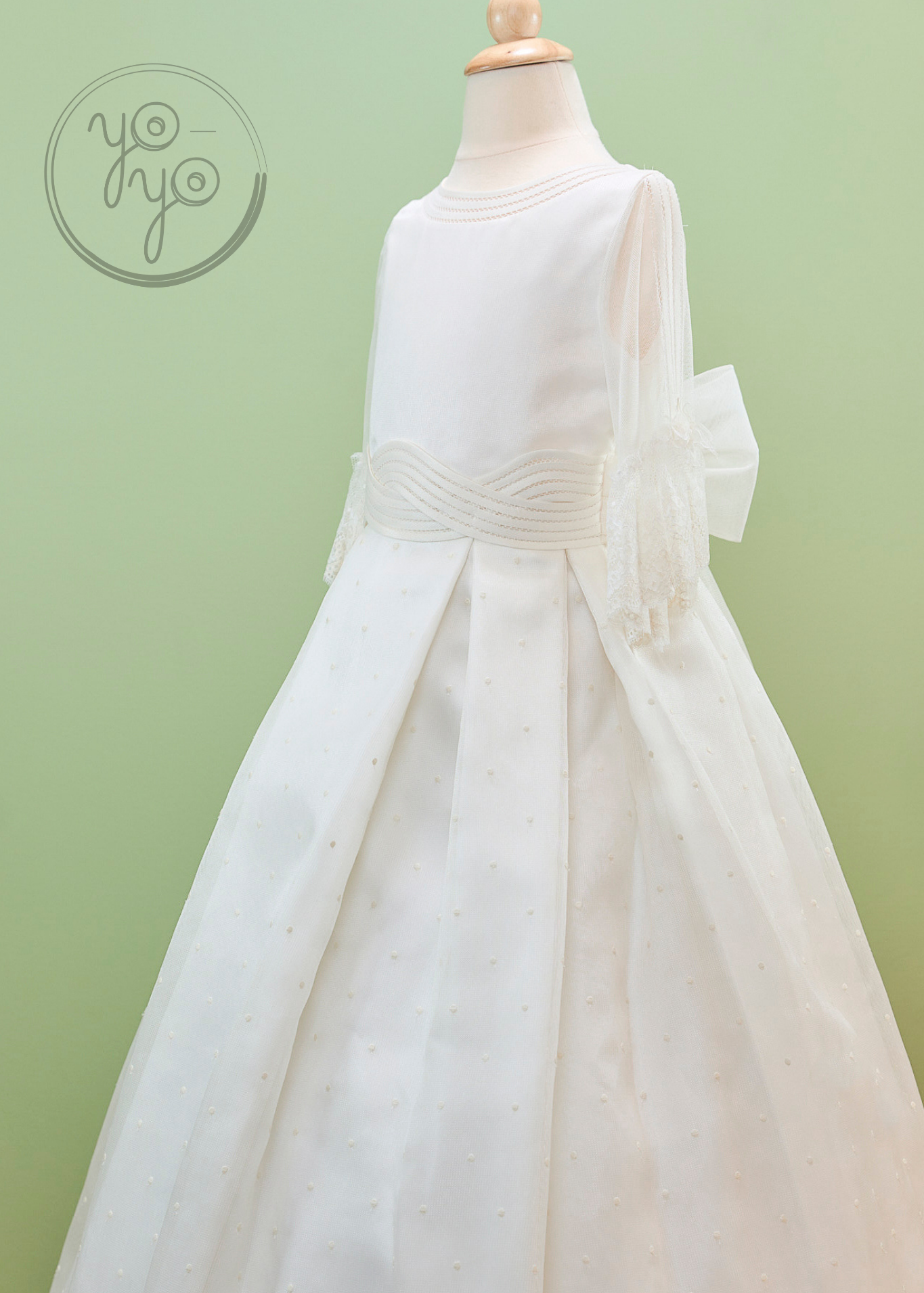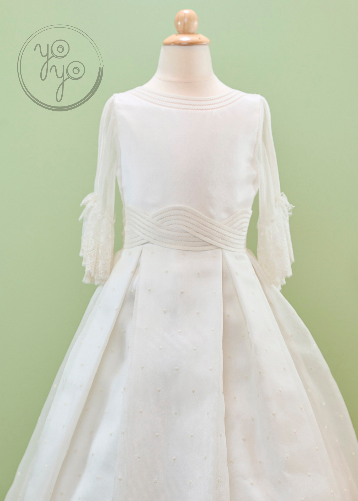 The Ceibo First Communion Dress is a refined and elegant choice for a truly memorable celebration. This off-white gown features exquisite French sleeves and a full skirt adorned with subtle polka dots and a delicate lace edge—blending texture and tradition beautifully.