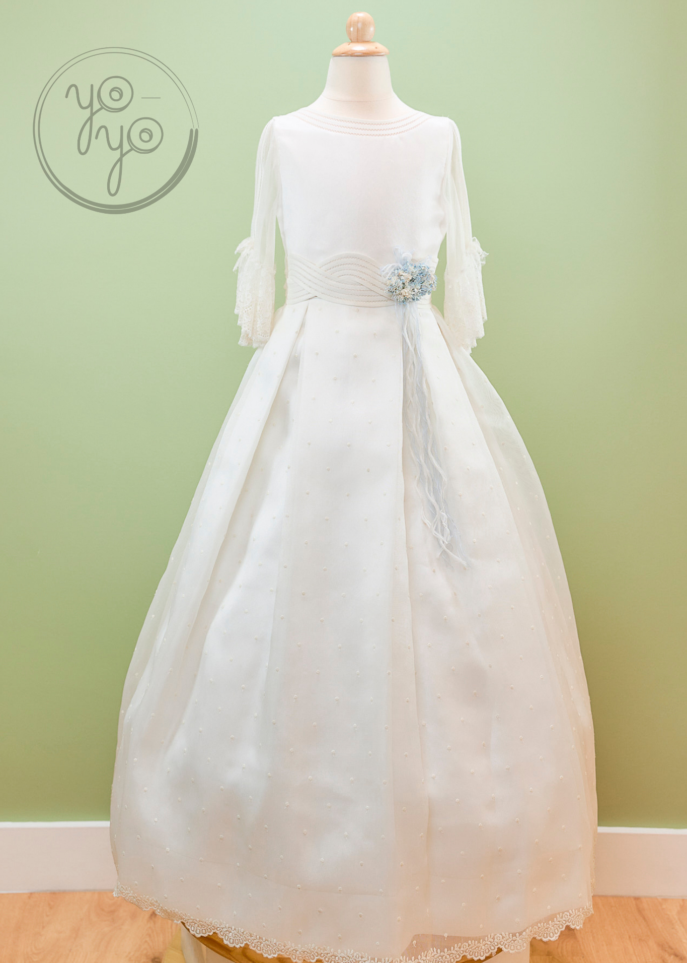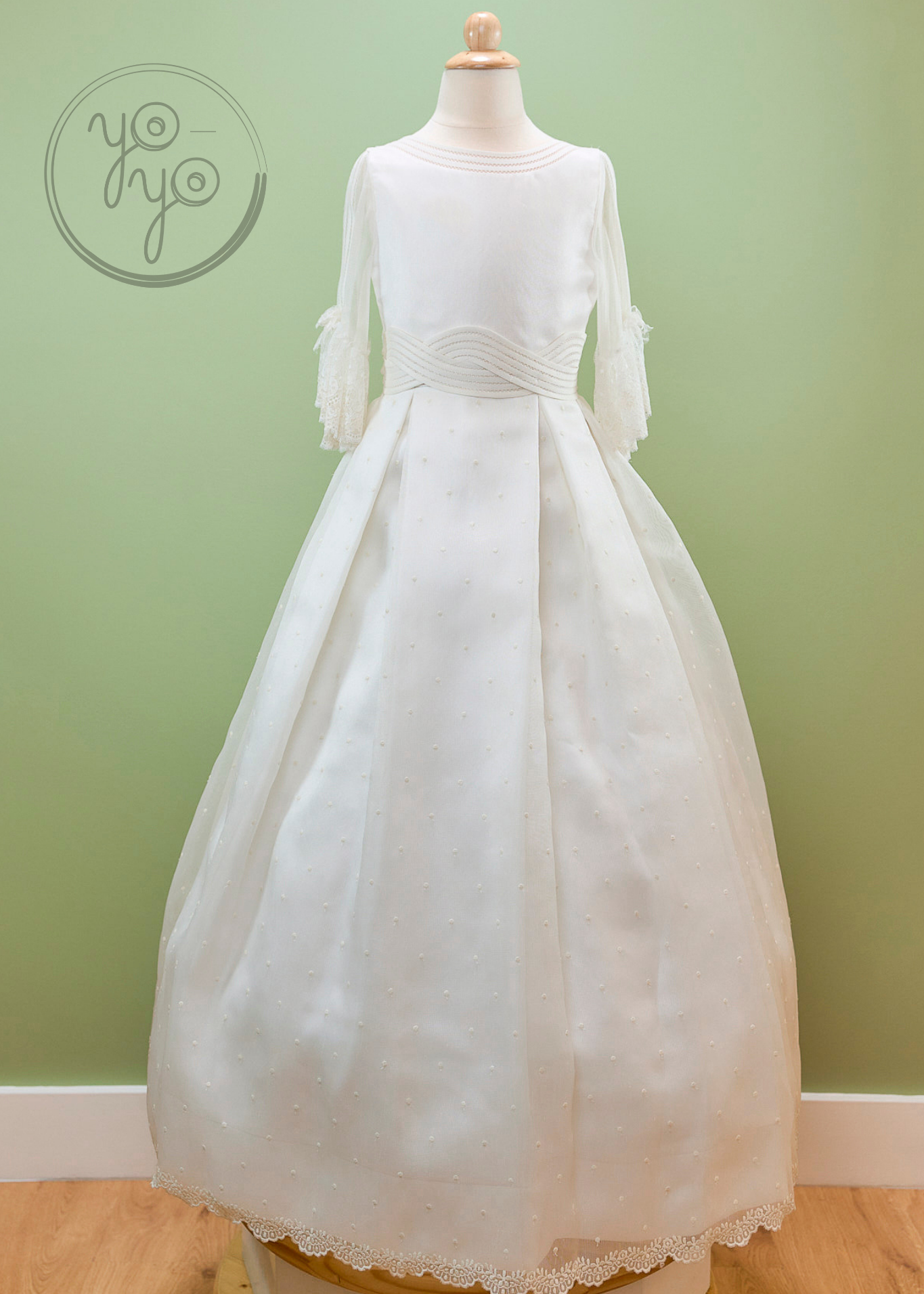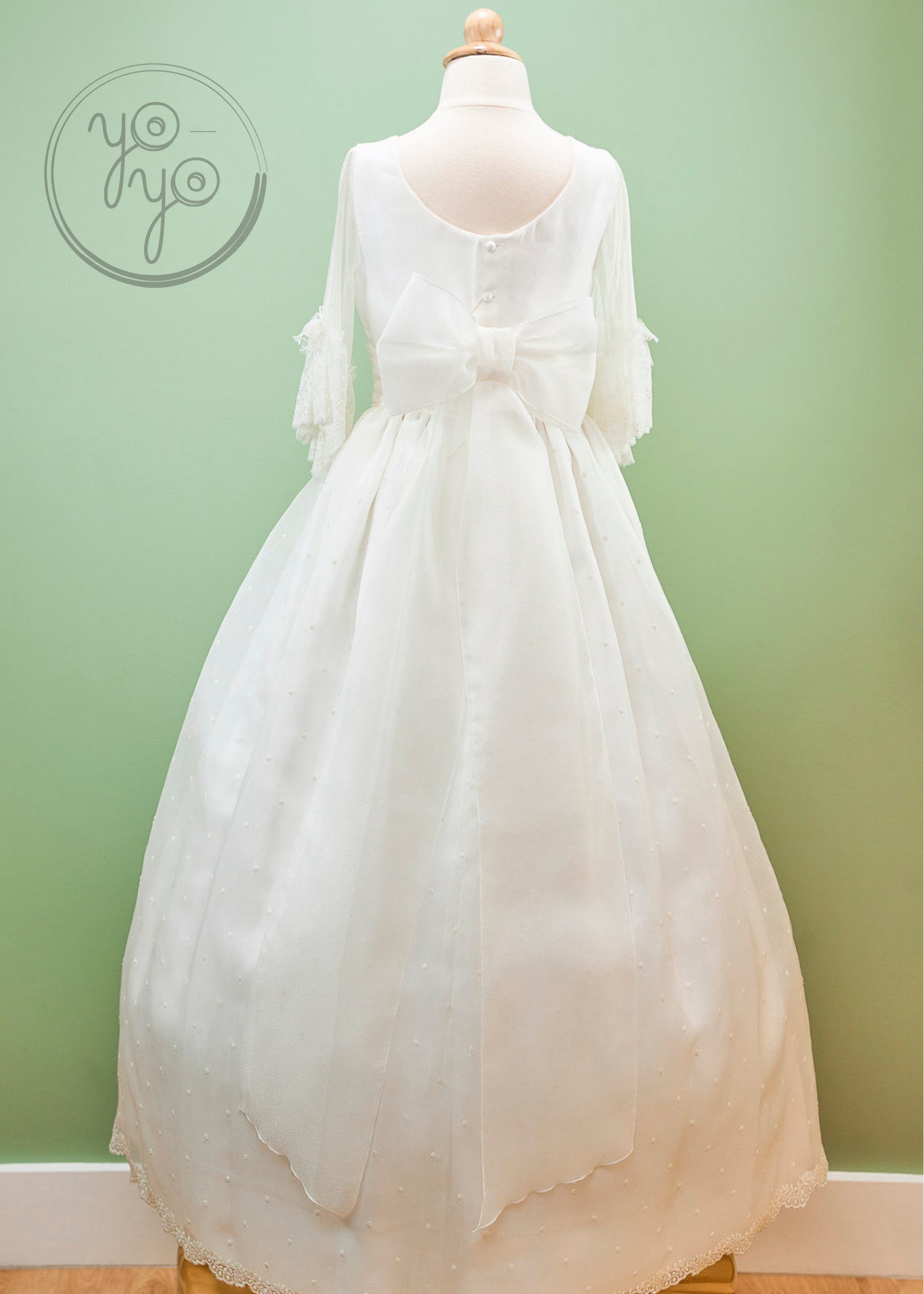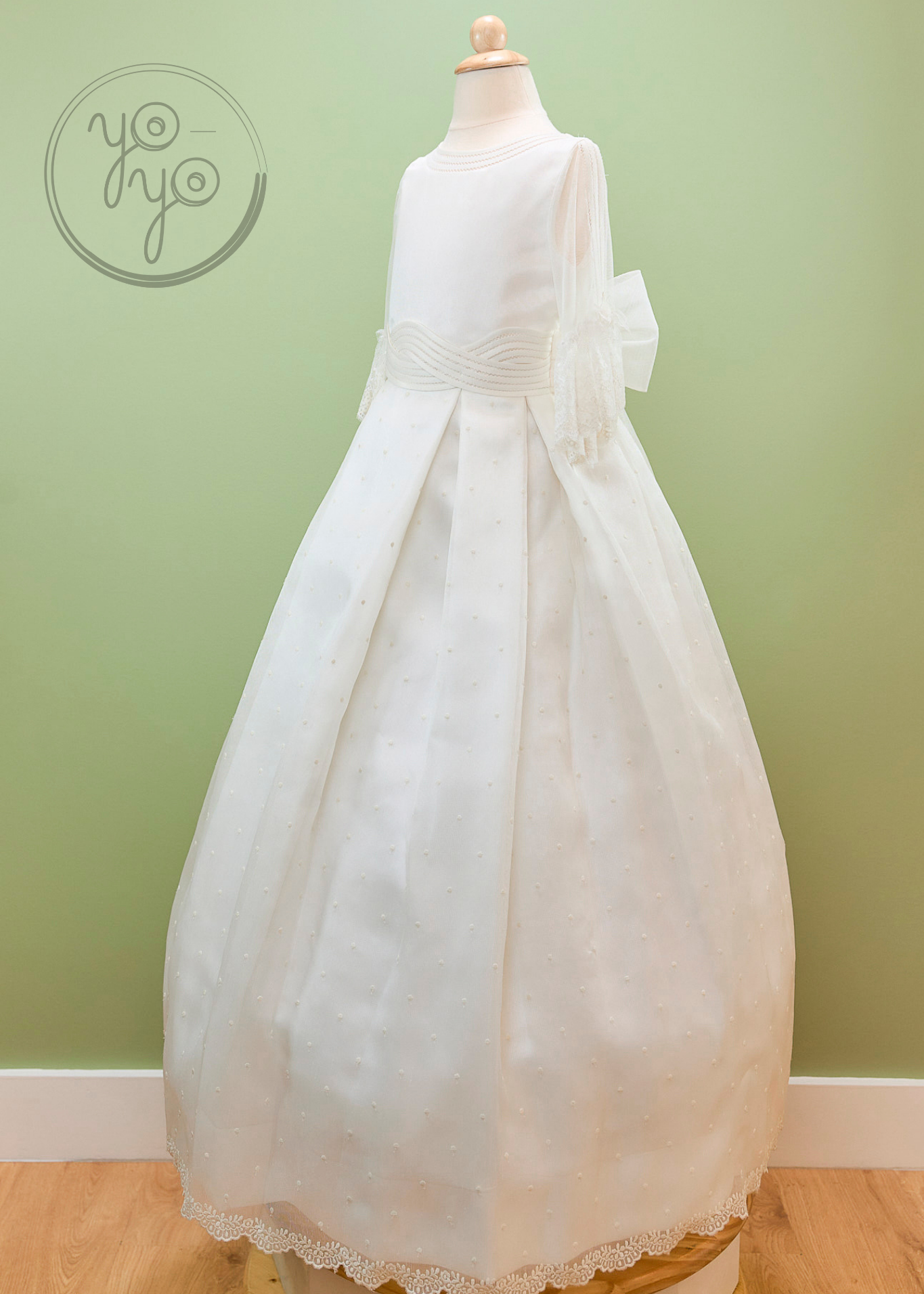The Ceibo First Communion Dress is a refined and elegant choice for a truly memorable celebration. This off-white gown features exquisite French sleeves and a full skirt adorned with subtle polka dots and a delicate lace edge—blending texture and tradition beautifully.