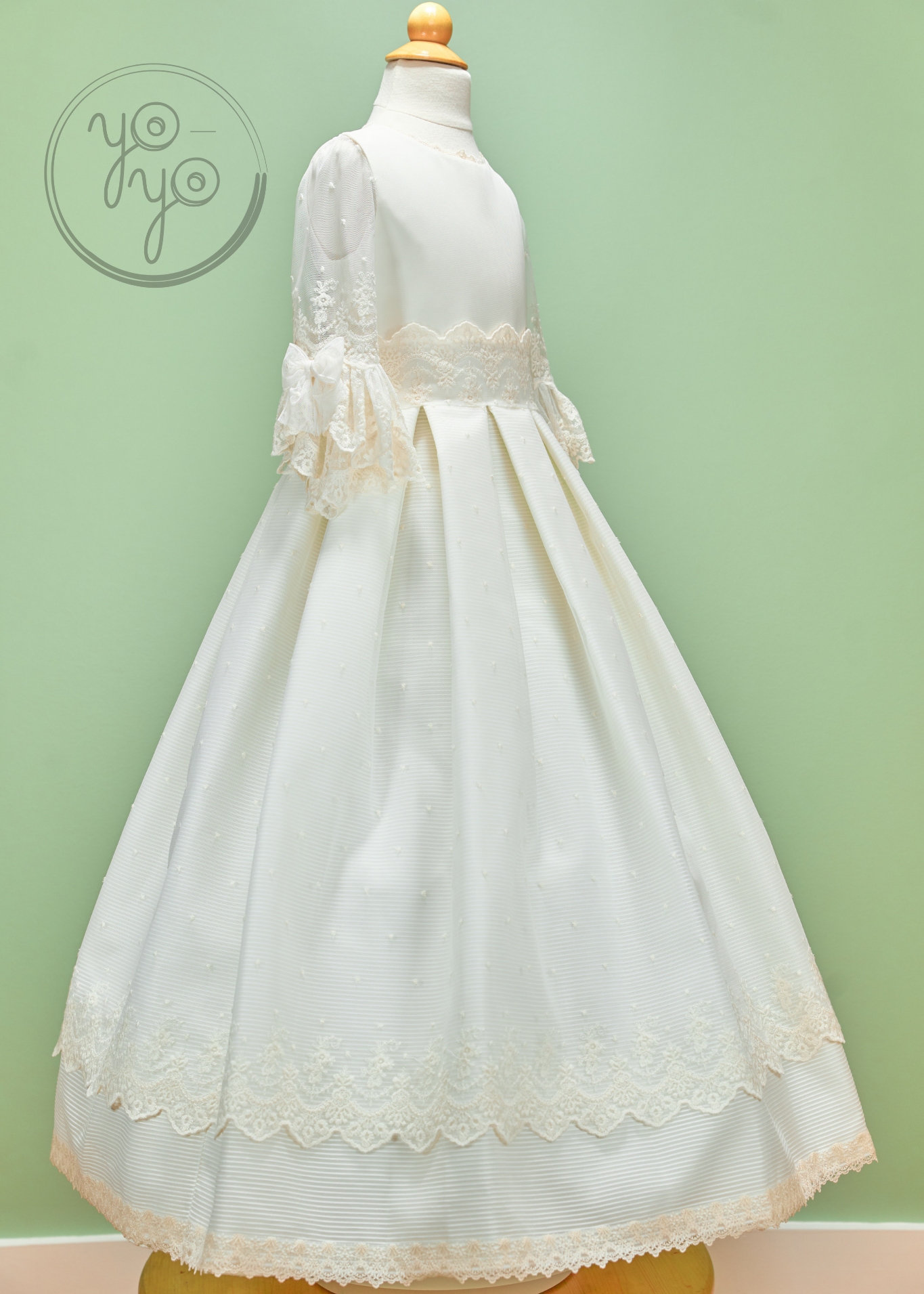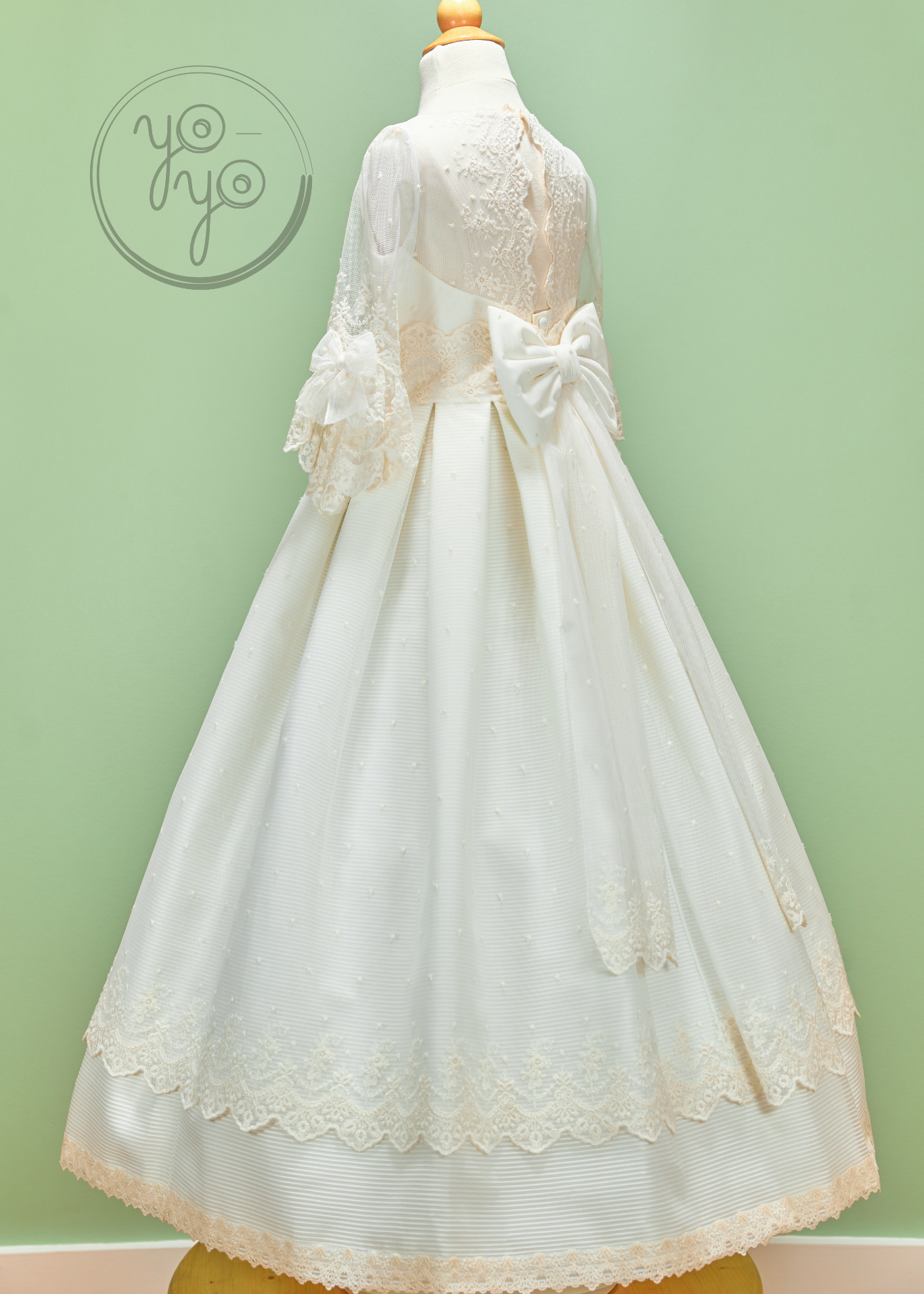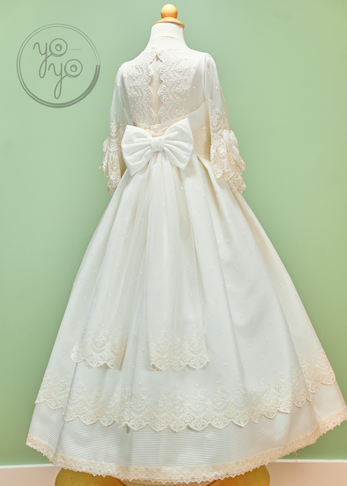 The Giselle First Communion Dress is a one-of-a-kind gown from our Deluxe Collection, designed to be both delicate and unforgettable. Crafted in luxurious off-white embroidered tulle, it combines boho style with exquisite craftsmanship.
