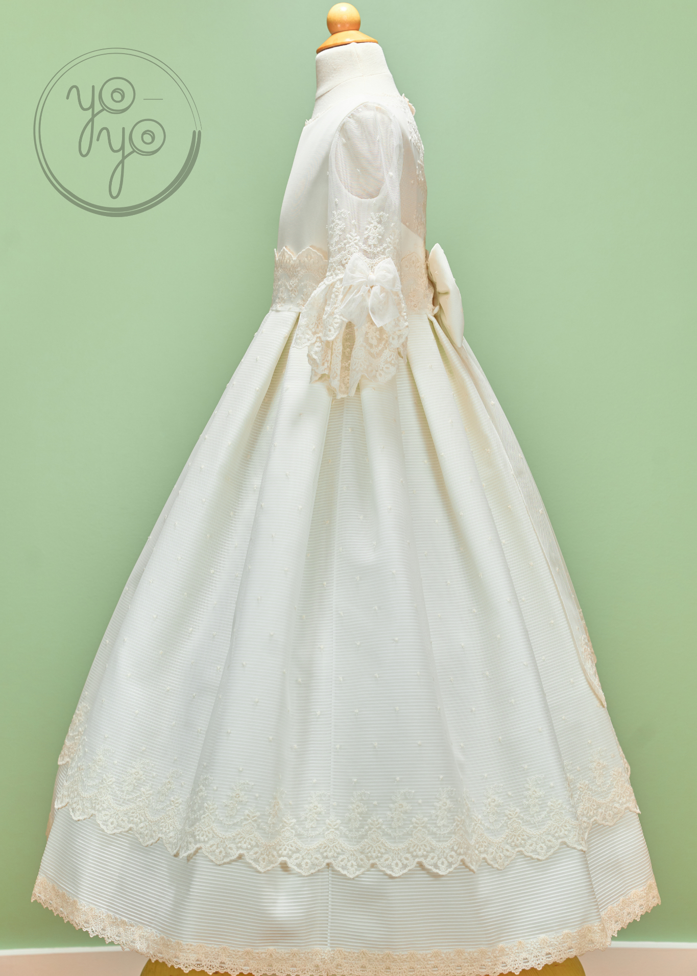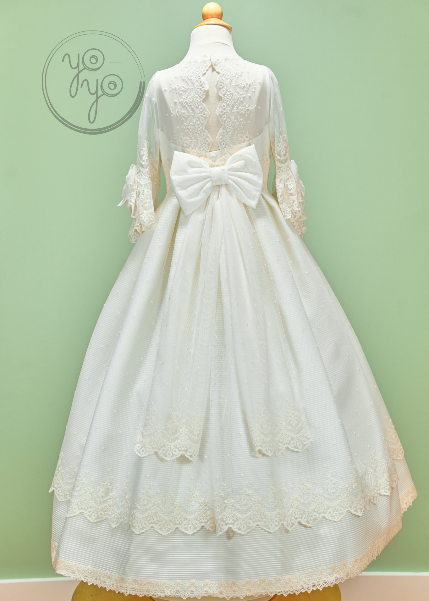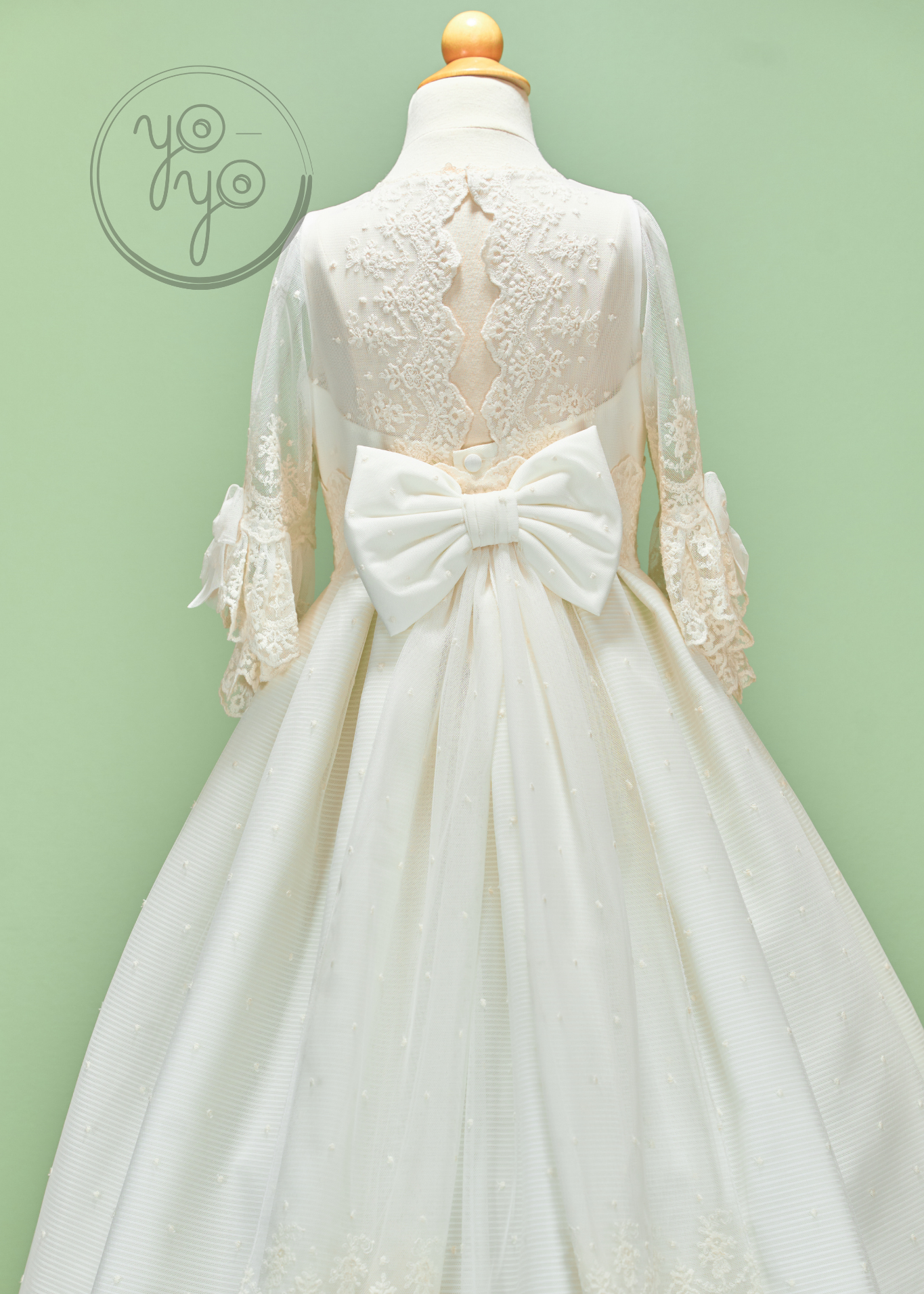 The back is semi-sheer up to mid-back with lace lining, offering a graceful touch of transparency, and is finished with a premade bow for a polished silhouette. Every detail reflects artisanal design, making Giselle a true statement dress for such a meaningful milestone.