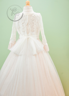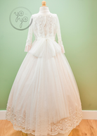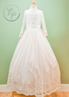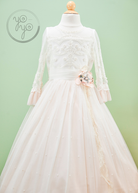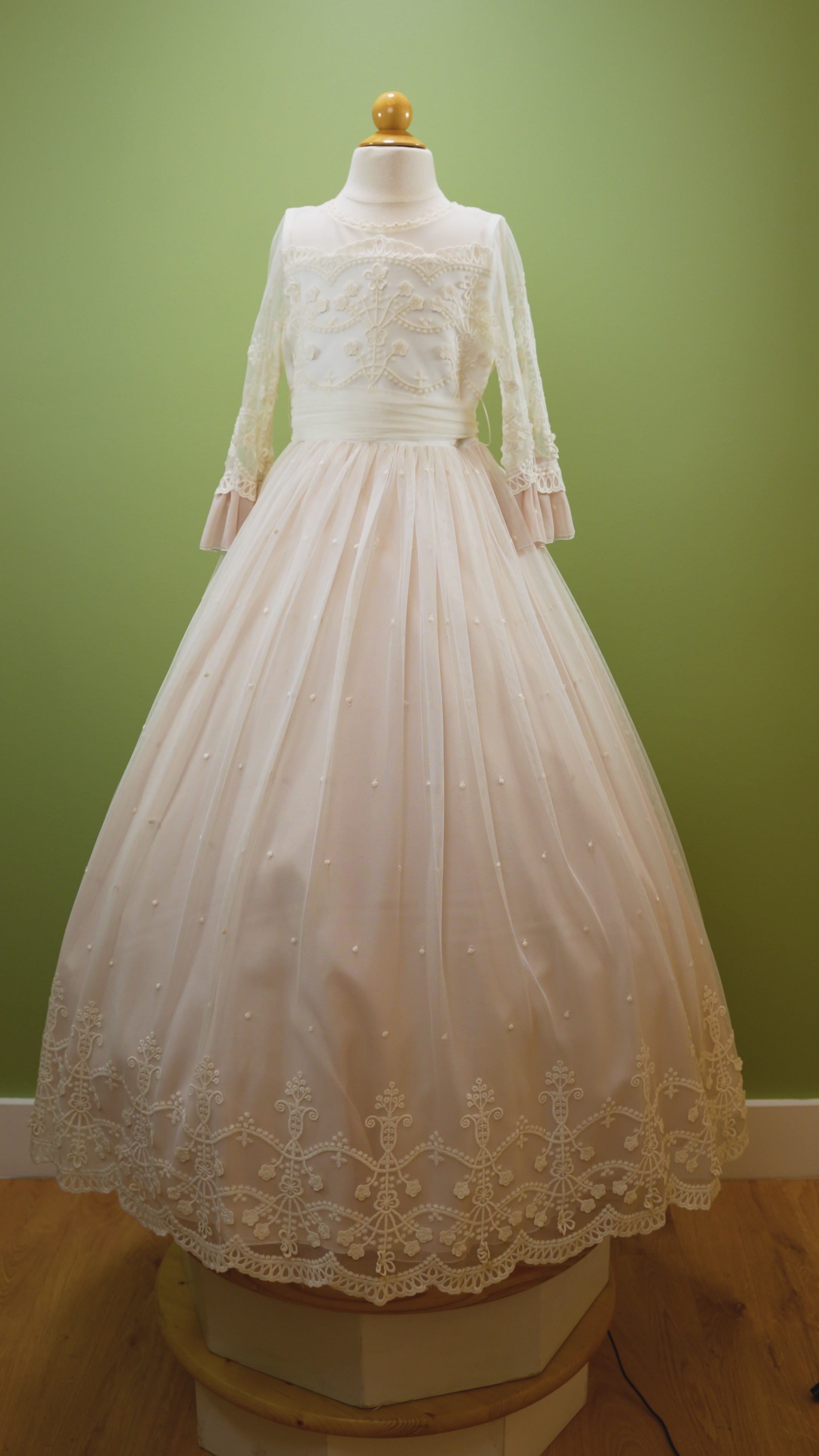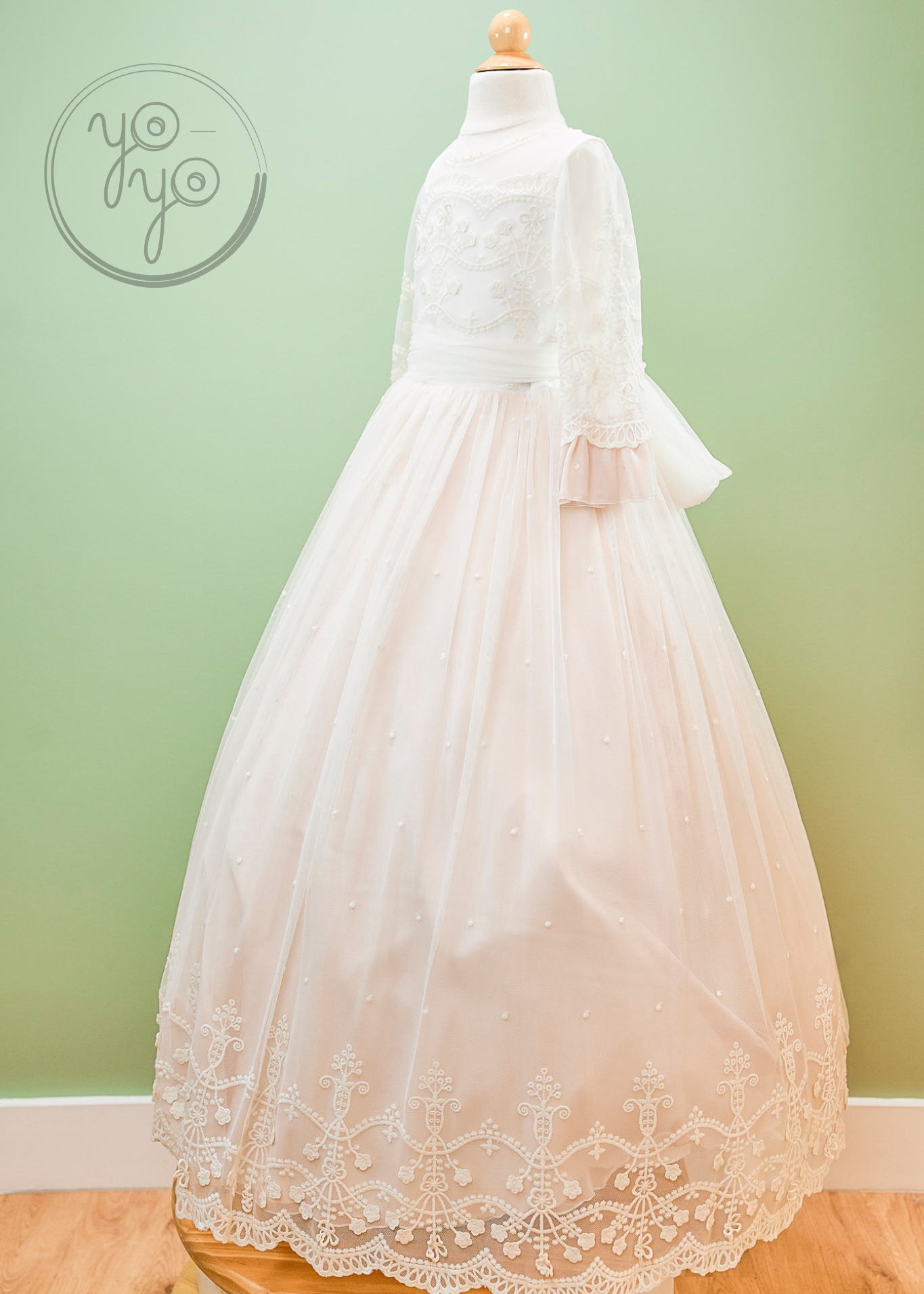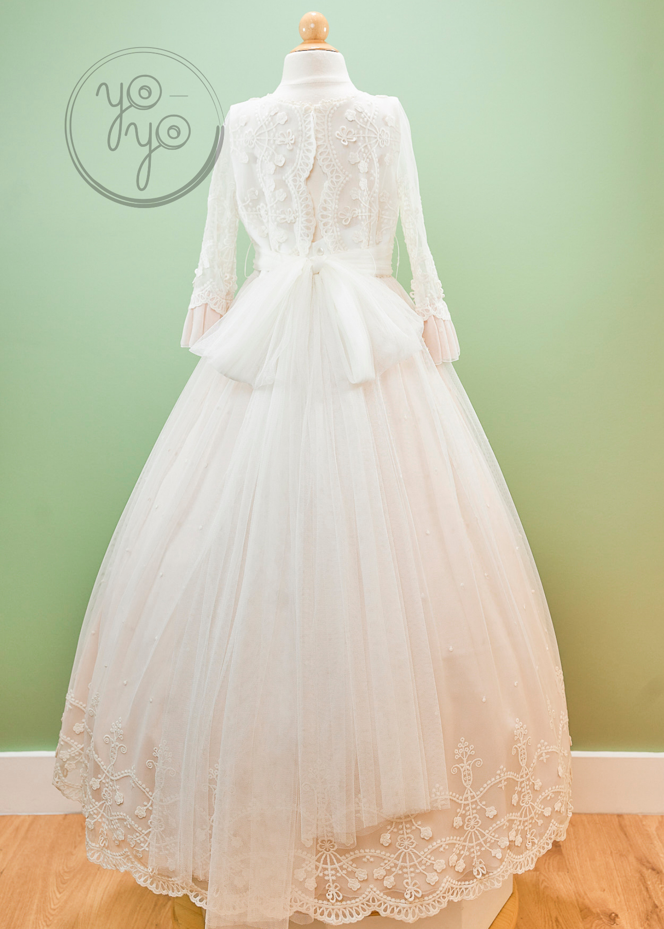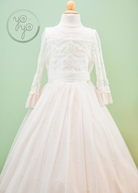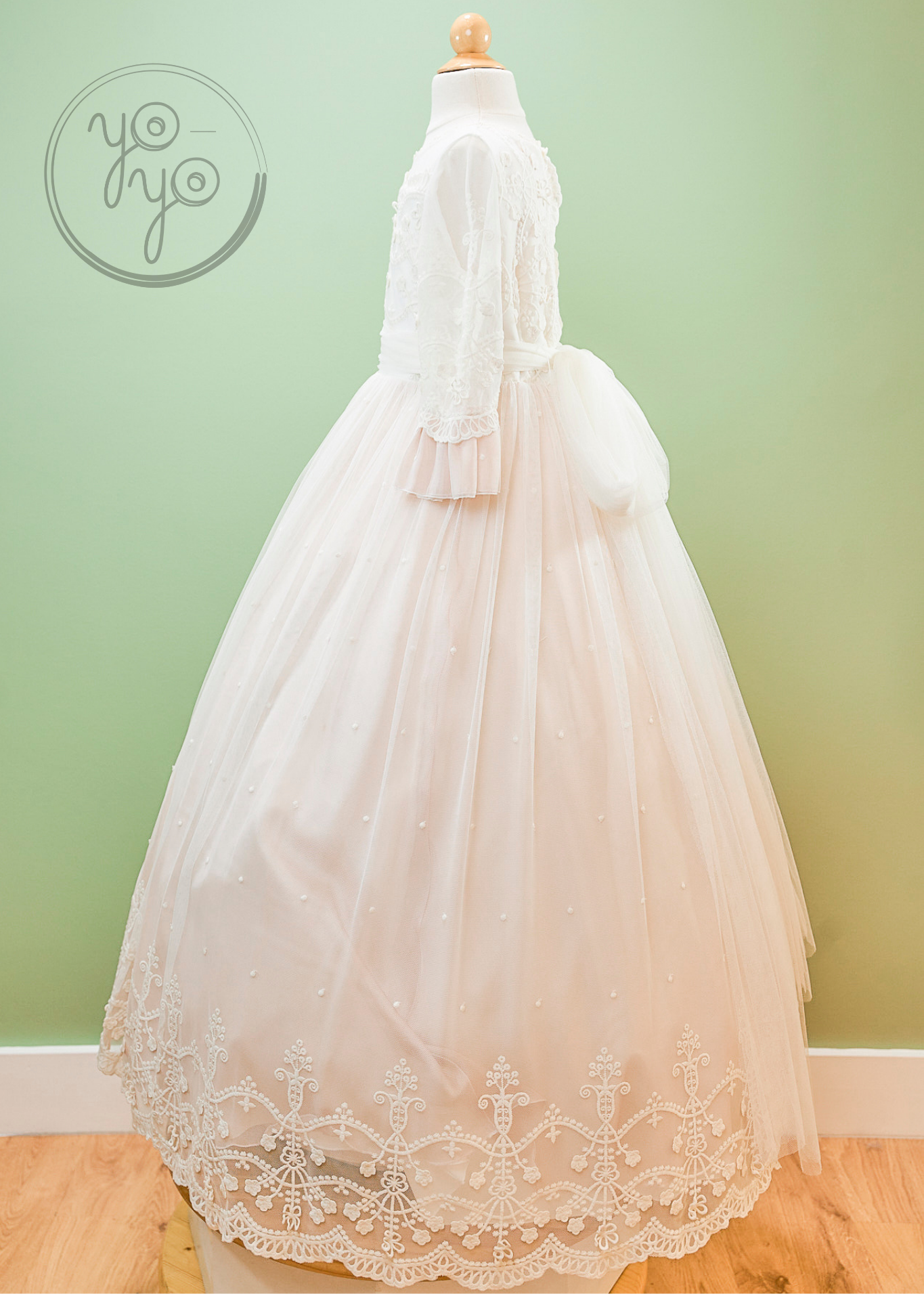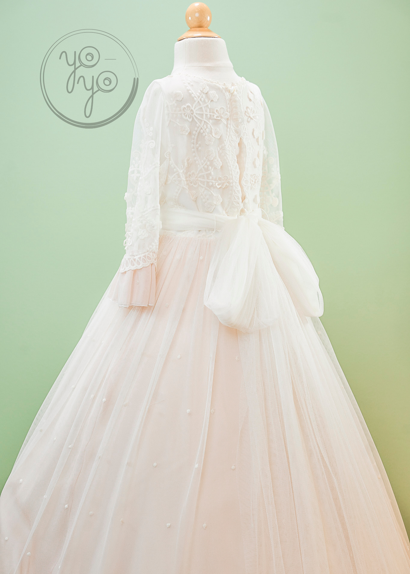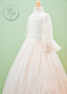 The Lua First Communion Dress is a one-of-a-kind gown designed for girls who love to stand out. Its pale dusty rose skirt creates a striking contrast while keeping a soft, romantic feel. The 3/4 lace sleeves evoke the elegance of the Versailles court, bringing historical charm to a modern silhouette.