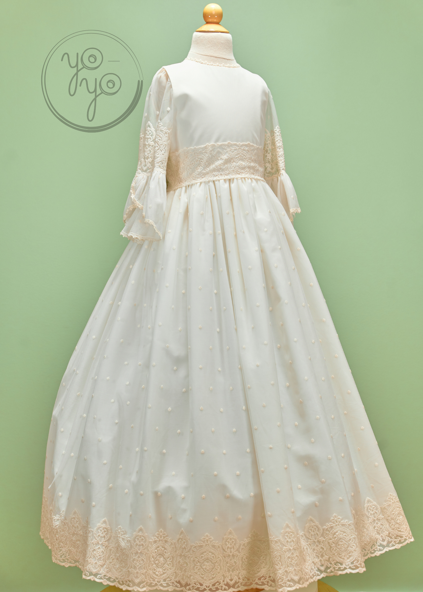 The Manon First Communion Dress is an exquisite boho-inspired gown that feels both elegant and unique. Crafted in soft off-white embroidered tulle, it combines artisanal details with a light, graceful silhouette.