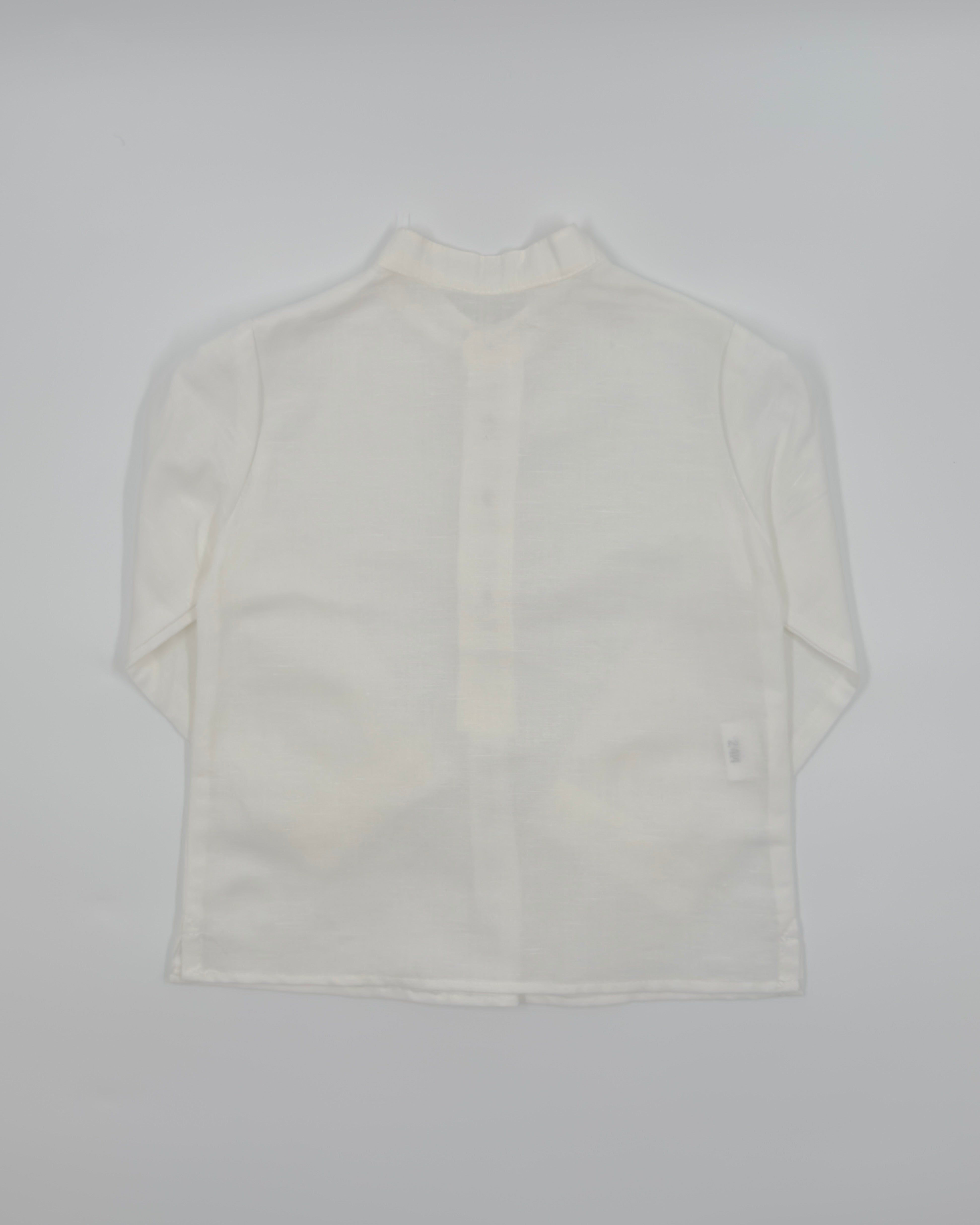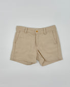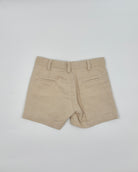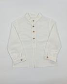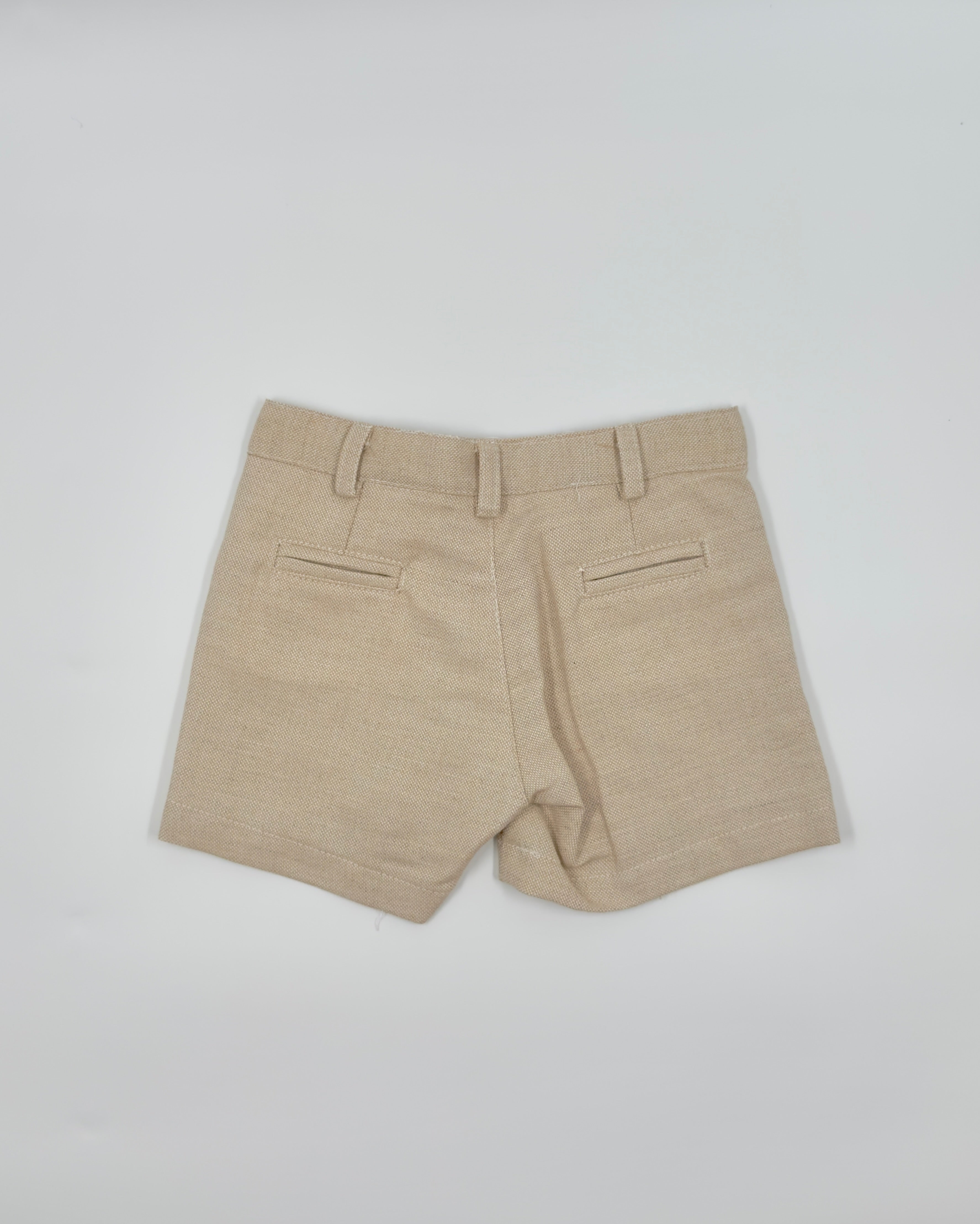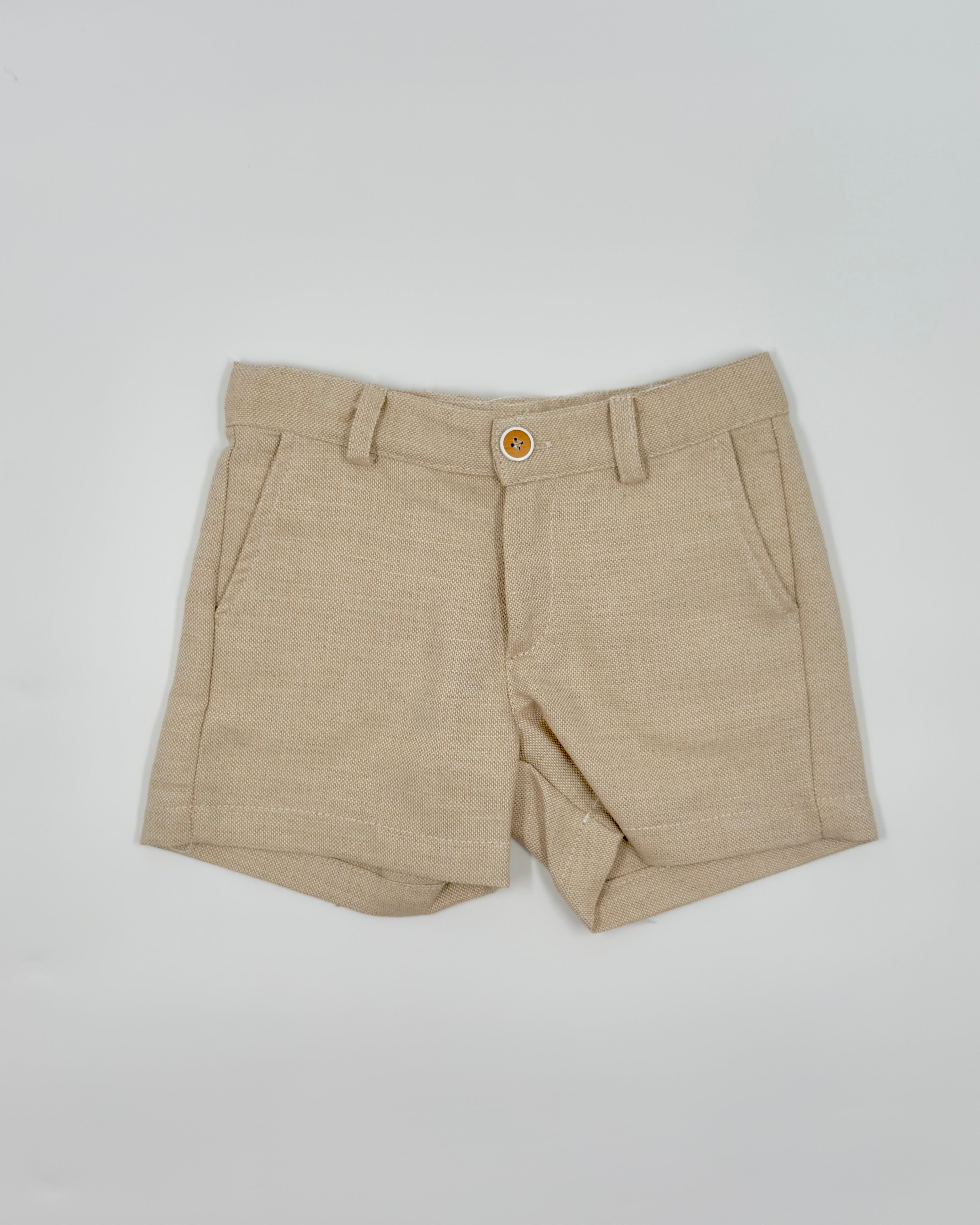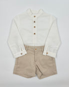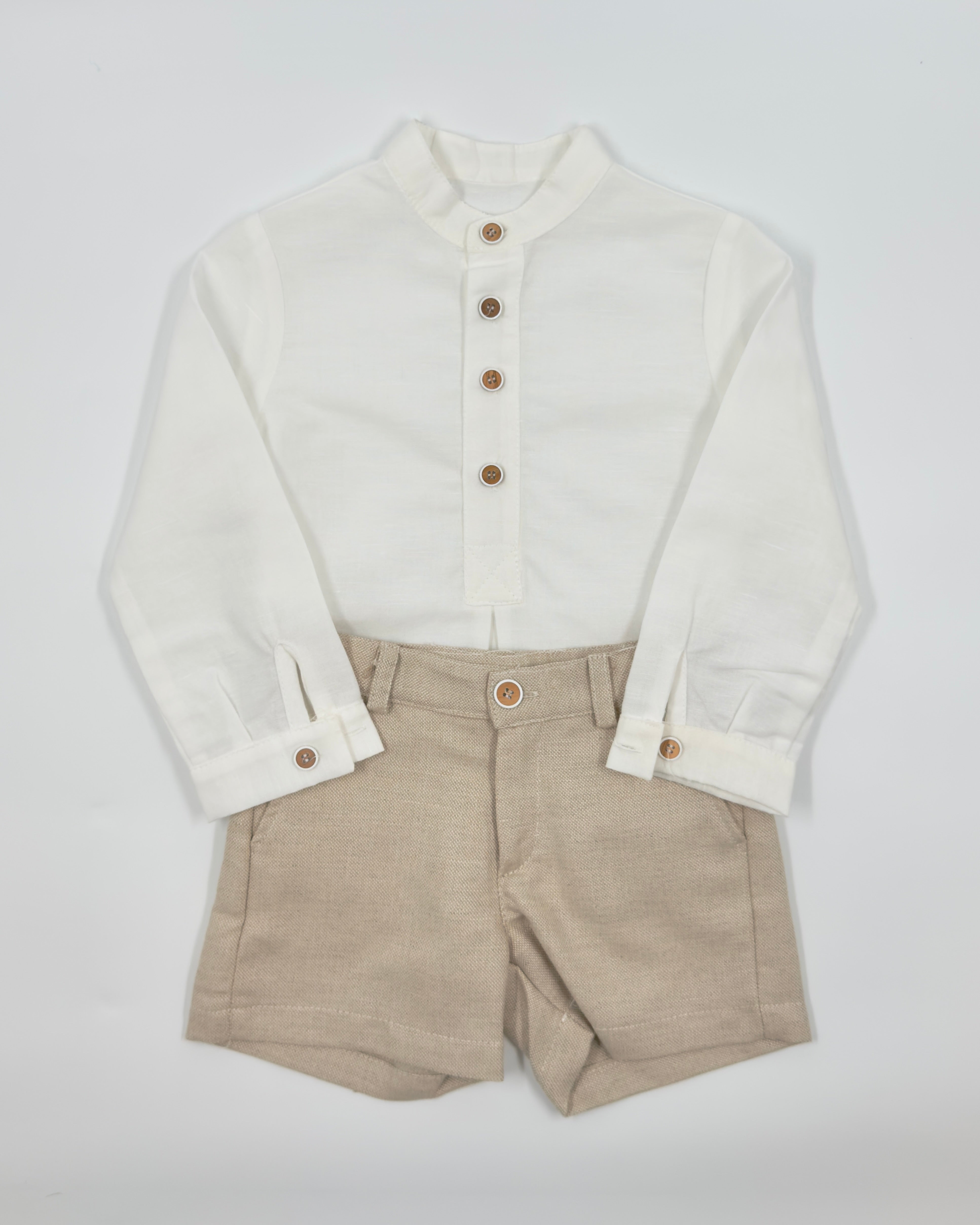 German is a two-piece outfit for toddler boys. This set is made with a white mao collar shirt with wood buttons, and sand color bermudas. The shorts have an elastic band to adjust waist.