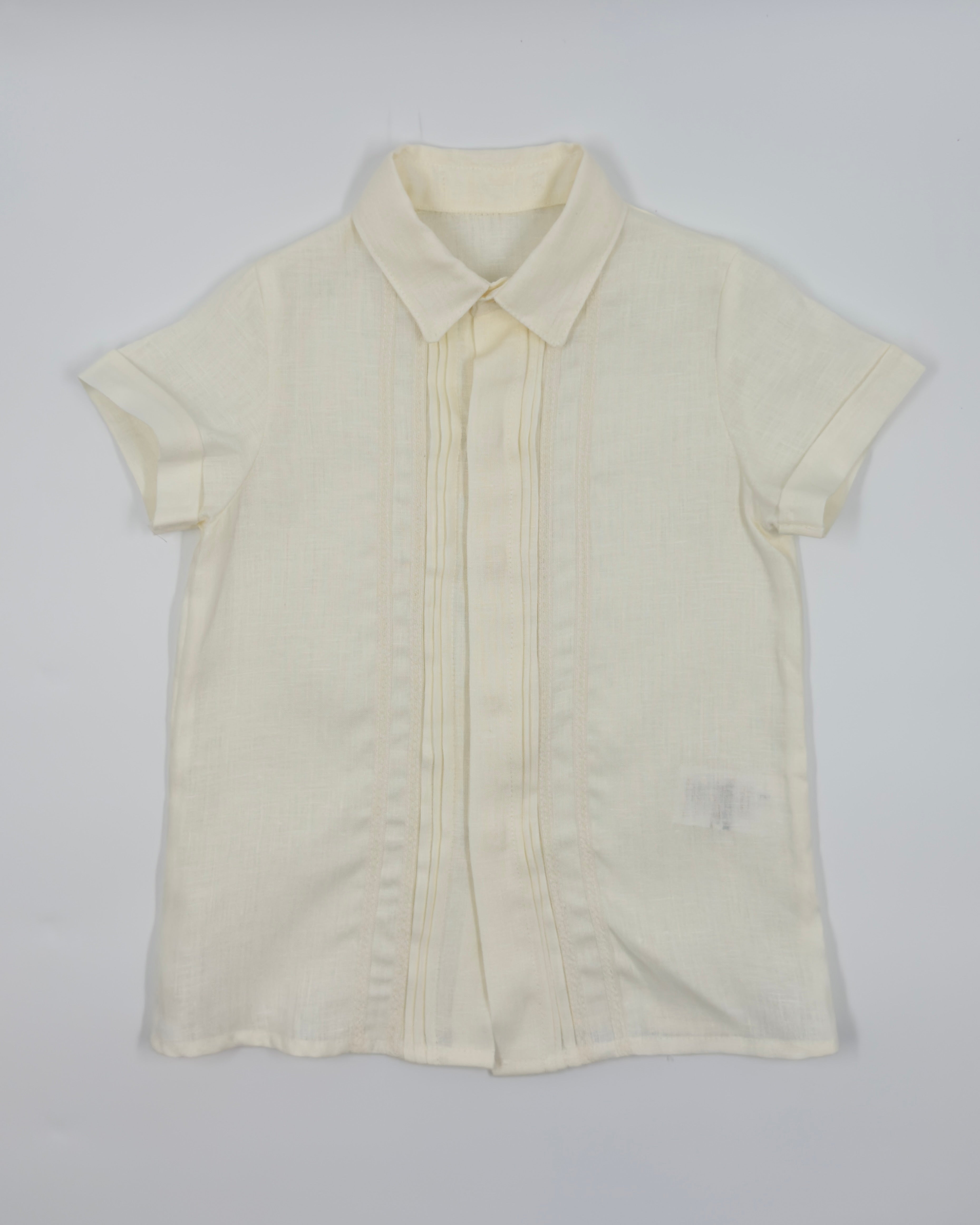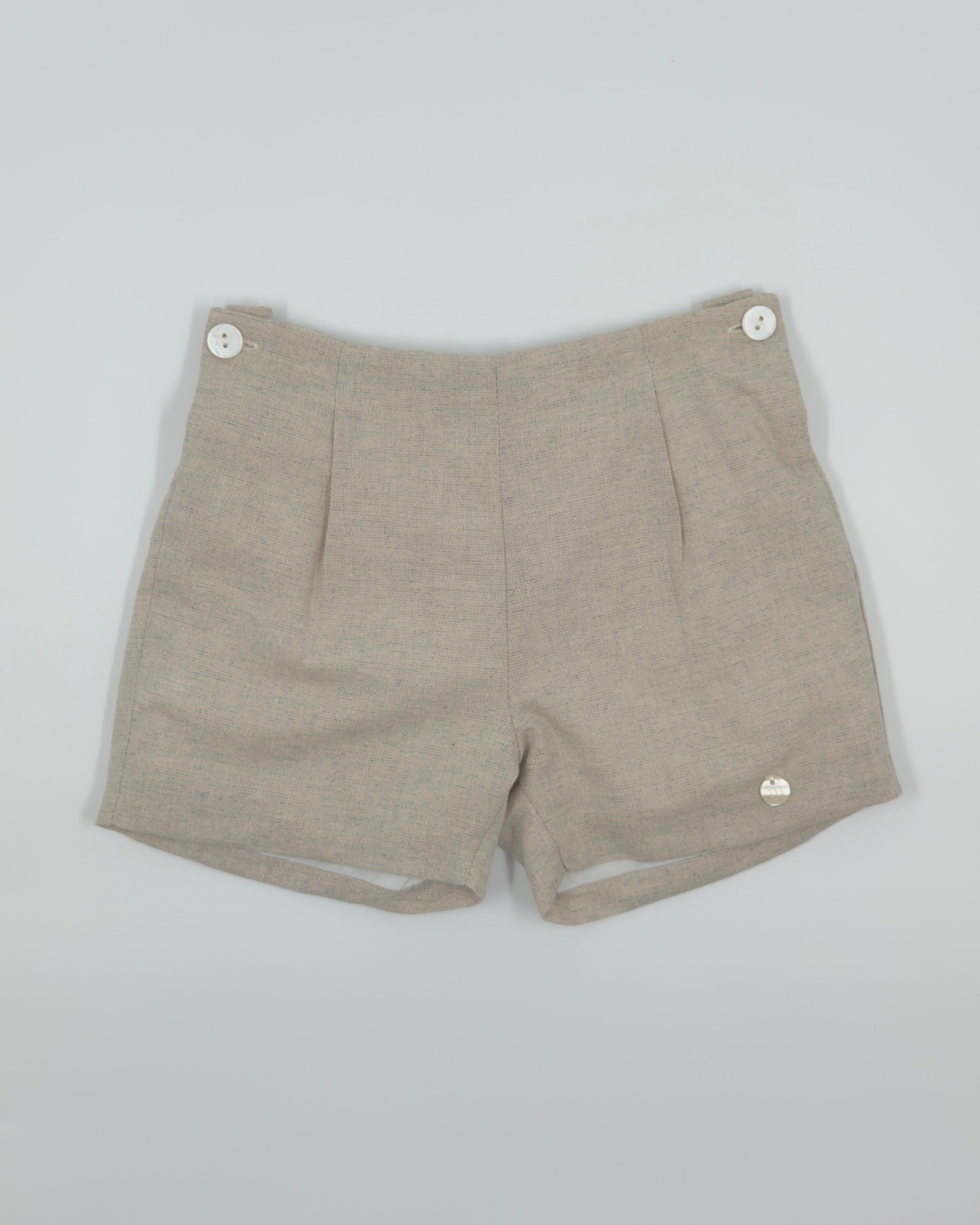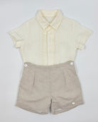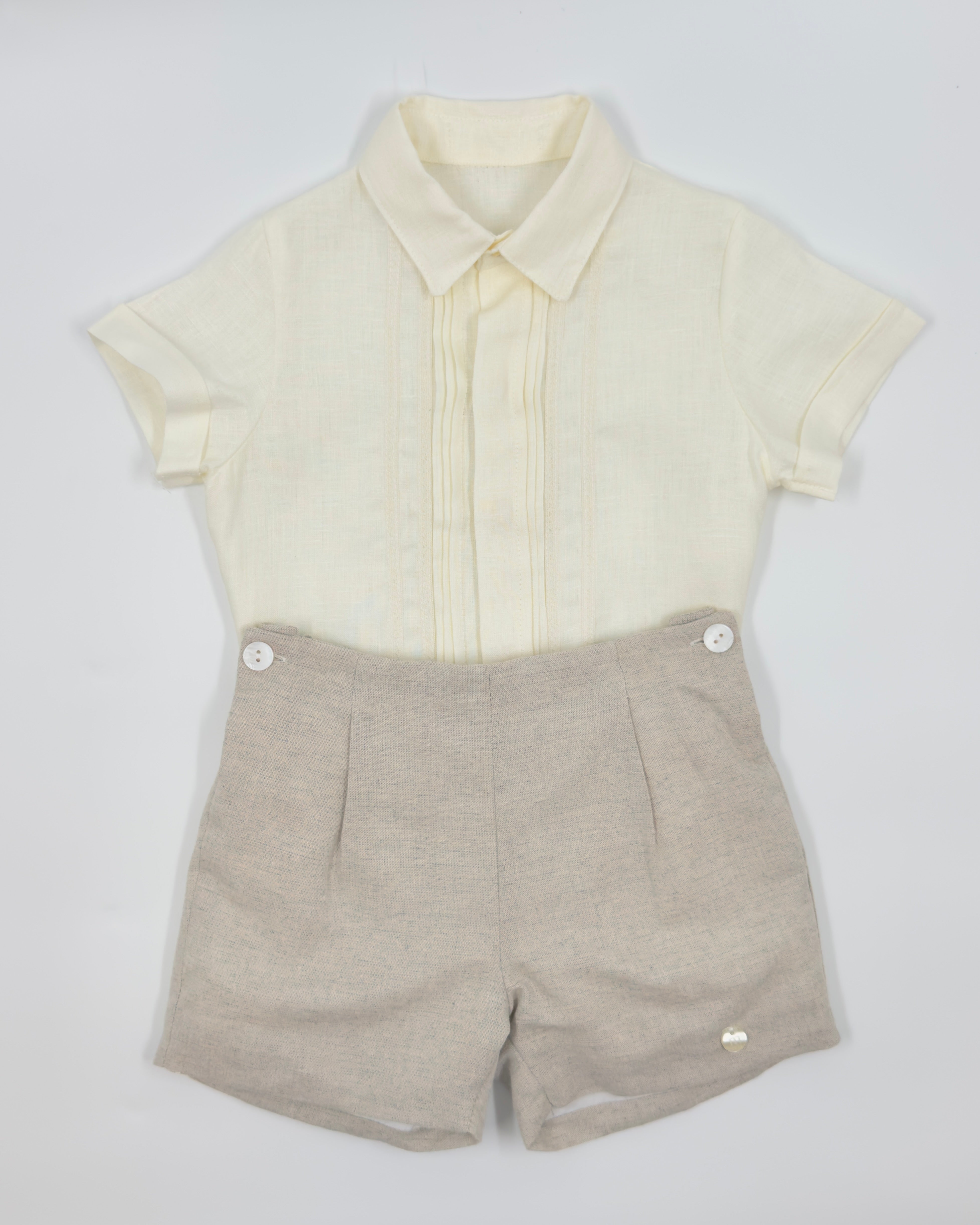 The Manuel outfit is a stylish and timeless two-piece set for toddler boys, ideal for special occasions. The off-white shirt is made from soft batiste and features a classic front button closure, while the sand-colored linen shorts add a refined contrast with a comfortable fit. Perfect for weddings, baptisms, and elegant celebrations.