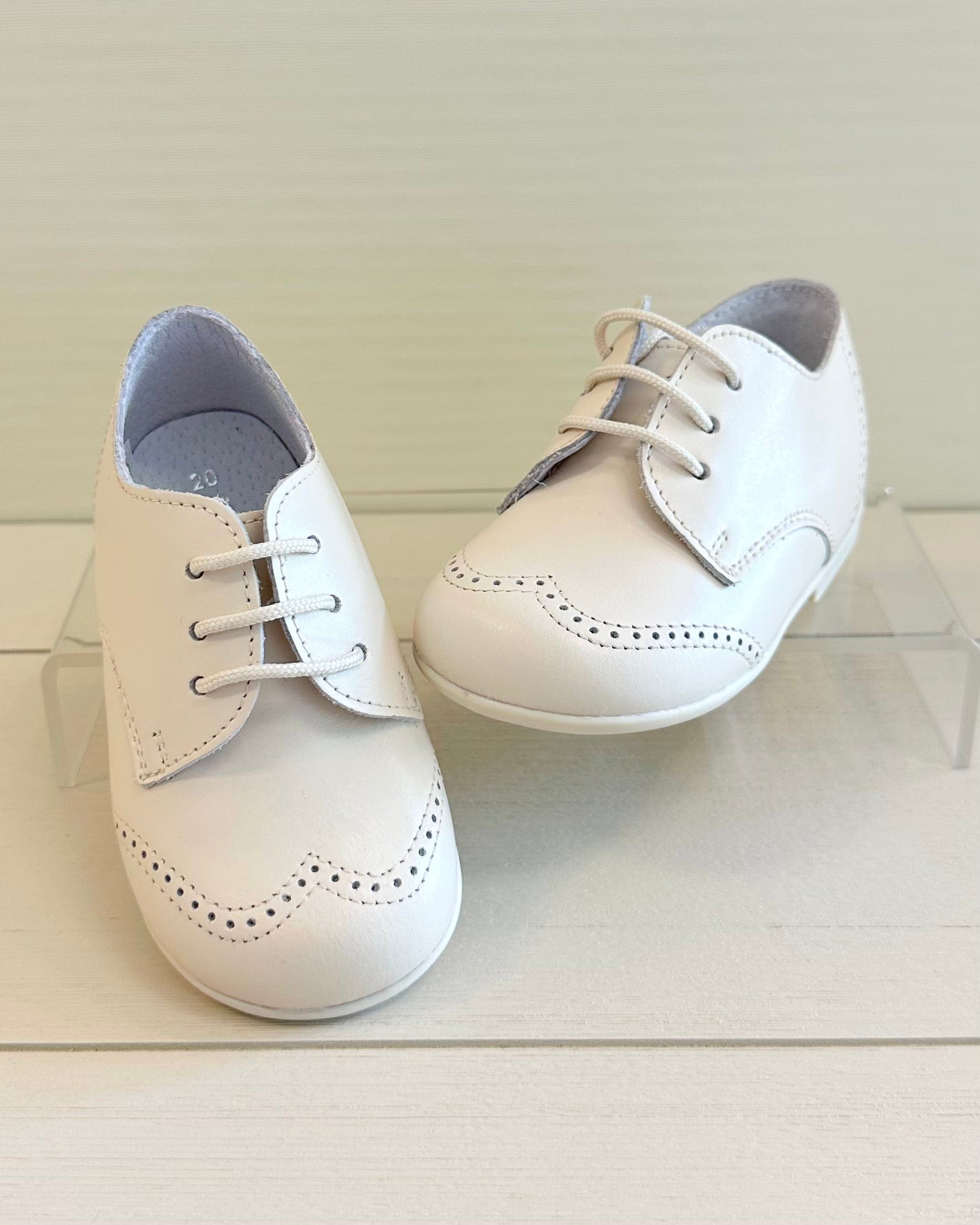 Our Off-White Oxford Shoes are a timeless and elegant choice for little boys, perfect for dressing up on special occasions. Handcrafted in Spain from premium leather, these classic lace-up shoes feature refined stitching and a comfortable, flexible sole—ideal for weddings, christenings, and formal celebrations. Designed with traditional charm and all-day wearability in mind, they complete any polished look with ease.
