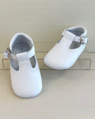 The T-Bar Pre-Walker Shoe in White is a timeless and elegant choice for baby boys. Expertly handcrafted in Spain from soft genuine leather, this sole-free shoe is designed to gently support tiny feet while offering a classic, polished look. The traditional T-bar strap ensures a secure yet comfortable fit, making it ideal for christenings, baby dedications, or any special occasion.