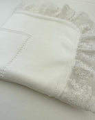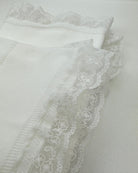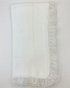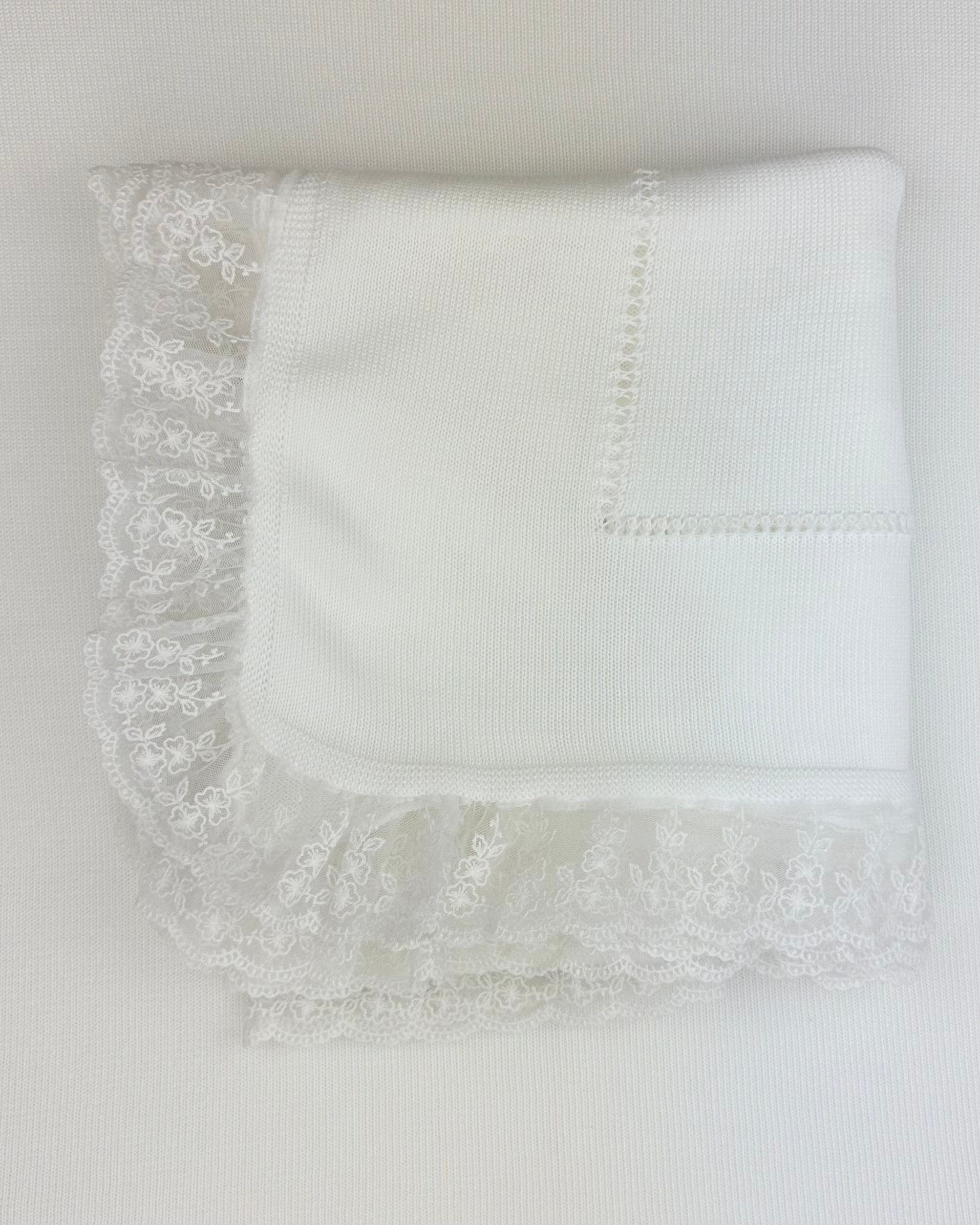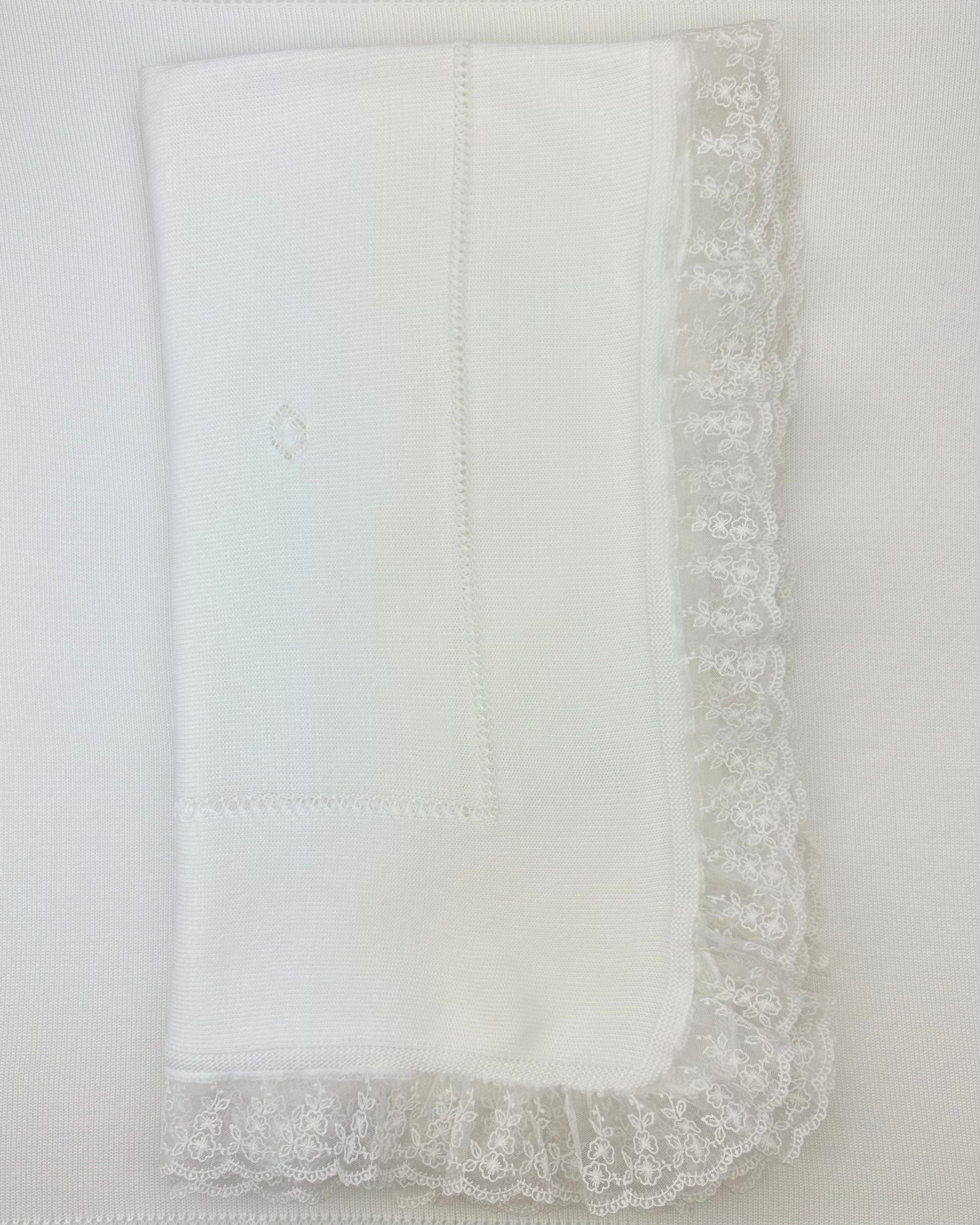 Wrap your little one in timeless elegance with our handcrafted white knitted blanket, delicately finished with a refined lace trim along the edges.