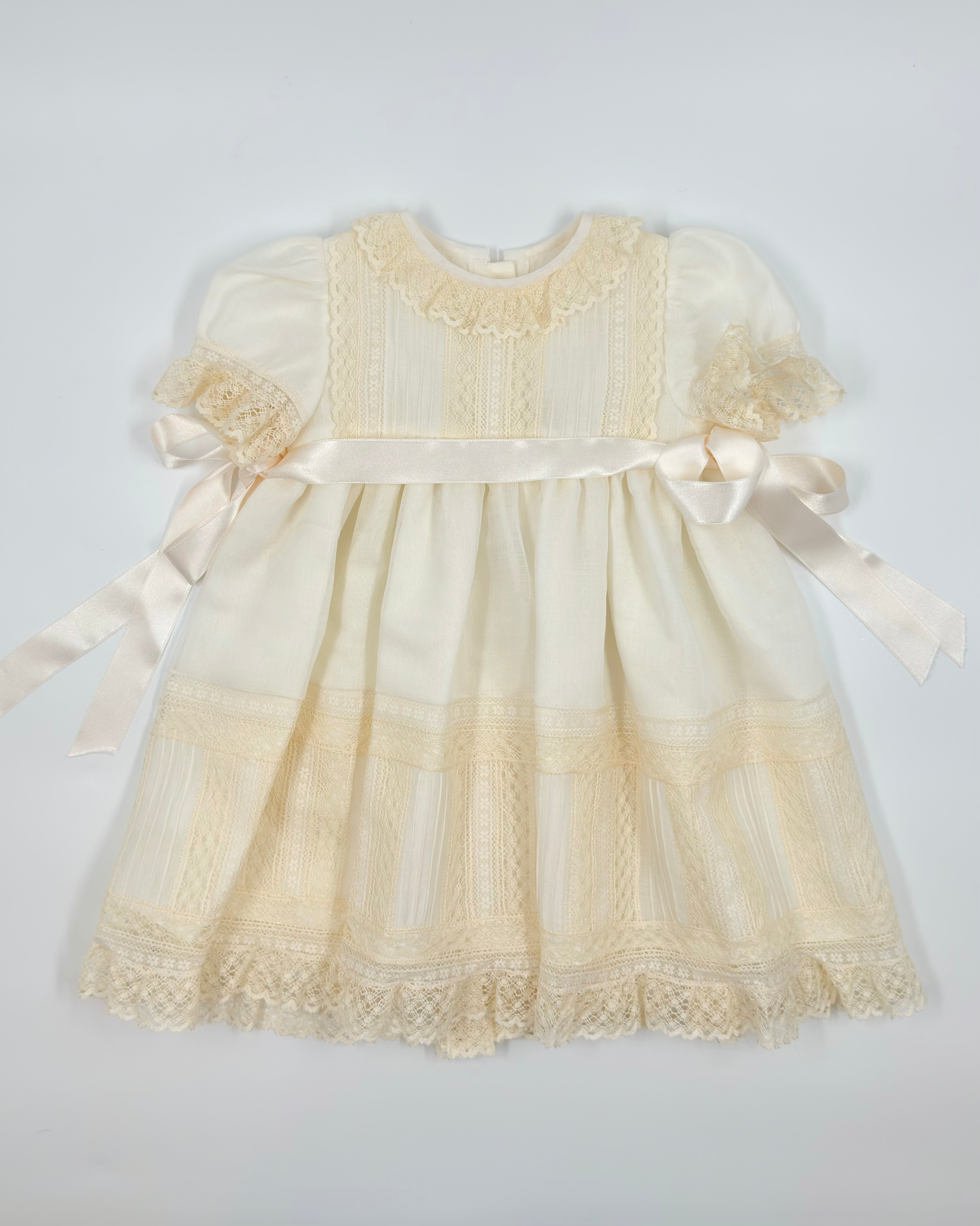 The Angela dress is a beautifully delicate ensemble, perfect for your little one’s most cherished moments. Crafted from soft English muslin in a classic off-white and adorned with fine lace details, this dress features charming puffy cap sleeves and a timeless silhouette.