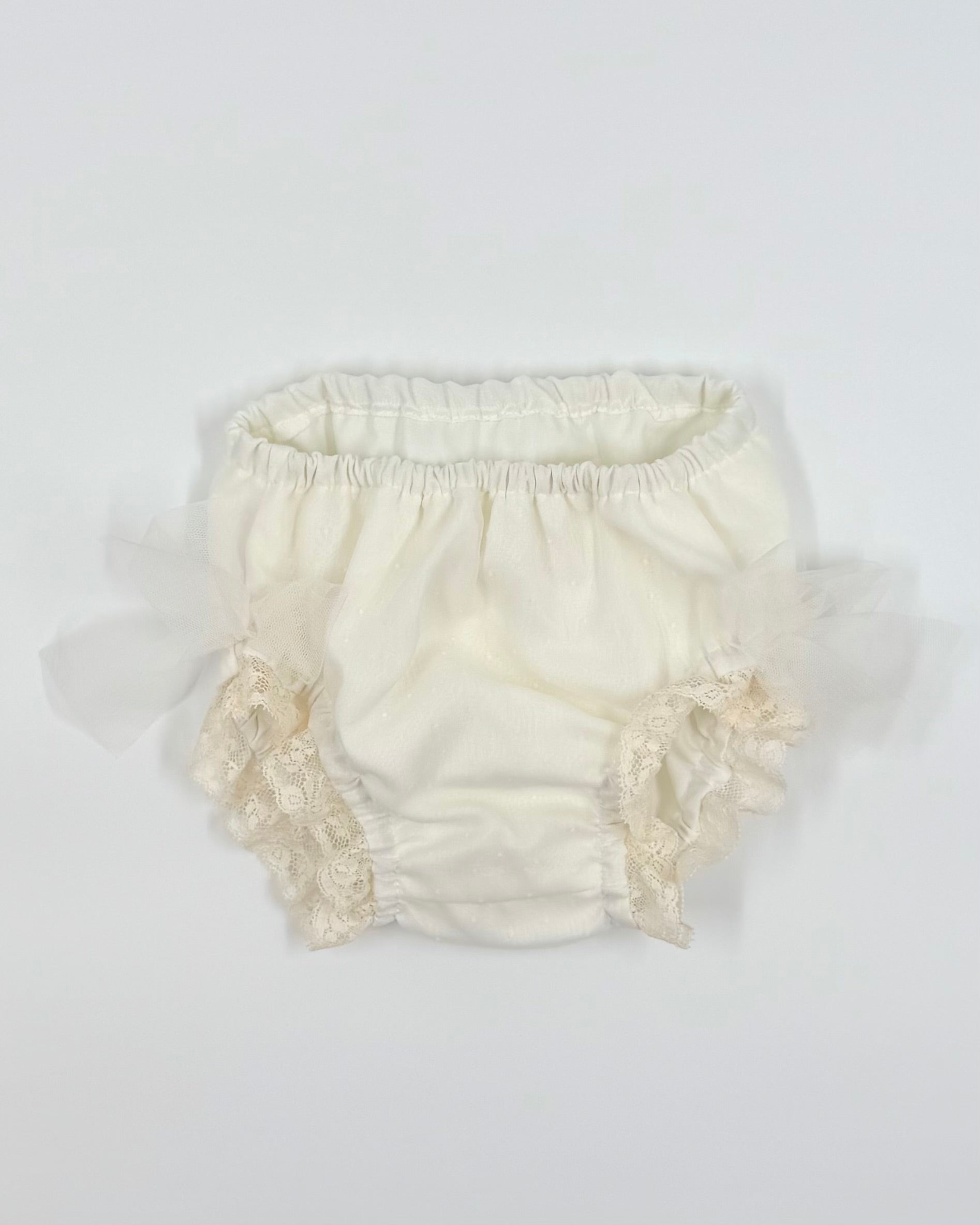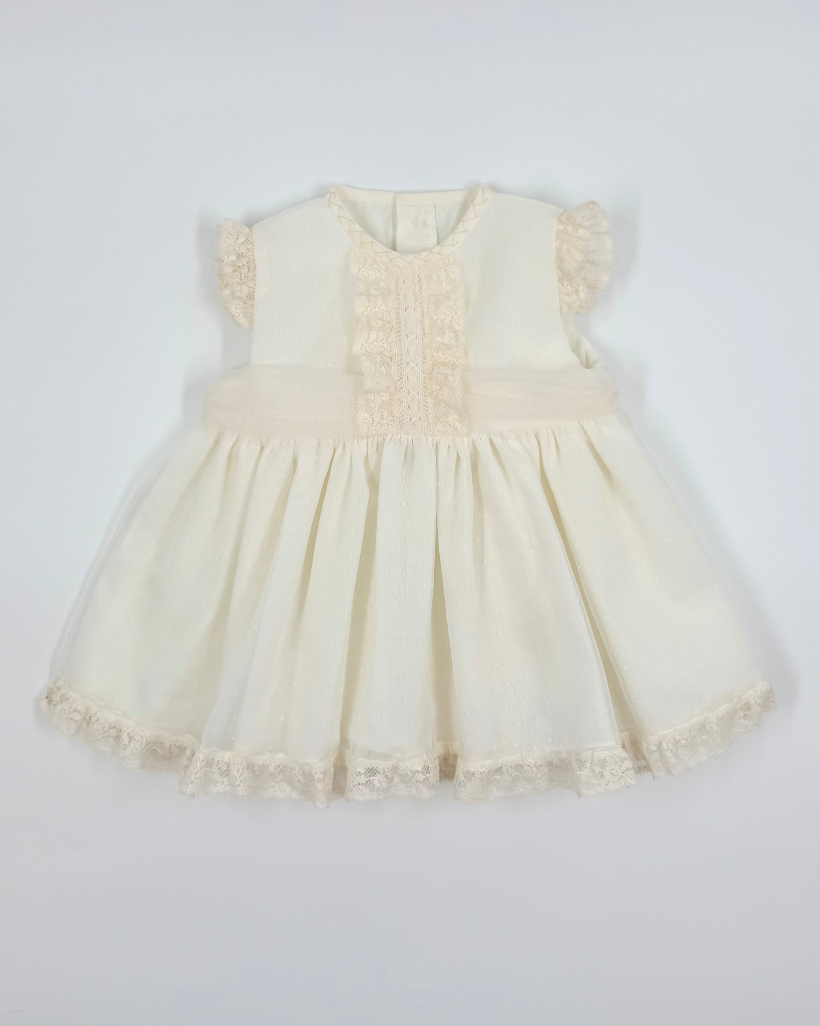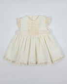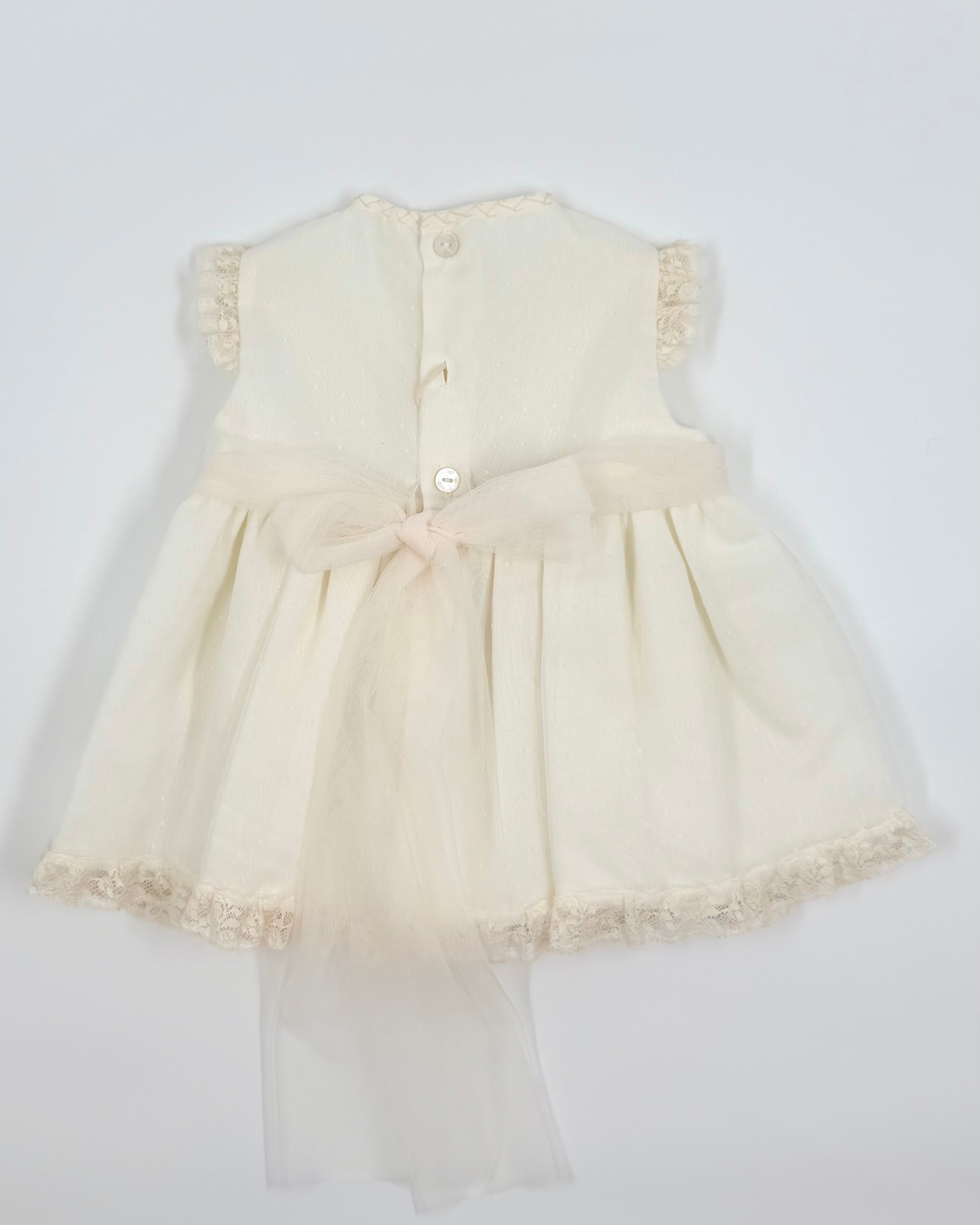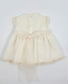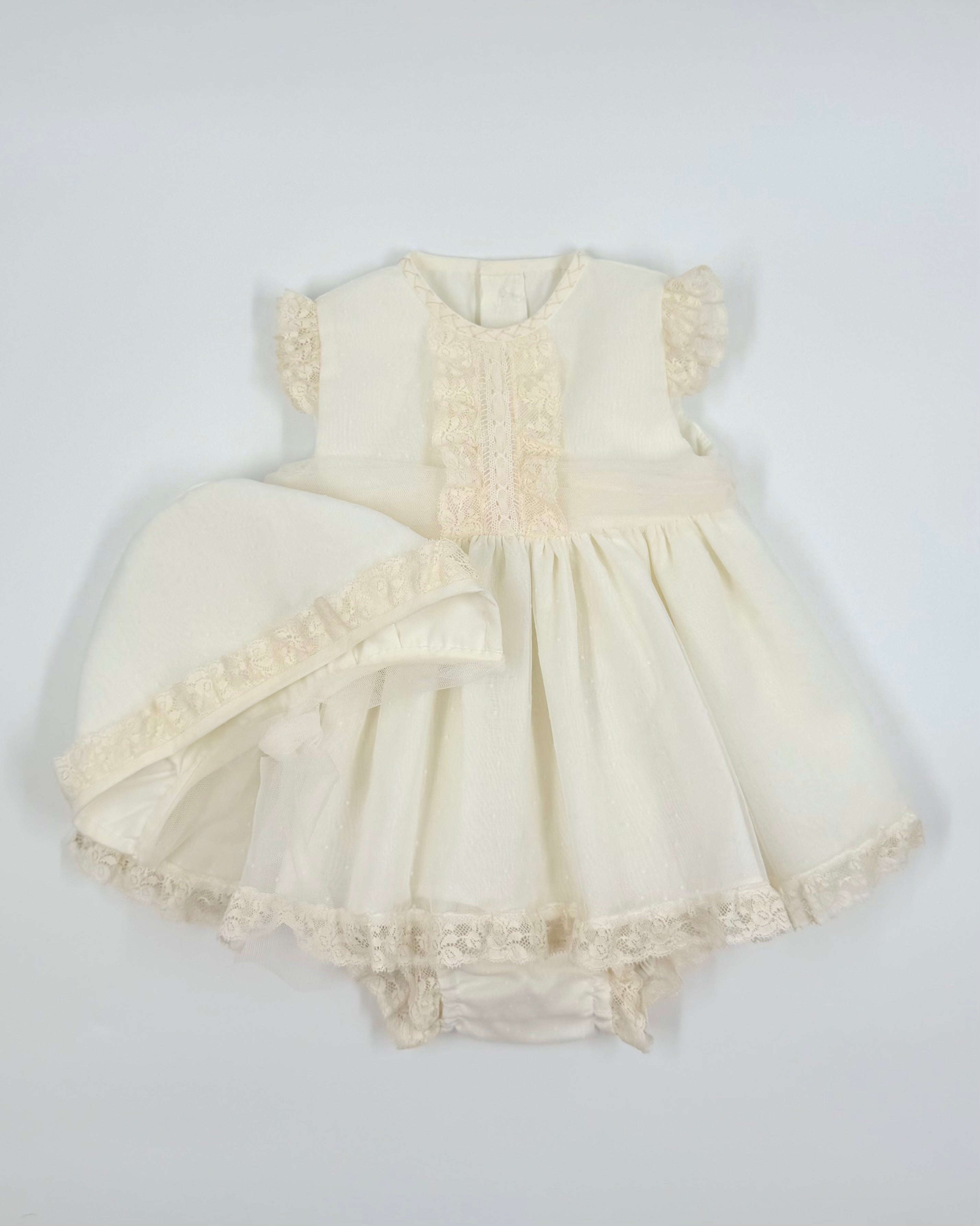 A three piece set for baby girls to wear on special occasion, it comes with bloomers and bonnet.