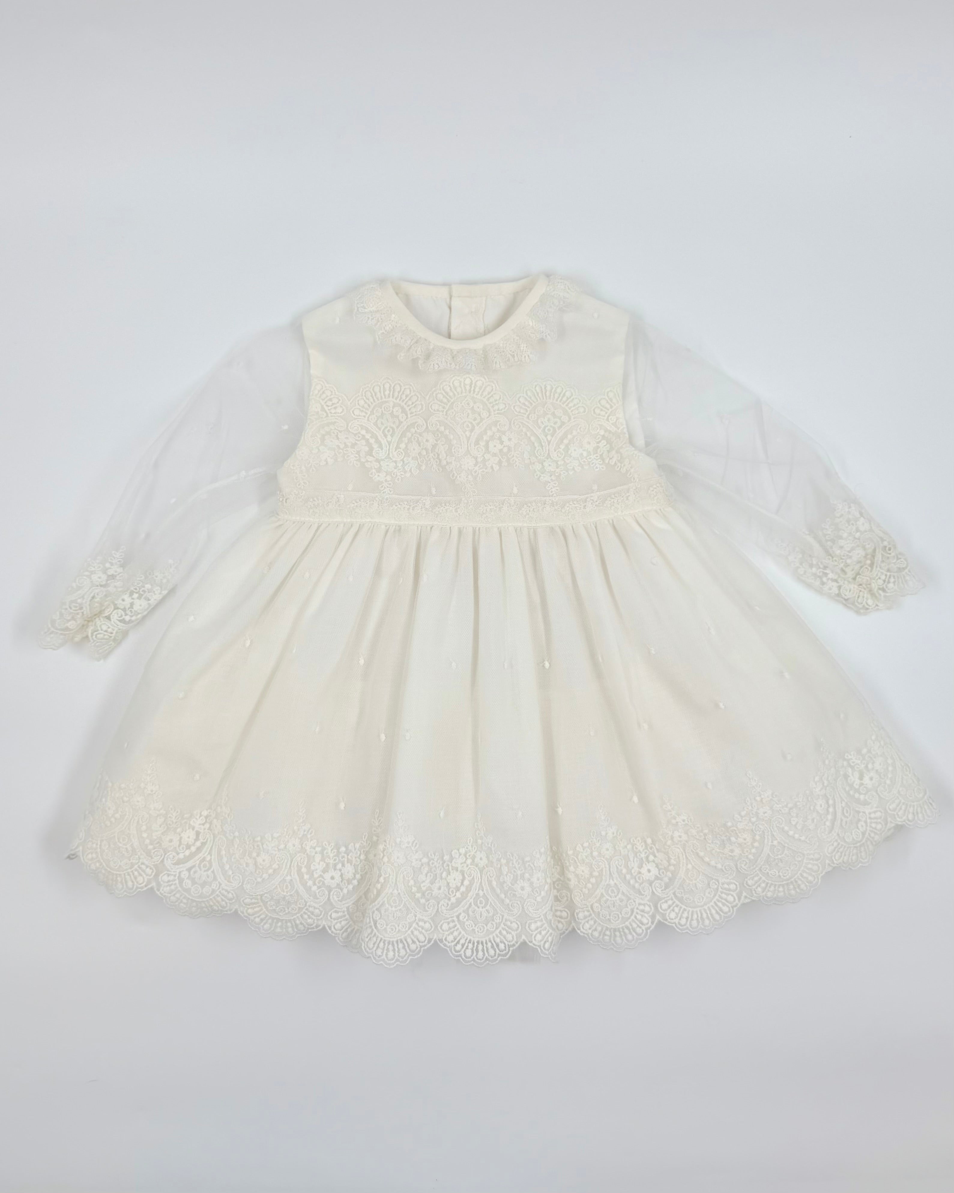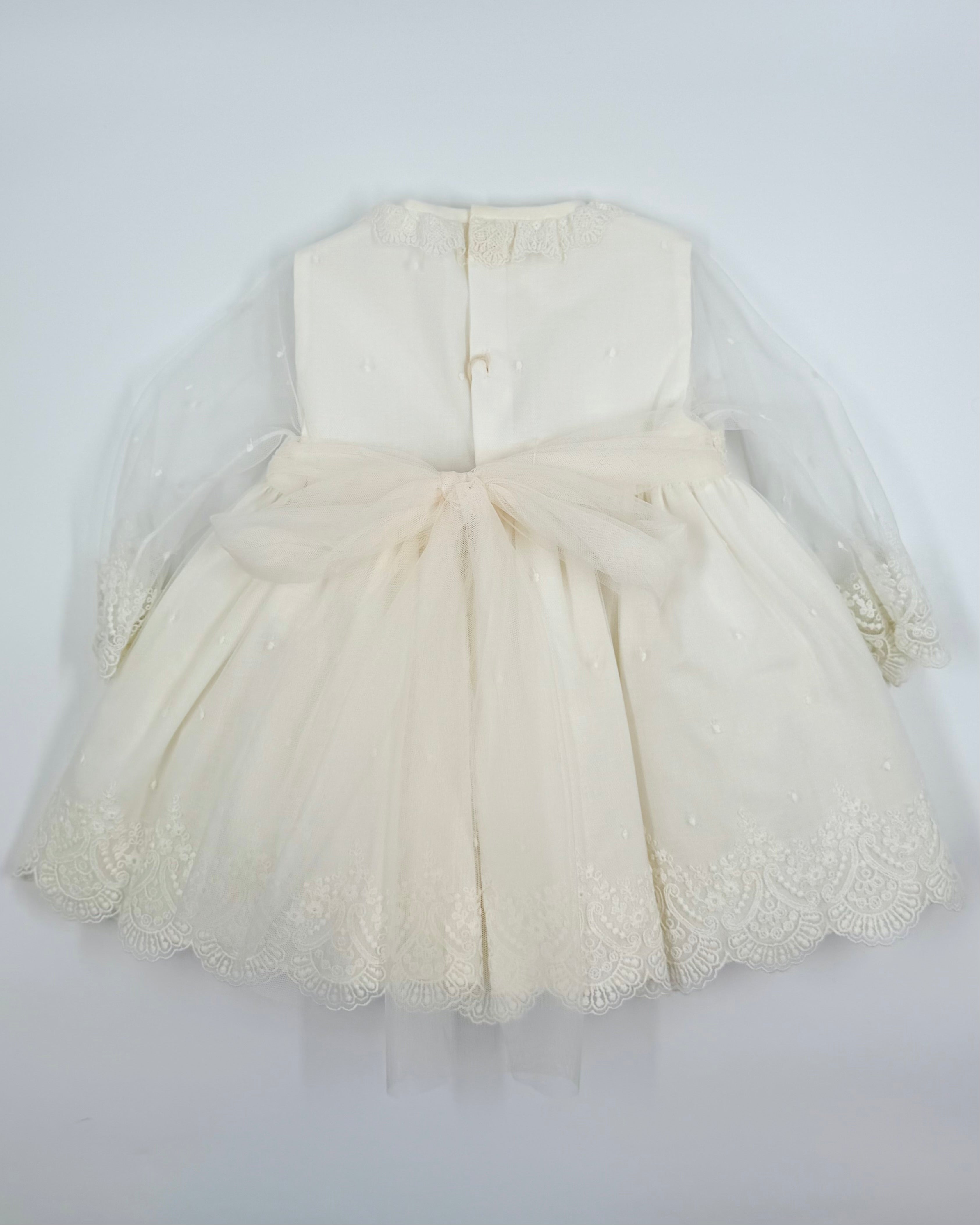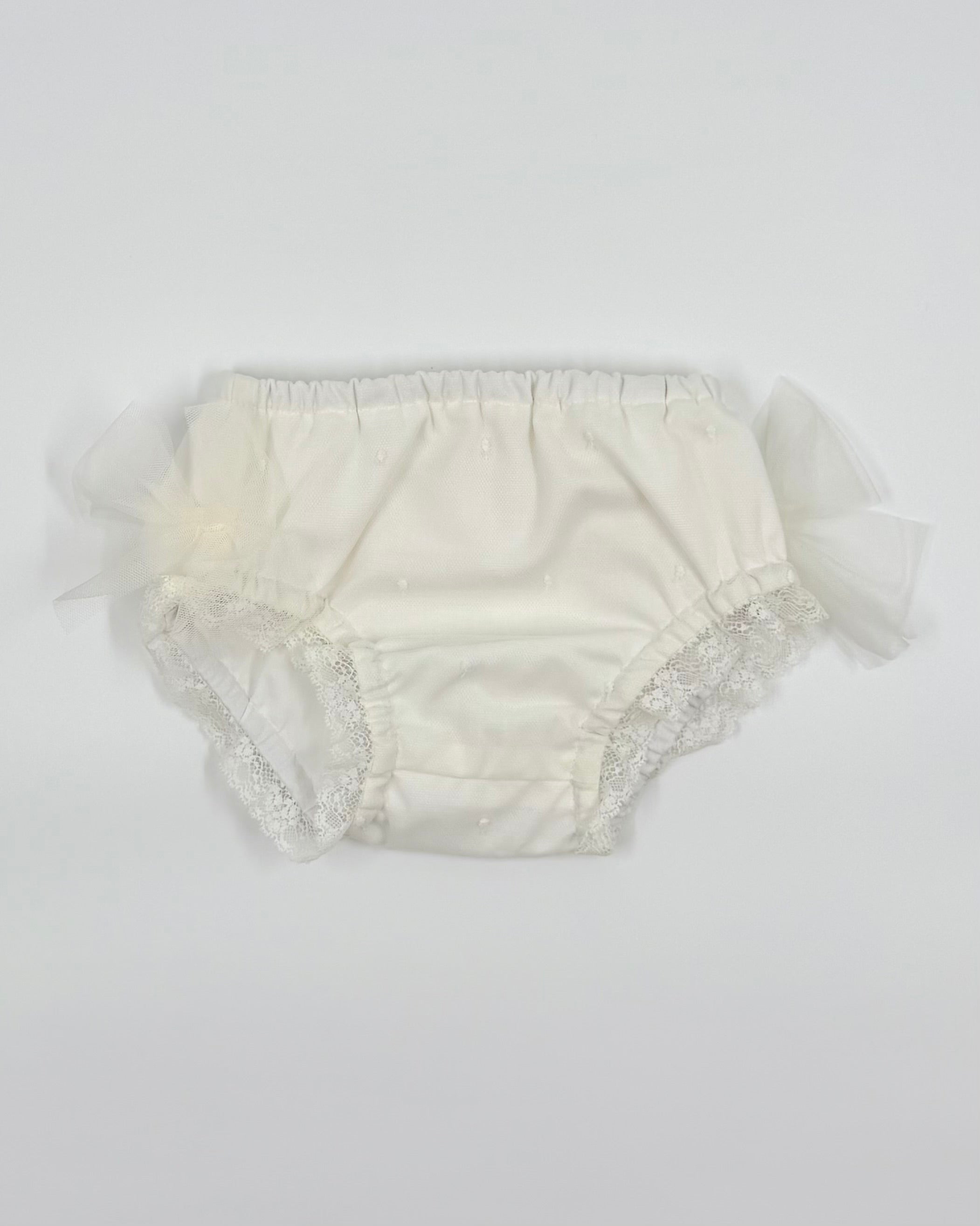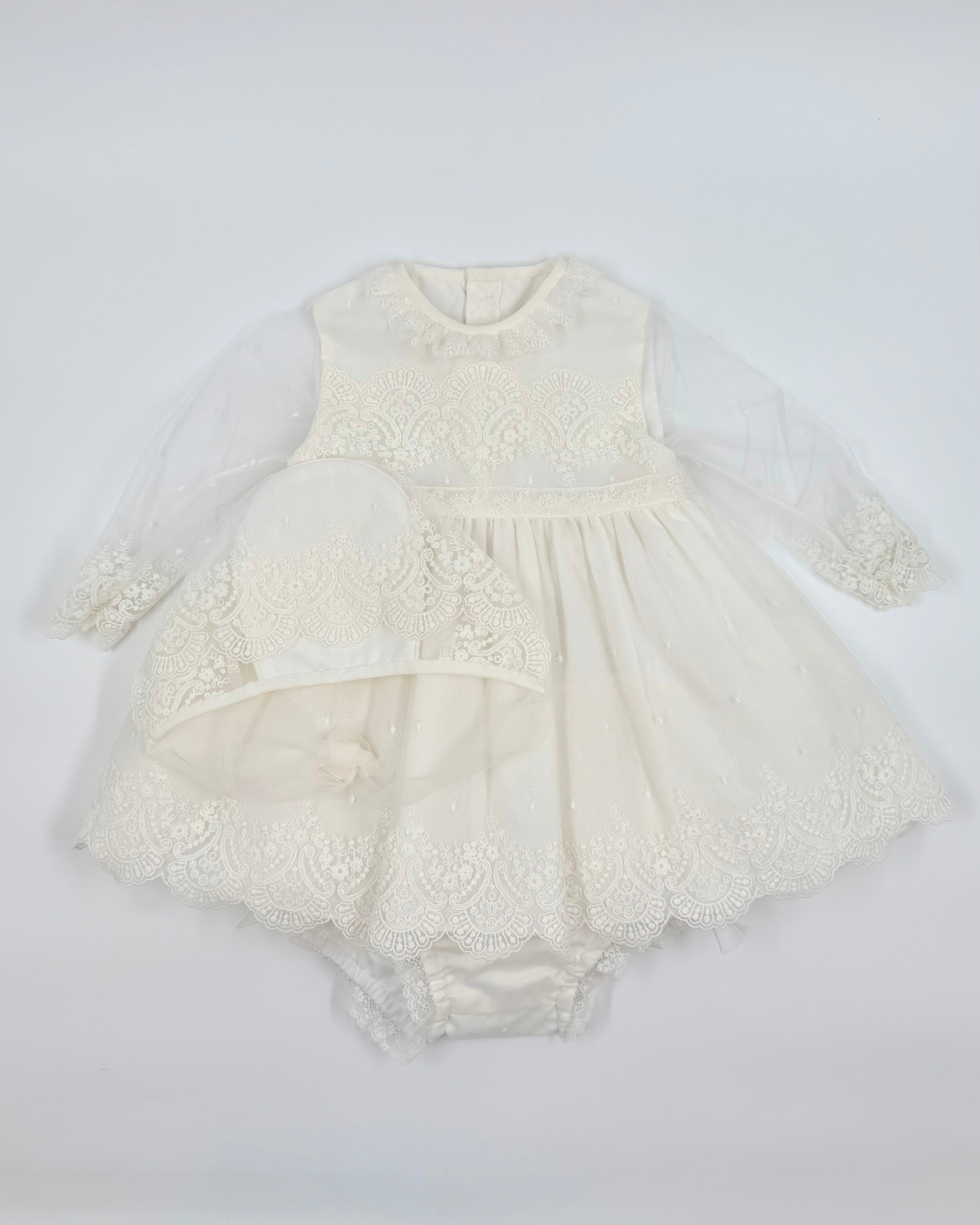An adorable short dress with bloomers and bonnet to wear on a special occasion.