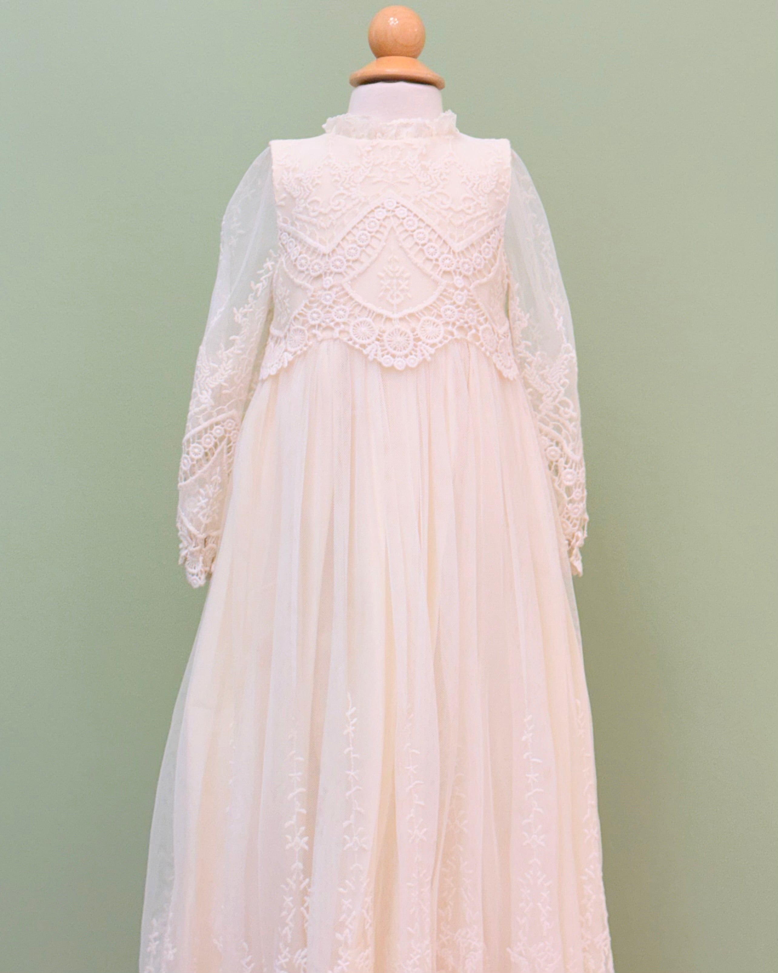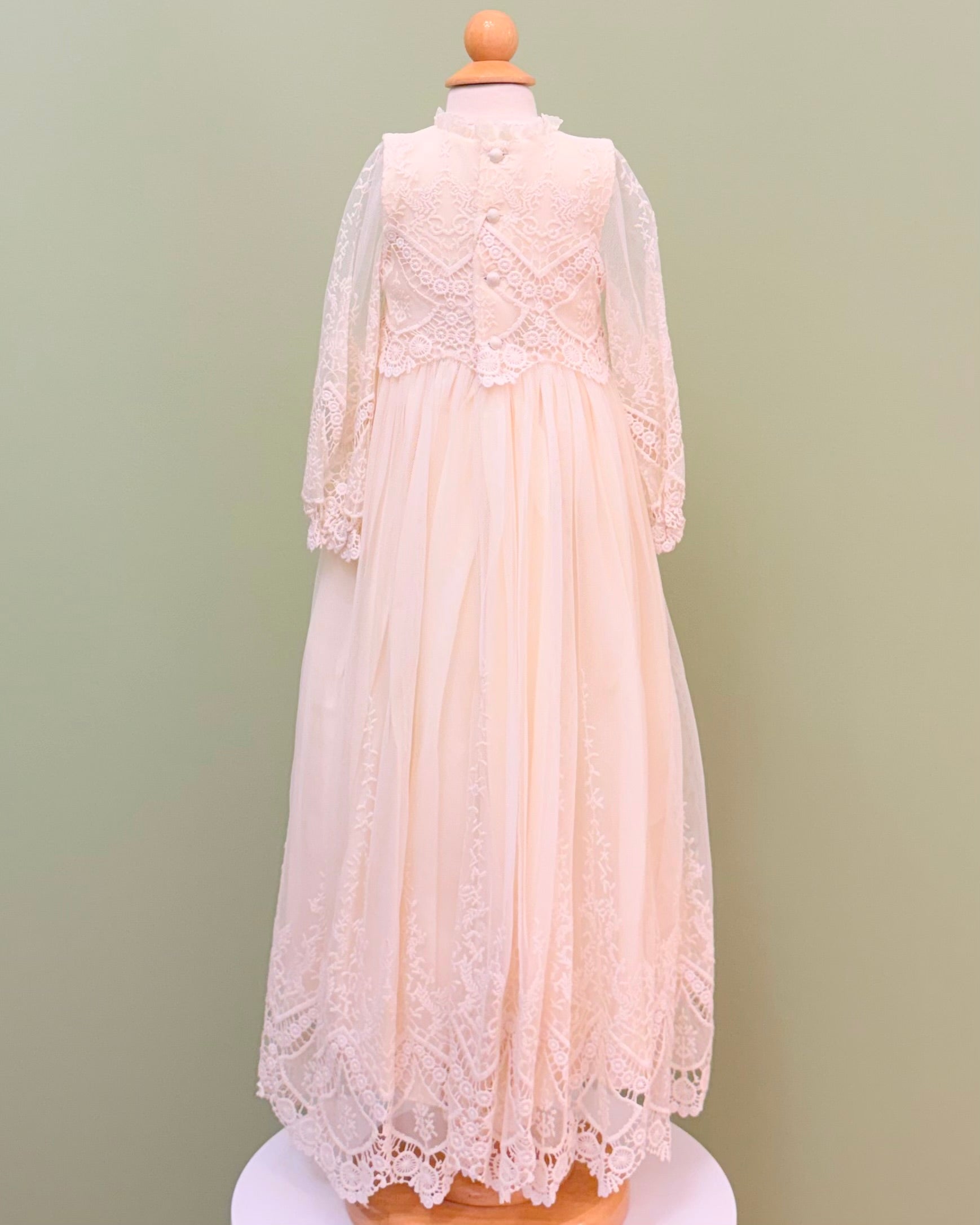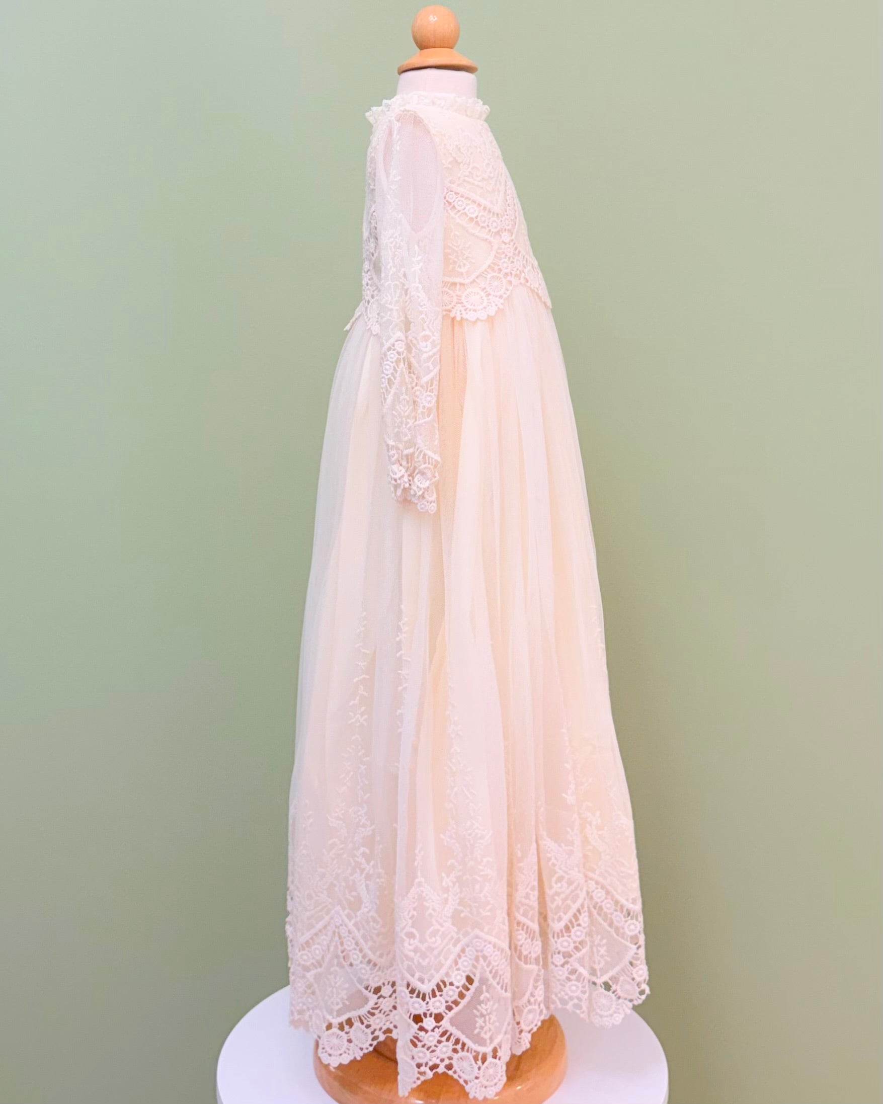 A unique and exquisite full vintage lace gown. Beautiful hand-embroidered lace in ivory. It has three clip-on on the back for closure. Does not include bonnet