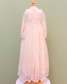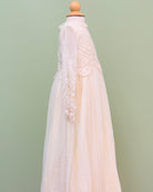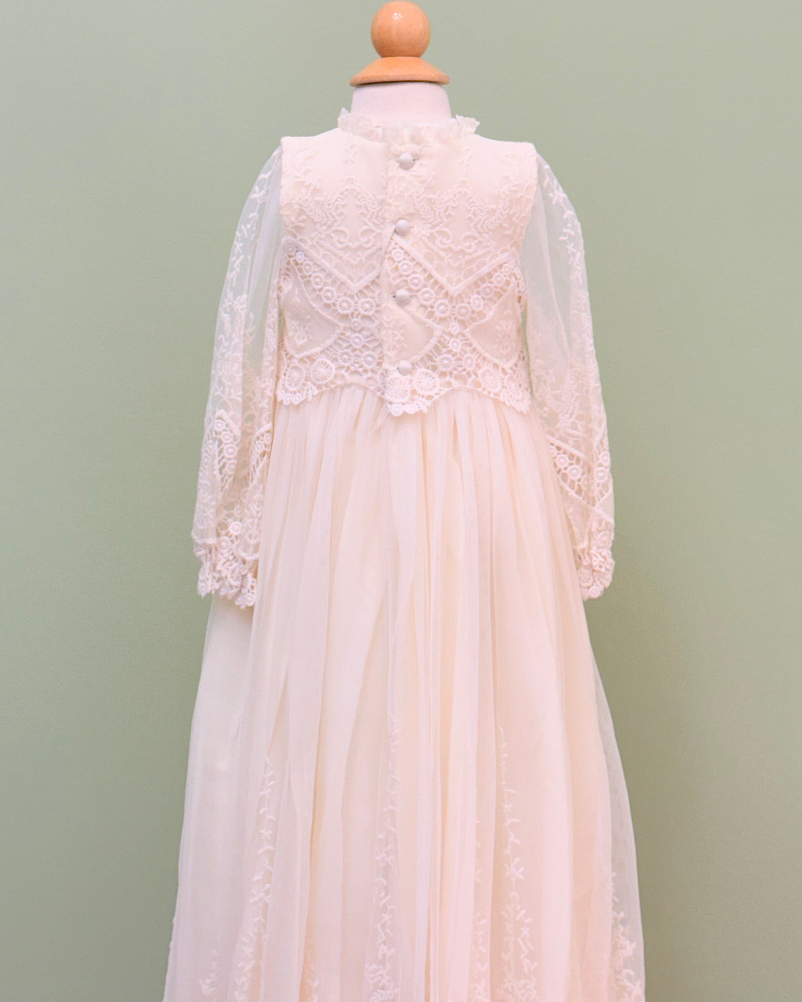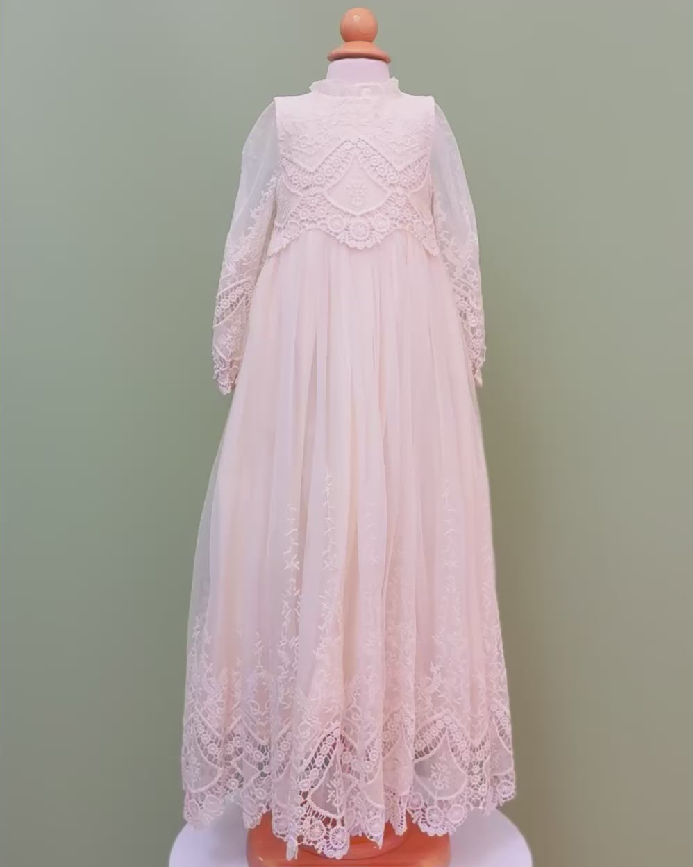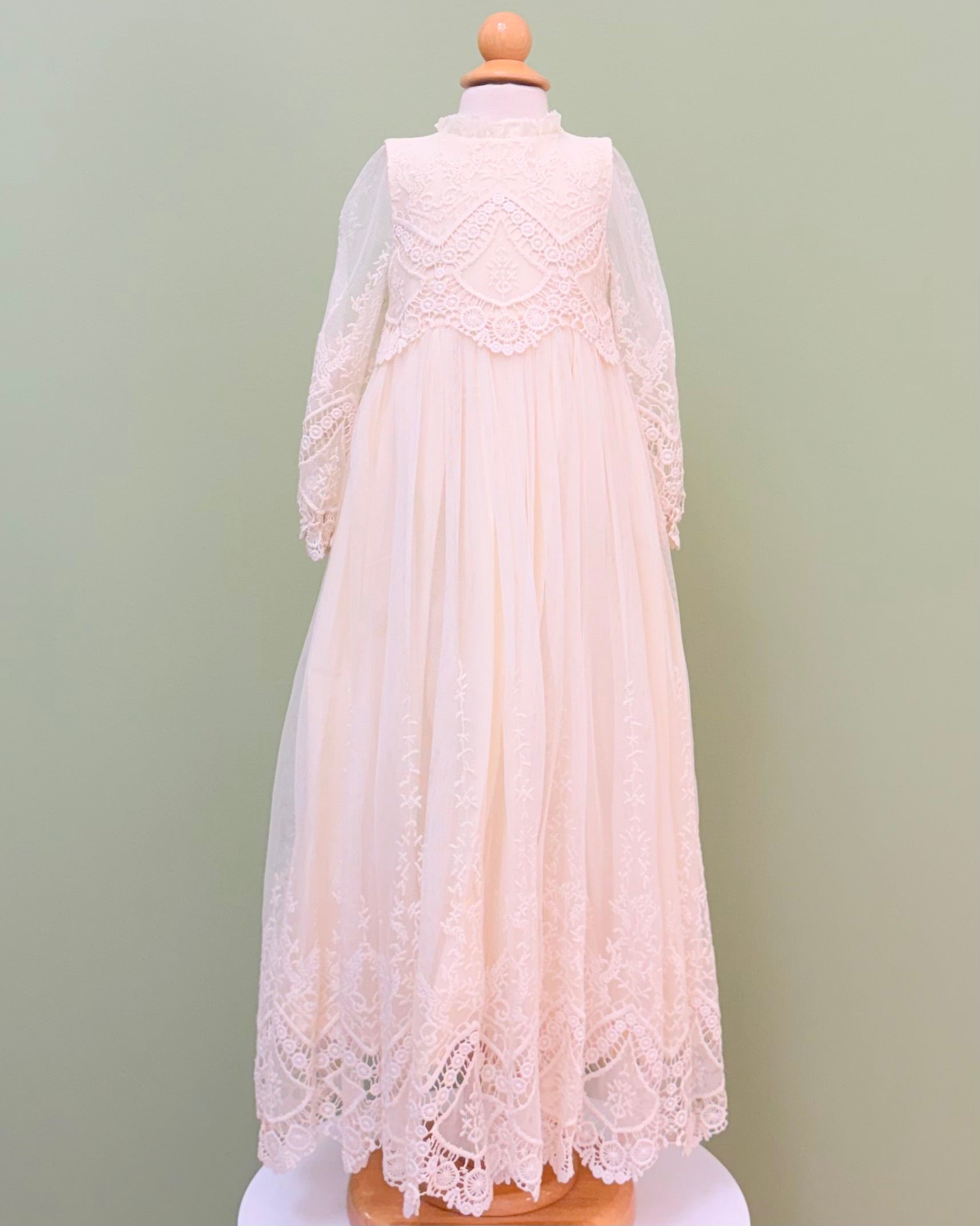A unique and exquisite full vintage lace gown. Beautiful hand-embroidered lace in ivory. It has three clip-on on the back for closure. Does not include bonnet