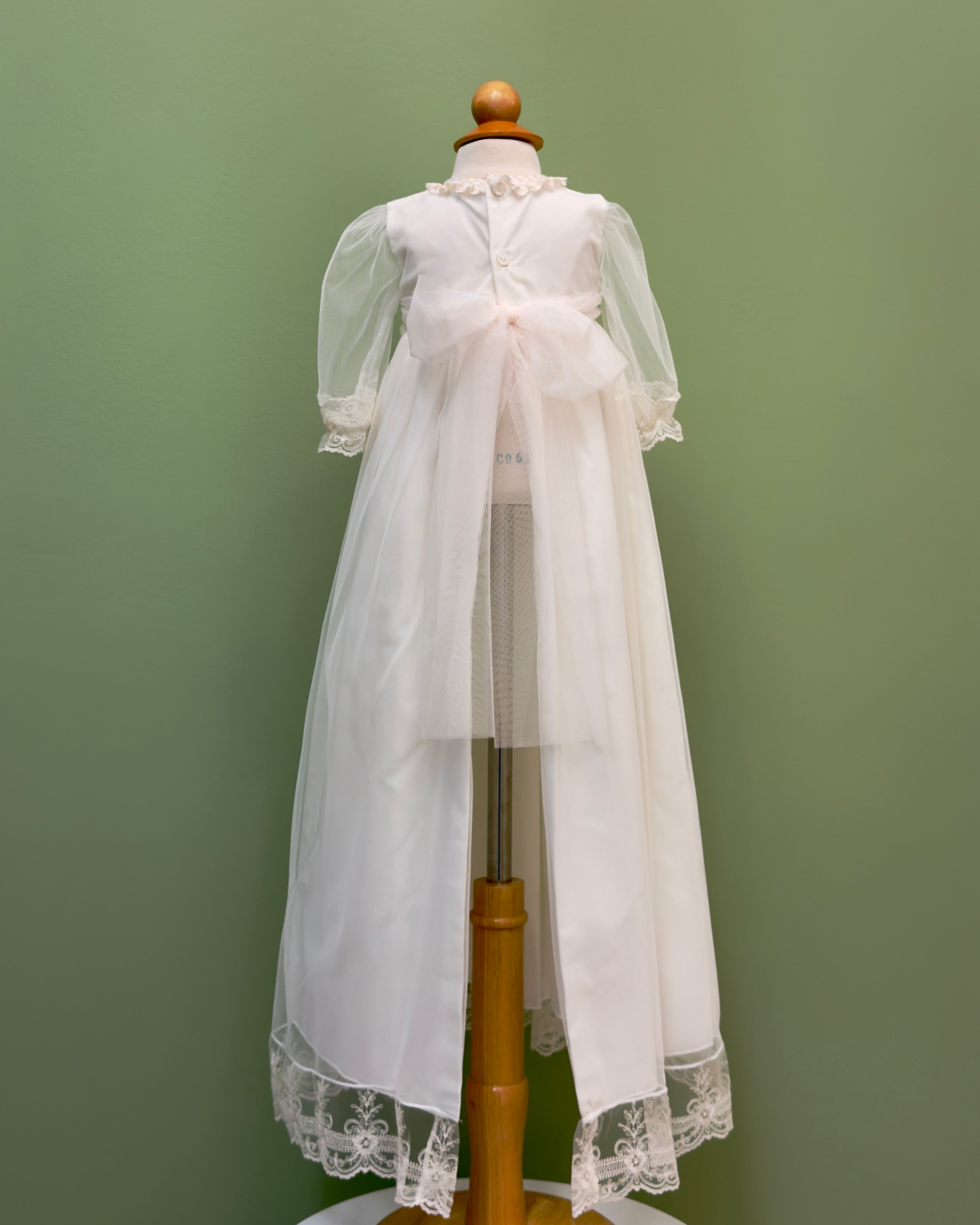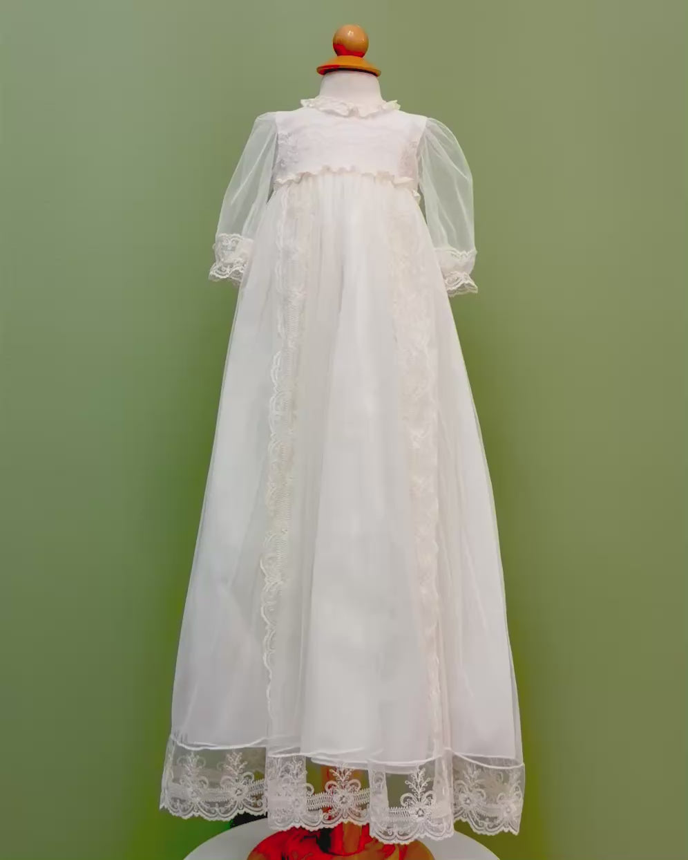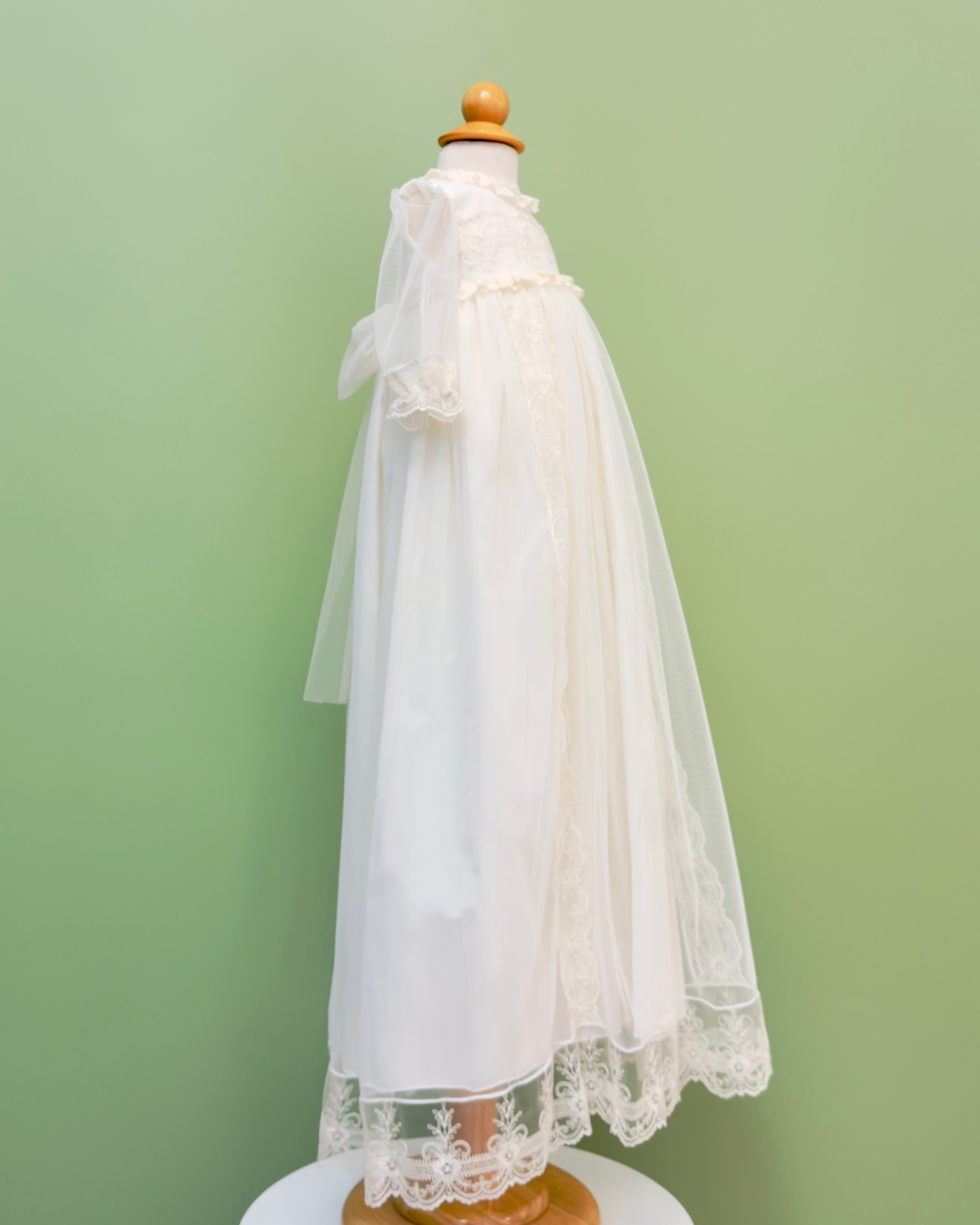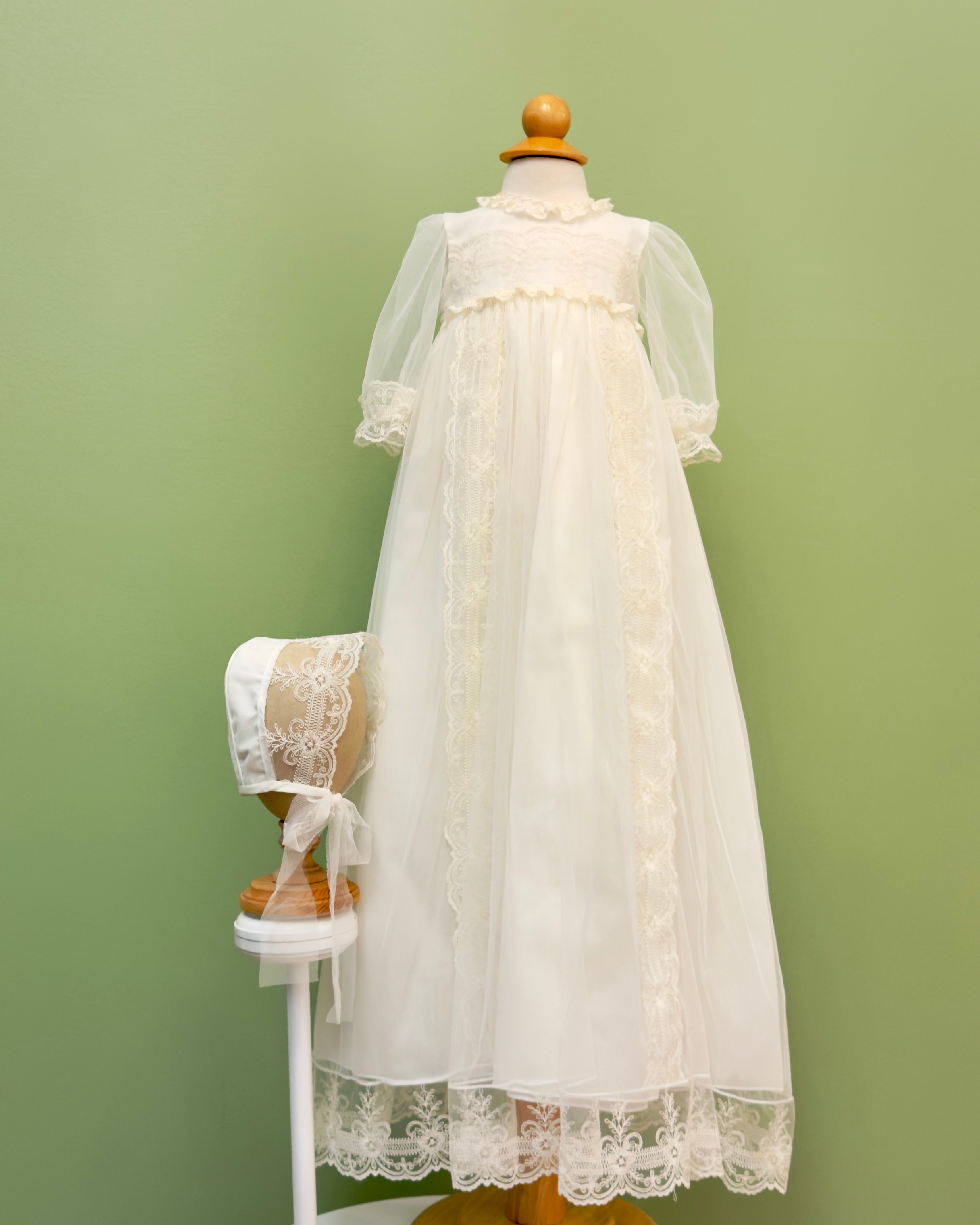 An adorable, yet elegant, christening gown for babies, very soft and lightweight. It is made with off-white French tulle and laces. It comes with a matching bonnet