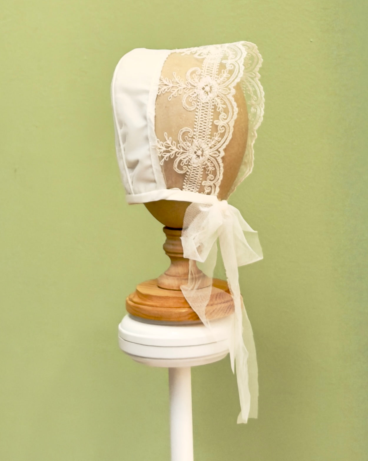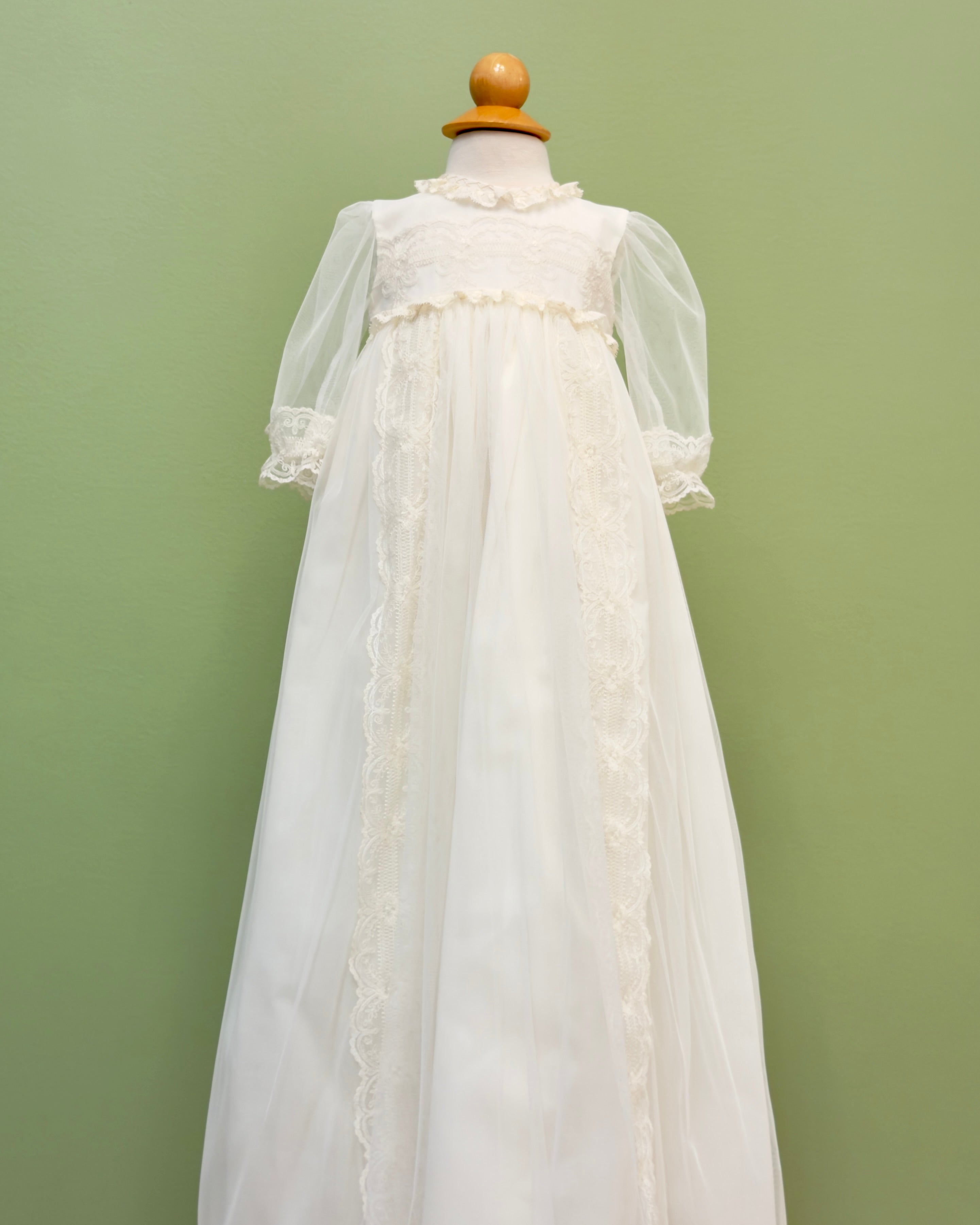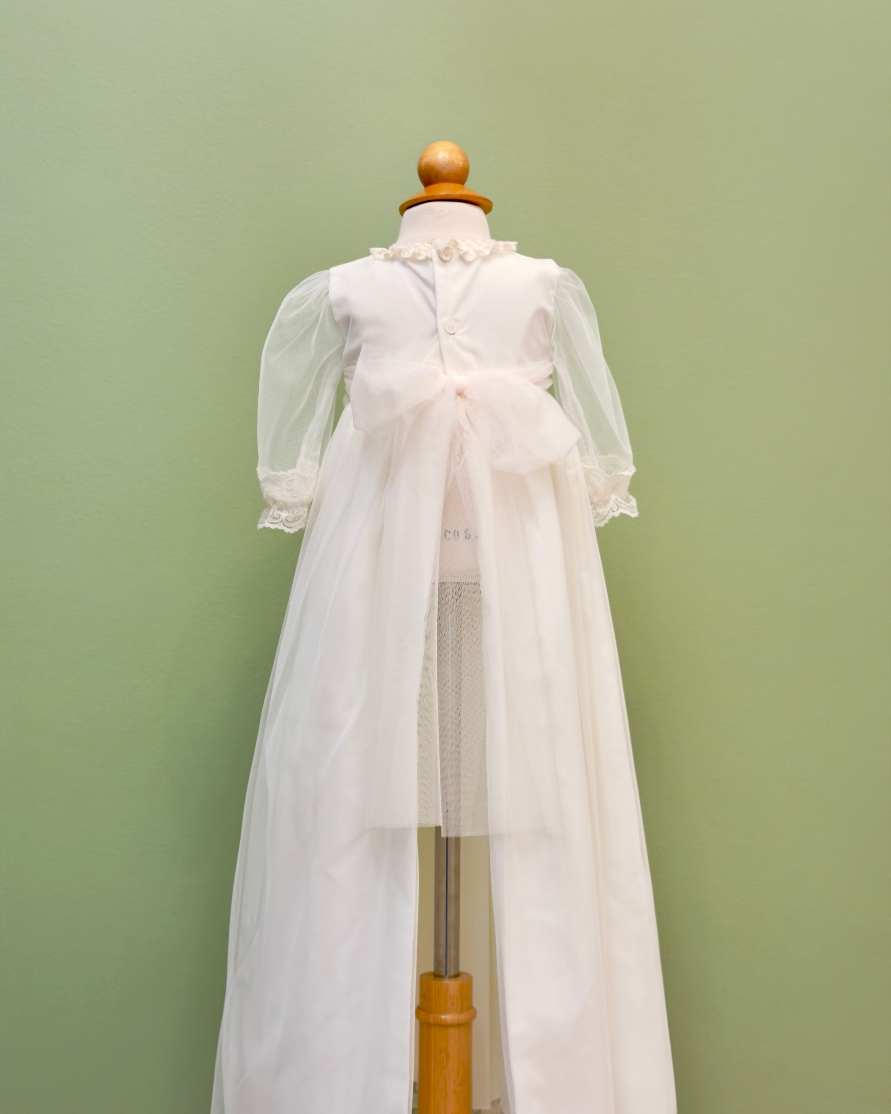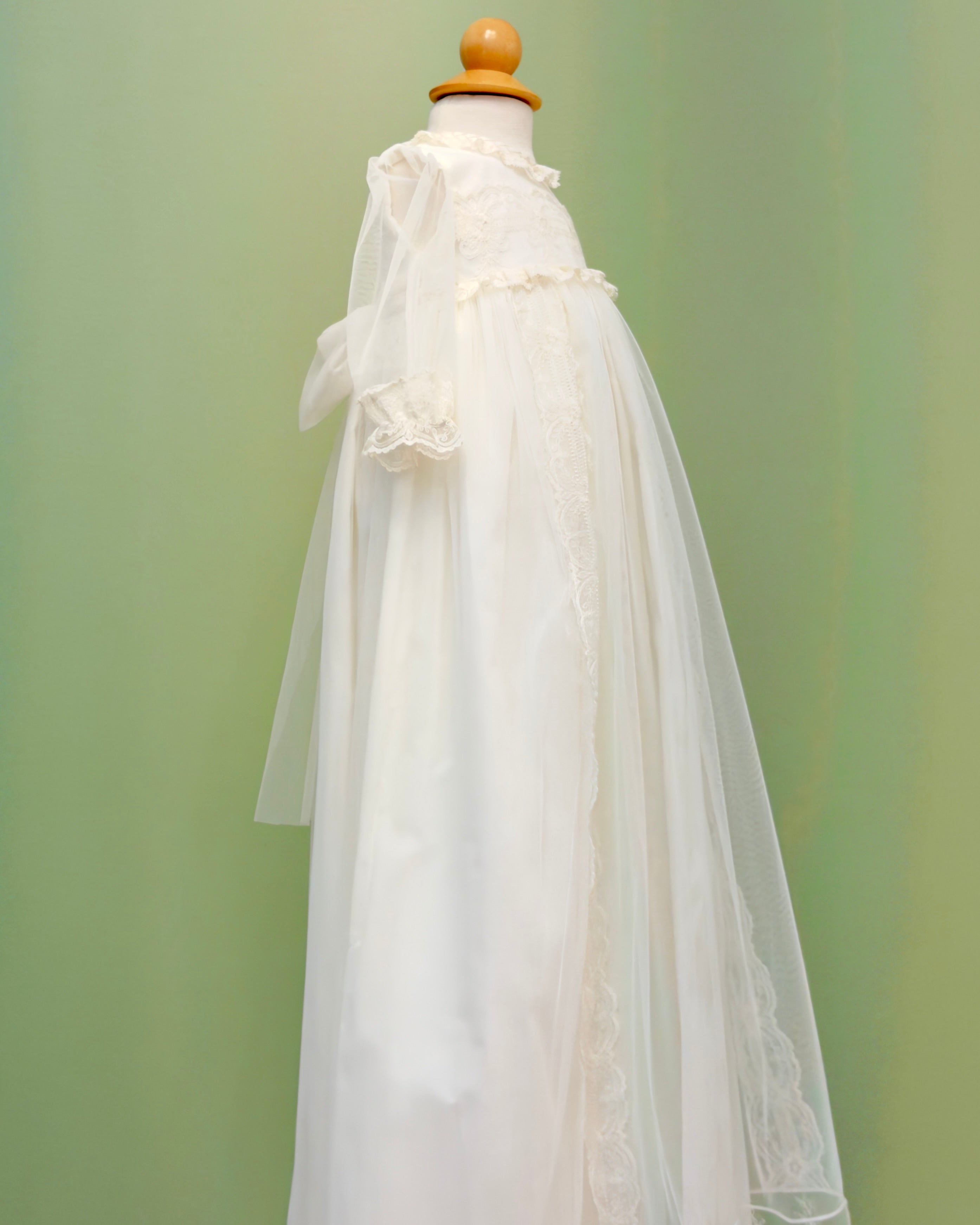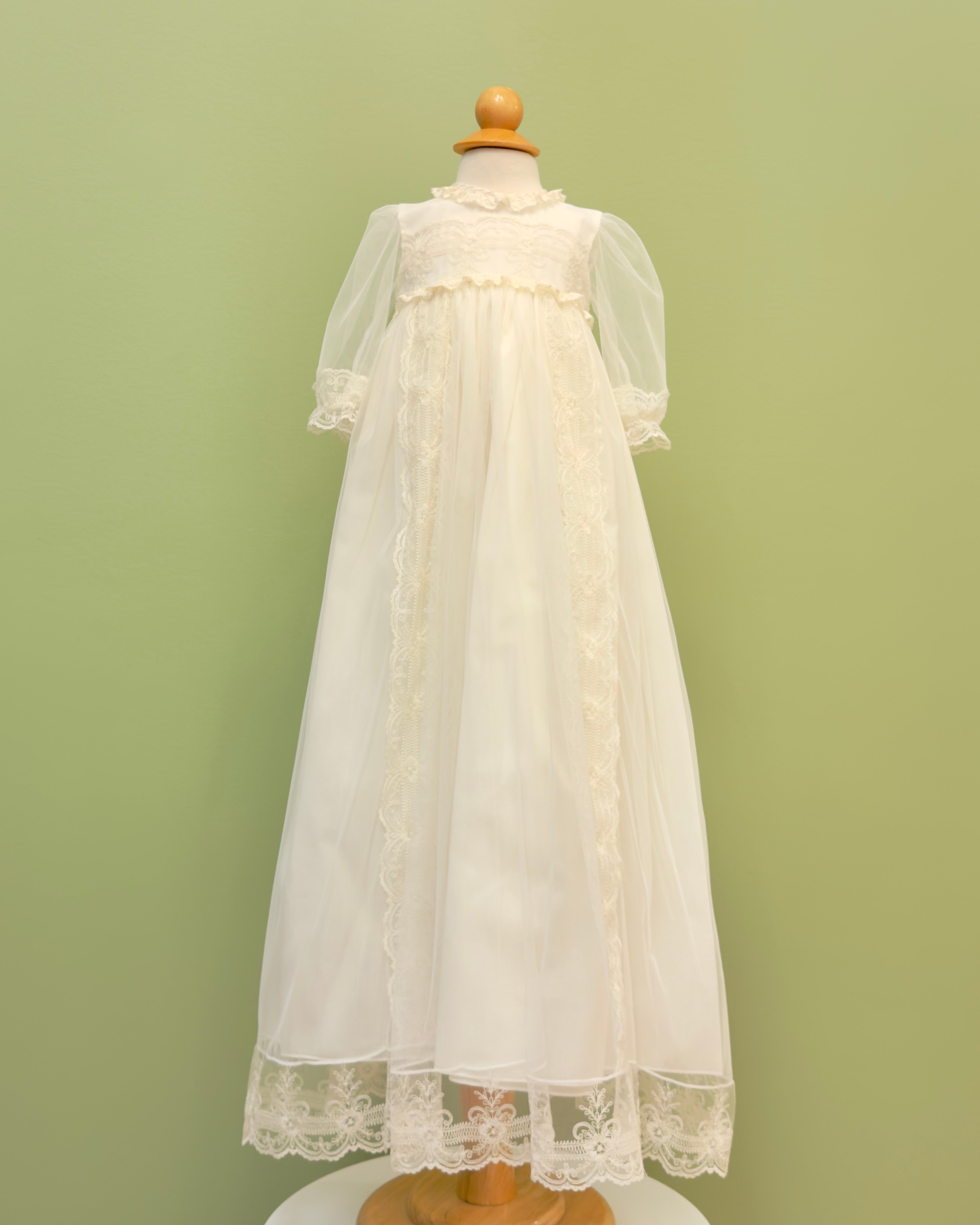 An adorable, yet elegant, christening gown for babies, very soft and lightweight. It is made with off-white French tulle and laces. It comes with a matching bonnet