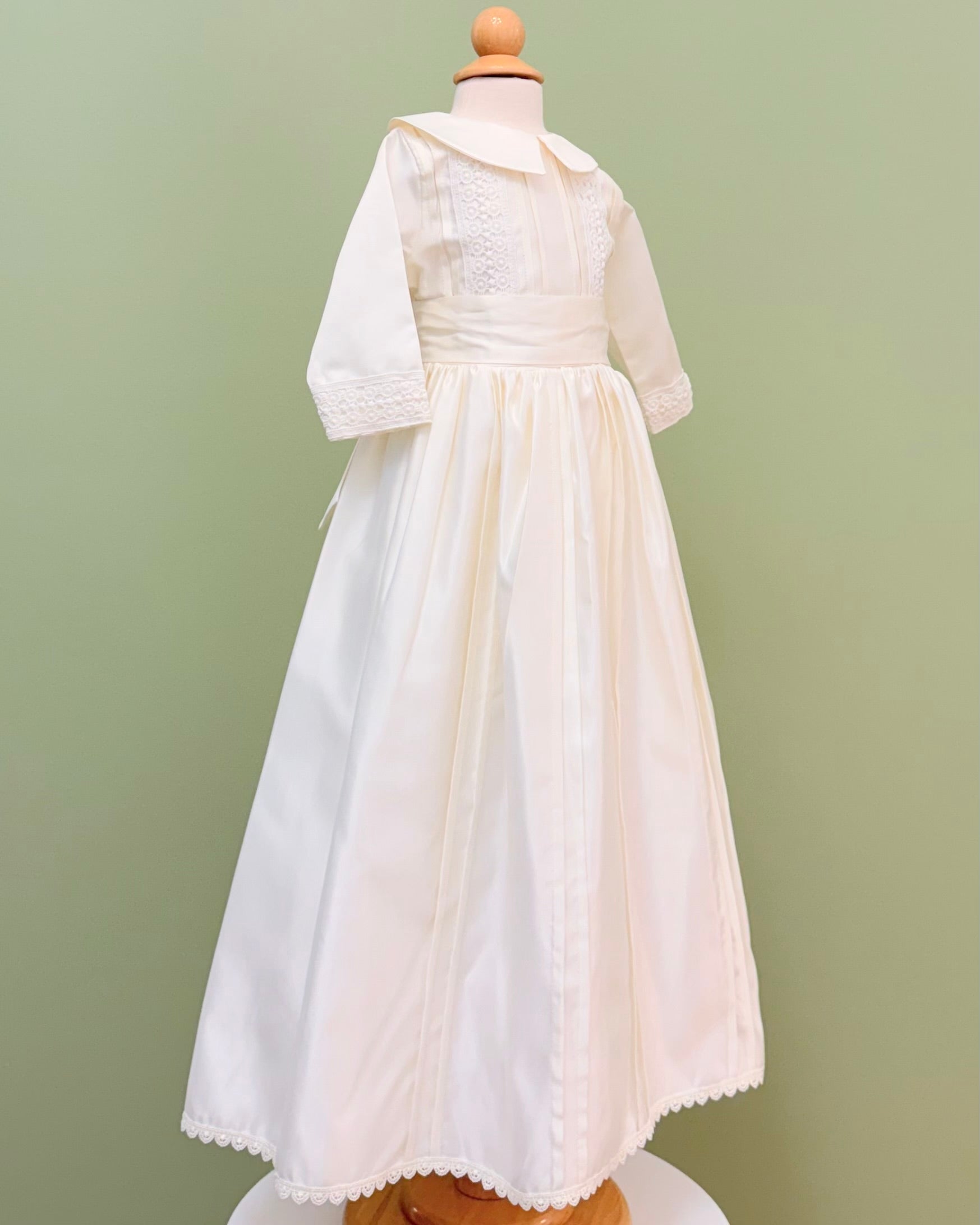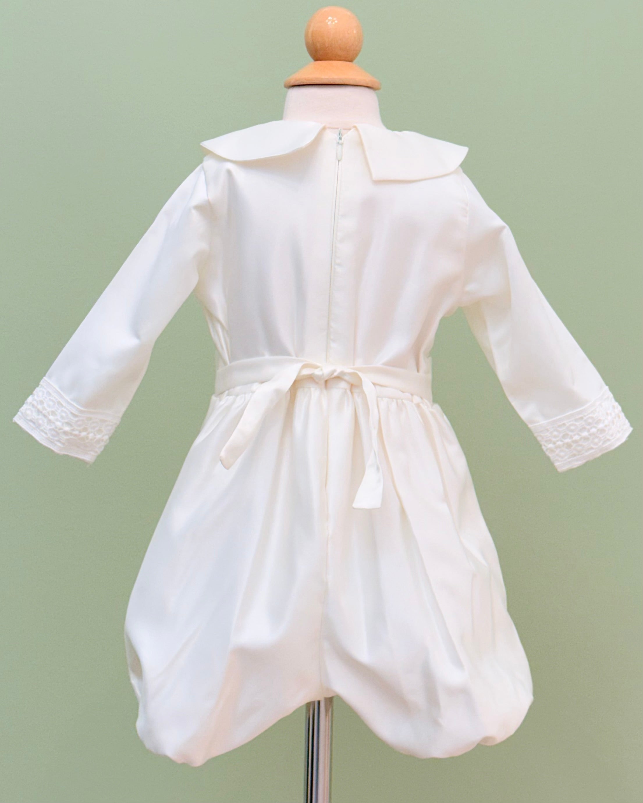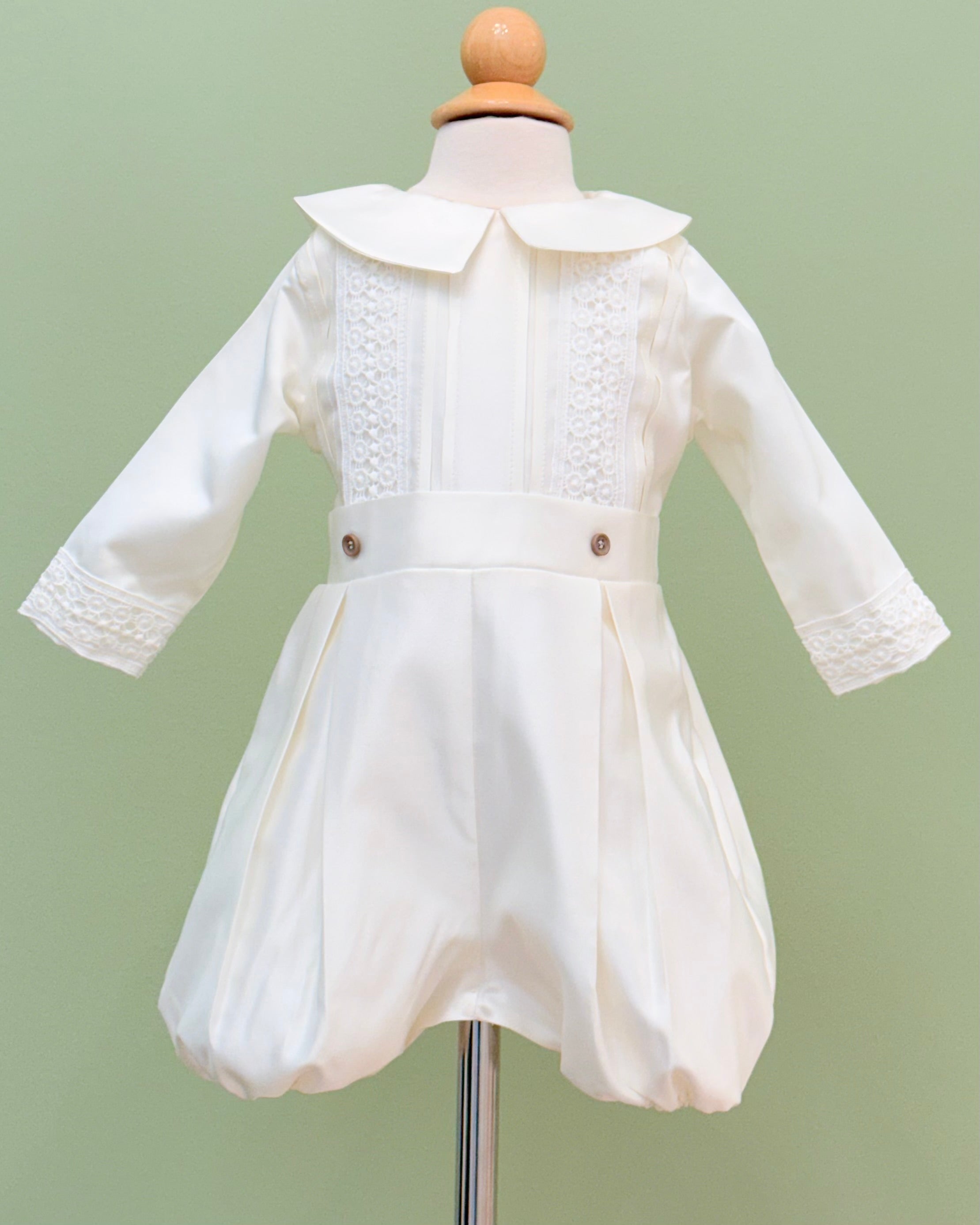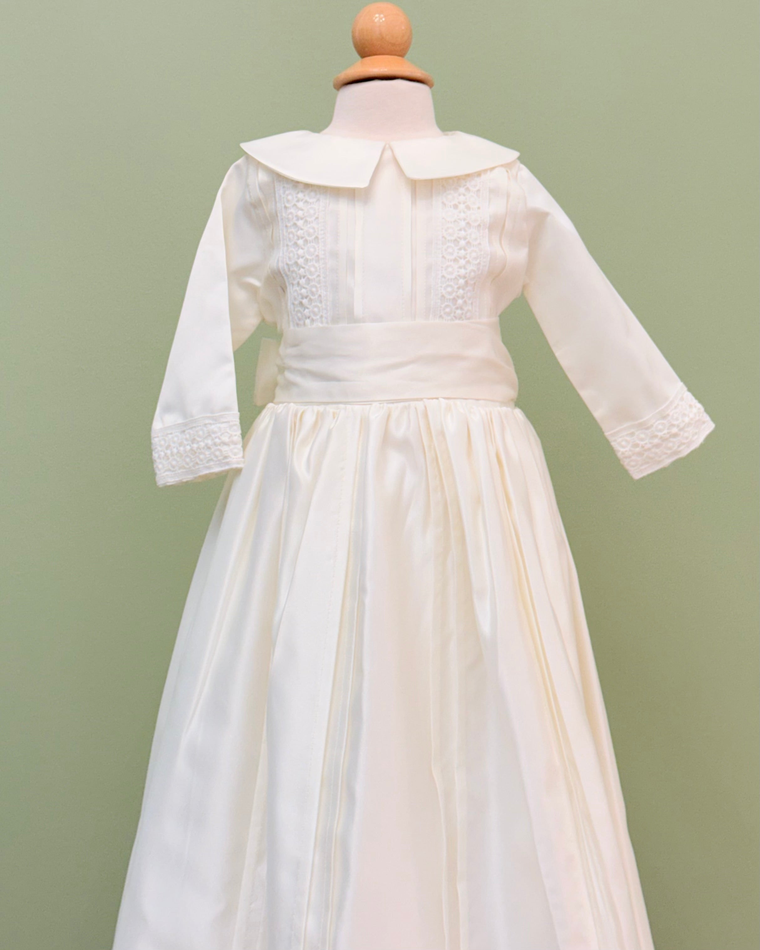 Tarifa is a unique christening gown that transforms into a romper, also it is a one size that will fit sizes 12 to 24 months. It is made with an ivory satin that is lightweight.