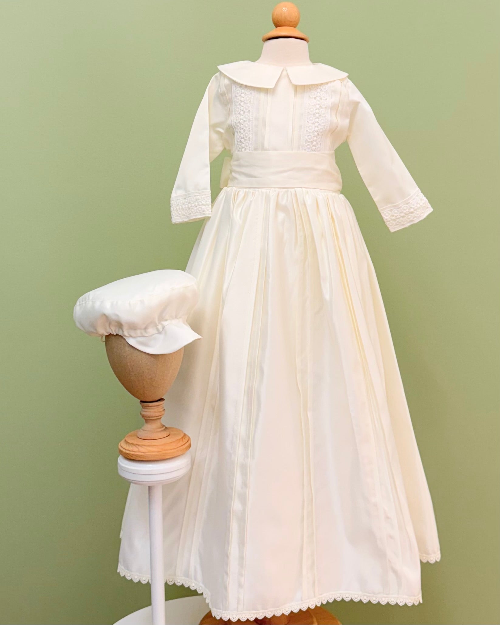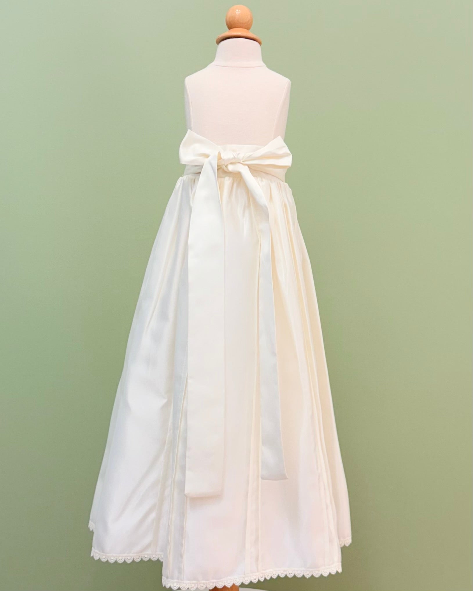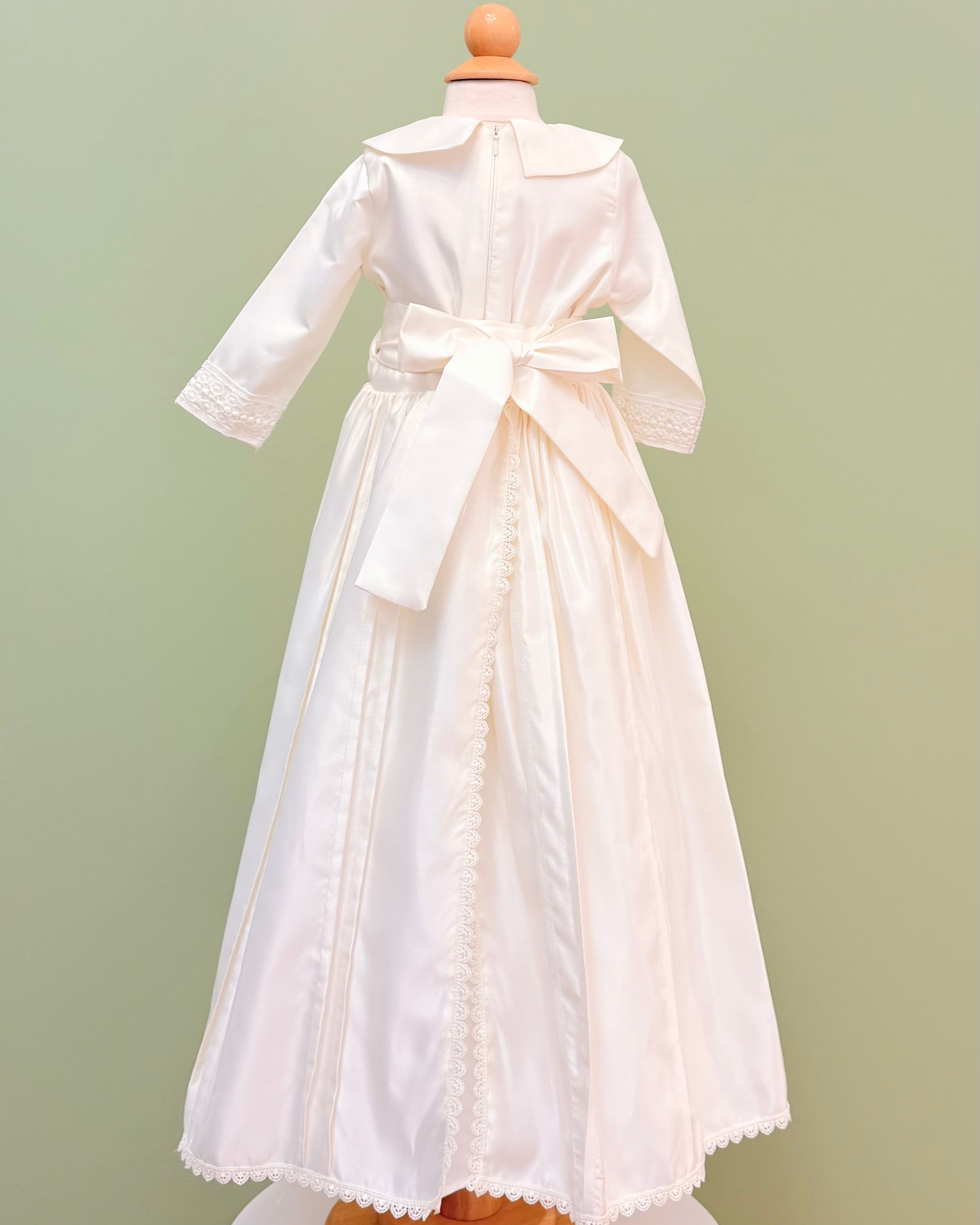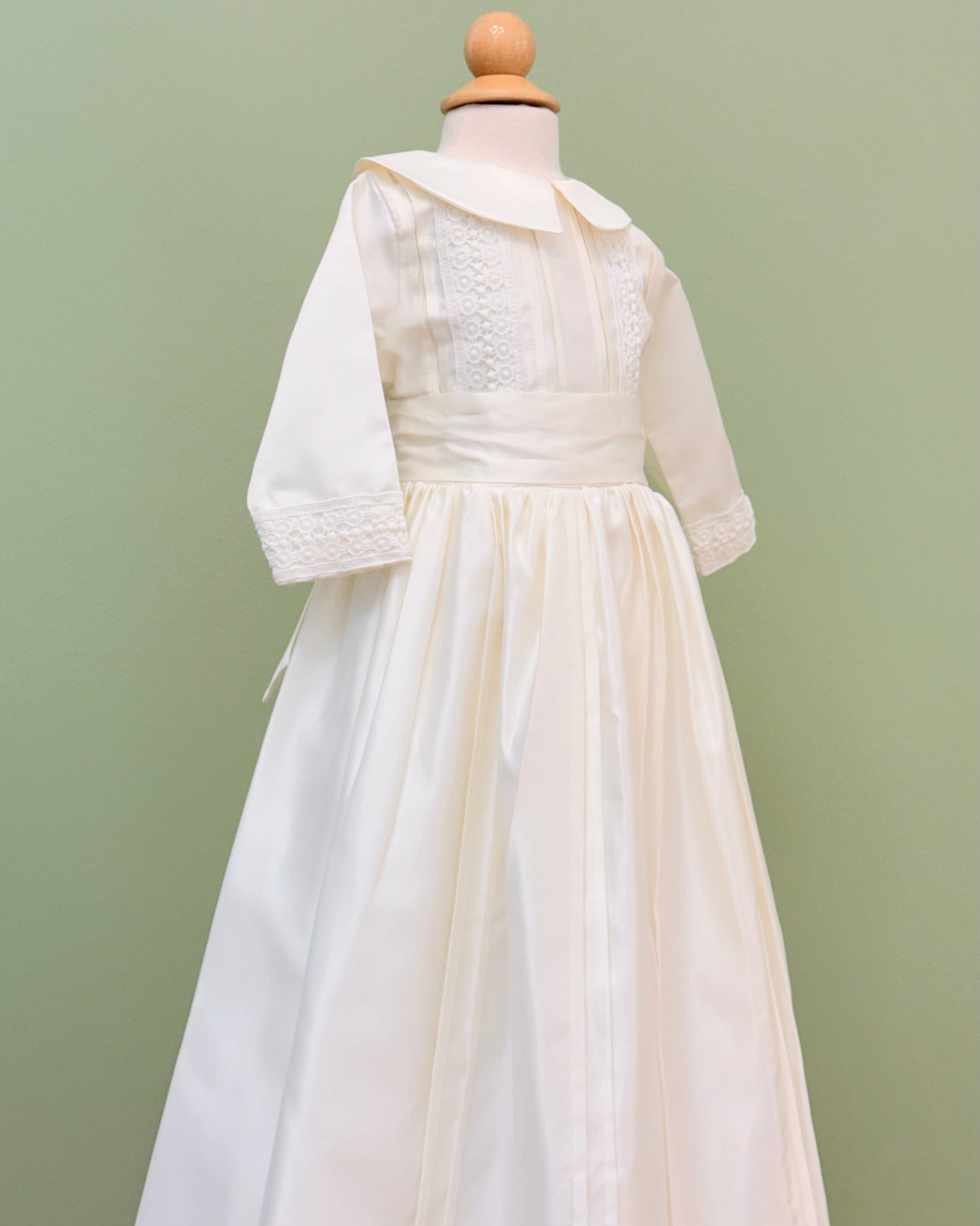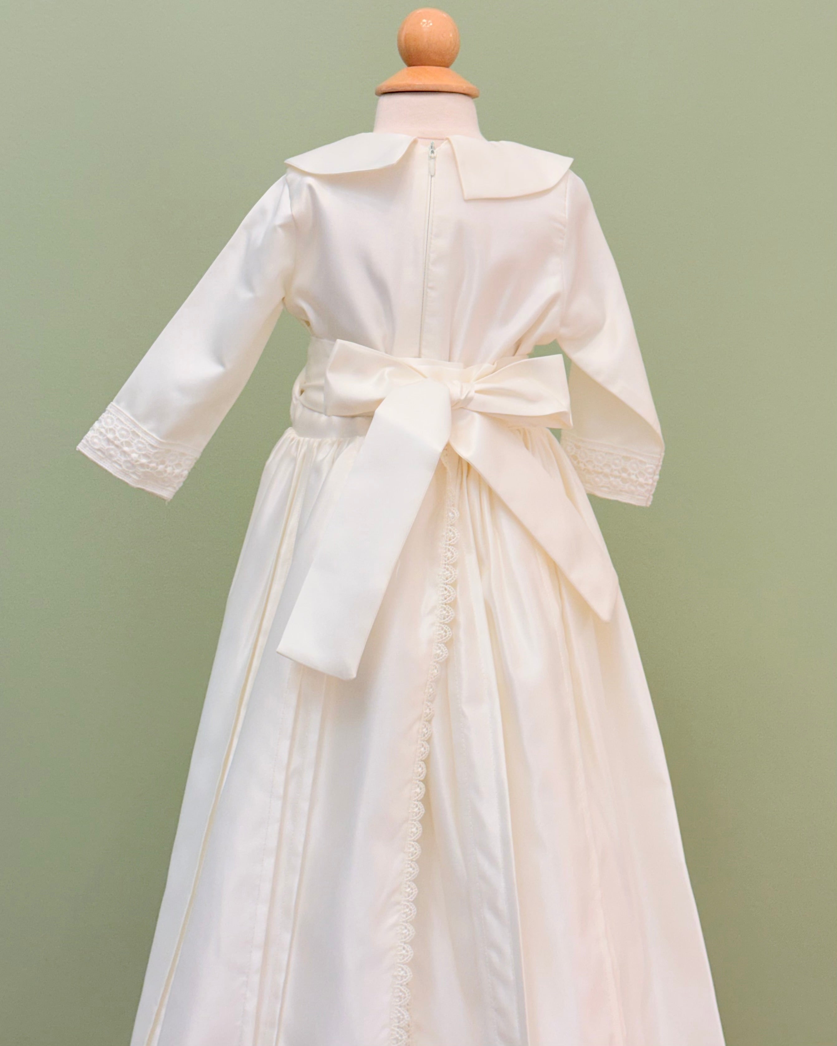 Tarifa is a unique christening gown that transforms into a romper, also it is a one size that will fit sizes 12 to 24 months. It is made with an ivory satin that is lightweight.