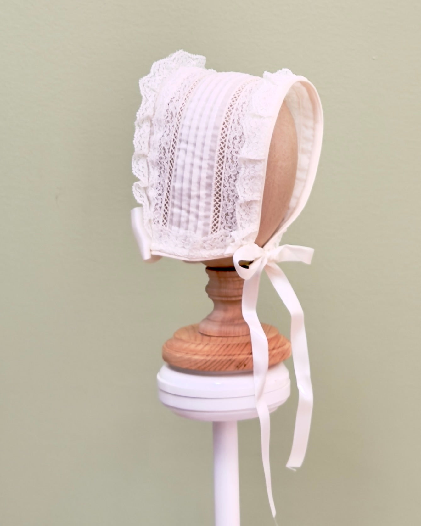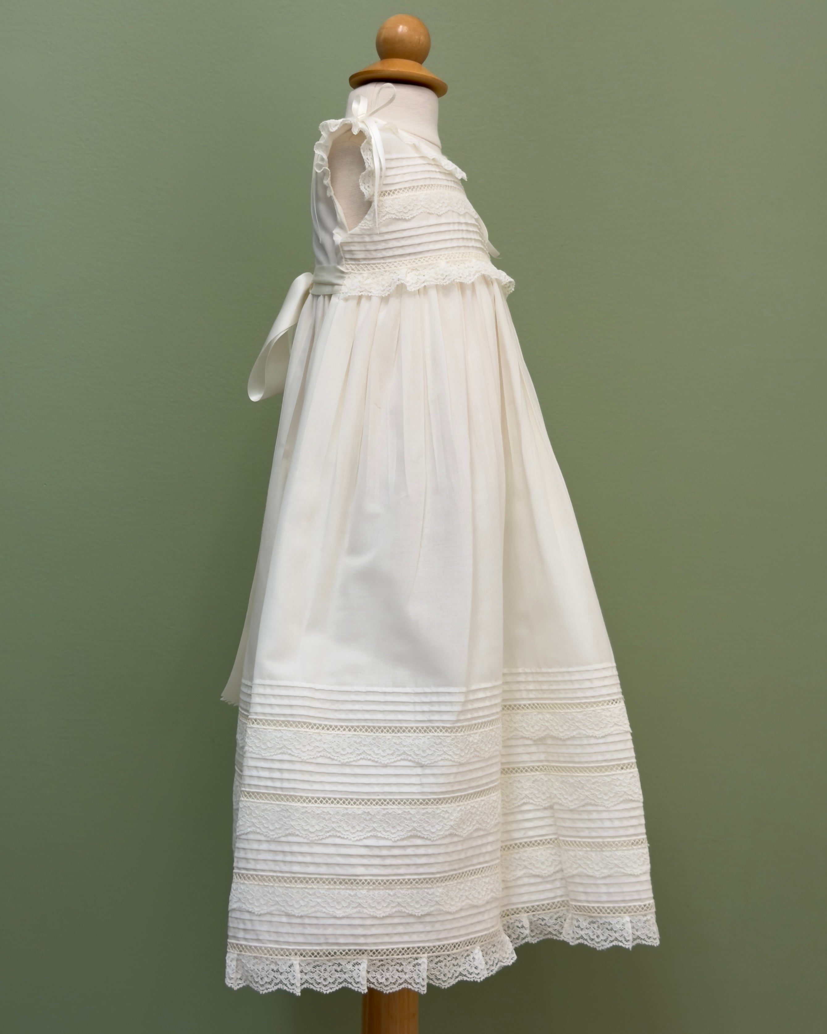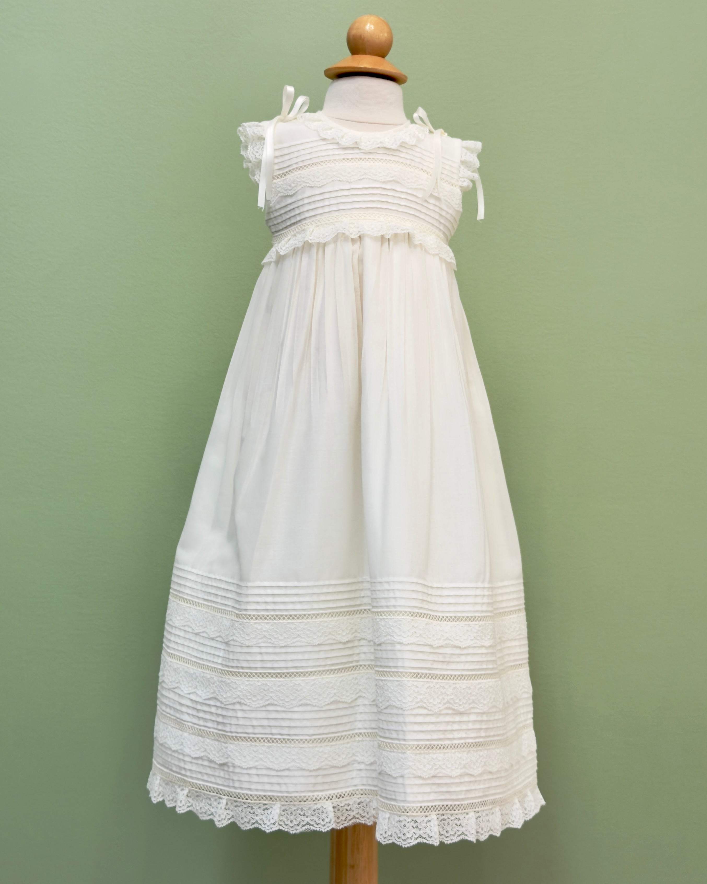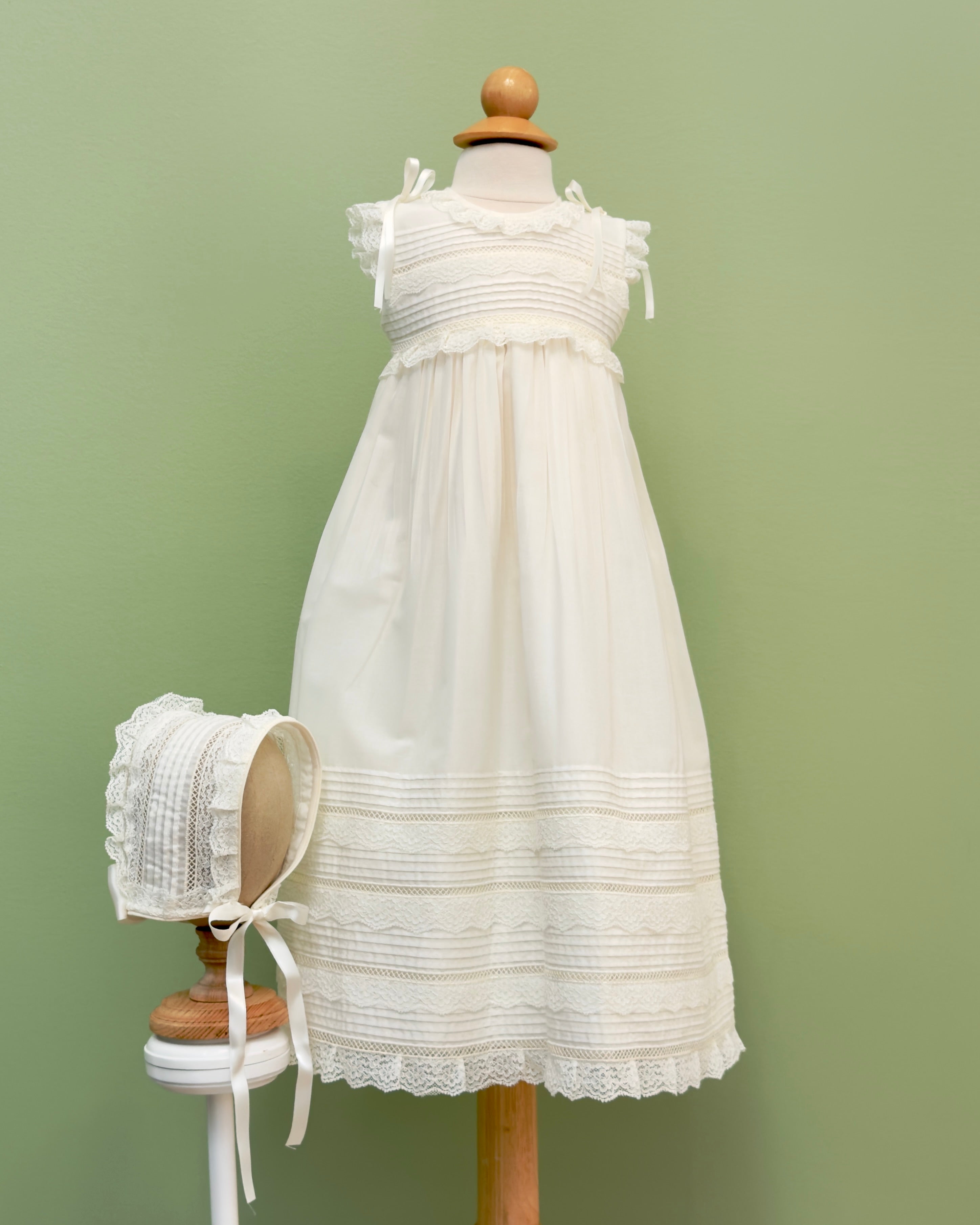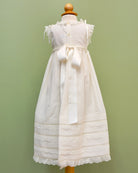 A traditional sleeveless christening gowns for babies, made in off-white batiste with laces. It comes with matching bonnet.