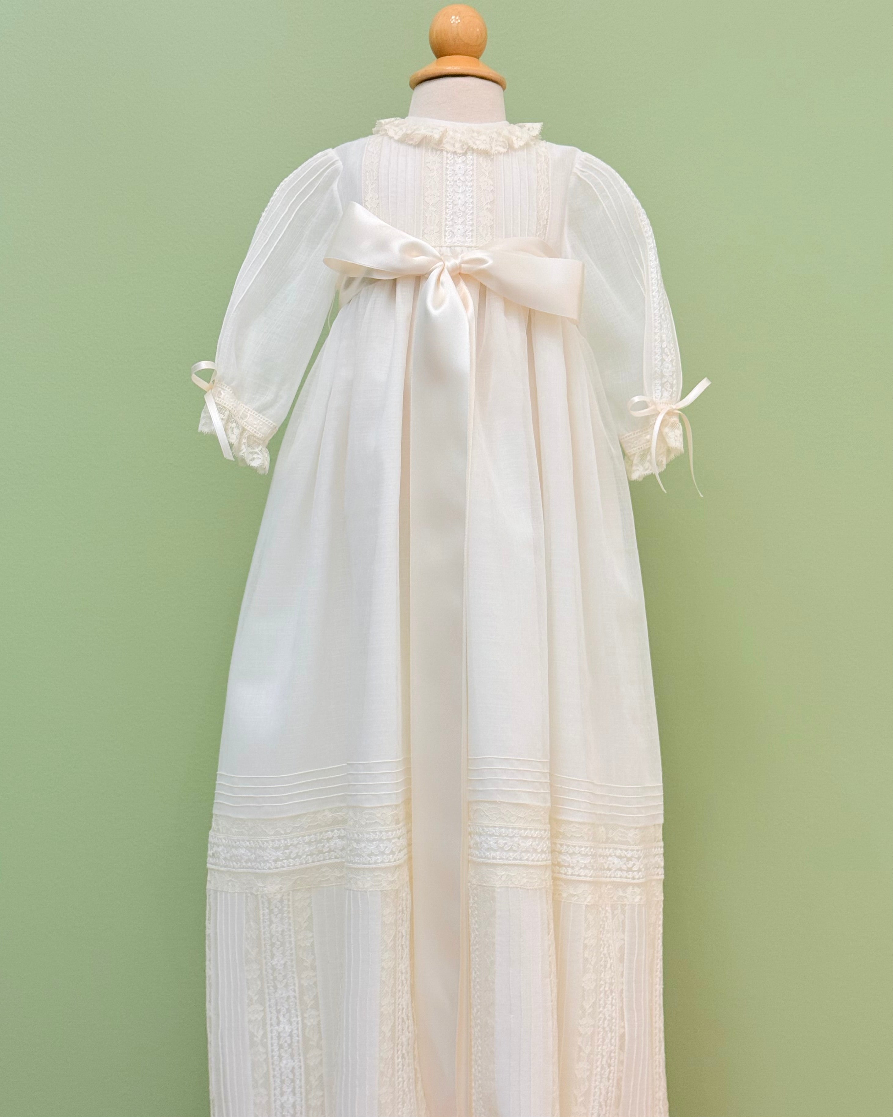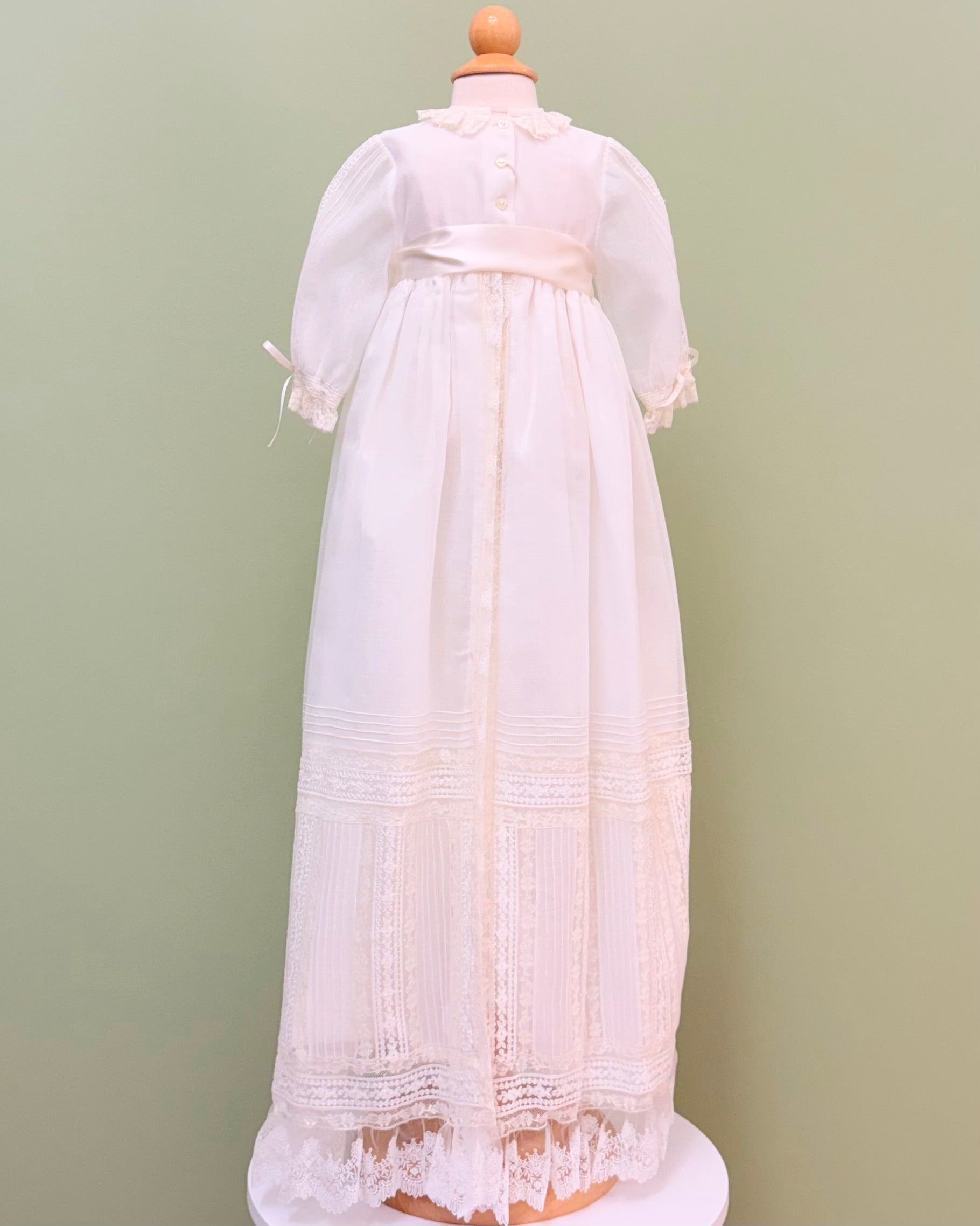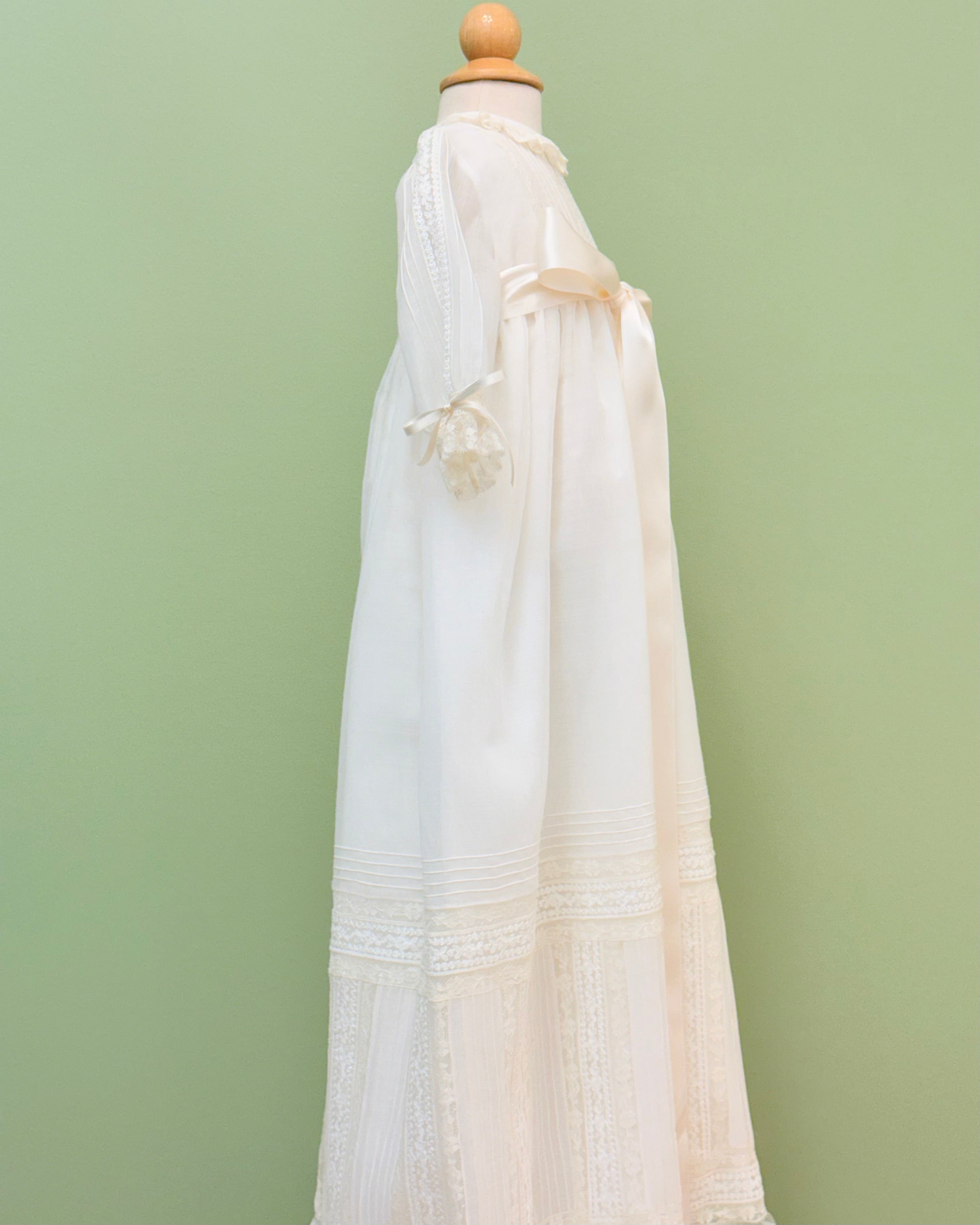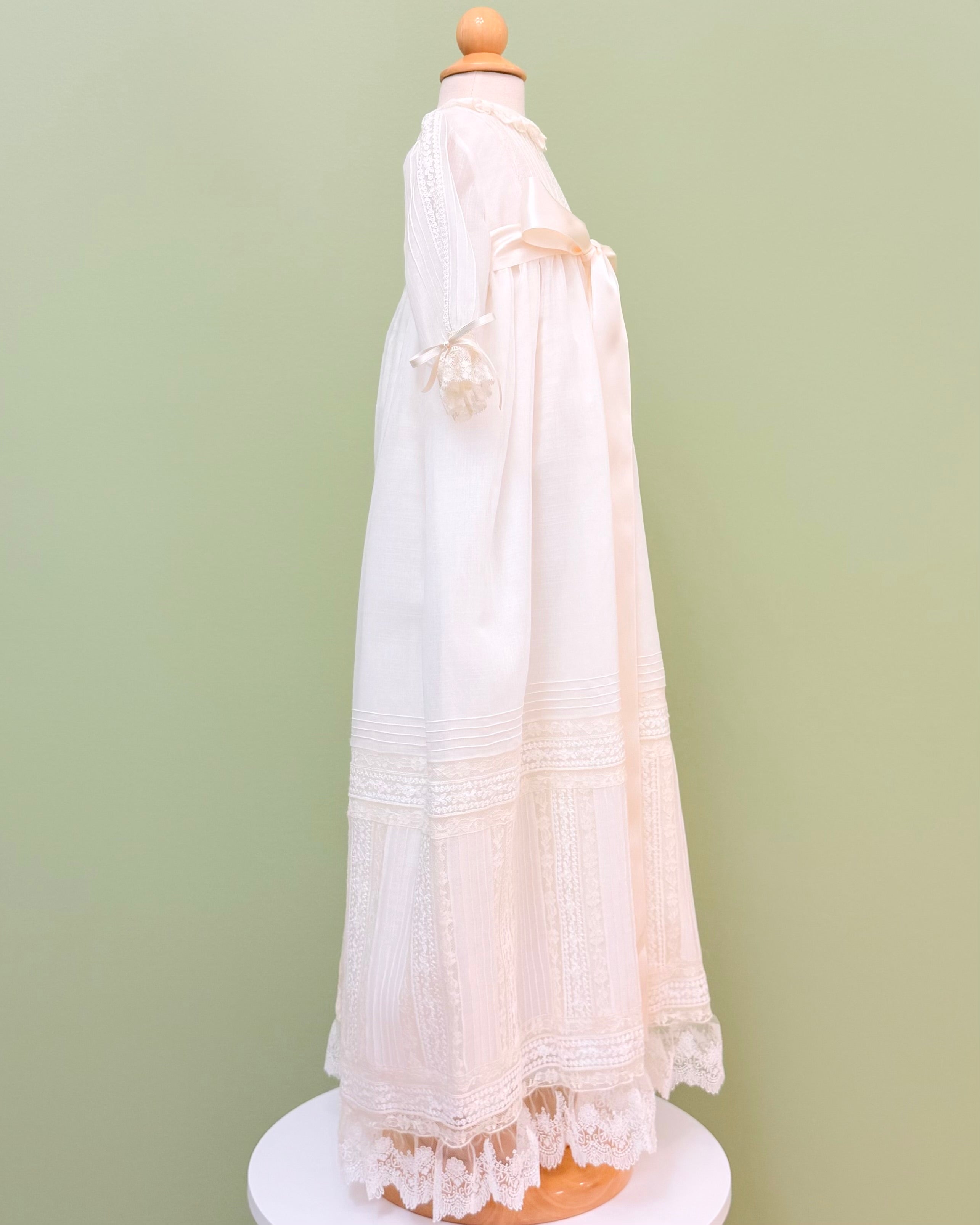A beautiful christening gown for babies made with ivory Muslin, very fresh and delicate. It has gorgeous lace throughout. The gown has buttons on the back for closure.