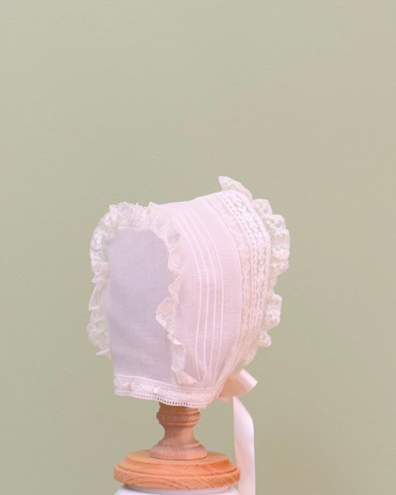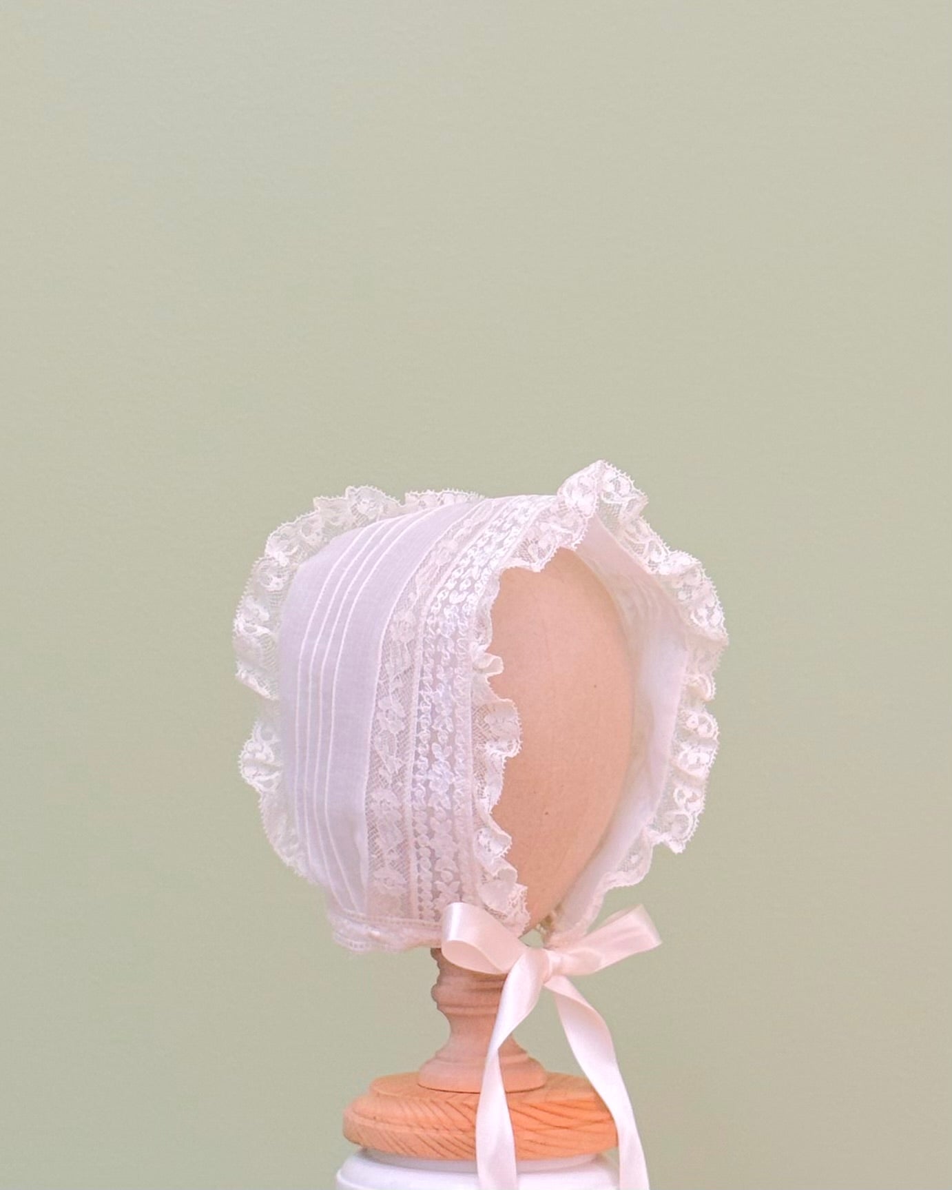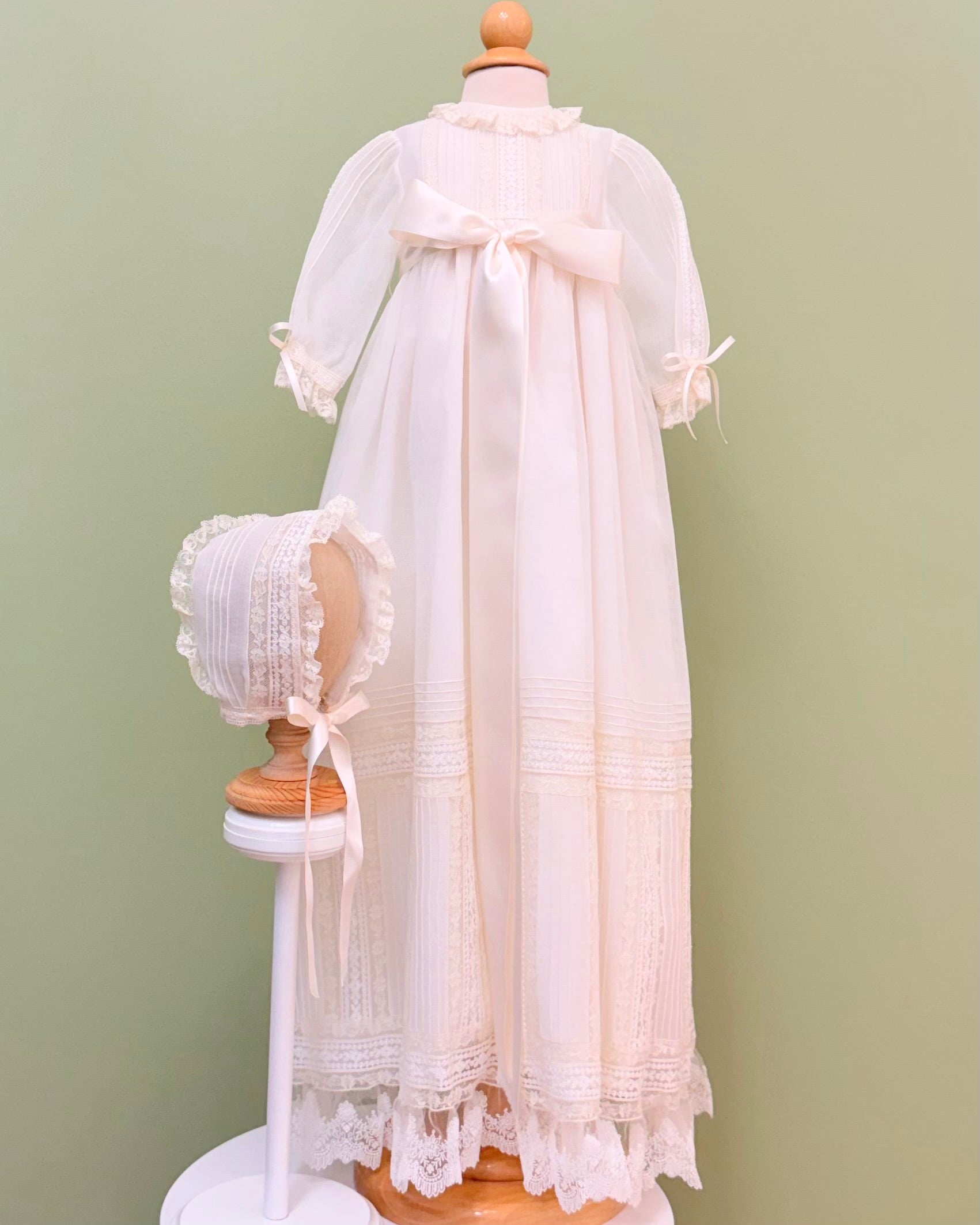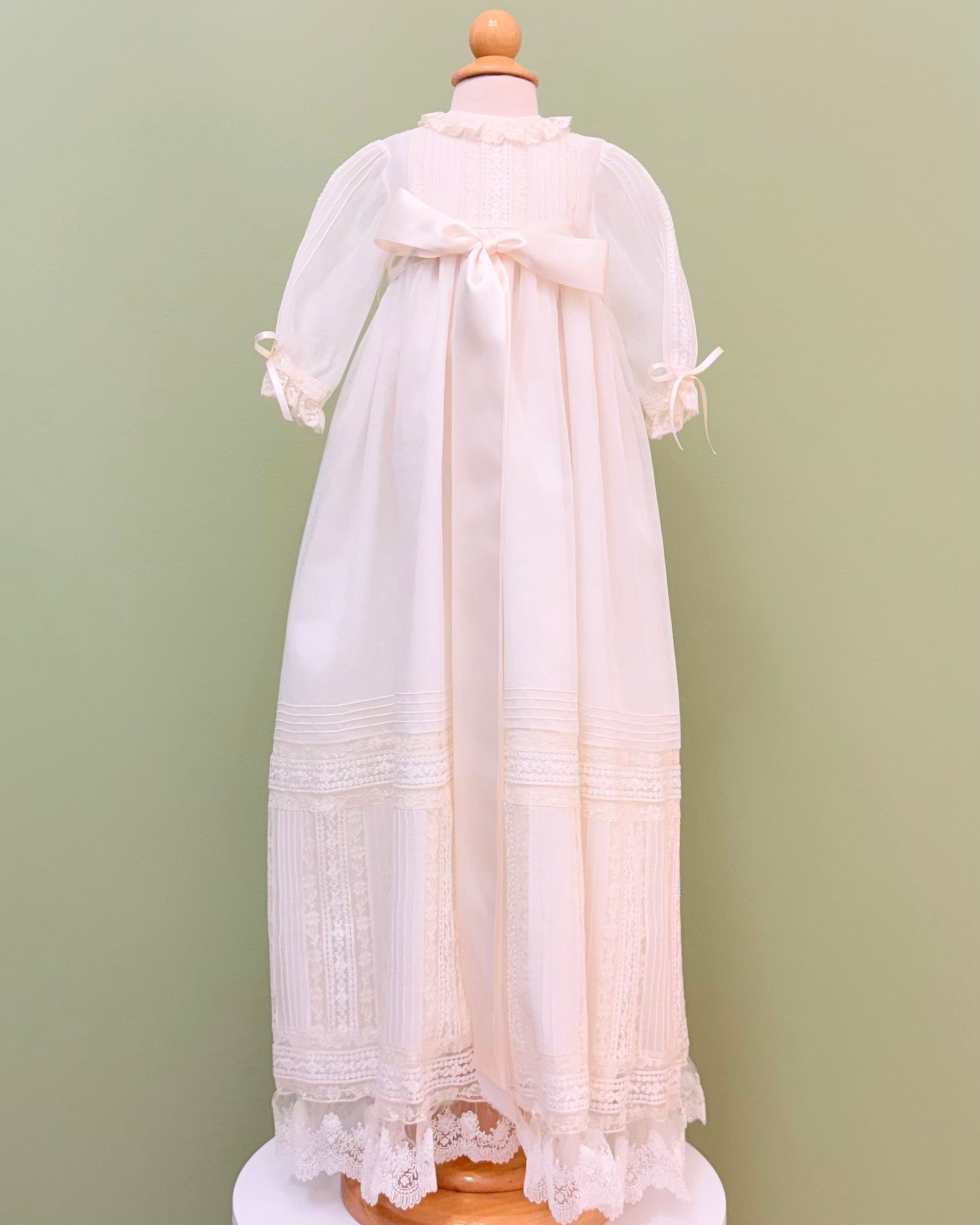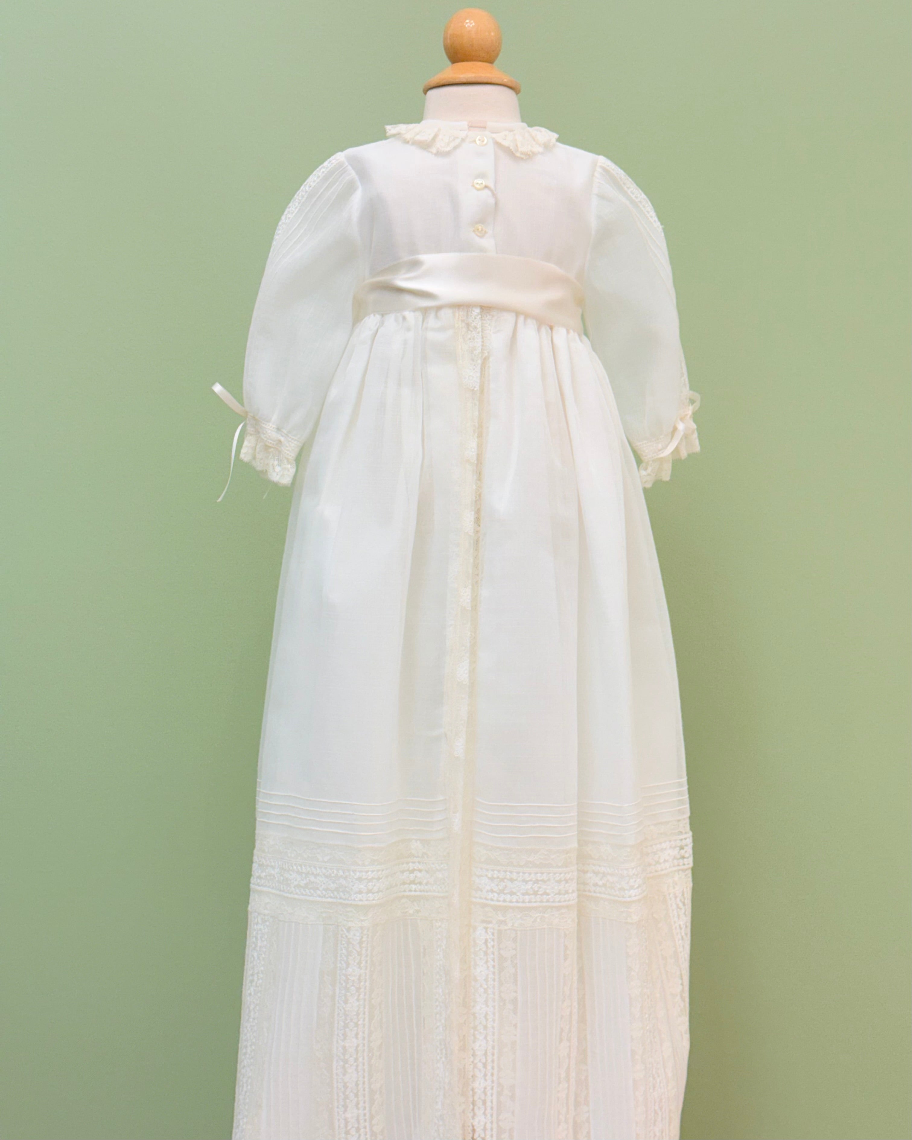 A beautiful christening gown for babies made with ivory Muslin, very fresh and delicate. It has gorgeous lace throughout. The gown has buttons on the back for closure.