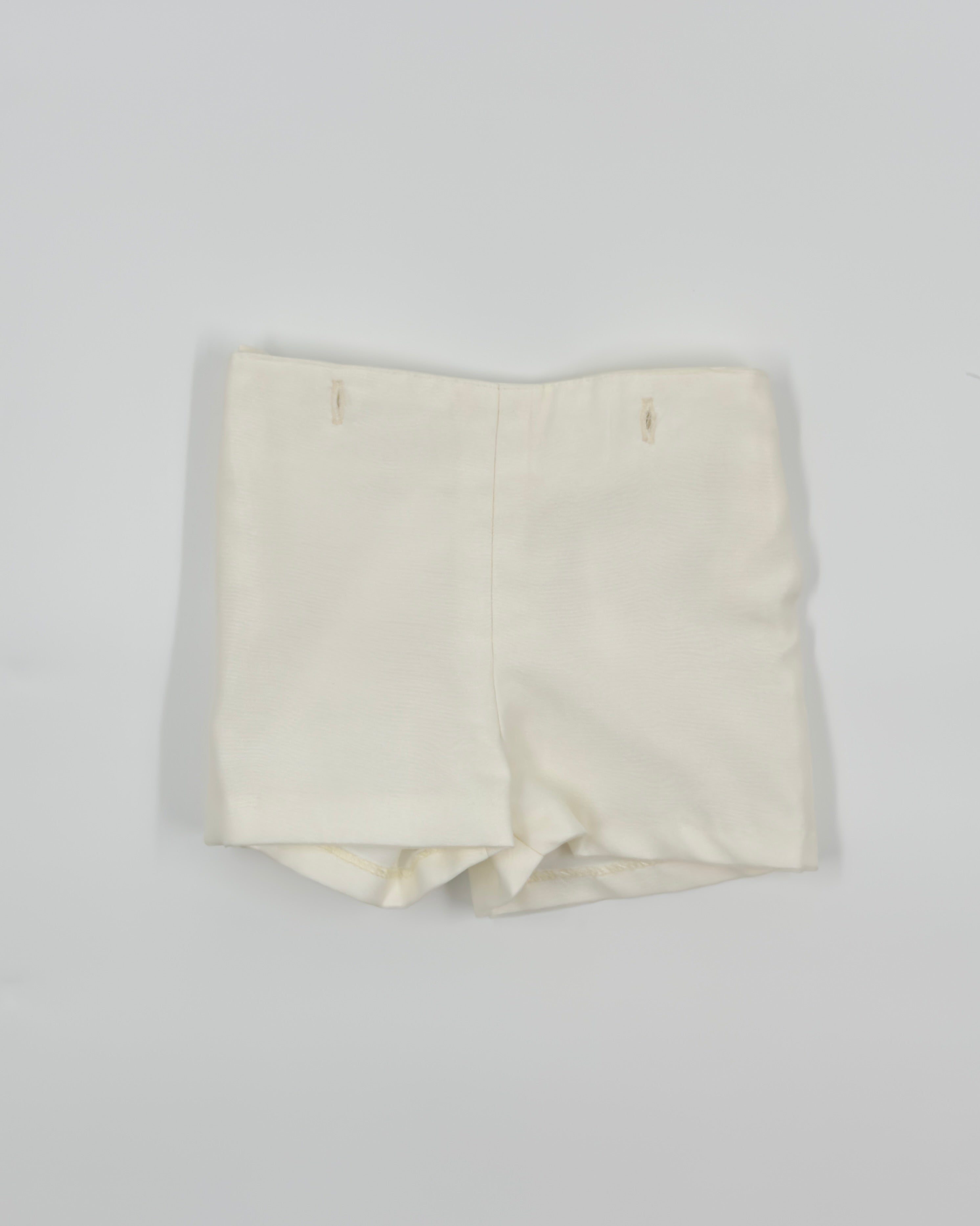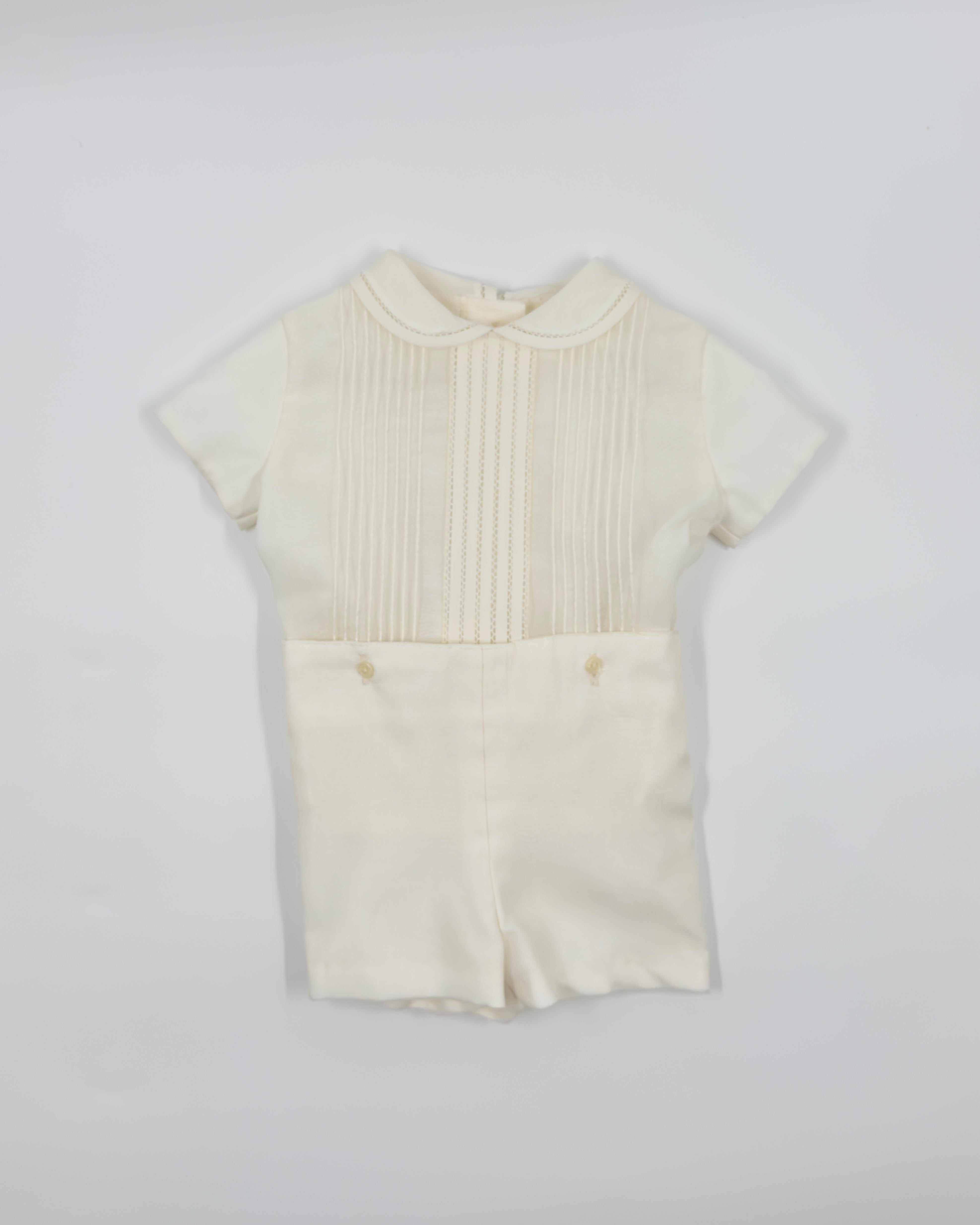 The Diego outfit is a sophisticated two-piece set for baby boys, designed with timeless elegance for special occasions. The shirt features a classic Peter Pan collar and a vertical Punto París detail on the front, adding a refined and delicate touch. Crafted with an off-white organza overlay and soft batiste lining, it offers a lightweight and elegant feel. The shirt fastens with buttons along the back and pairs perfectly with tailored straight shorts for a polished, traditional look—ideal for christenings, weddings, and formal celebrations.