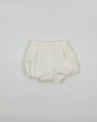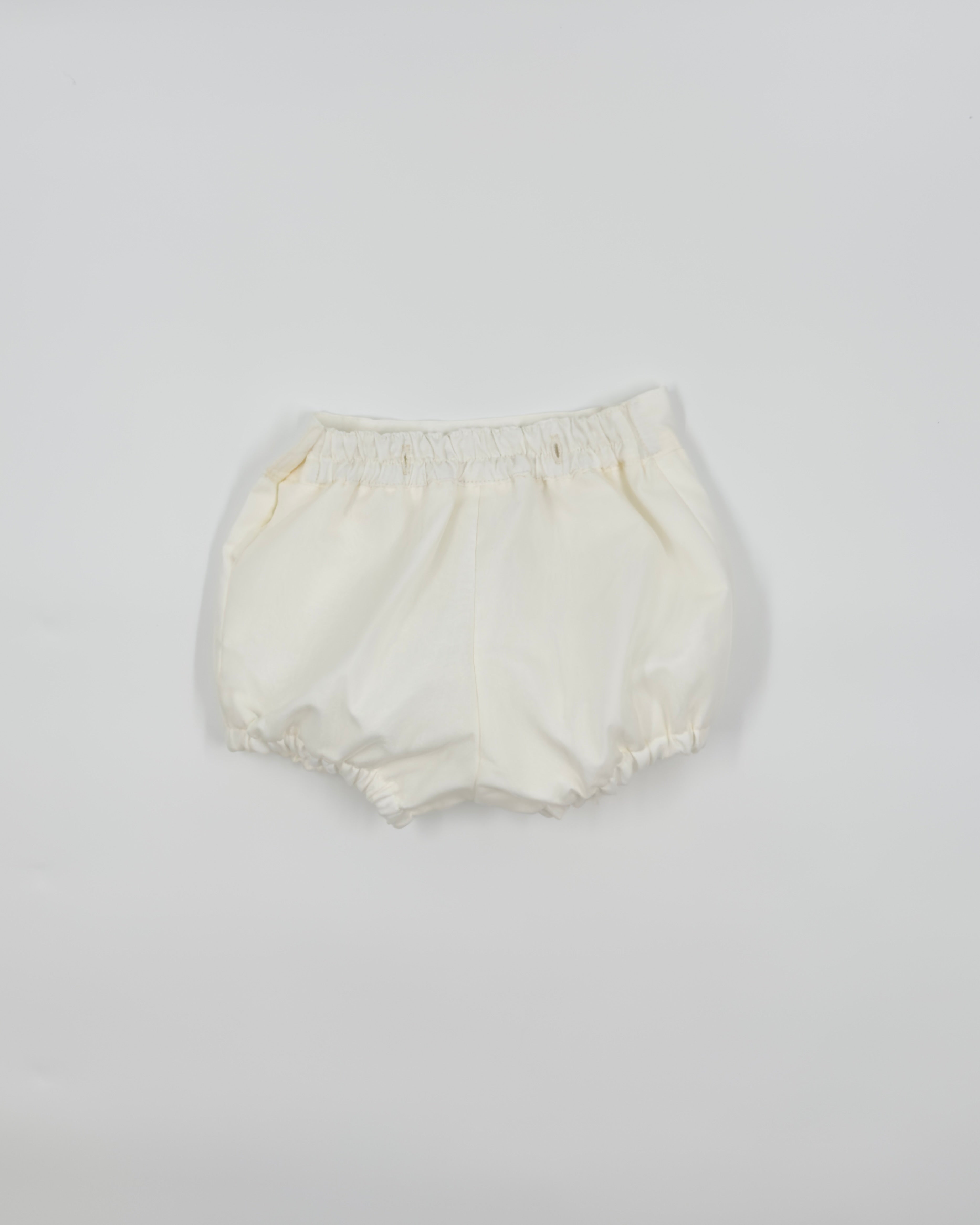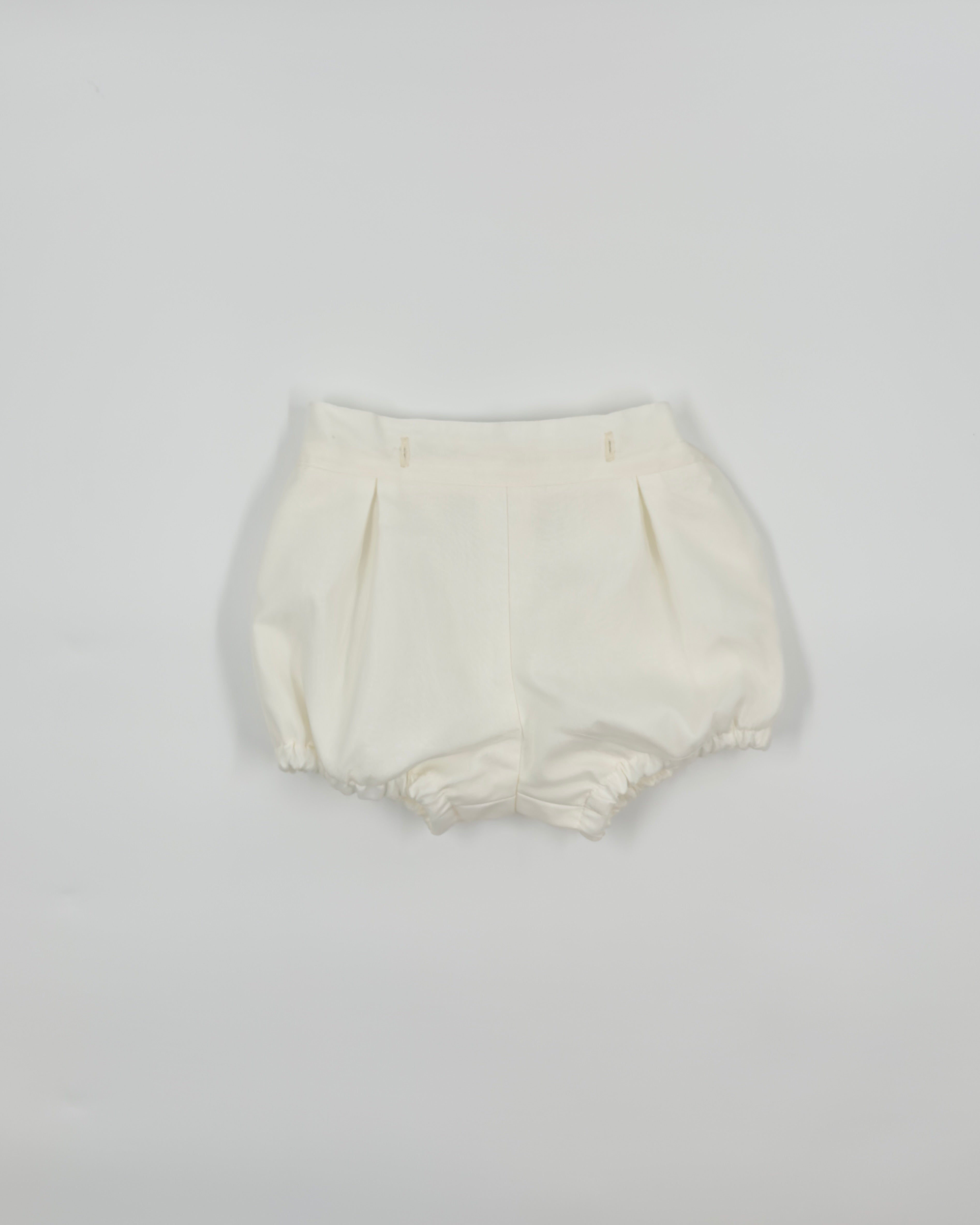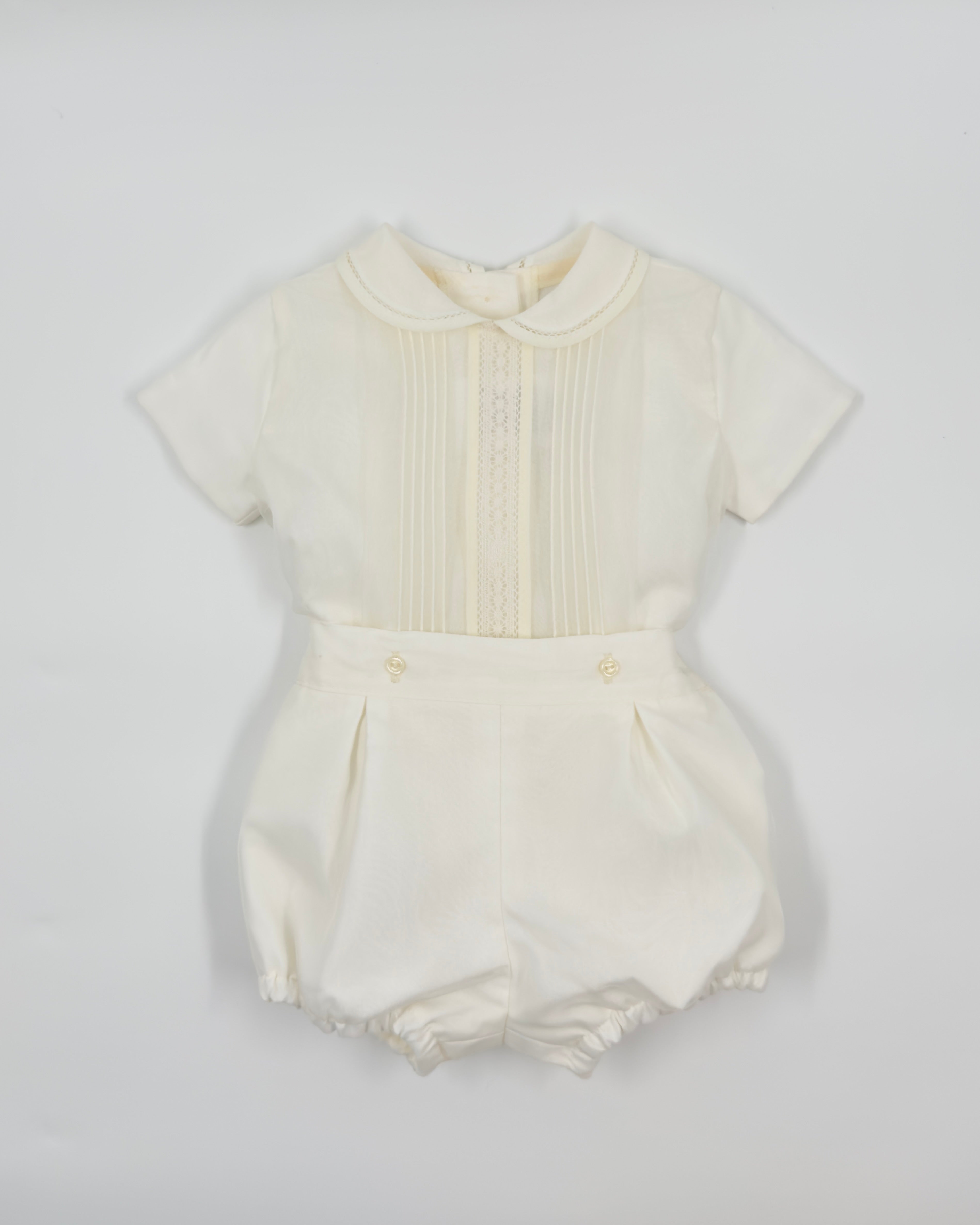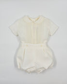 The Felipe outfit is a beautifully designed two-piece set for baby boys, perfect for christenings, weddings, and other special celebrations. The top is crafted from delicate off-white organza and features a classic Peter Pan collar, short sleeves, handmade pleats, and a striking geometric lace panel down the front. It fastens at the back with small buttons for a traditional finish. The matching bubble shorts include side button closures and a soft elastic waistband at the back for comfort. Fully lined in breathable cotton, Felipe offers timeless elegance with a baby-friendly fit.