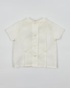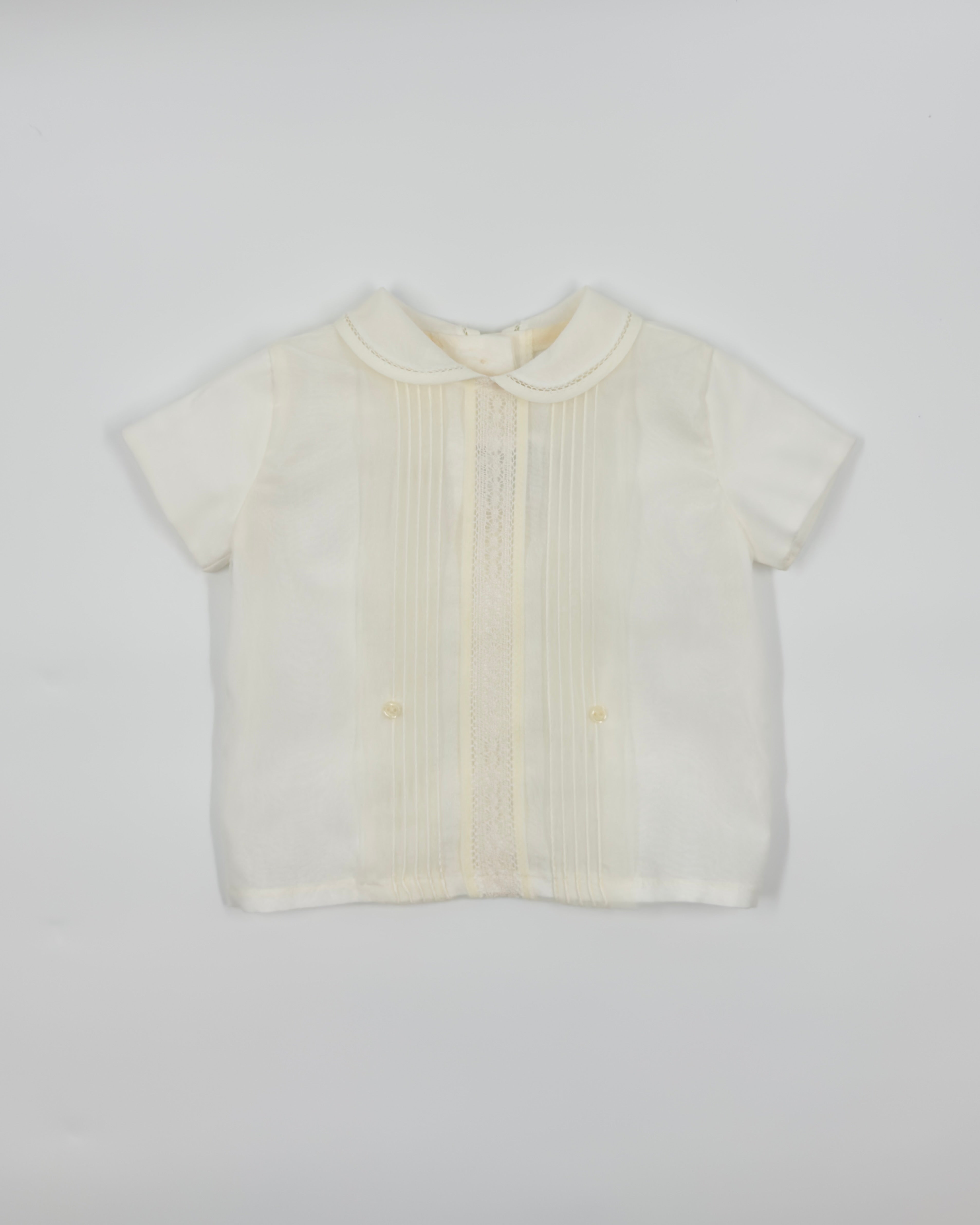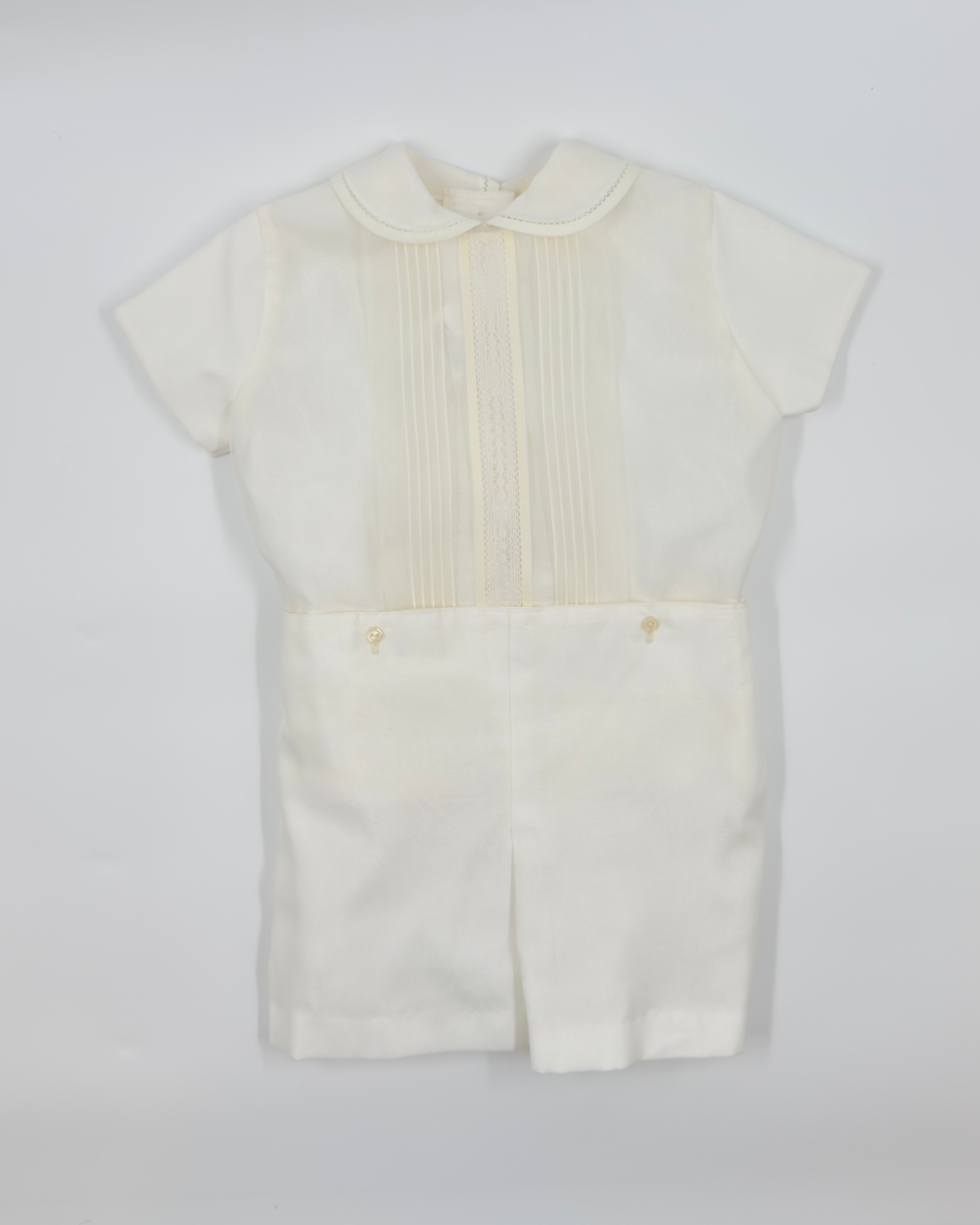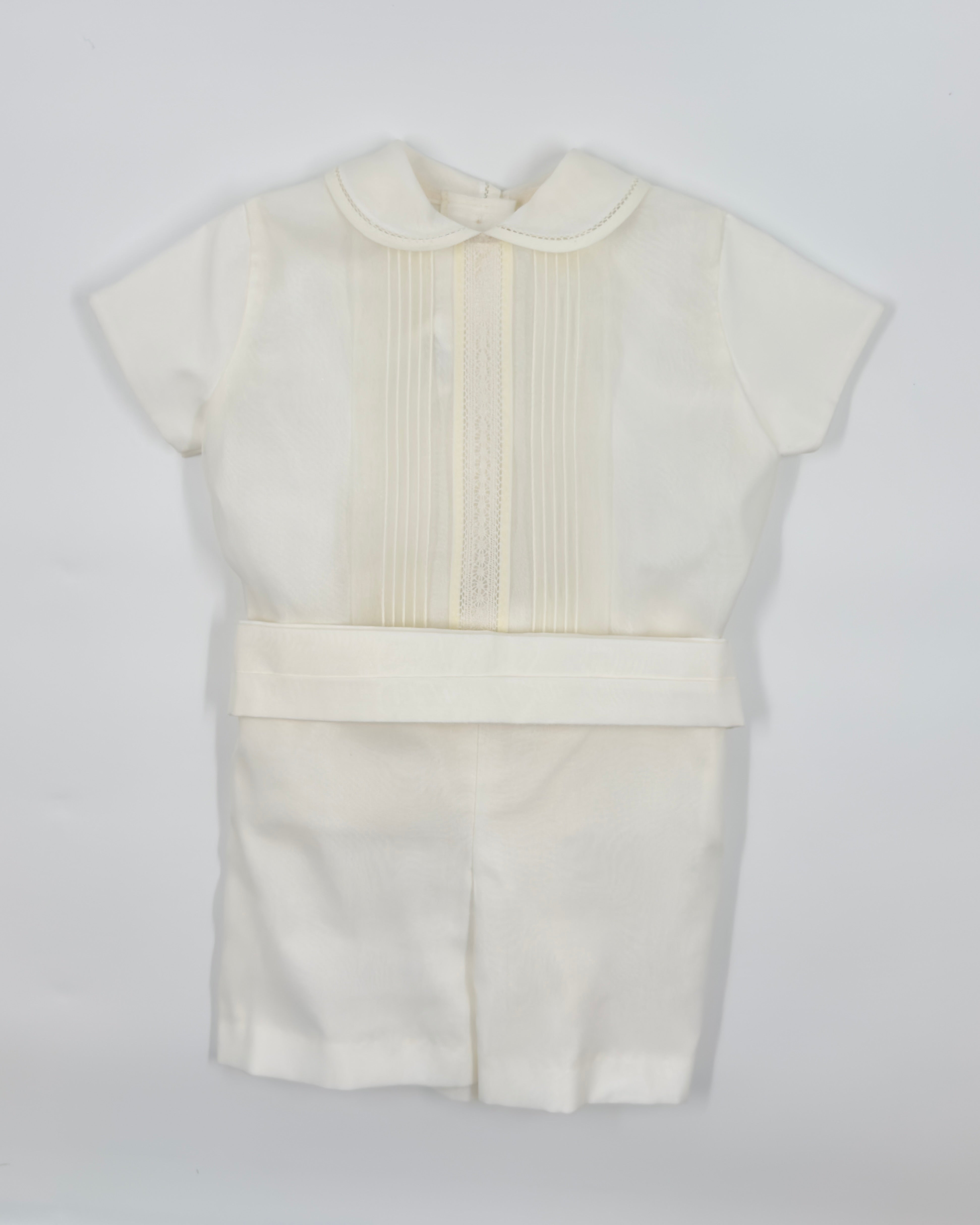 The Felipe outfit is a refined two-piece set for baby boys, ideal for special occasions such as christenings, weddings, and formal events. Made from elegant off-white organza and fully lined with soft cotton, the top features a classic Peter Pan collar, short sleeves, and delicate handmade pleats. The back button closure adds a timeless touch. The coordinating shorts are finished with a triple-pleated sash, side button closures, and a comfortable elastic waistband at the back—offering a polished look with baby-friendly comfort.