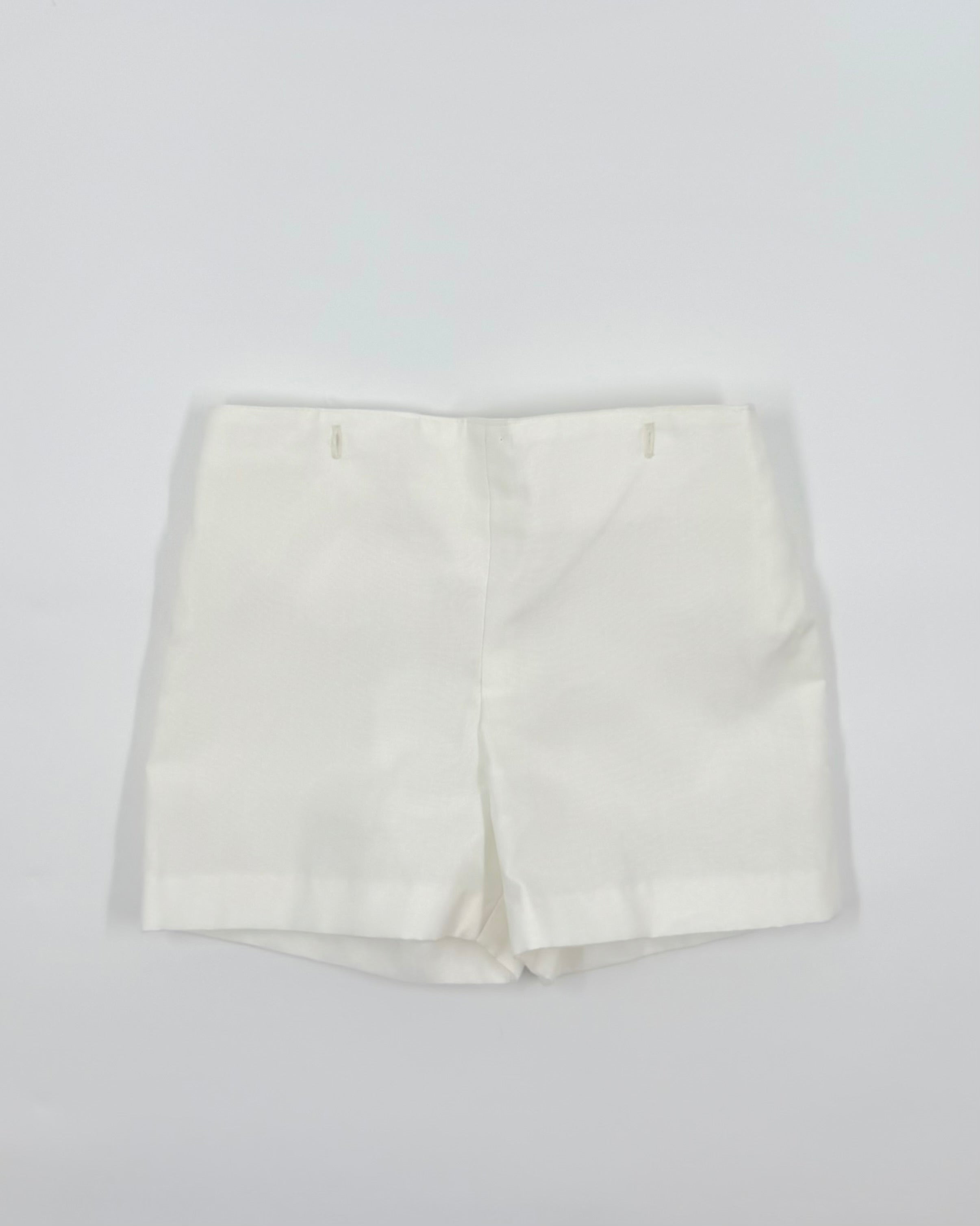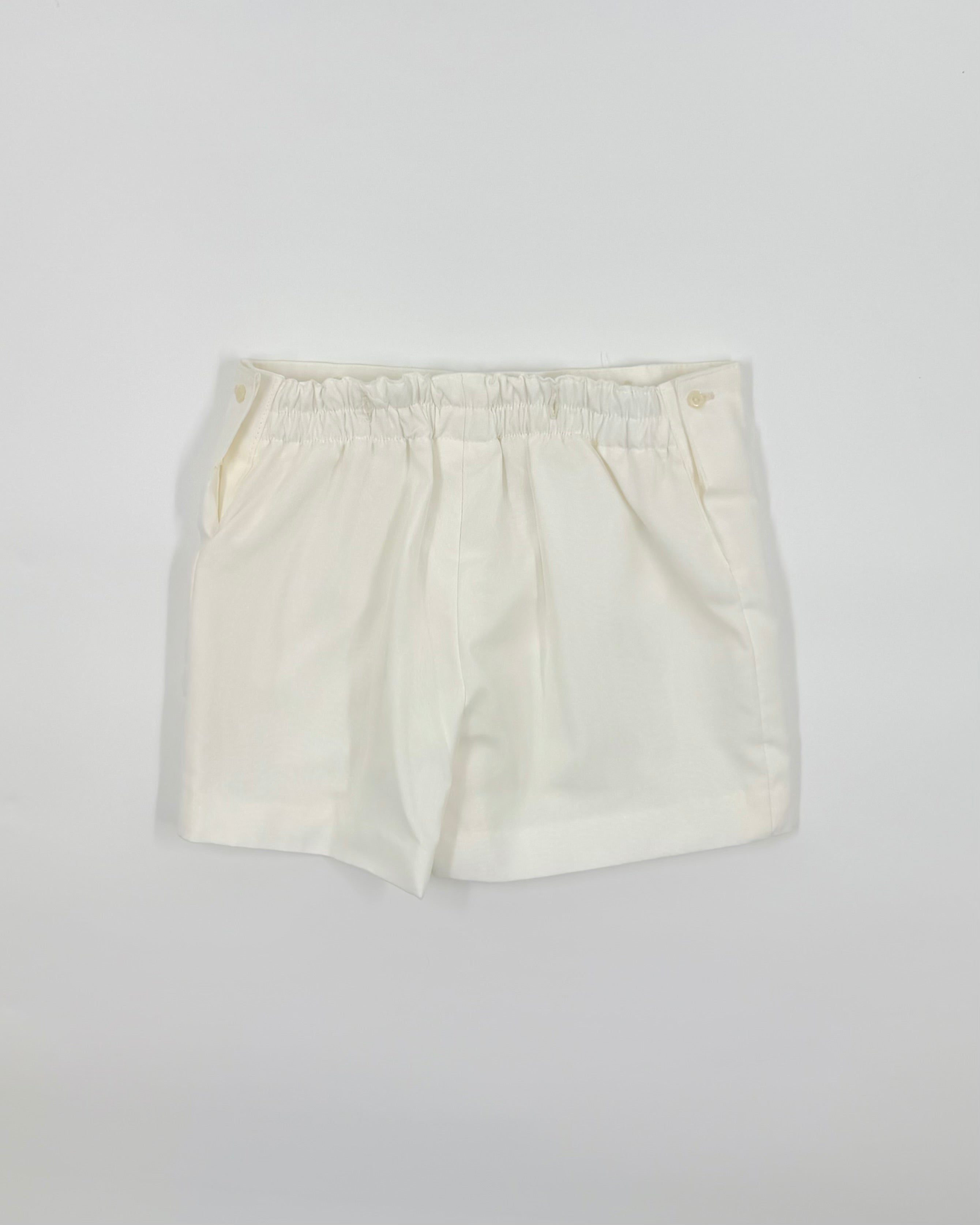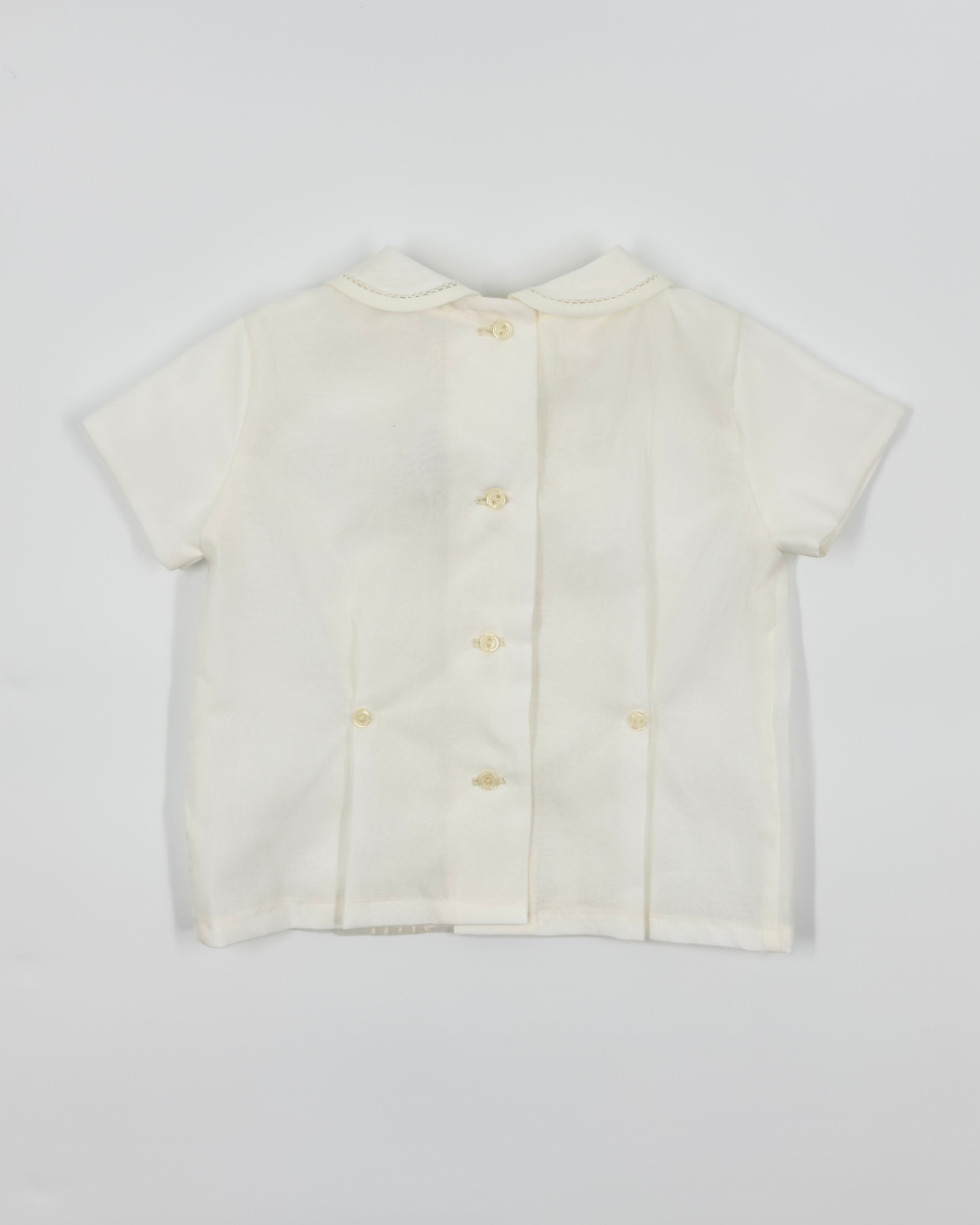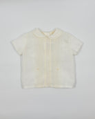 The Felipe outfit is a refined two-piece set for baby boys, ideal for special occasions such as christenings, weddings, and formal events. Made from elegant off-white organza and fully lined with soft cotton, the top features a classic Peter Pan collar, short sleeves, and delicate handmade pleats. The back button closure adds a timeless touch. The coordinating shorts are finished with a triple-pleated sash, side button closures, and a comfortable elastic waistband at the back—offering a polished look with baby-friendly comfort.