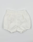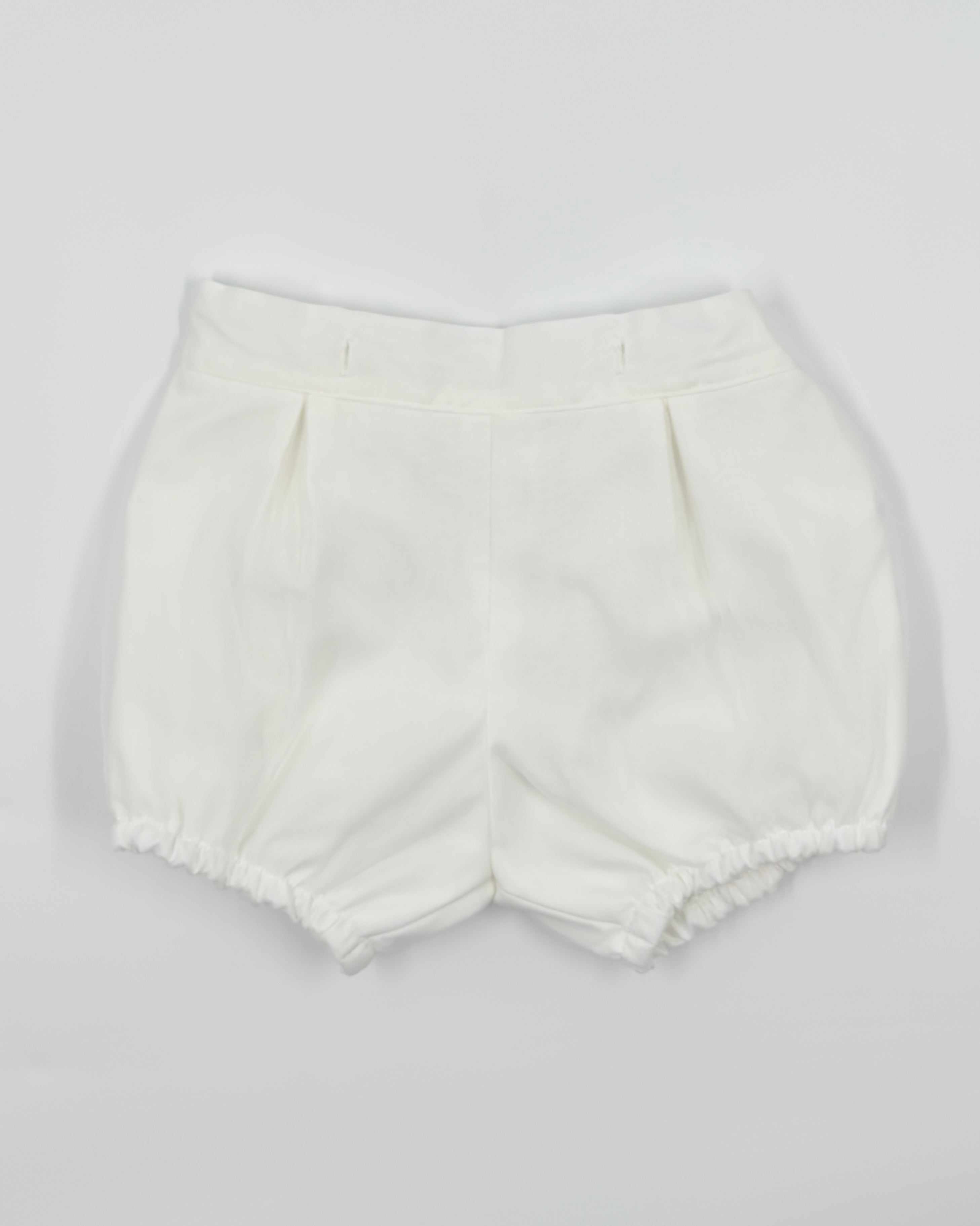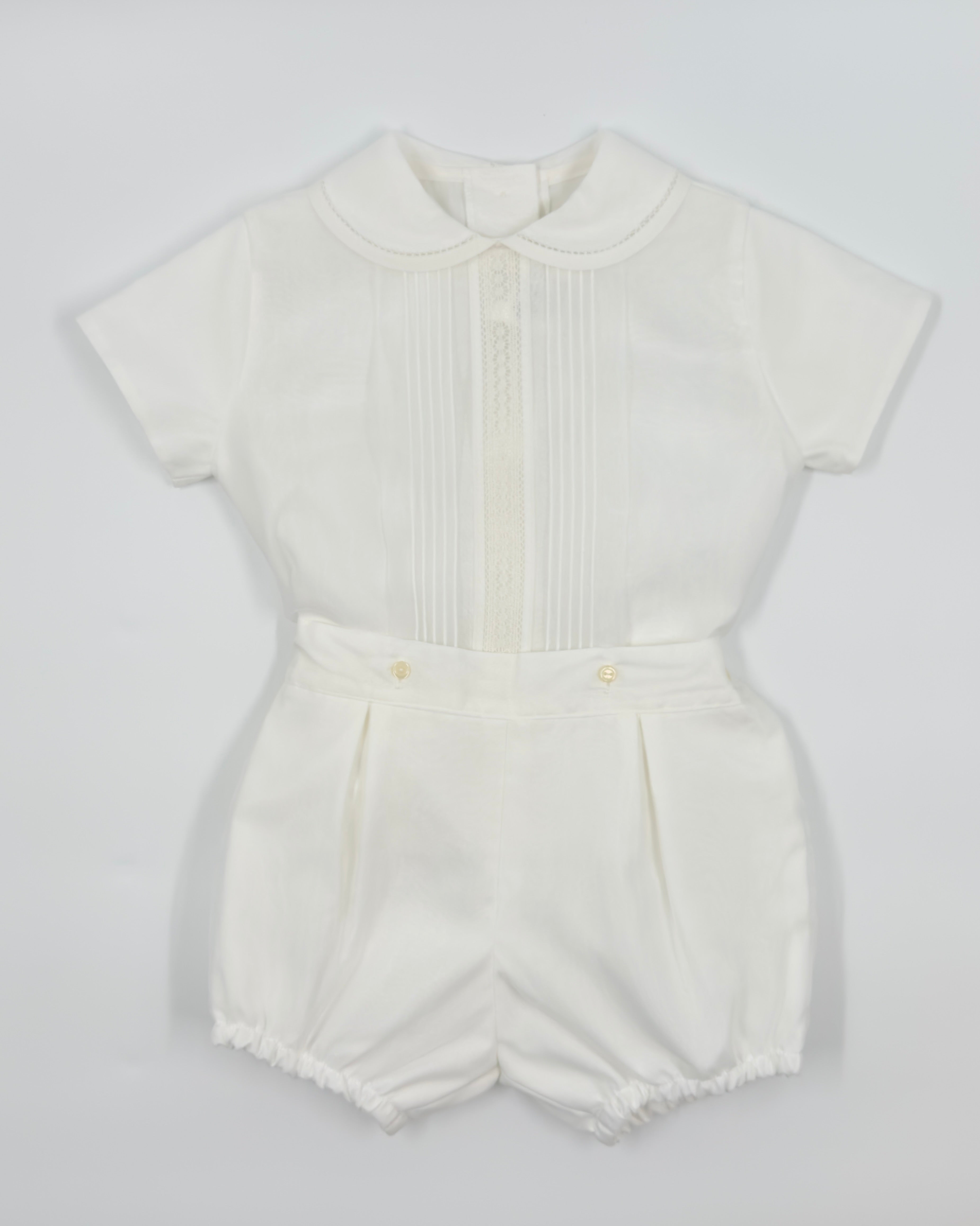 The Felipe outfit is a beautifully crafted two-piece set for baby boys, perfect for special occasions such as christenings, weddings, or formal celebrations. The top is made of white organza and features a classic Peter Pan collar, short sleeves, handmade pleats, and a striking geometric lace panel on the front. It fastens with buttons along the back for a traditional touch. The coordinating bubble shorts include side button closures and a soft elastic waistband at the back for comfort. Fully lined in breathable cotton, Felipe blends timeless elegance with baby-friendly ease.