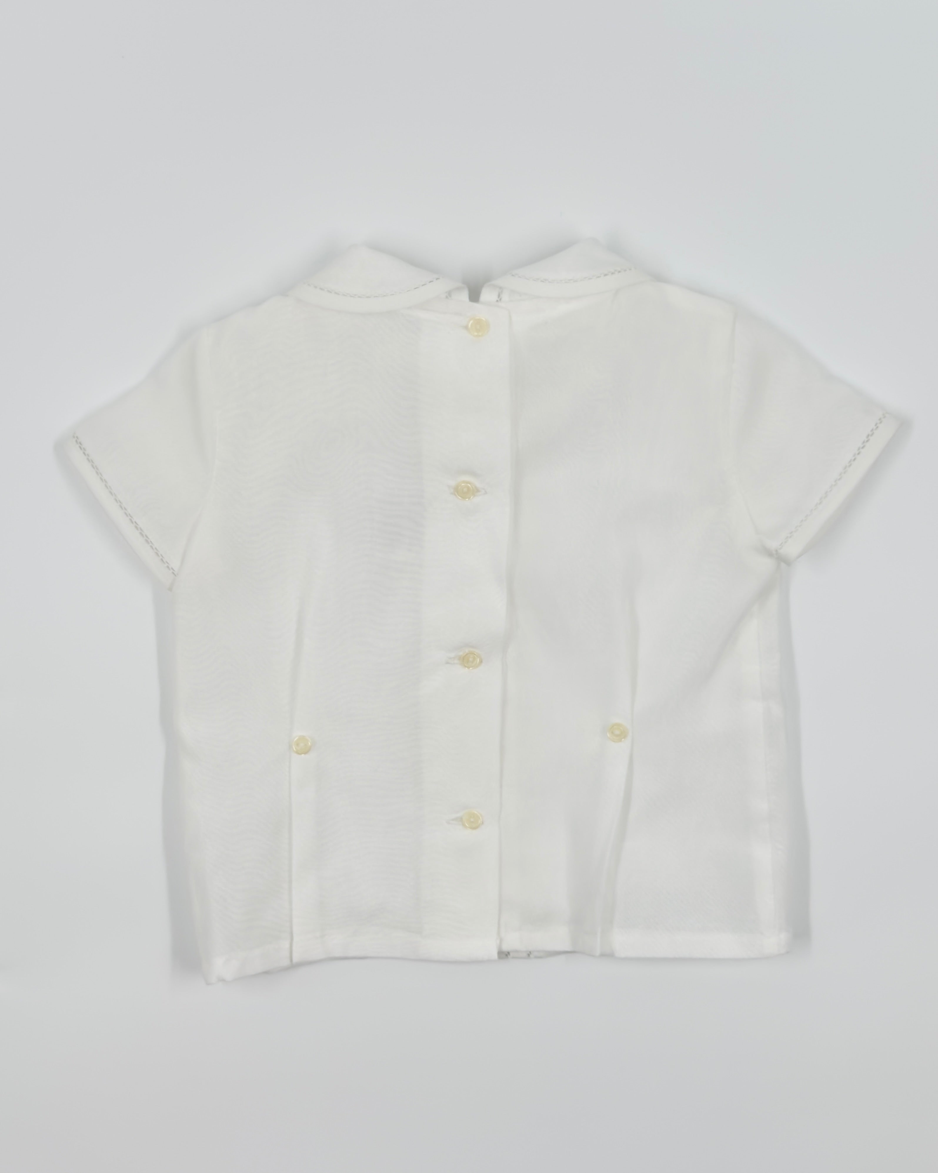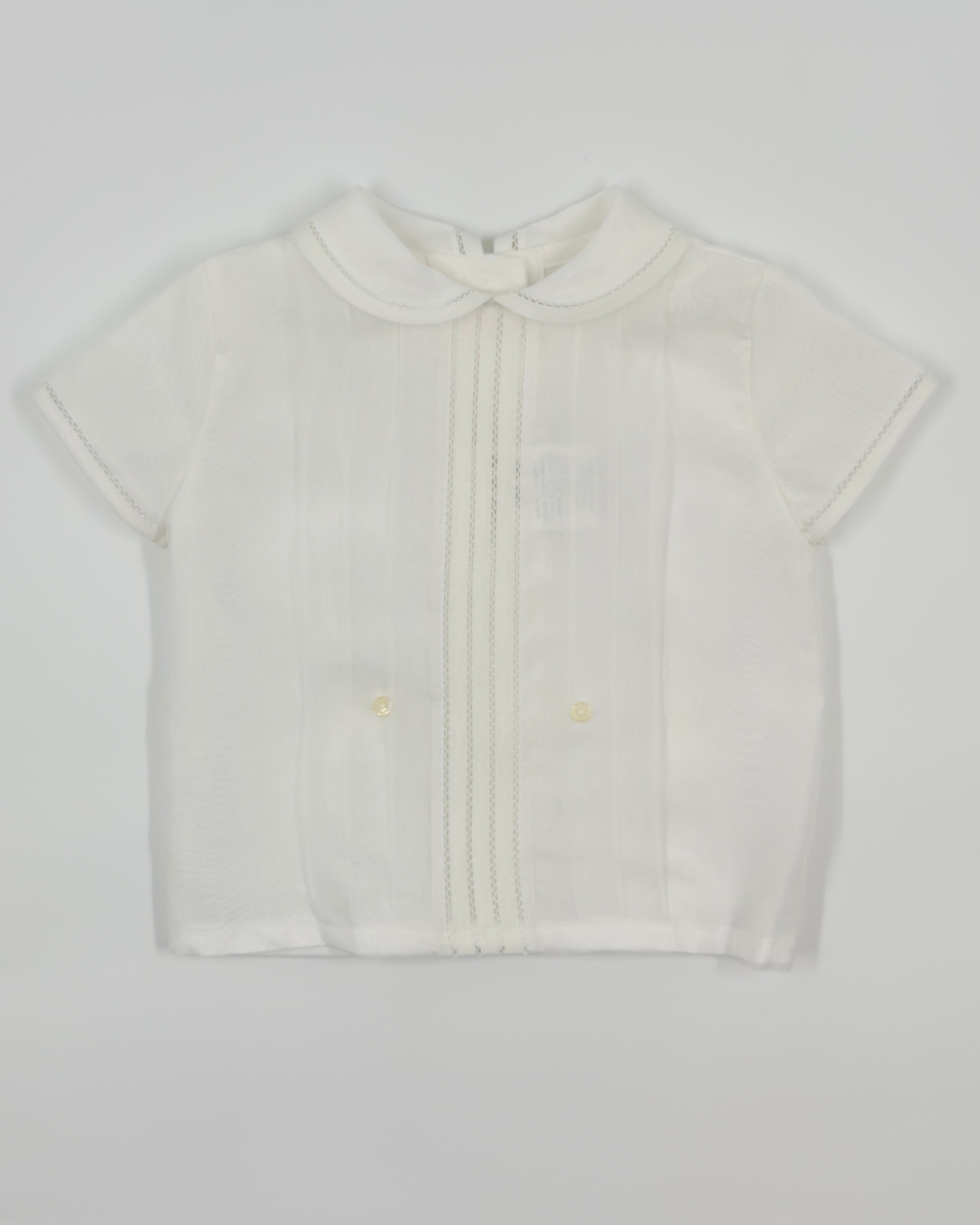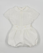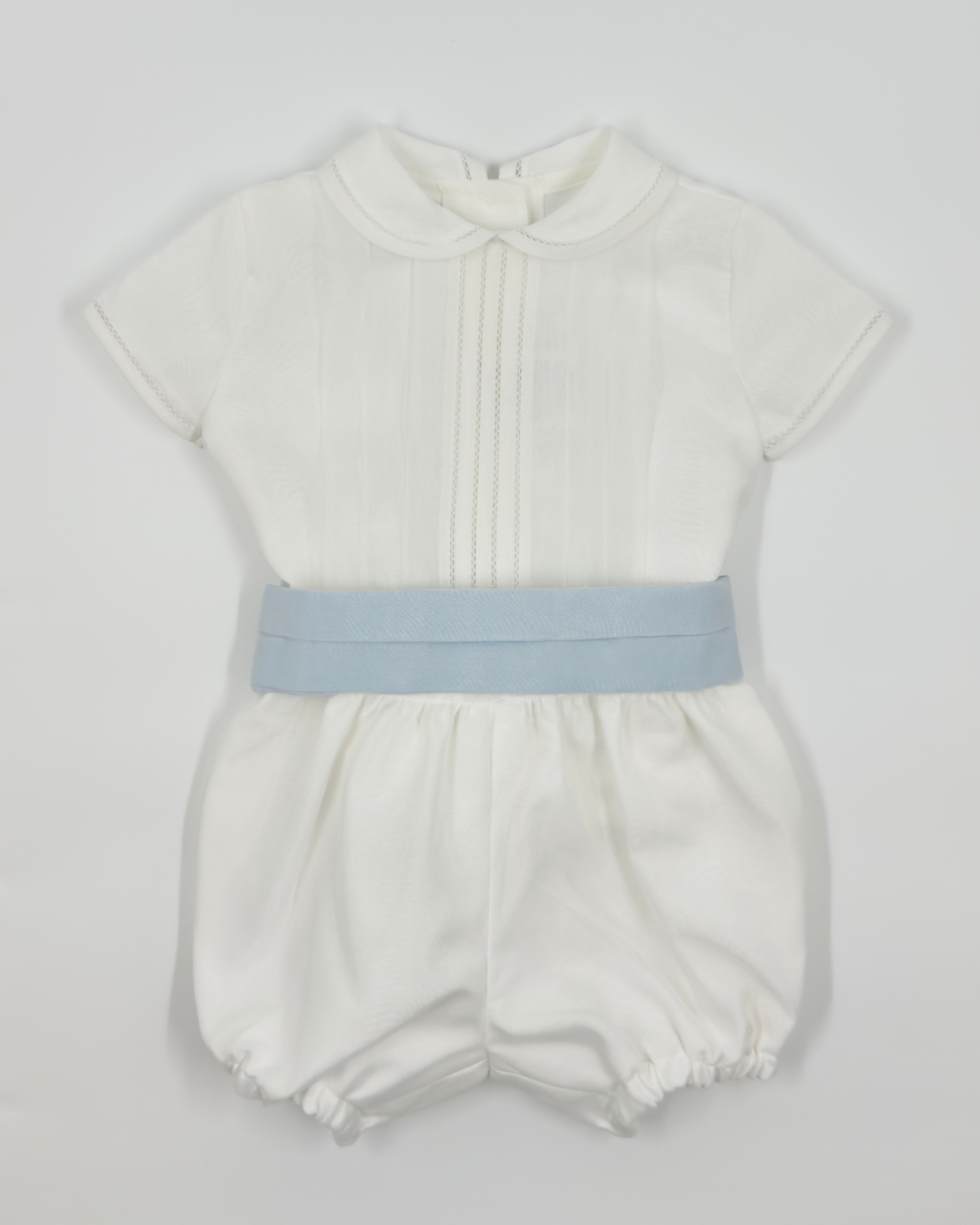 The Luciano outfit is a graceful and timeless two-piece set for baby boys, perfect for christenings, weddings, and other special occasions. The off-white organza top features short sleeves, delicate handmade pleats, and a classic Peter Pan collar, with a back button closure for a traditional finish. The matching shorts include side button detailing, a soft light blue sash with triple pleats, and an elastic waistband at the back for comfort. Fully lined in breathable cotton, Lucianooffers elegance, charm, and comfort for your little one’s most meaningful moments.