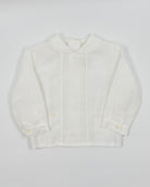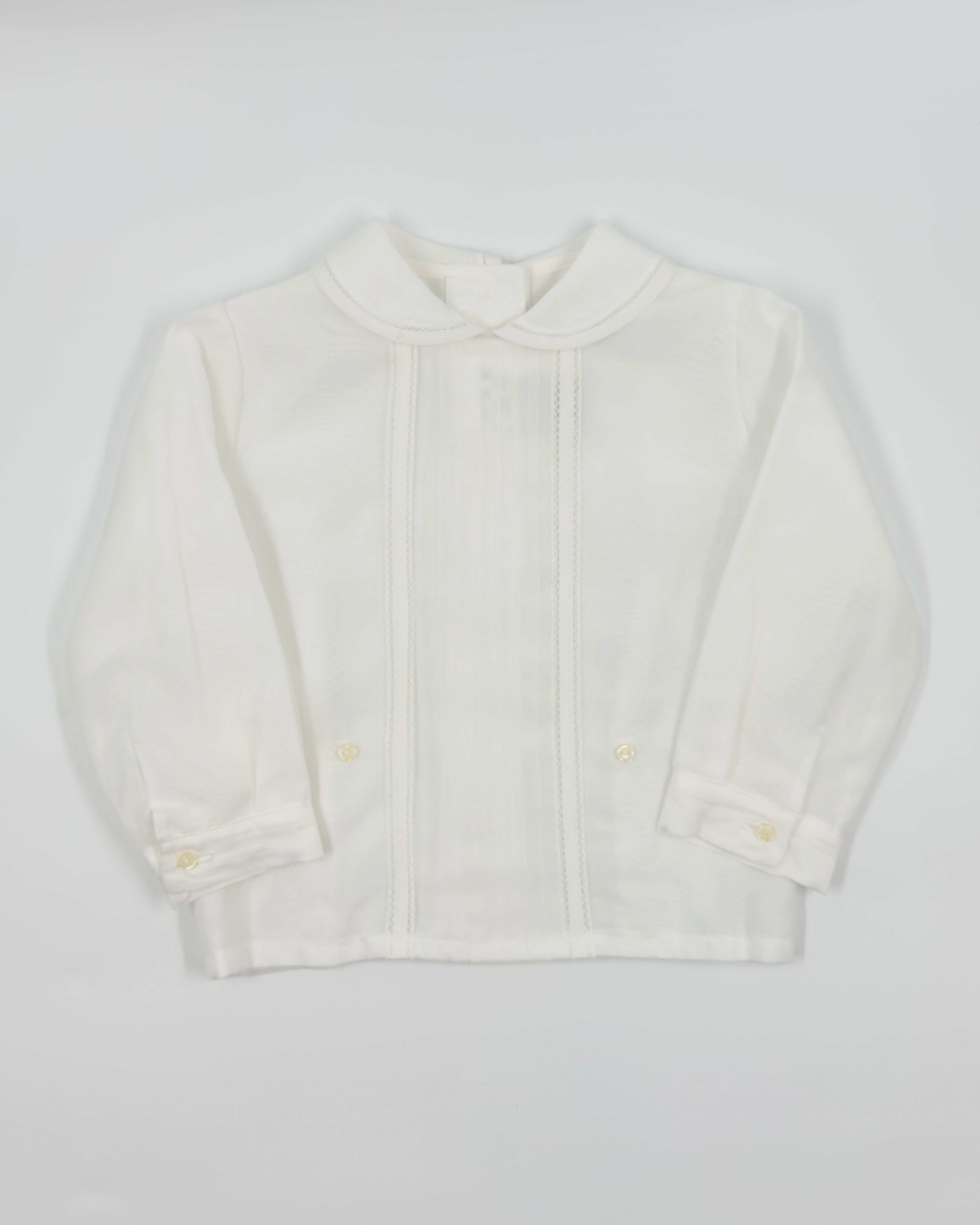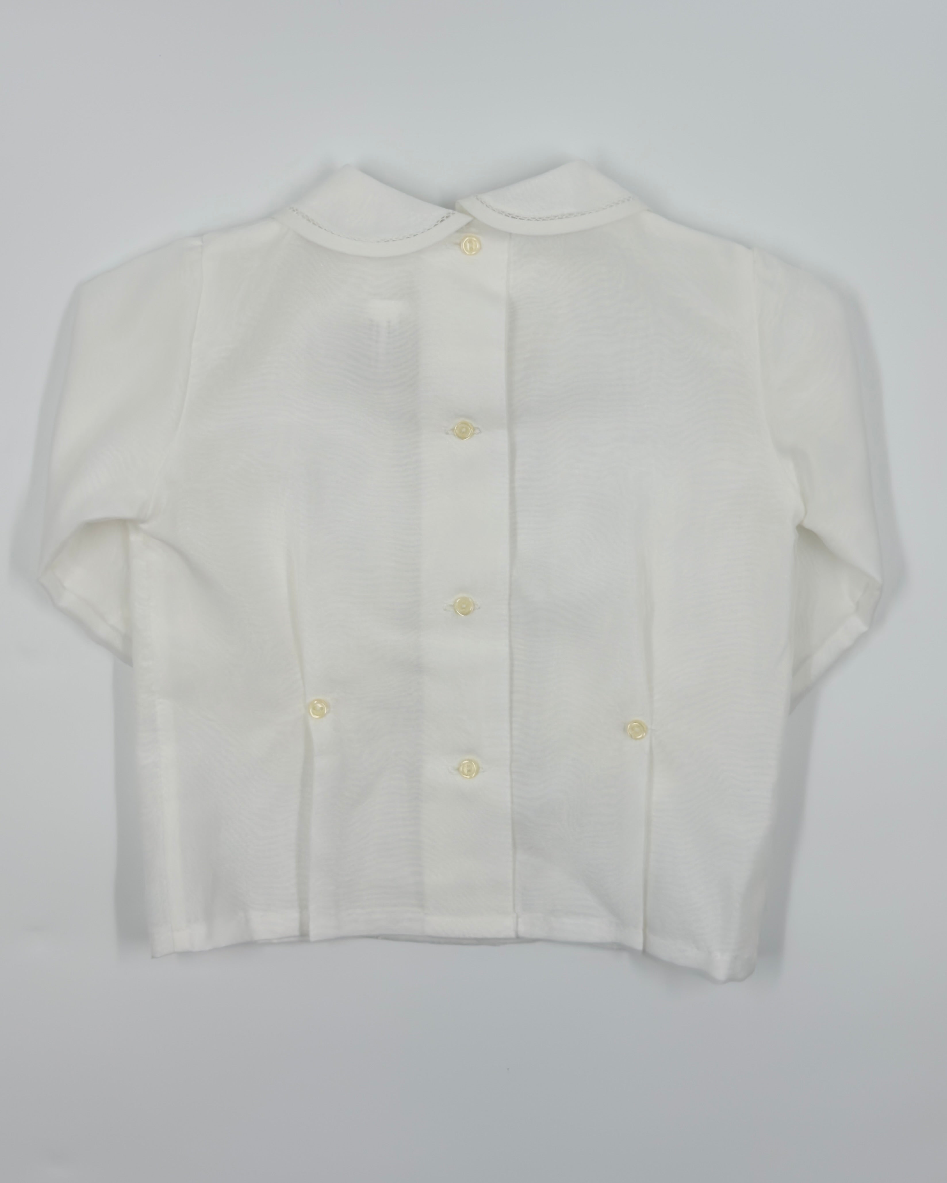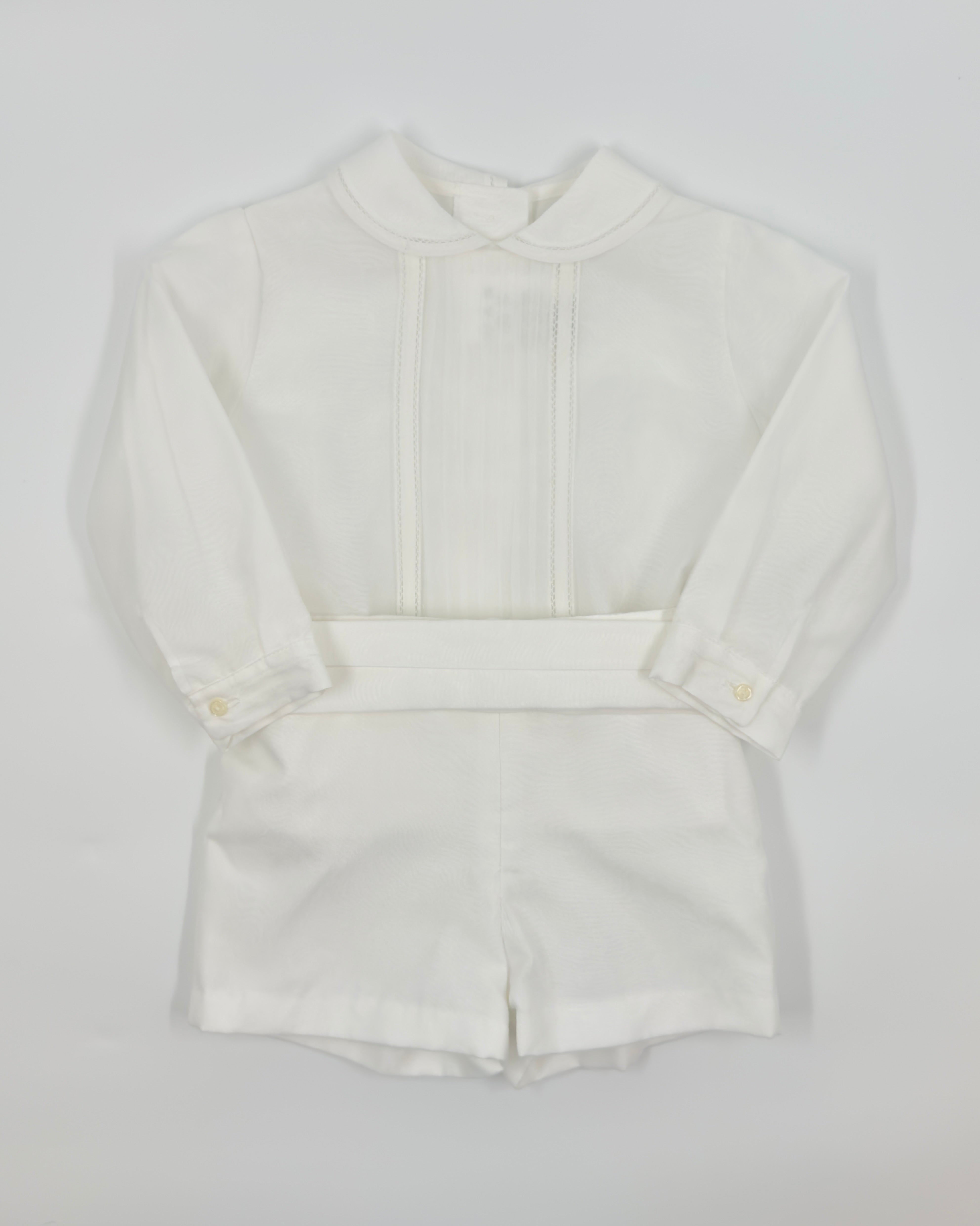 The Pau outfit is a refined two-piece set for baby boys, ideal for christenings, weddings, and other meaningful occasions. The white organza shirt features long sleeves, a classic Peter Pan collar, and delicate handmade pleats, finished with back button closure for a traditional look. The coordinating shorts include side button closures, a sash with three soft pleats, and an elastic back waistband for comfort. Fully lined in breathable cotton, Pau combines timeless elegance with baby-friendly ease.