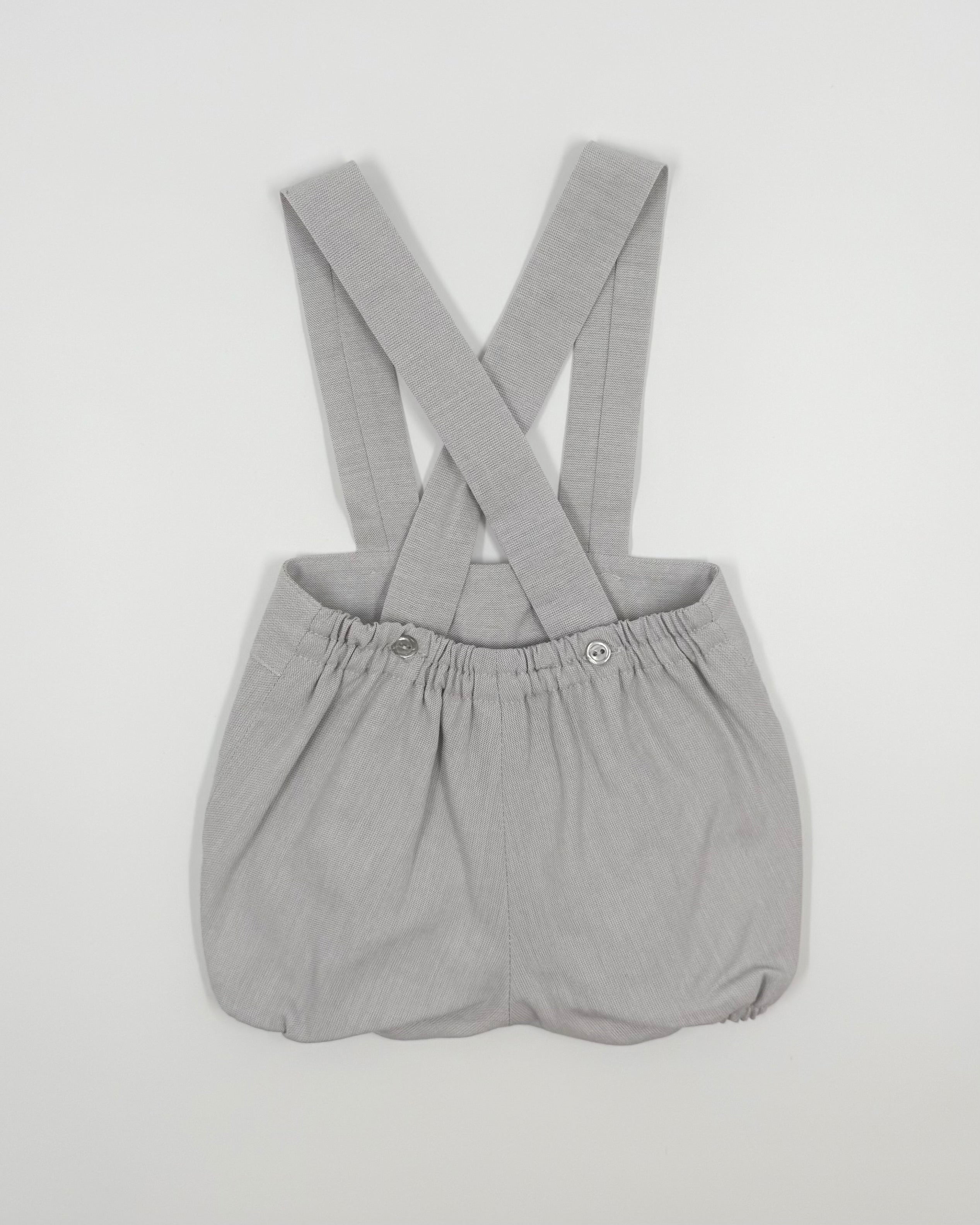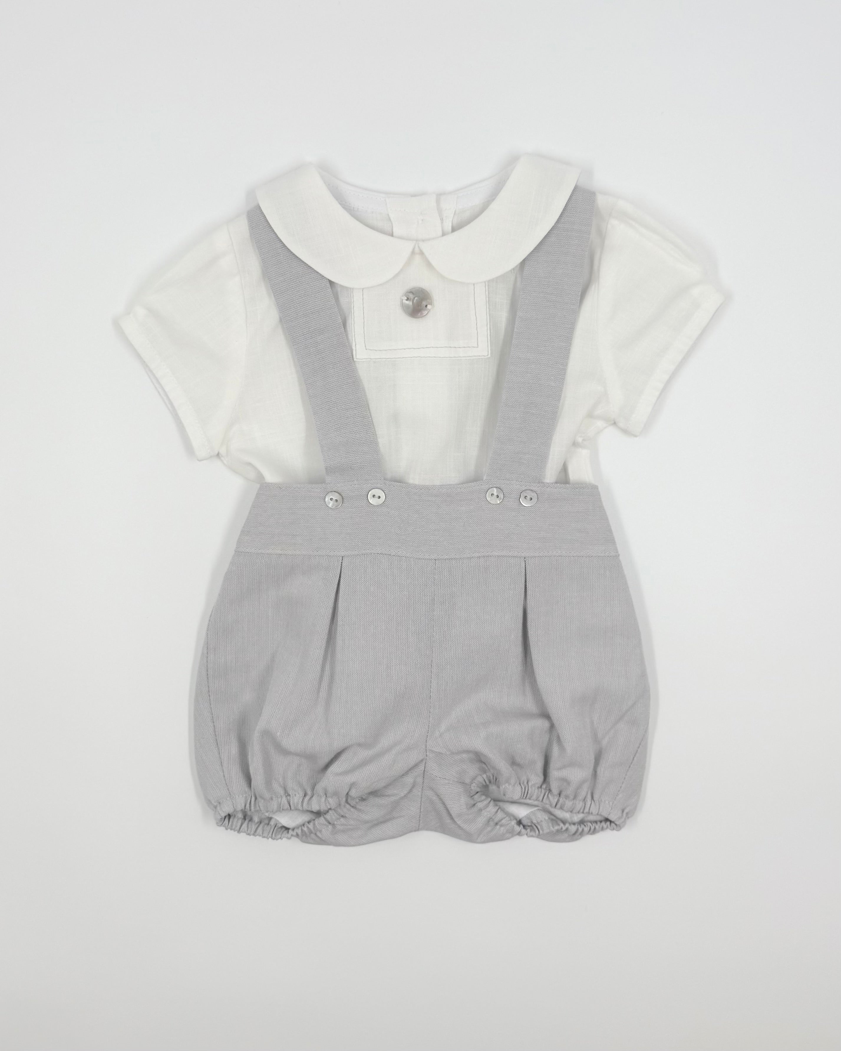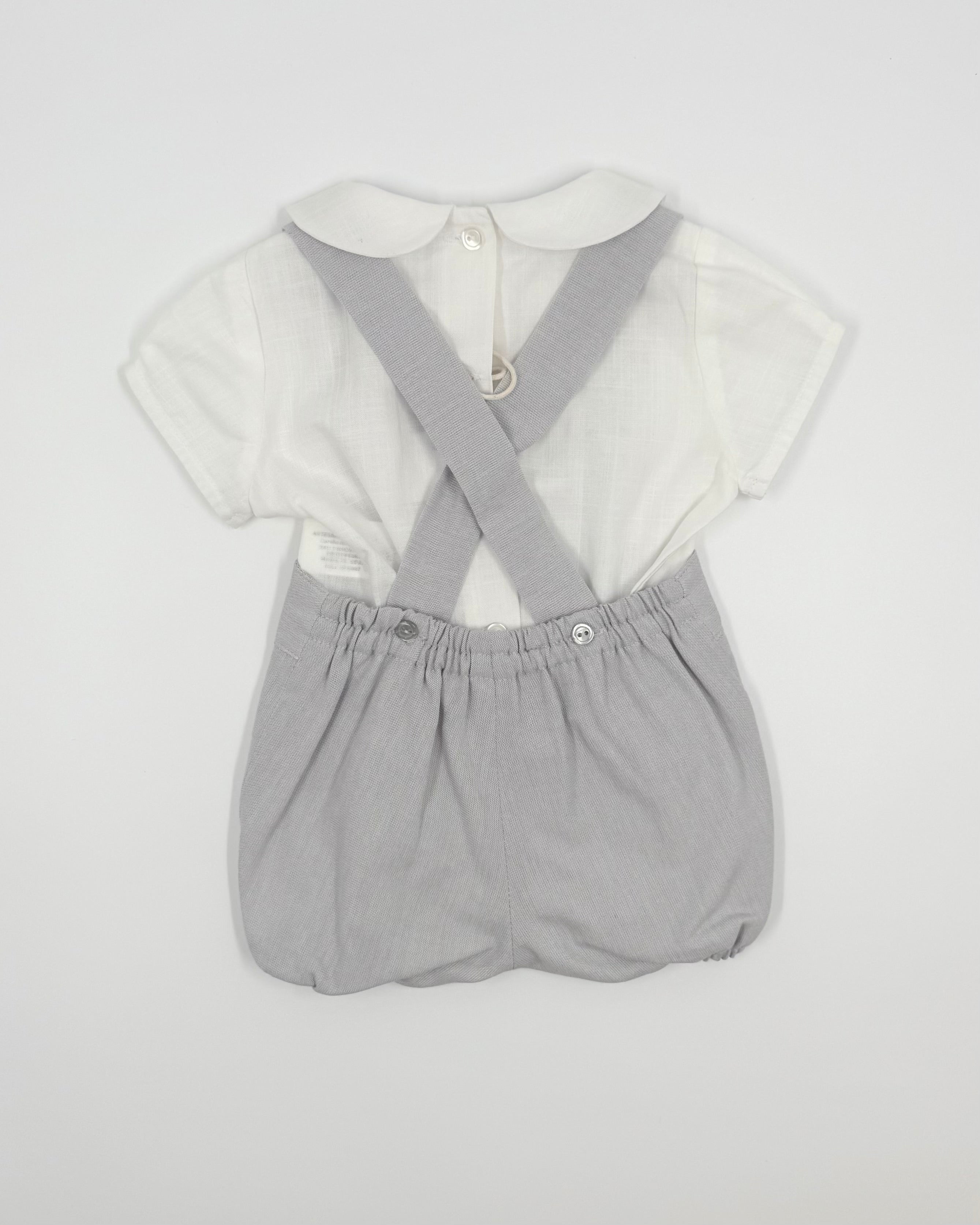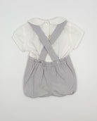 The Charlie outfit is a classic and charming two-piece set for baby boys, perfect for birthdays, photoshoots, and special moments. The crisp white batiste shirt features a sweet Peter Pan collar and back button closure for a timeless look. Paired with soft grey bubble shorts and matching suspenders, Charlie combines traditional elegance with irresistible style.