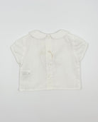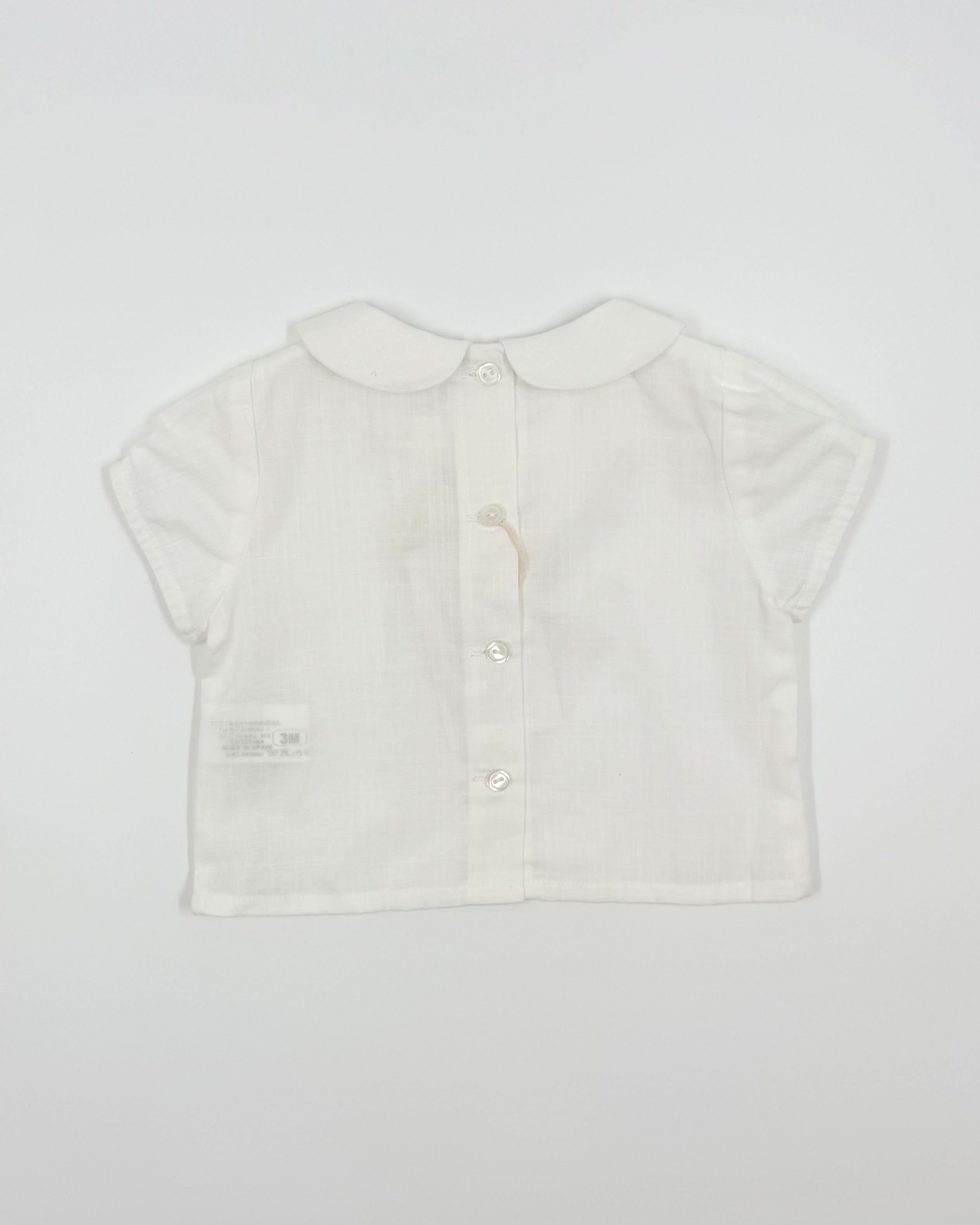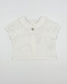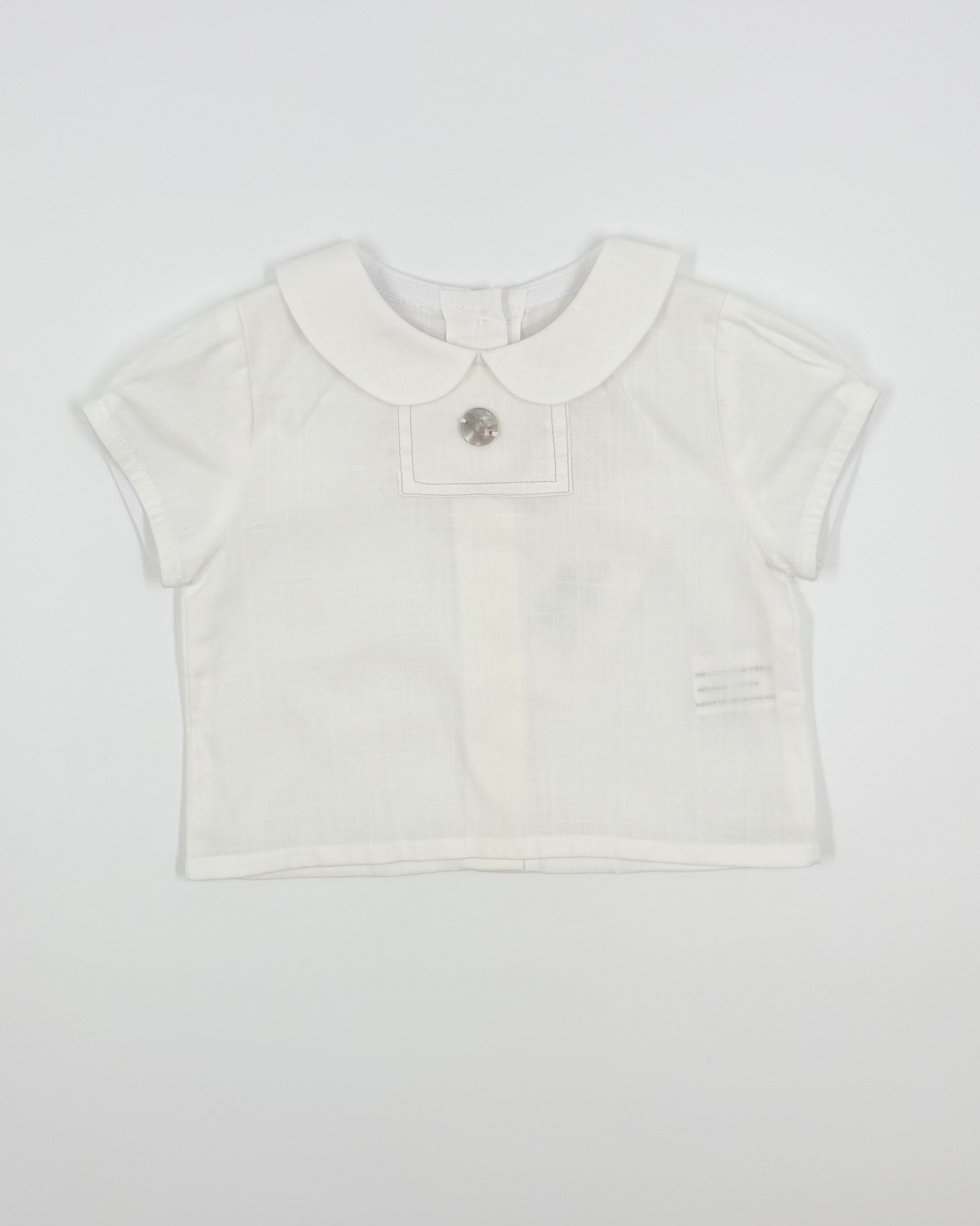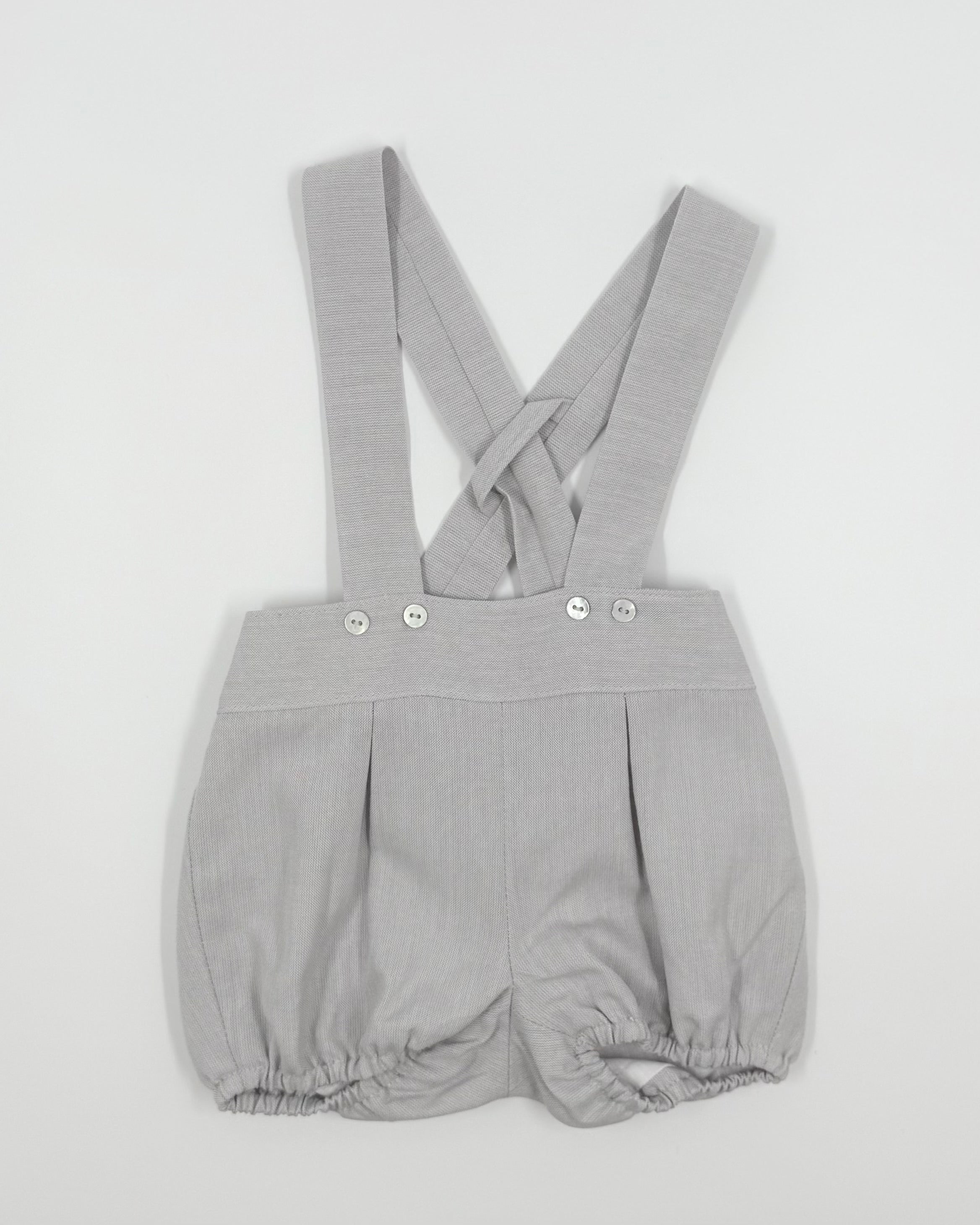 The Charlie outfit is a classic and charming two-piece set for baby boys, perfect for birthdays, photoshoots, and special moments. The crisp white batiste shirt features a sweet Peter Pan collar and back button closure for a timeless look. Paired with soft grey bubble shorts and matching suspenders, Charlie combines traditional elegance with irresistible style.