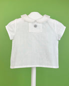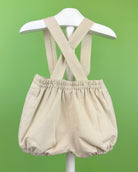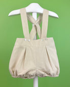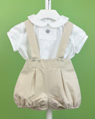 The Charlie outfit is a timeless two-piece set designed for baby boys to look their best on special days. The white batiste shirt features a classic Peter Pan collar and back button closure for a refined, traditional touch. It pairs perfectly with bubble-style shorts in a soft sand color, complete with matching suspenders for an extra dash of charm. Ideal for birthdays, photoshoots, and memorable celebrations.