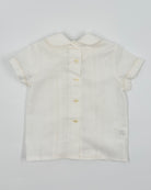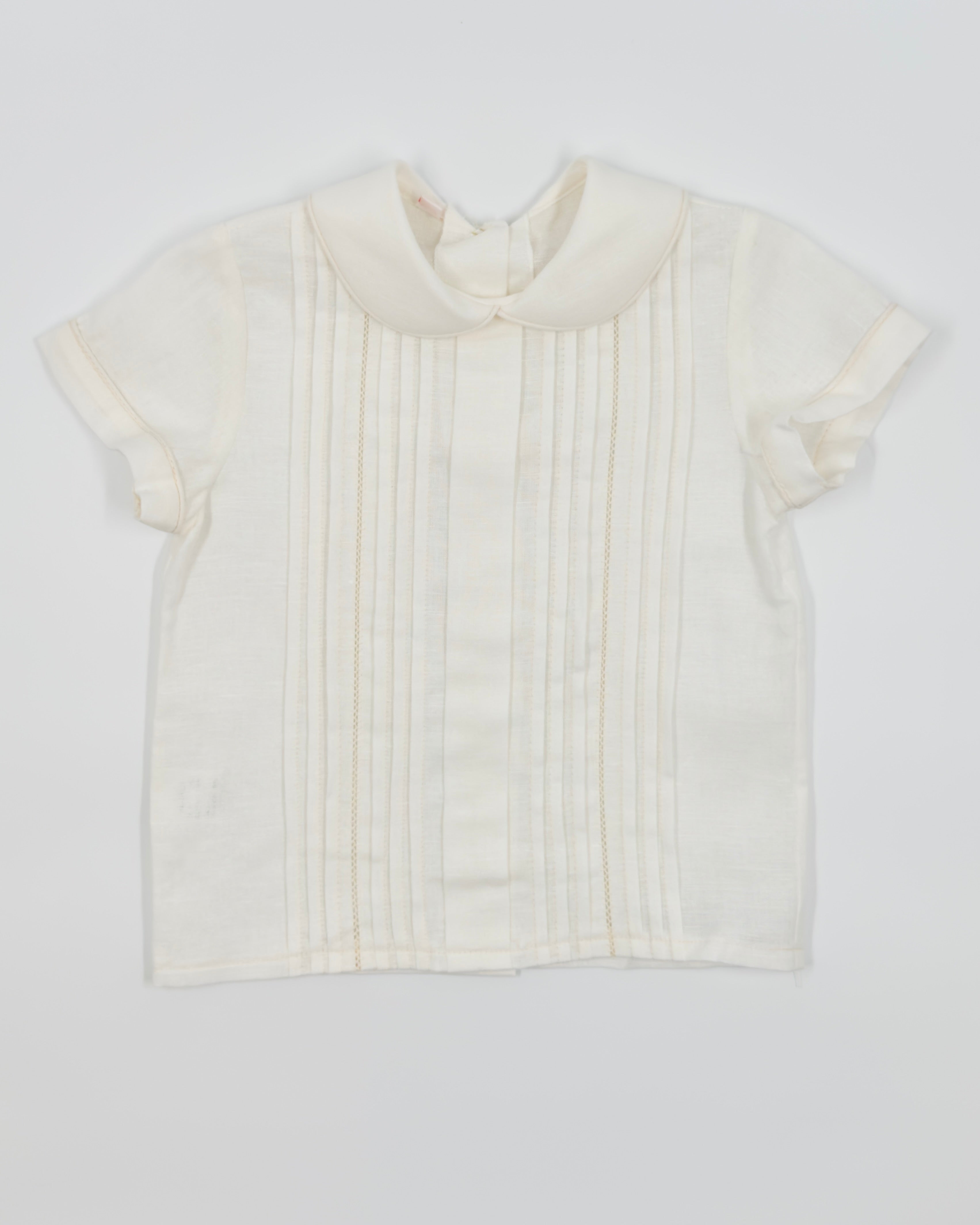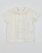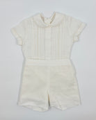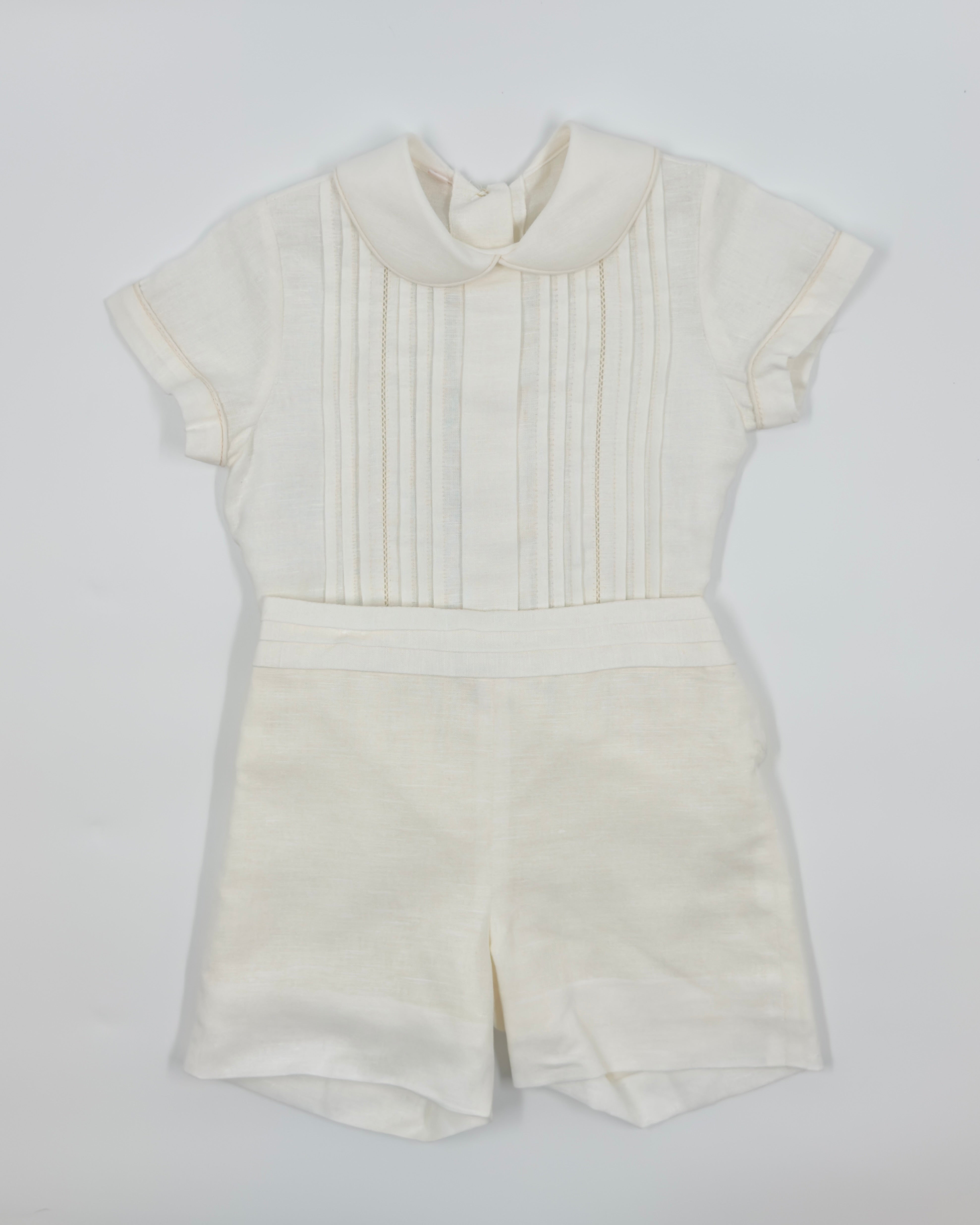The Danilo outfit is a classic two-piece set for toddler boys, perfect for formal events and meaningful celebrations. Made from soft off-white linen, the shirt features refined pleats, a delicate lace accent, and a traditional Peter Pan collar. Front button closure adds a polished finish, while the straight shorts with an elastic back ensure comfort and a tailored fit. Ideal for weddings, christenings, and special occasions.