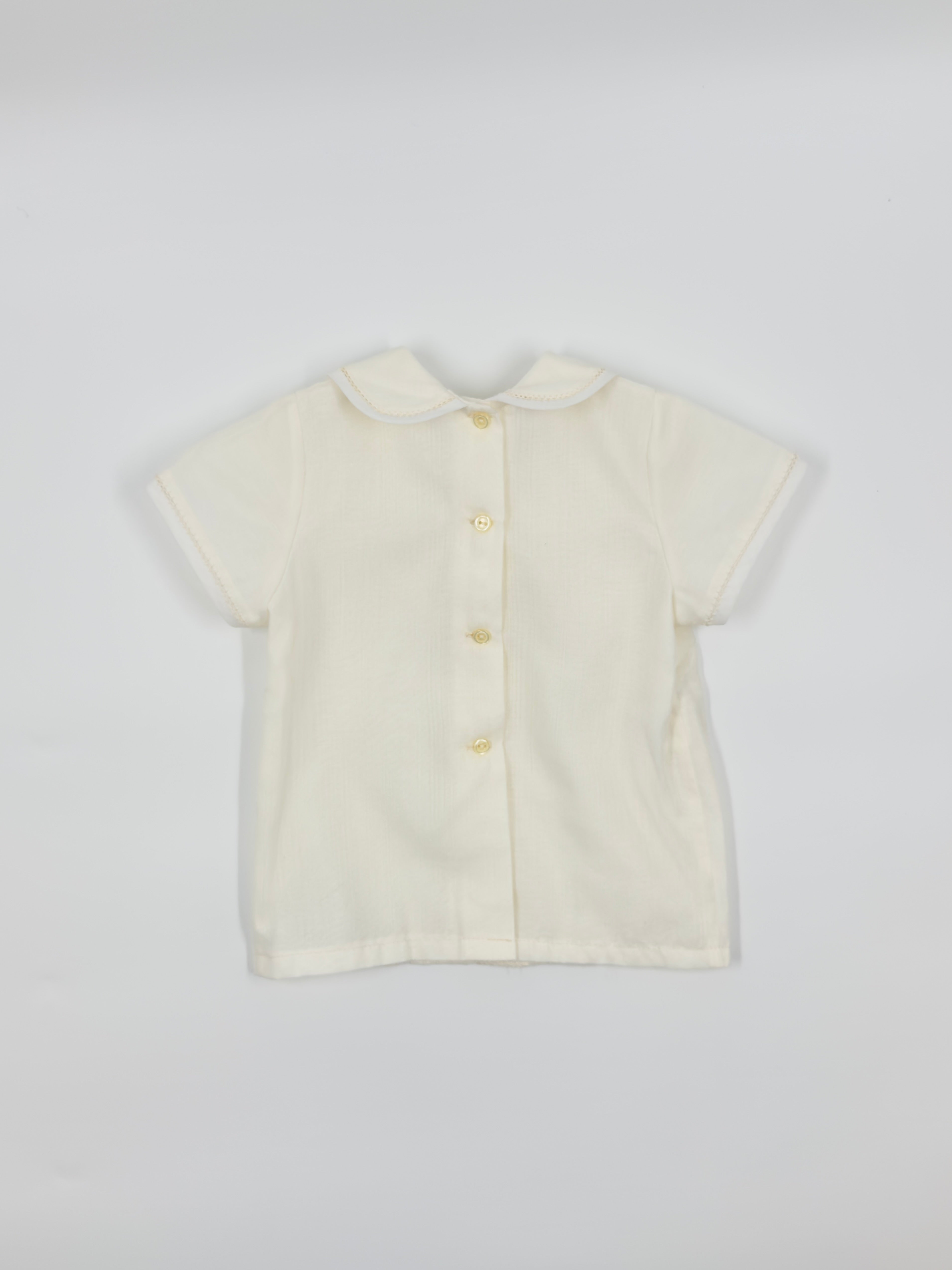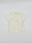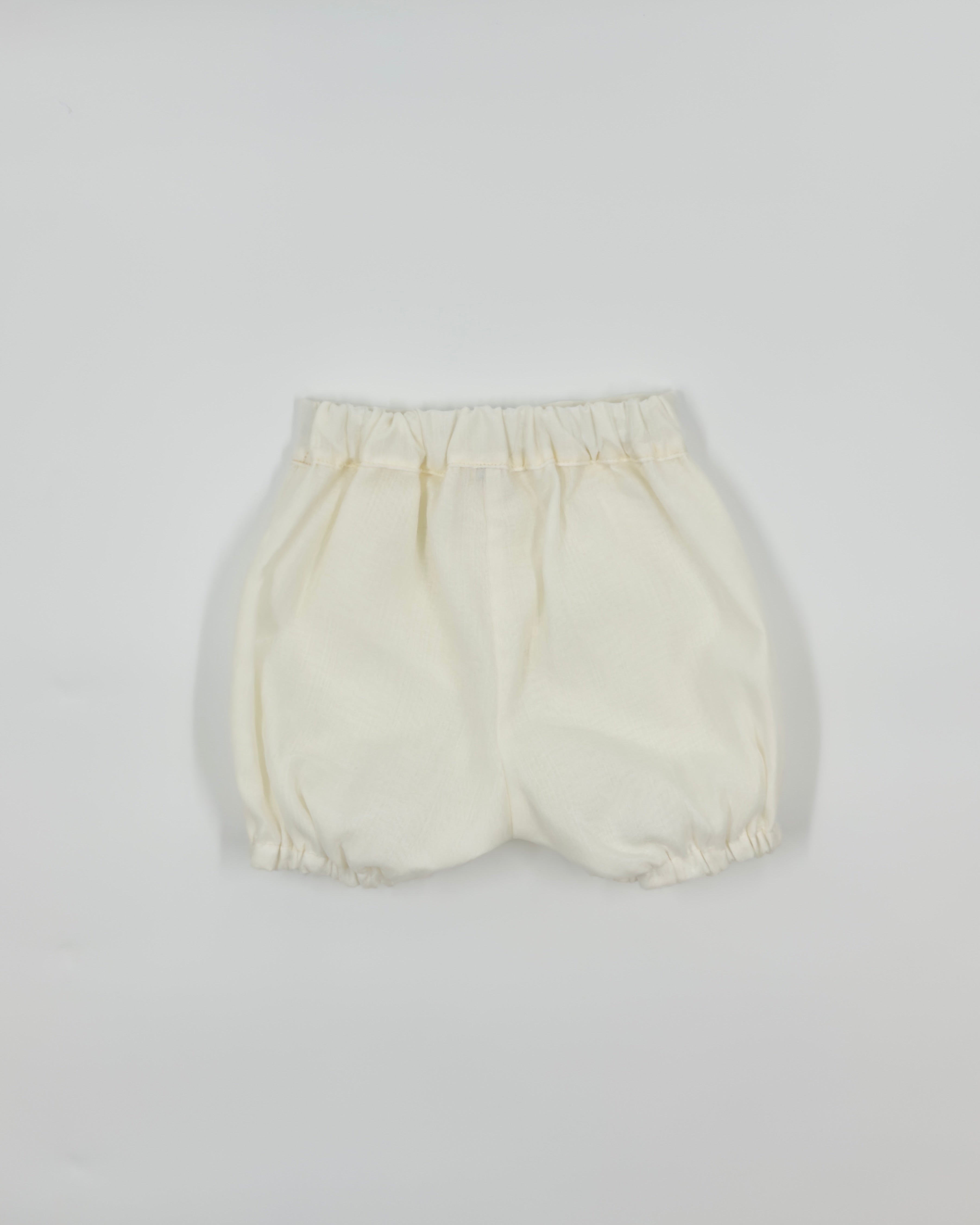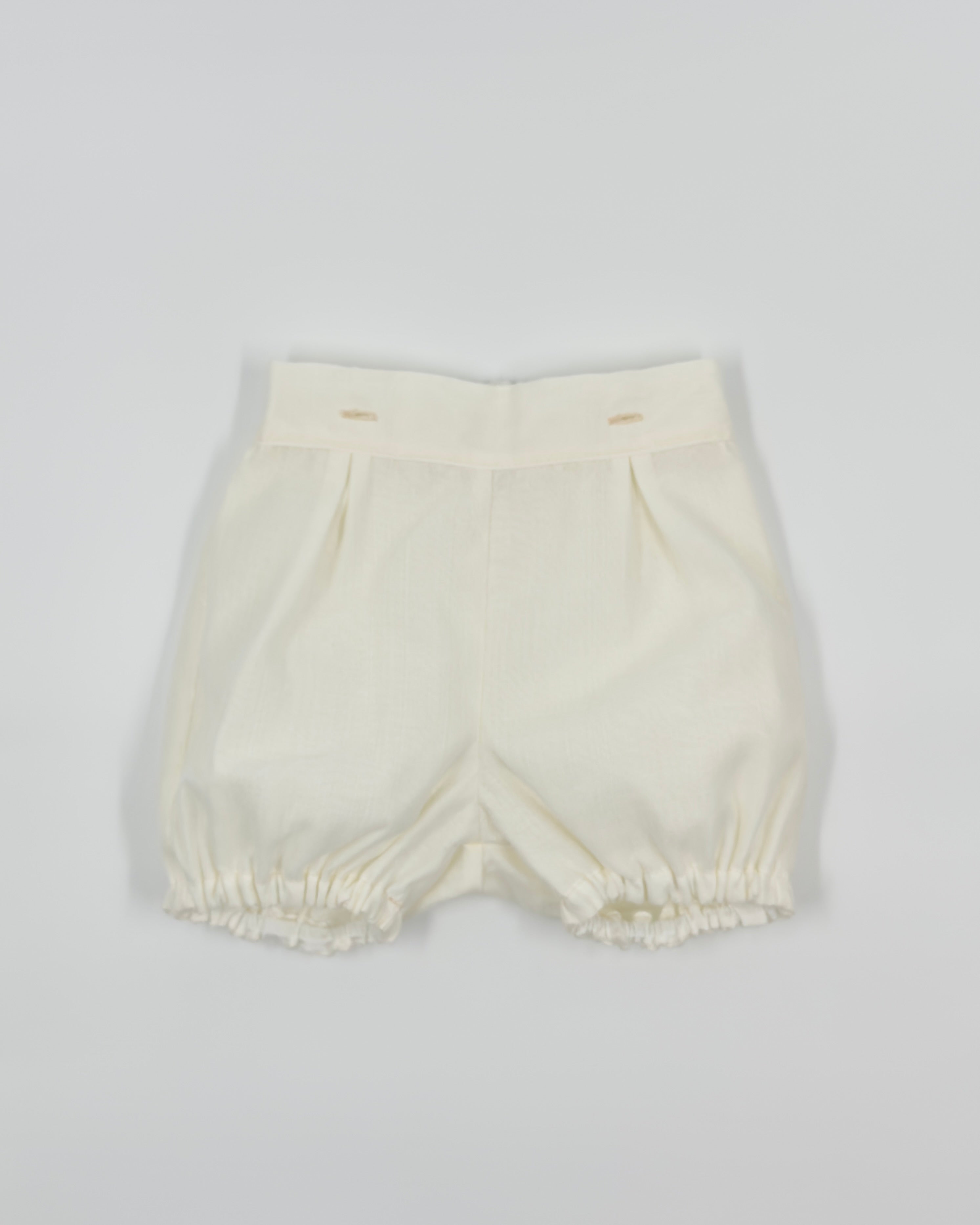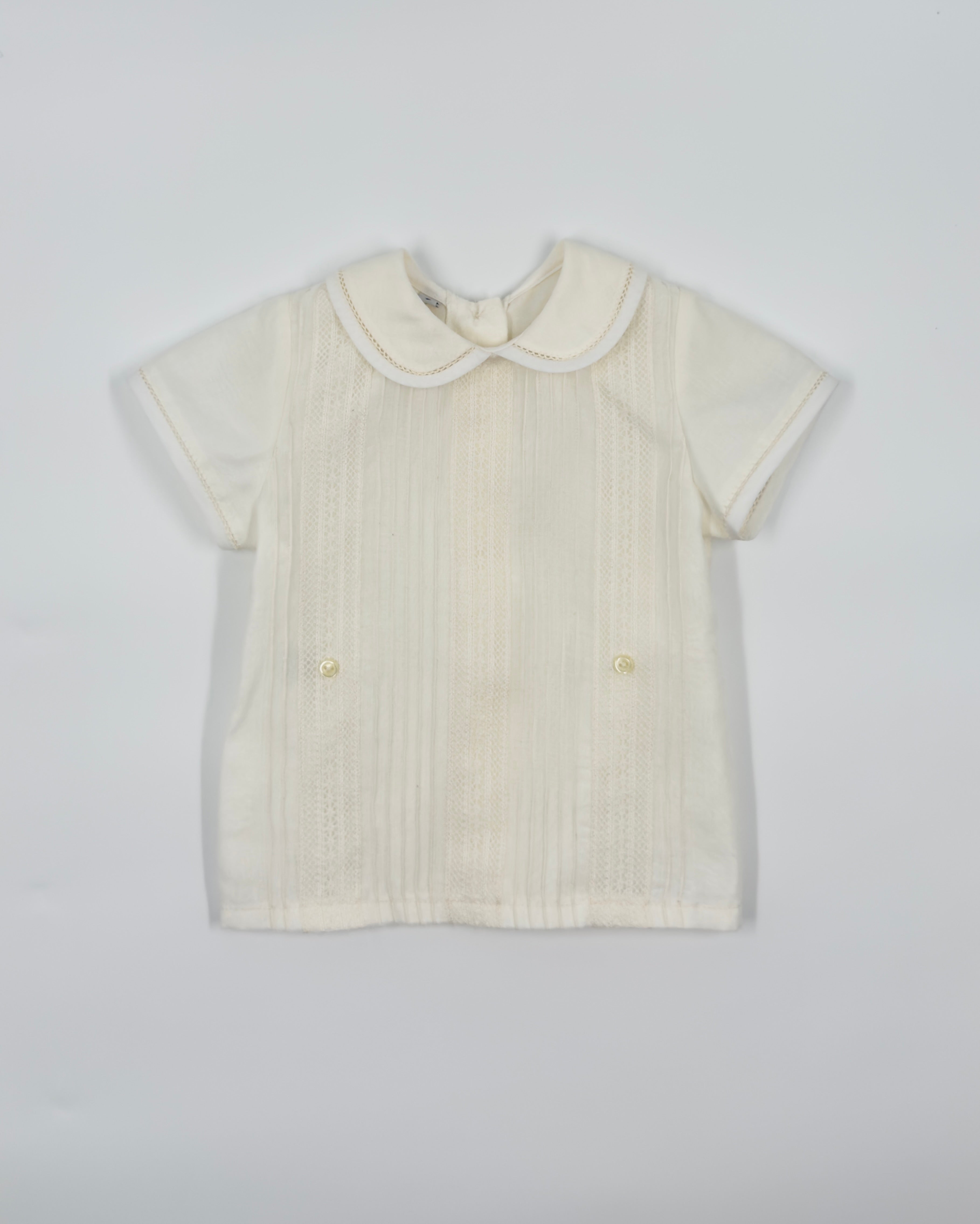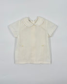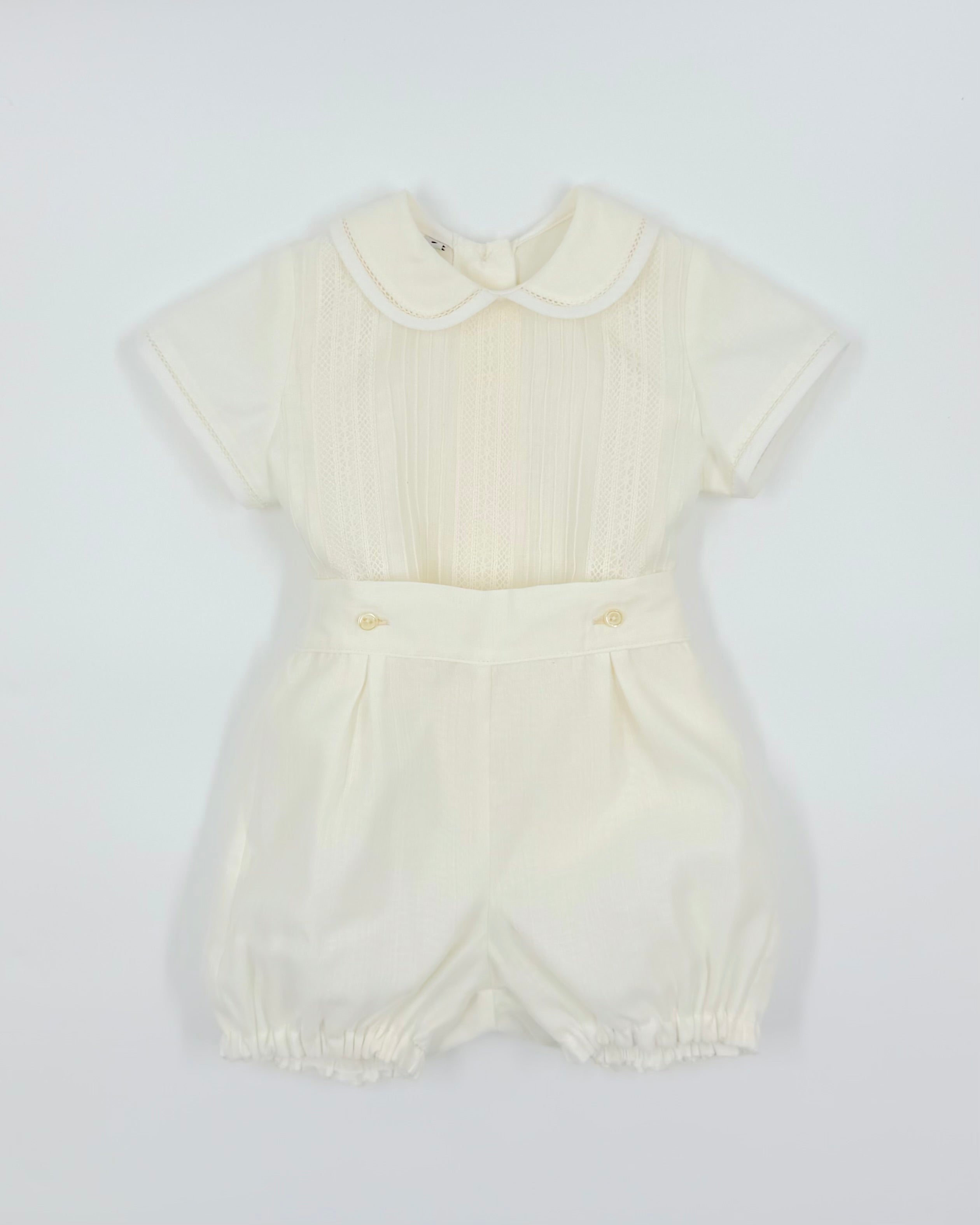 The Fernando outfit is a charming two-piece set for baby boys, made from soft off-white English muslin for a light and breathable feel. The shirt features delicate lace detailing, classic pleats, and a sweet Peter Pan collar, with back button closure for a traditional finish. Paired with bubble shorts for comfort and style, Fernando is perfect for baptisms, baby dedications, and other special occasions.
