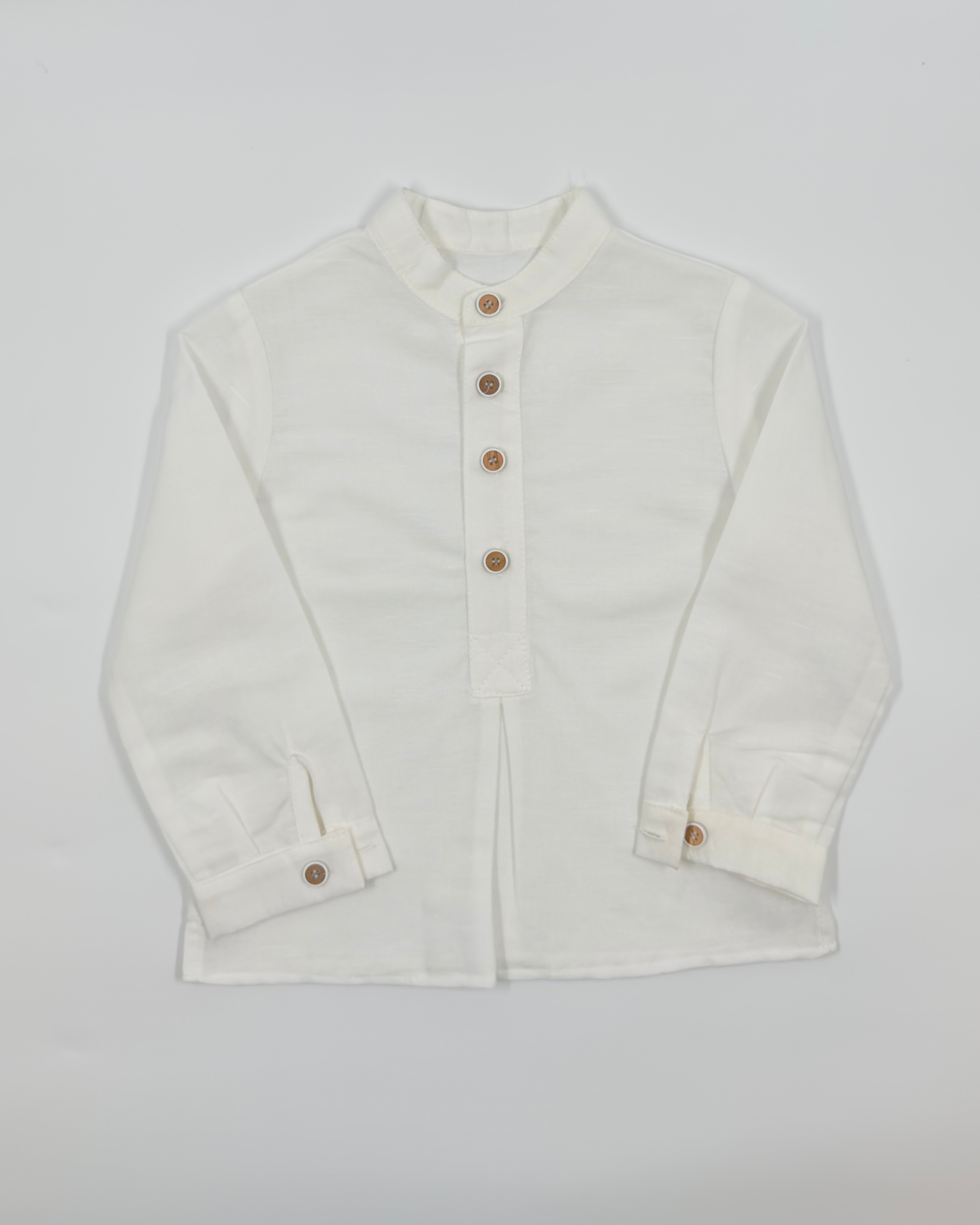German is a two-piece outfit for toddler boys. This set is made with a white mao collar shirt with wood buttons, and sand color bermudas. The shorts have an elastic band to adjust waist.