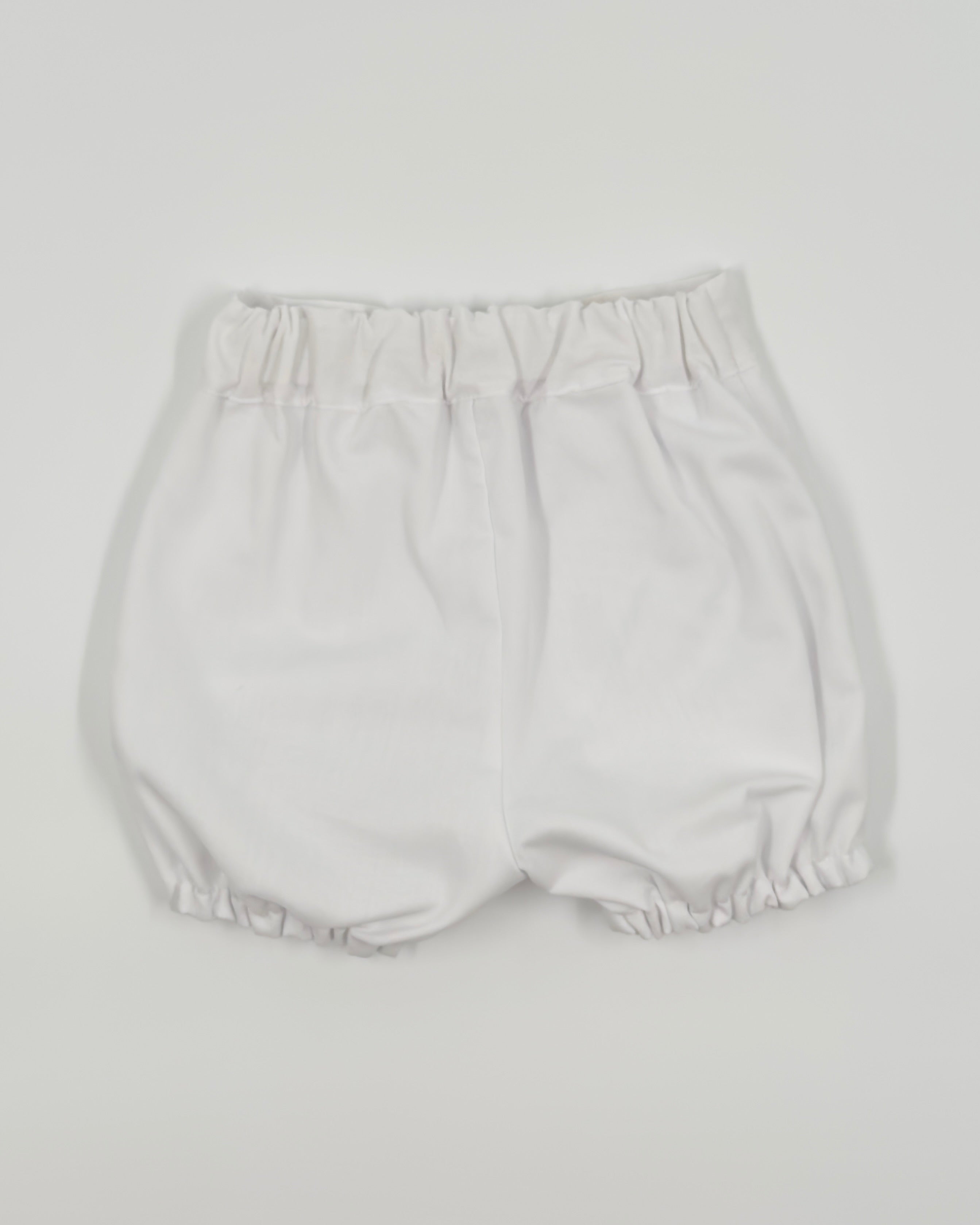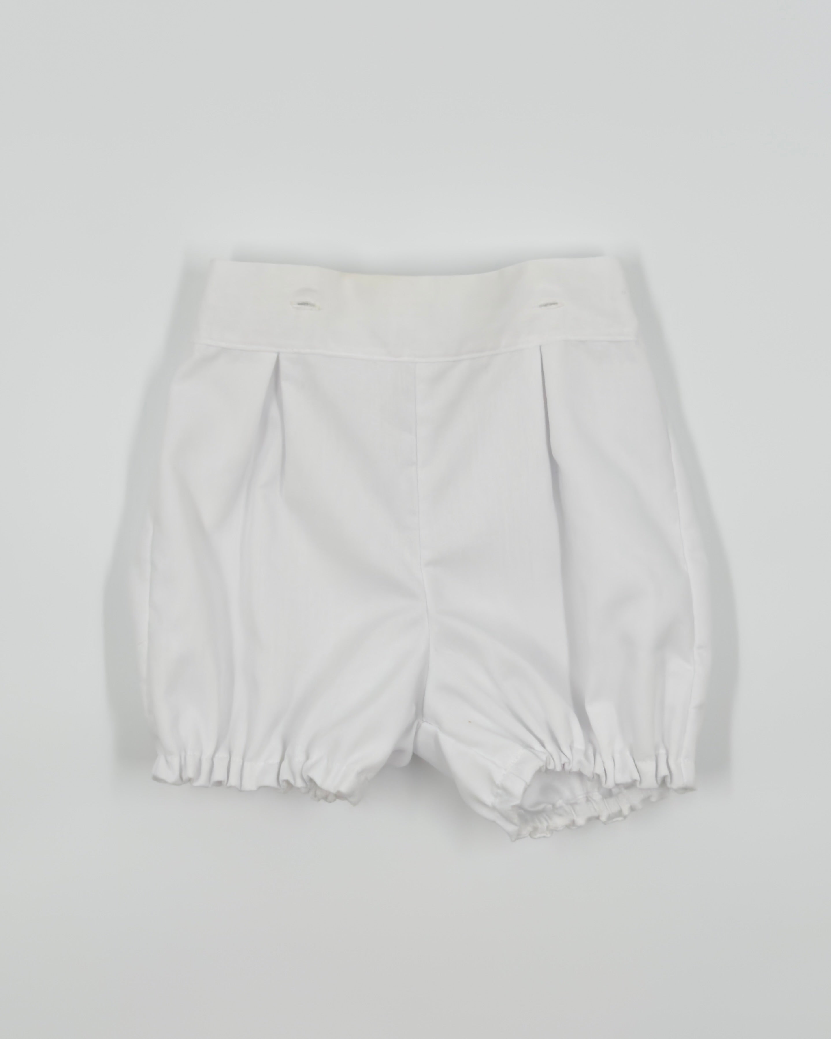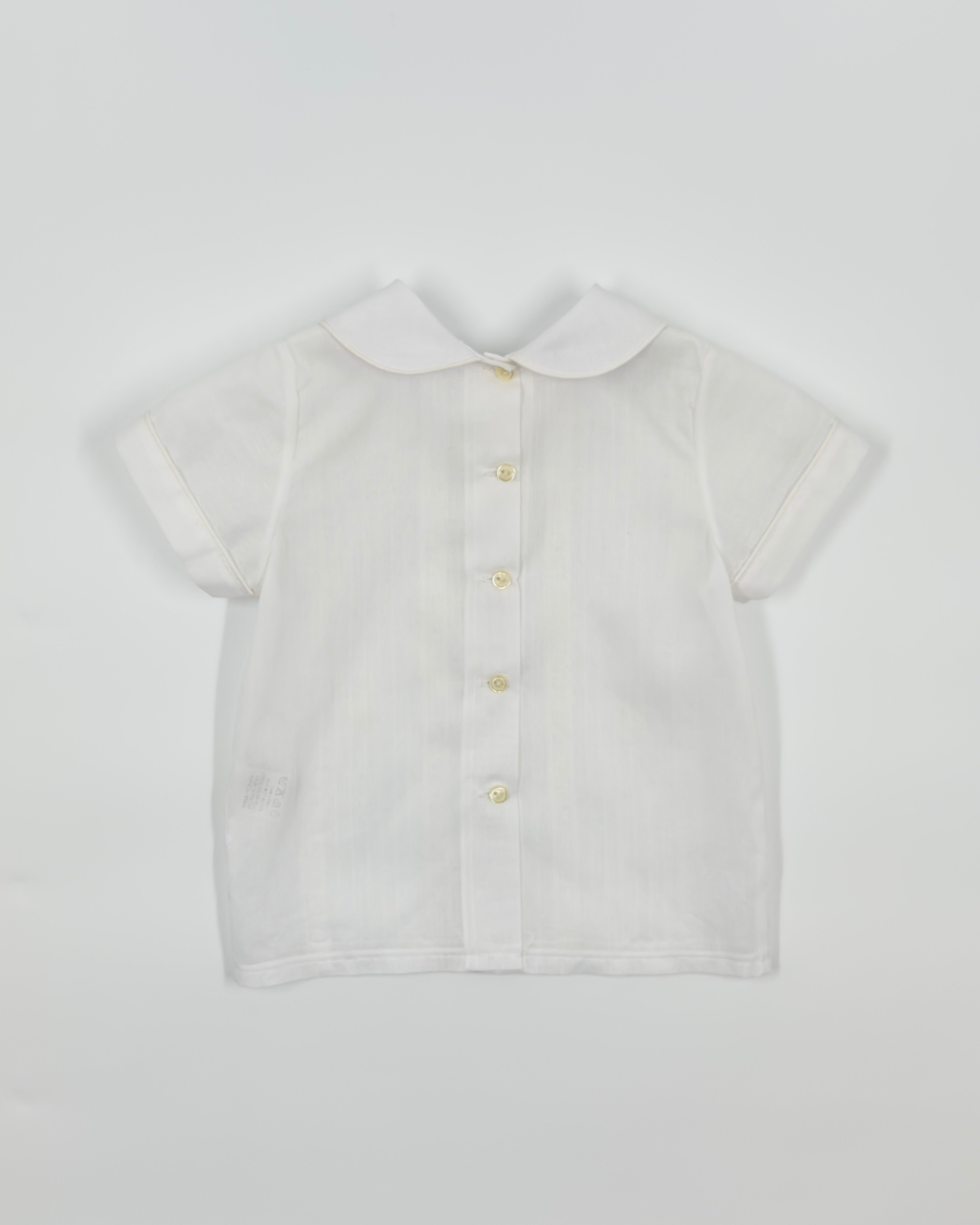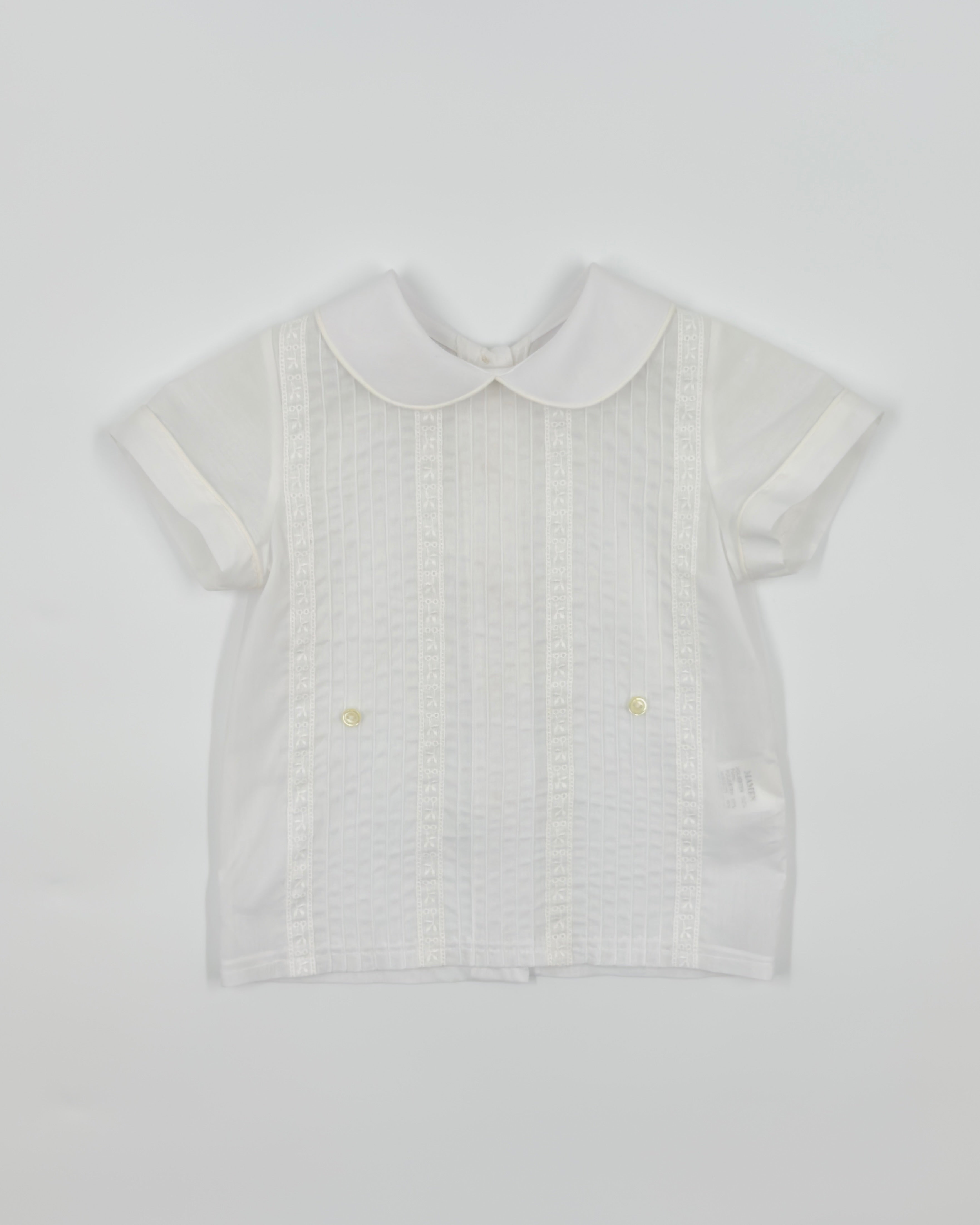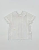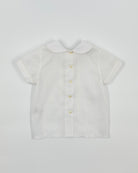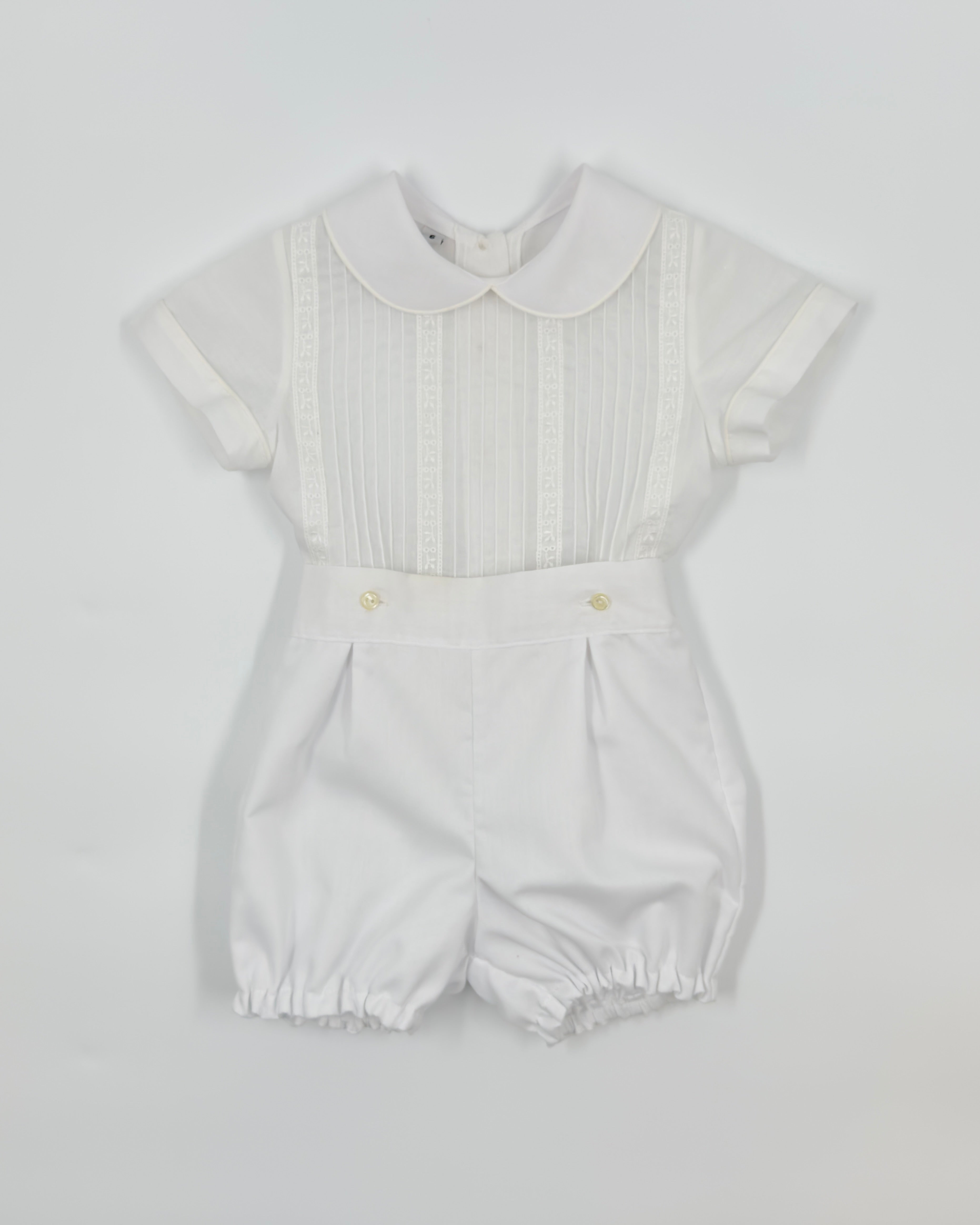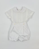 The Julio outfit is a timeless two-piece set for baby boys, made from soft optic white batiste for a light and elegant feel. The shirt features vertical pleats, delicate lace accents, and a classic Peter Pan collar, with buttons along the back for easy closure. Paired with coordinating bubble shorts, Julio is the perfect ensemble for baptisms, baby showers, and formal occasions.