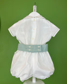The Luciano outfit is a beautifully crafted two-piece set for baby boys, perfect for christenings, weddings, and other meaningful occasions. The top is made from off-white organza and features a classic Peter Pan collar, short sleeves, and delicate handmade pleats, with buttons down the back for a traditional finish. The matching bubble shorts include a soft green pleated sash, side button details, and an elastic waistband for a secure and comfortable fit. Lined in breathable cotton, Luciano blends timeless elegance with baby-friendly comfort.