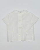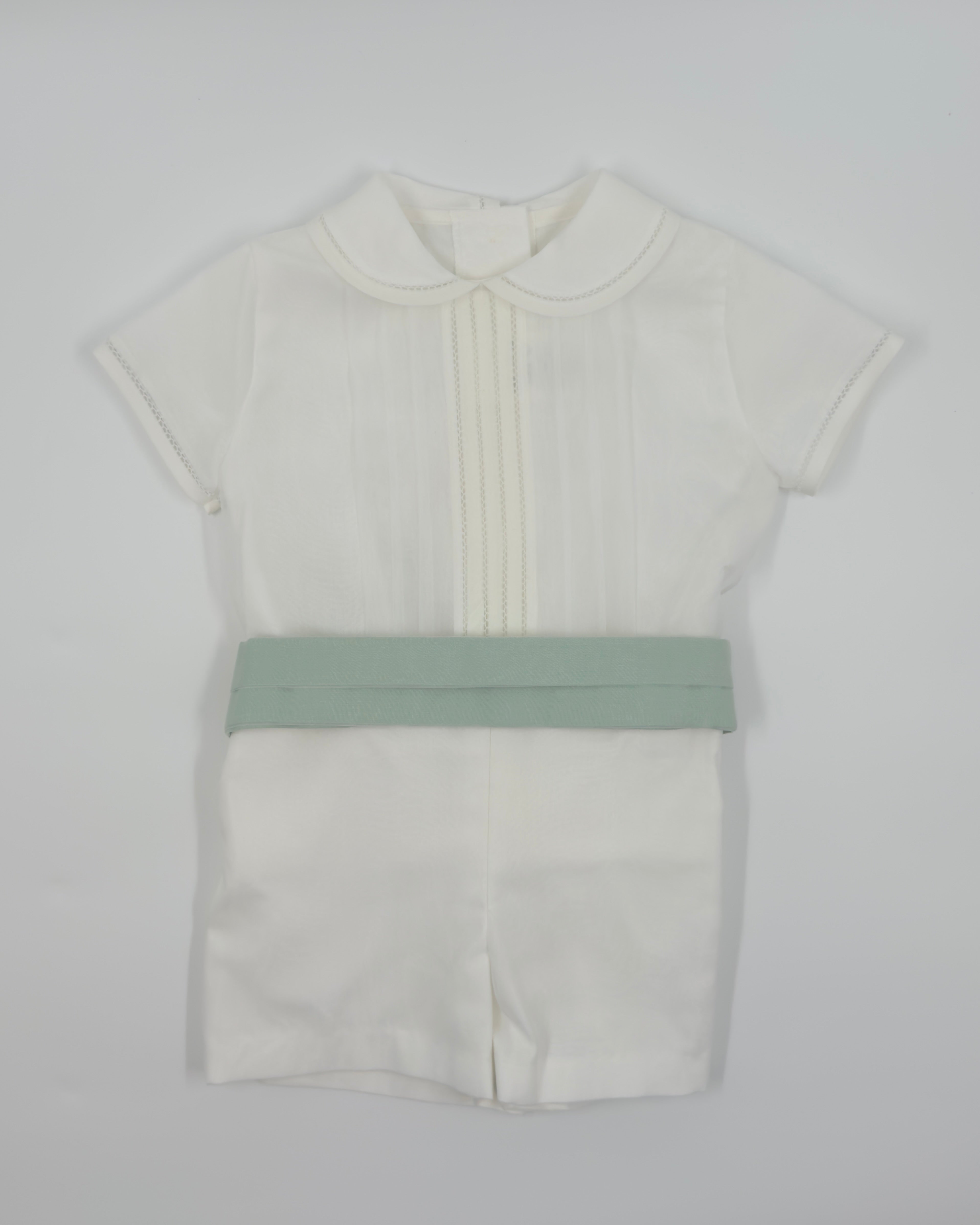 The Luciano outfit is a refined two-piece set for baby boys, perfect for christenings, weddings, and other special occasions. The top features a classic Peter Pan collar, short sleeves, and delicate handmade pleats, with back button closure for a traditional touch. The coordinating shorts include side button closures, a light green pleated sash, and an elastic waistband for comfort. Crafted with an off-white organza exterior and soft cotton lining, Luciano blends sophistication and comfort effortlessly.