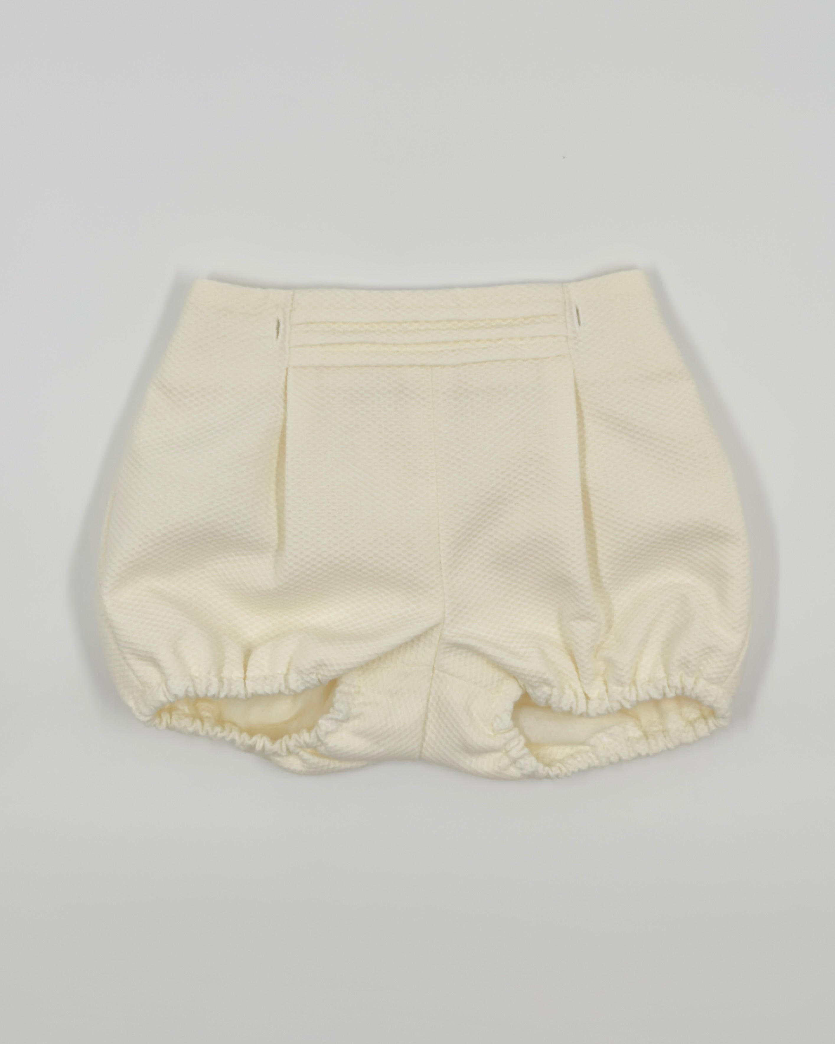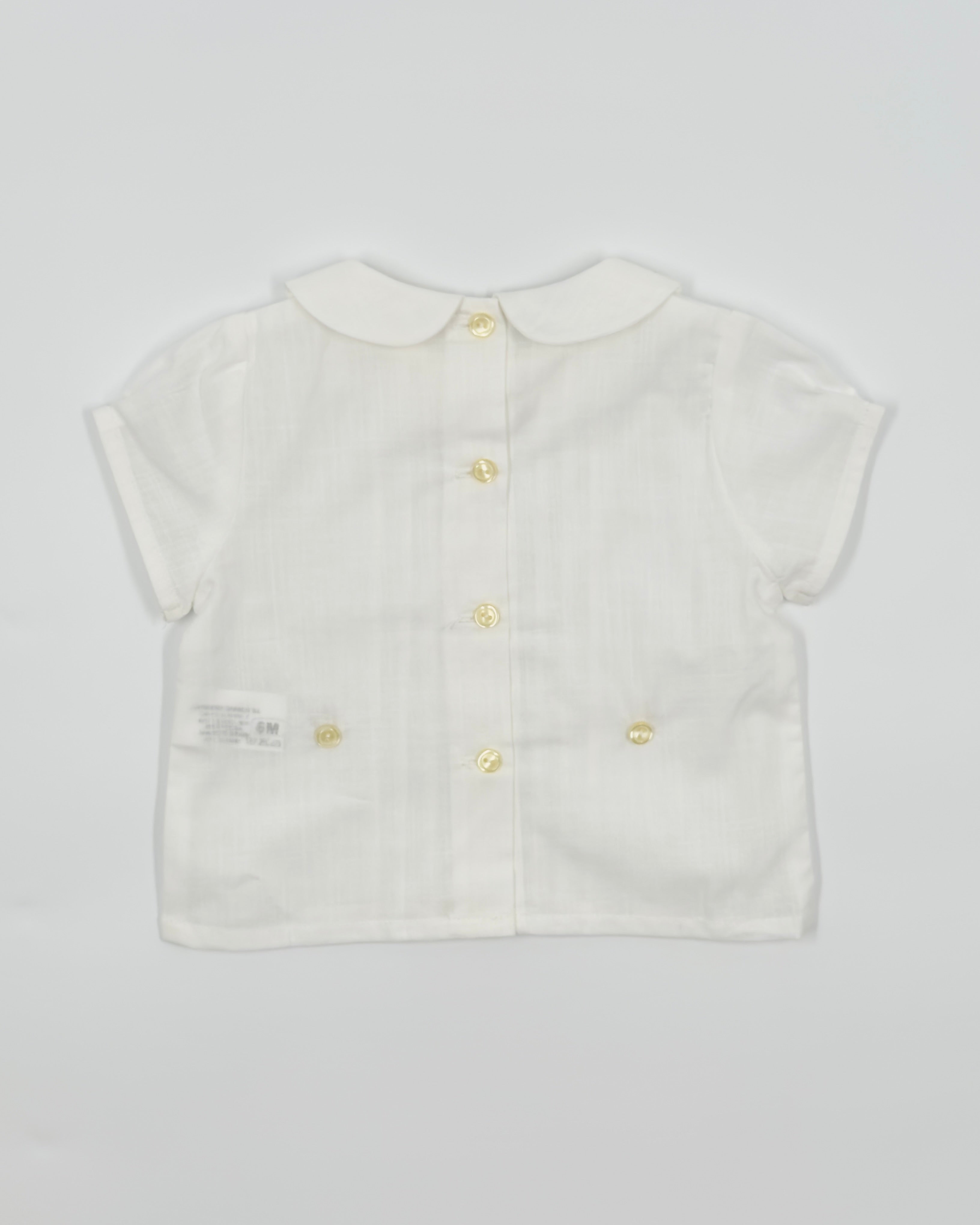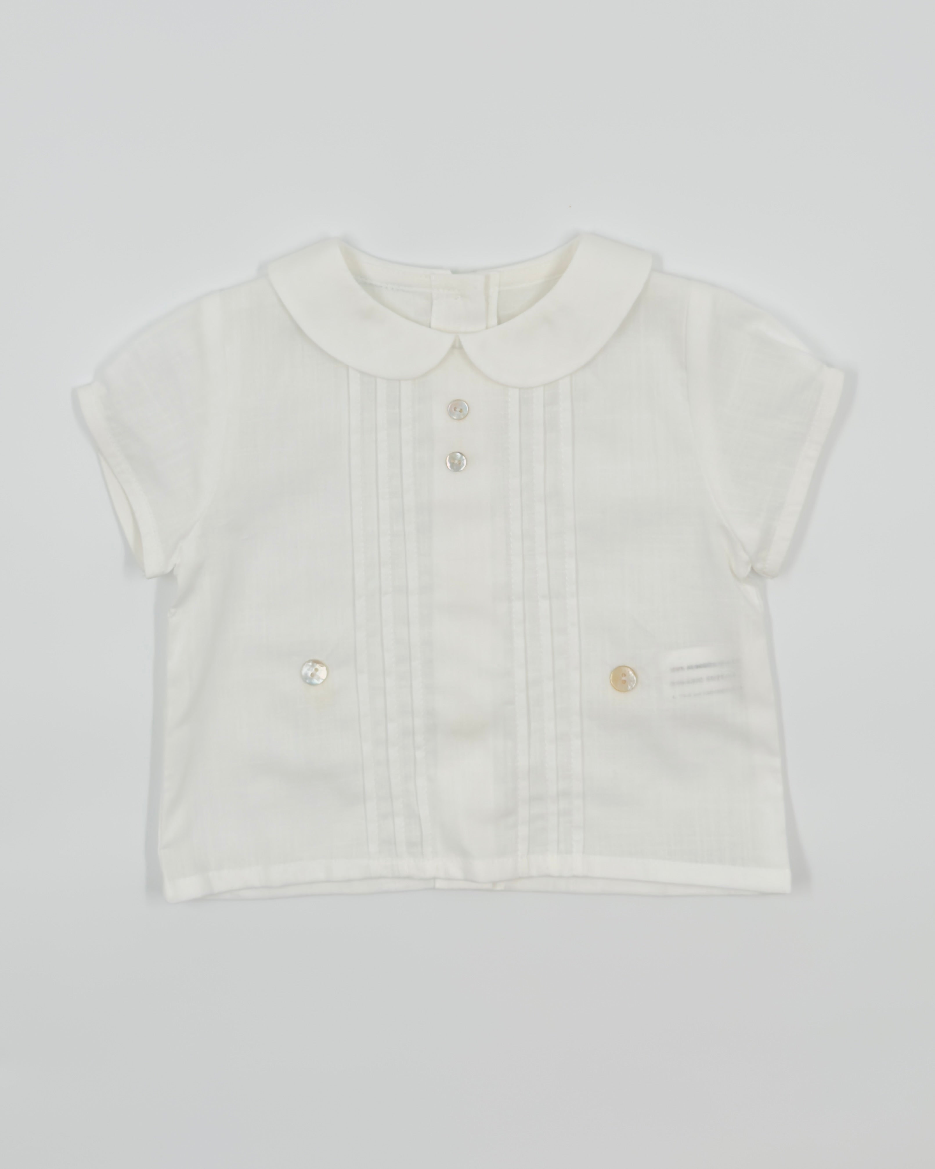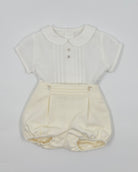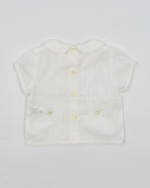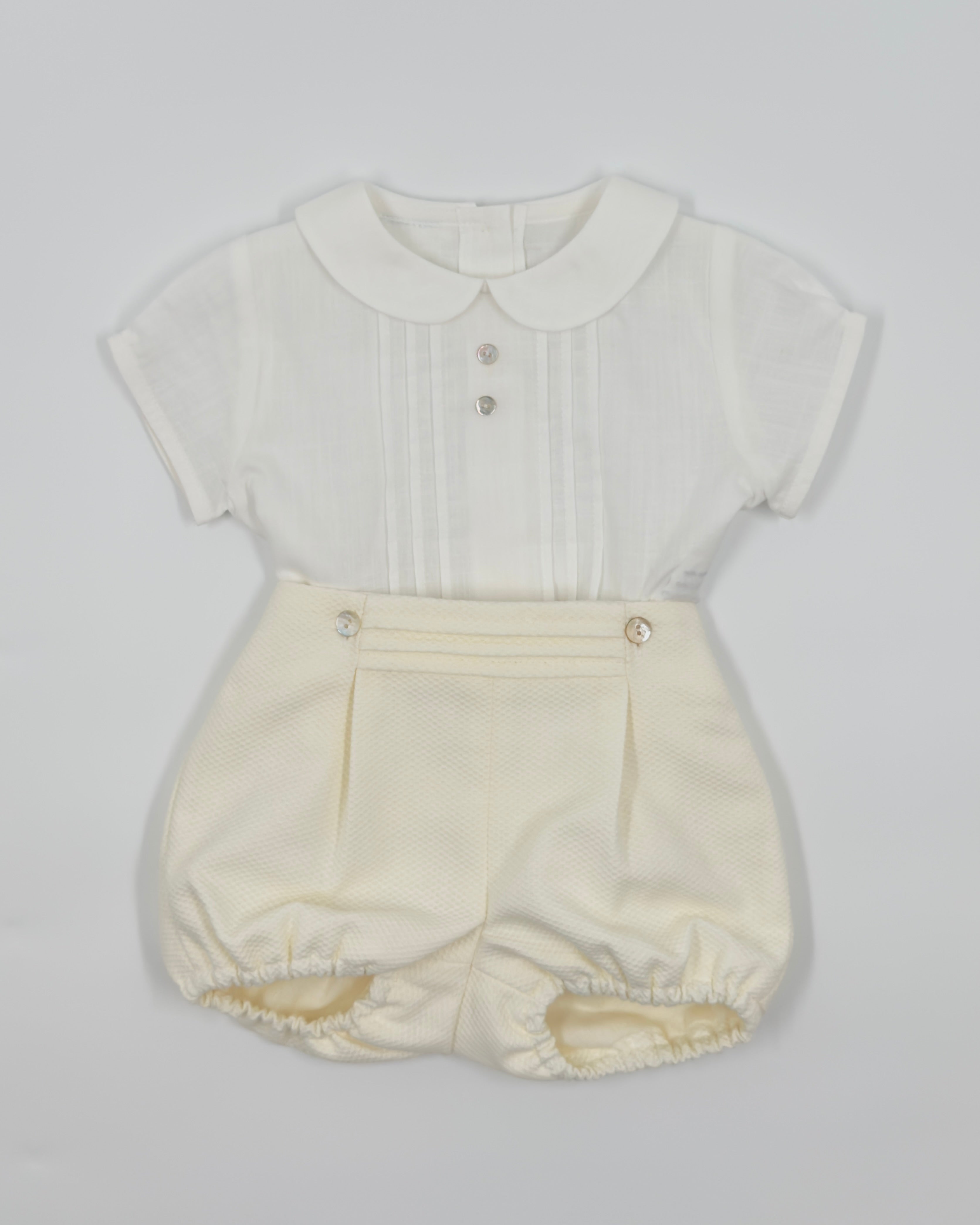 The Nate outfit is a timeless two-piece set for baby boys, perfect for celebrating life’s most meaningful moments. The shirt is made from soft white batiste and features vertical pleats, delicate lace accents, and a classic Peter Pan collar. It buttons at the back for a traditional finish and pairs beautifully with off-white pique bubble shorts for comfort and charm. Ideal for baptisms, weddings, and elegant occasions.